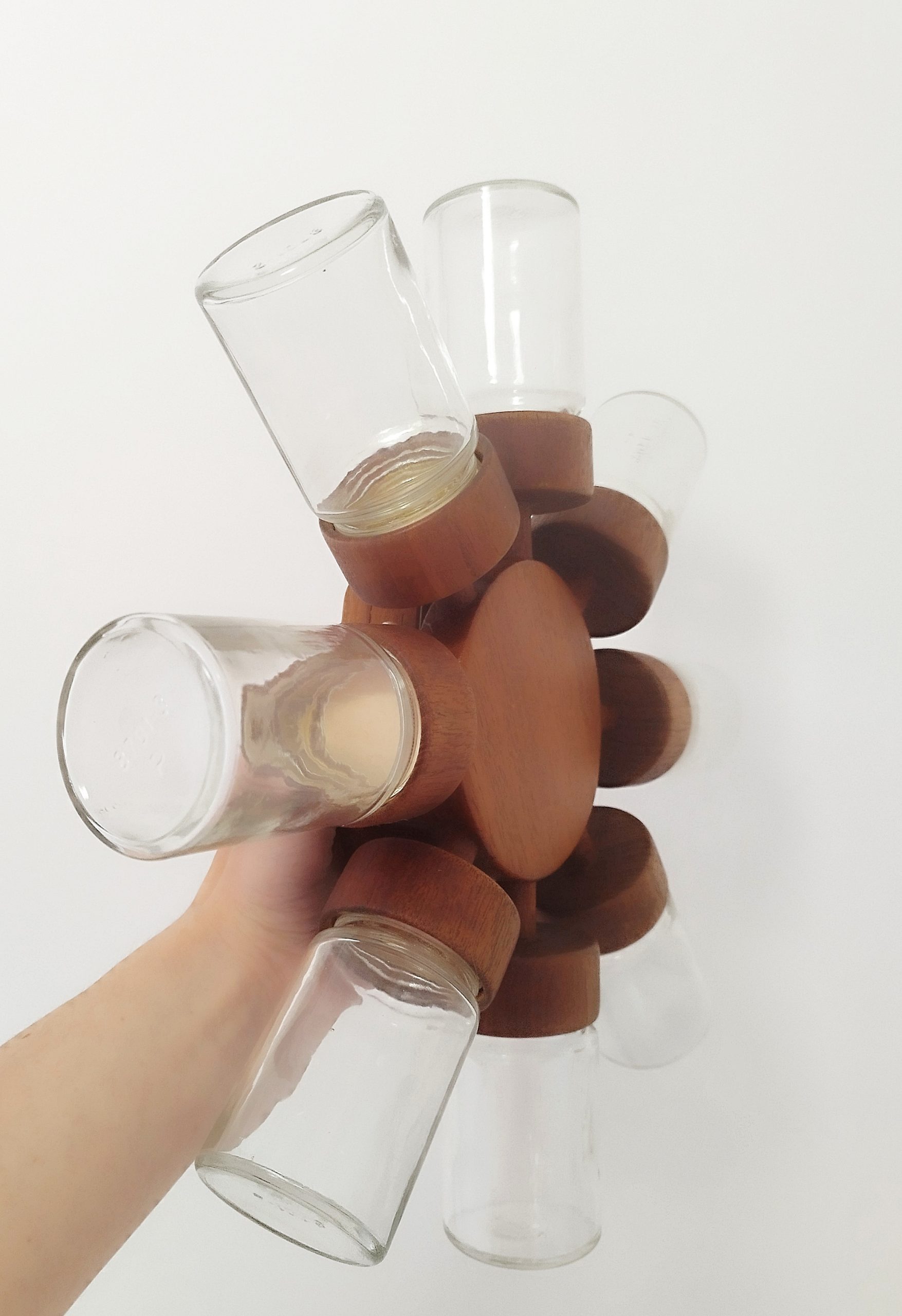 Fabriqué au Danemark, ce modèle emblématique associe le design mid-century à la fonctionnalité. Il est composé d’un socle pivotant en bois de teck et 8 flacons en verre.