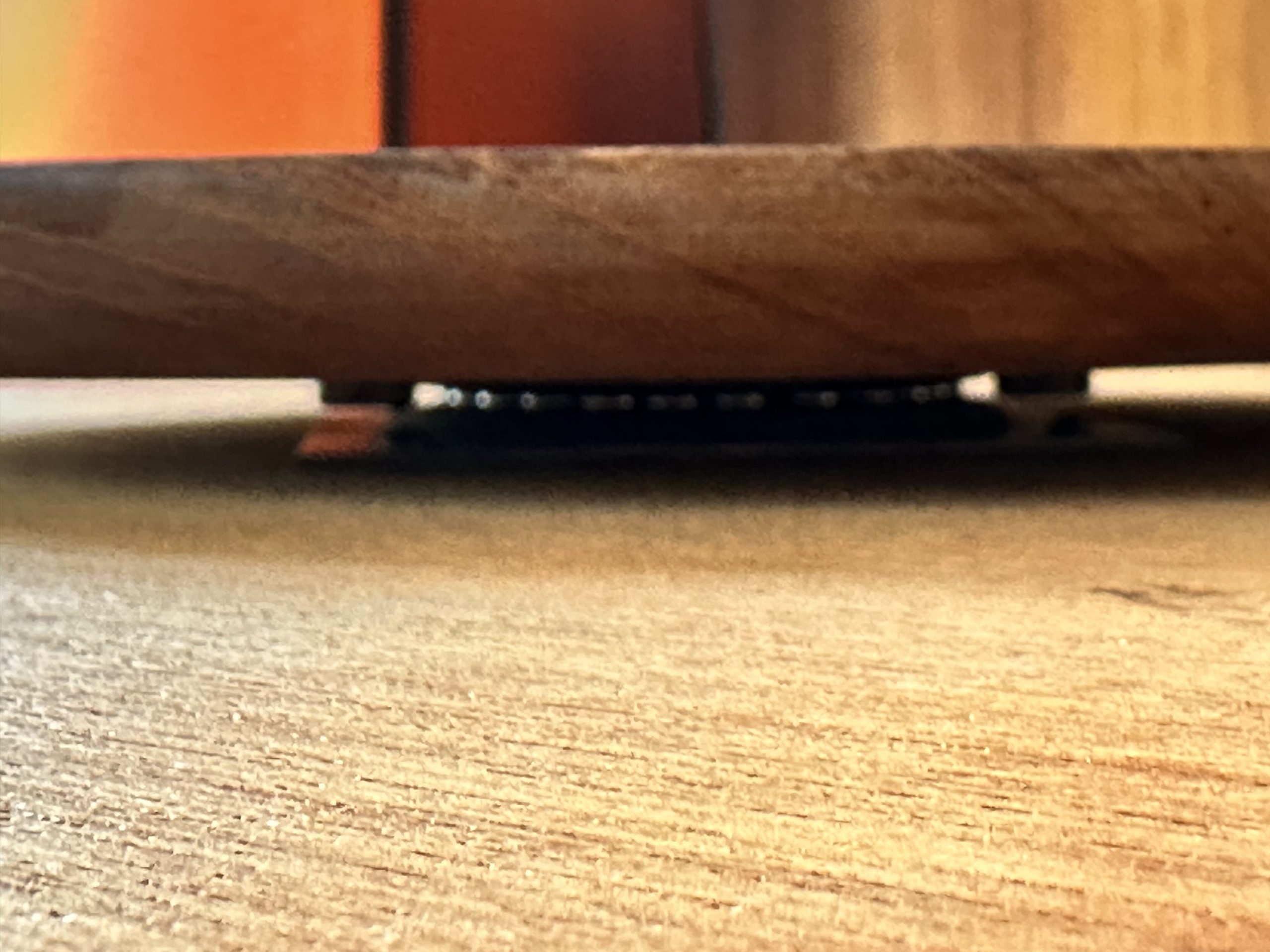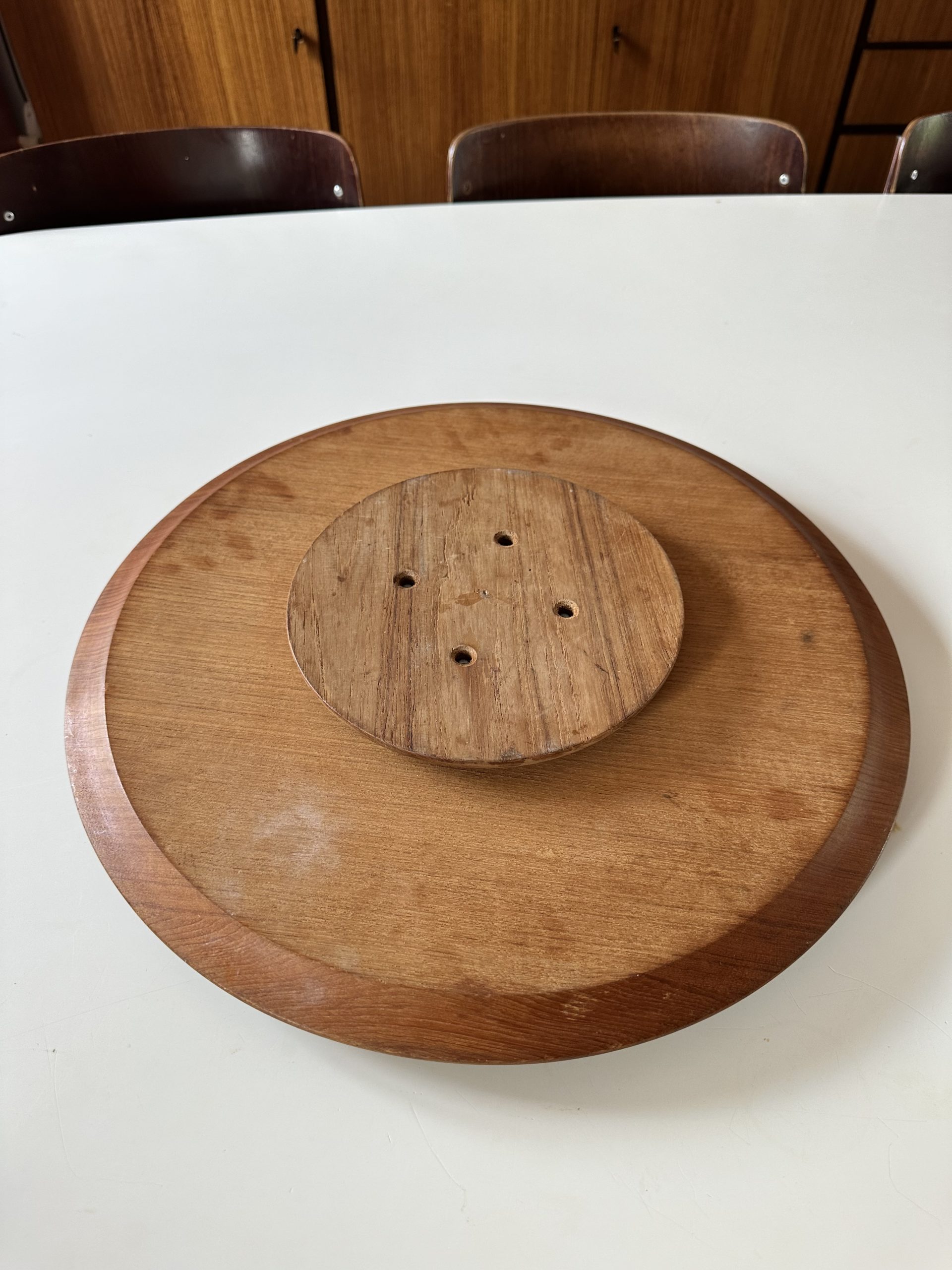 Il s’agit d’un grand plat de milieu de table pour apéro ou service de style scandinave. Il est en teck avec deux étages et il est monté sur un système de roulement à billes pour une rotation fluide. Il est en bon état. On peut noté une mini trace sur le bord du petit plateau supérieur, sinon parfait vu son âge.