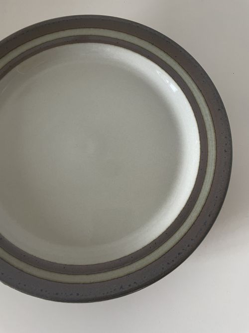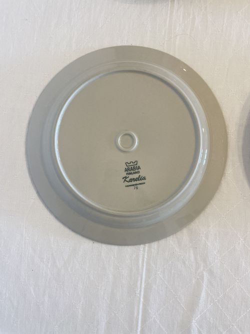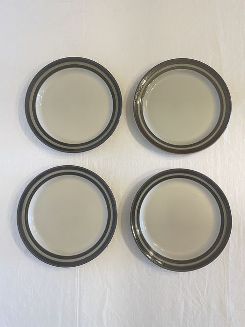 Produit venduEnsemble de 4 assiettes plates de la manufacture finlandaise Arabia, décor Karelia dans les tons beiges et bruns