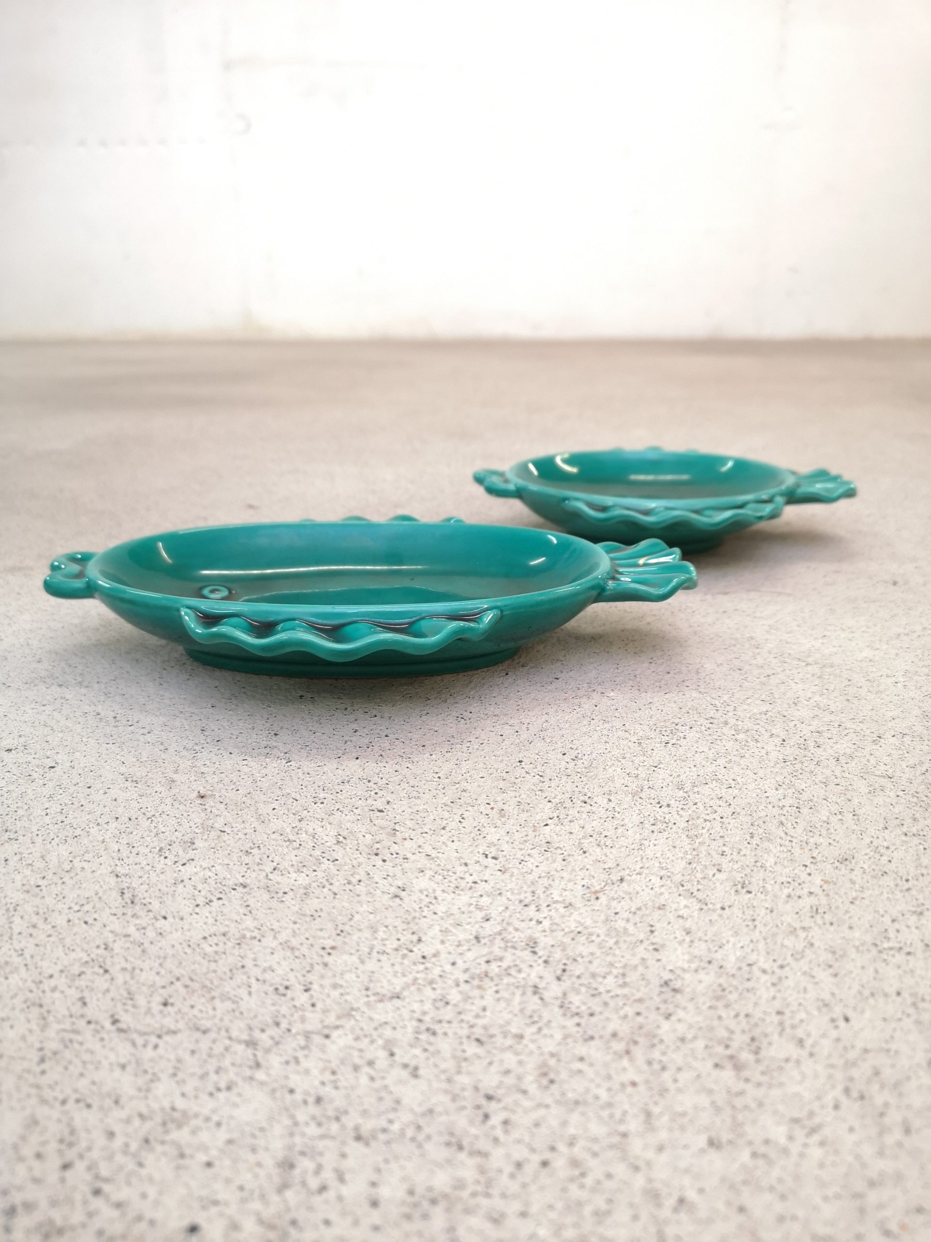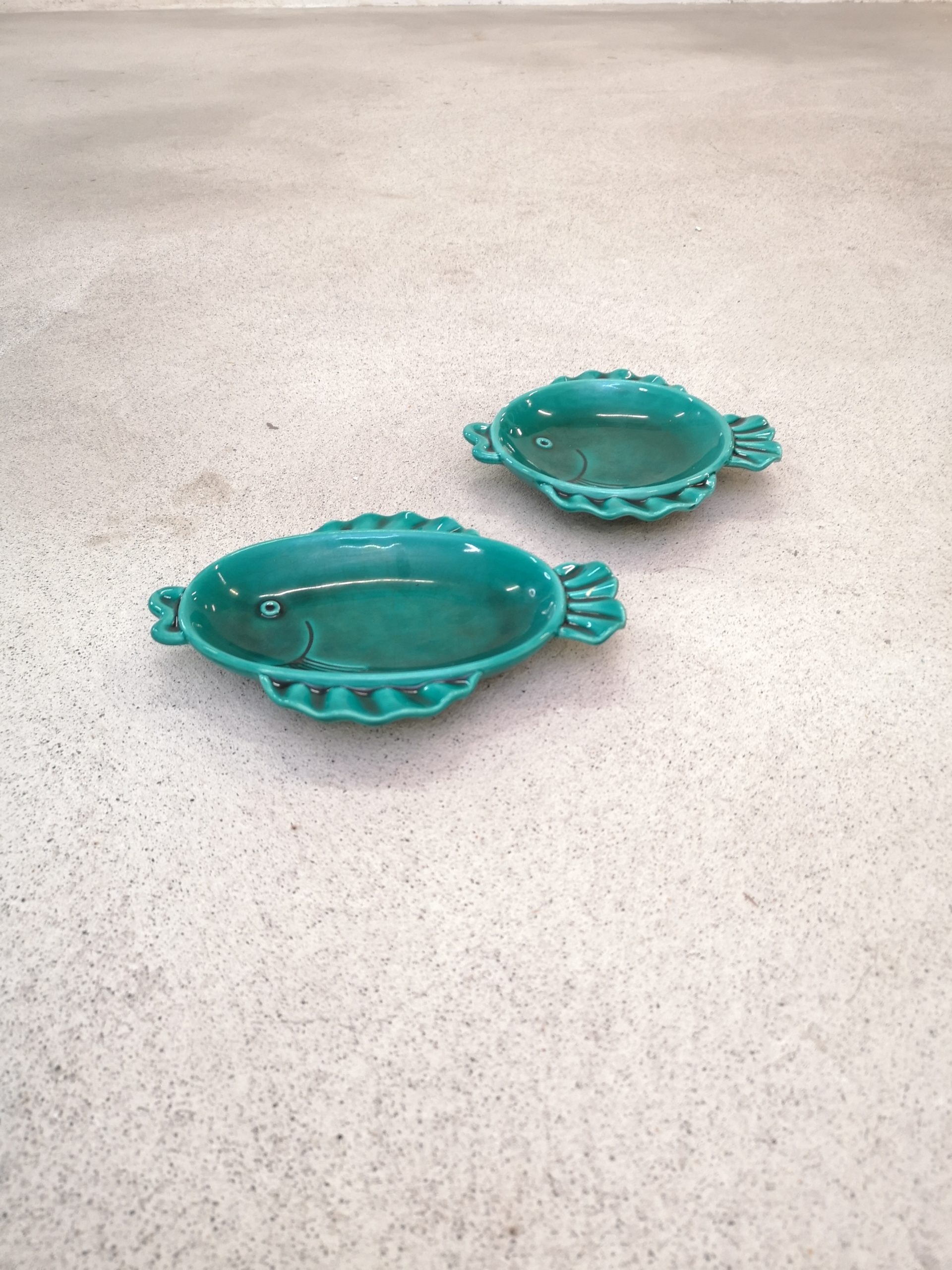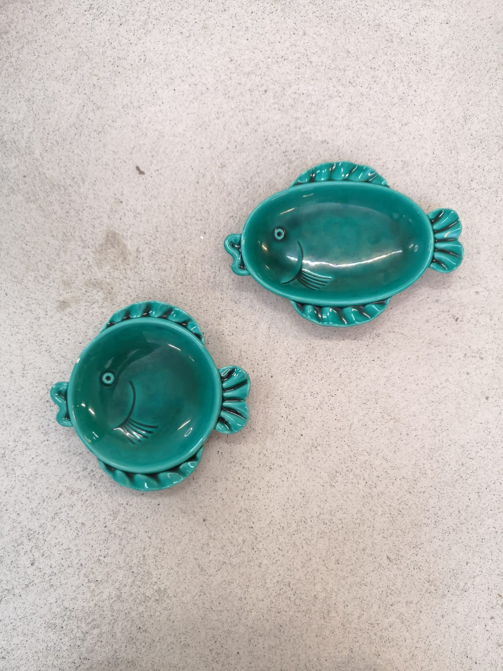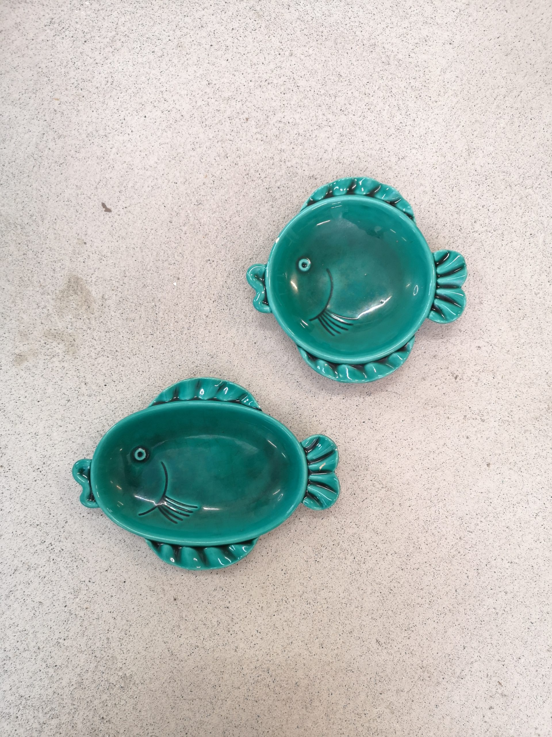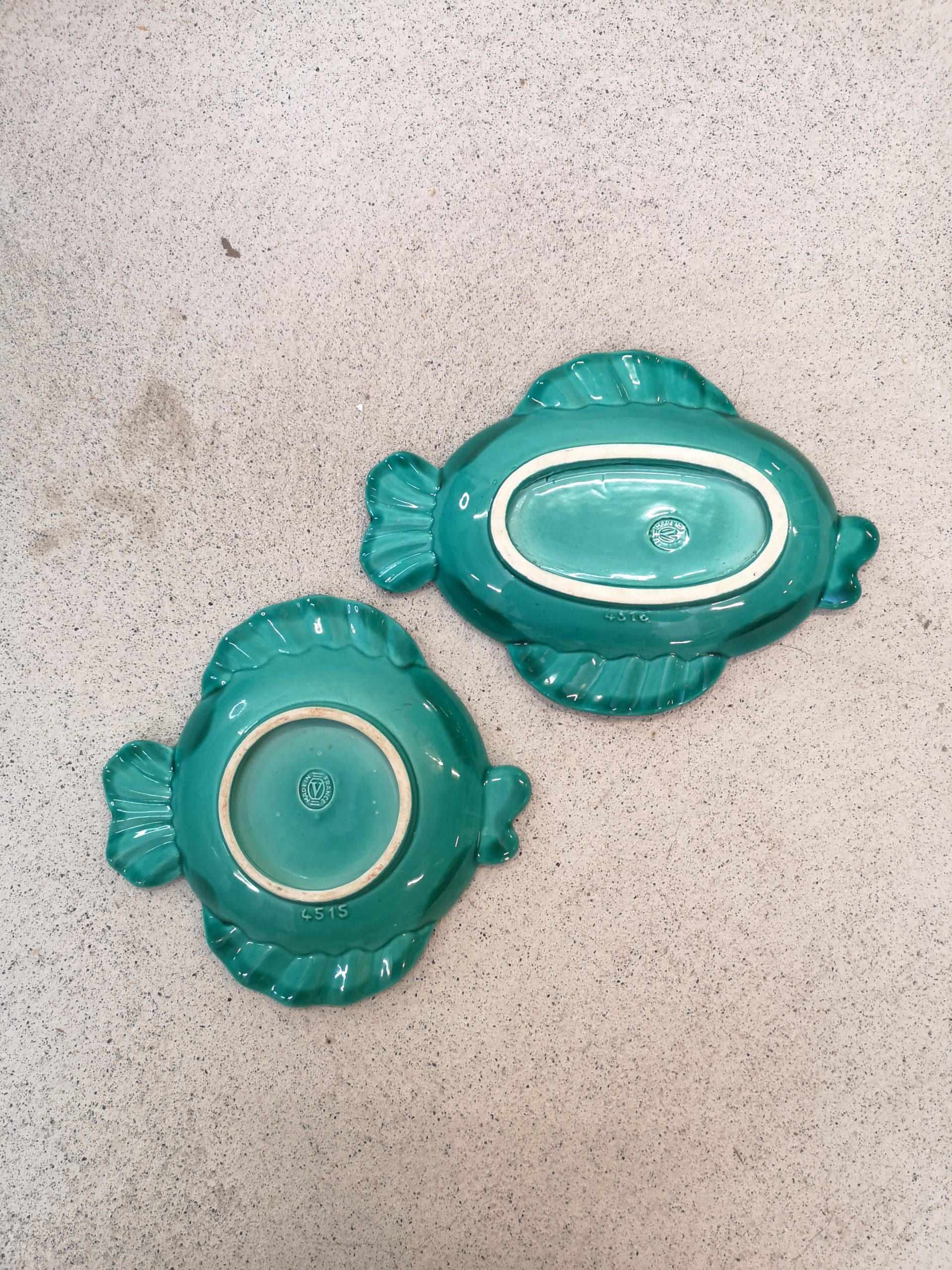 Produit venduPaire de petit plats de la forme d’un poisson de couleur bleu/vert avec au dos l’inscription ” V Made in France”. Le poisson le plus long (dimensions : 18.5 x 19.5 x 4 cm) a un éclat au niveau de la queue. Le poisson le plus rond (dimensions : 16.5 x 23 x 4 cm) a un éclat au dessus de la bouche.