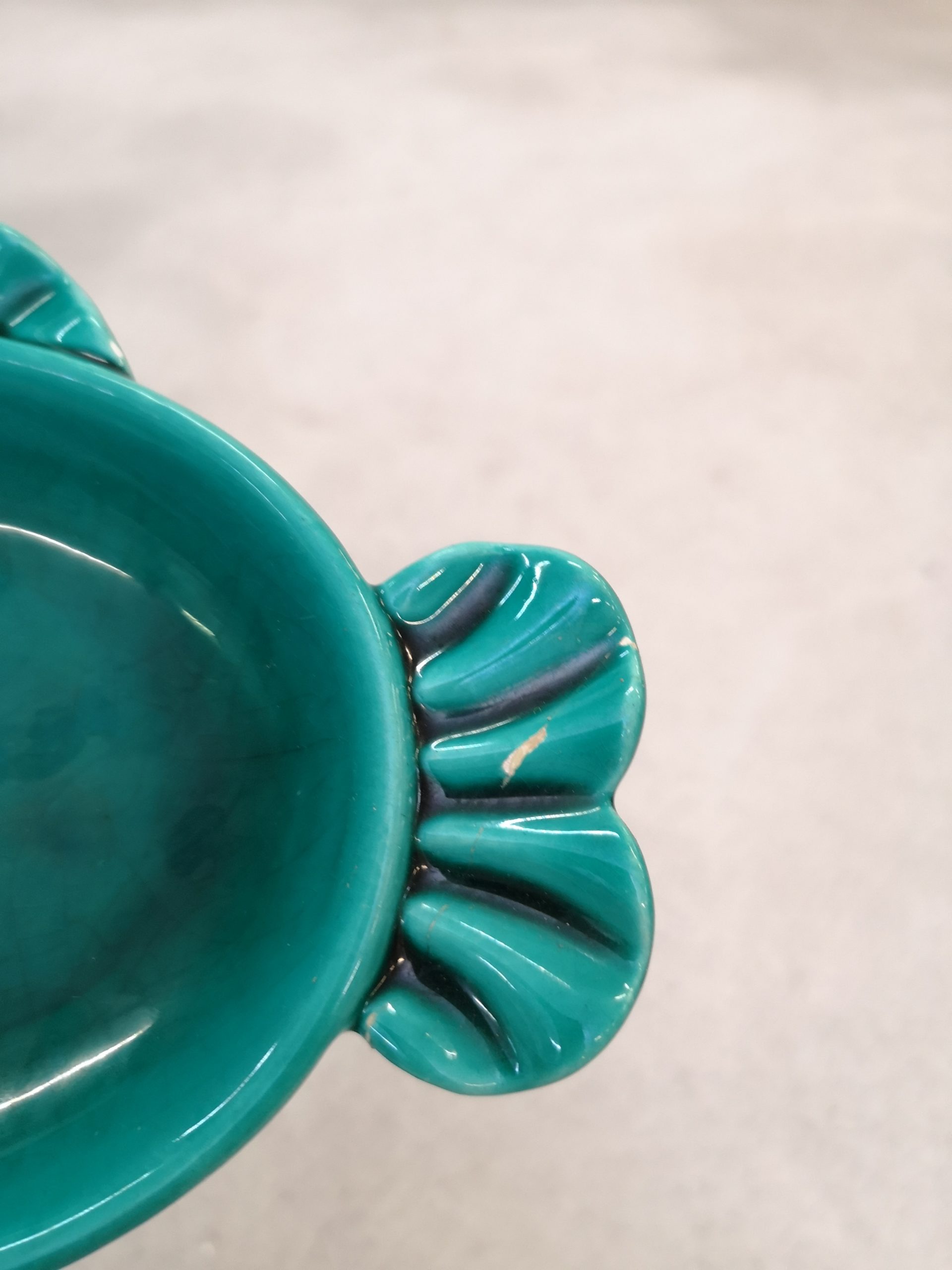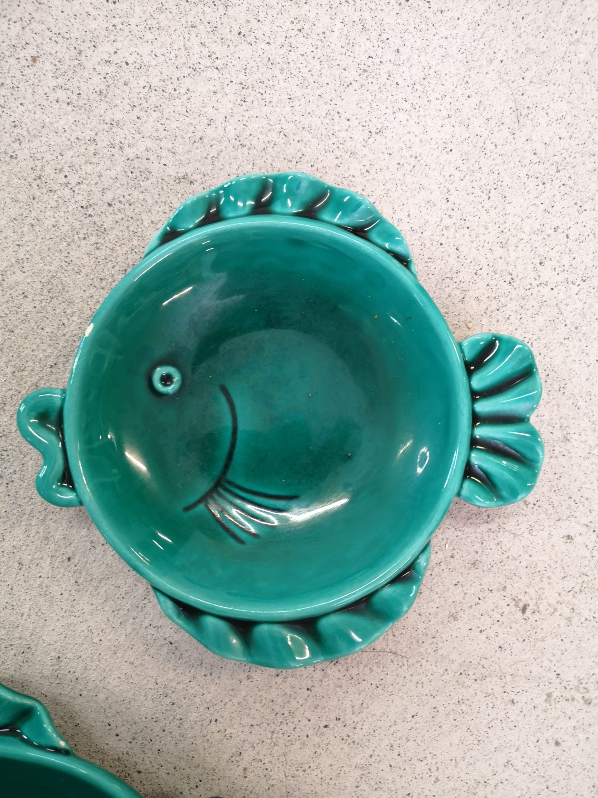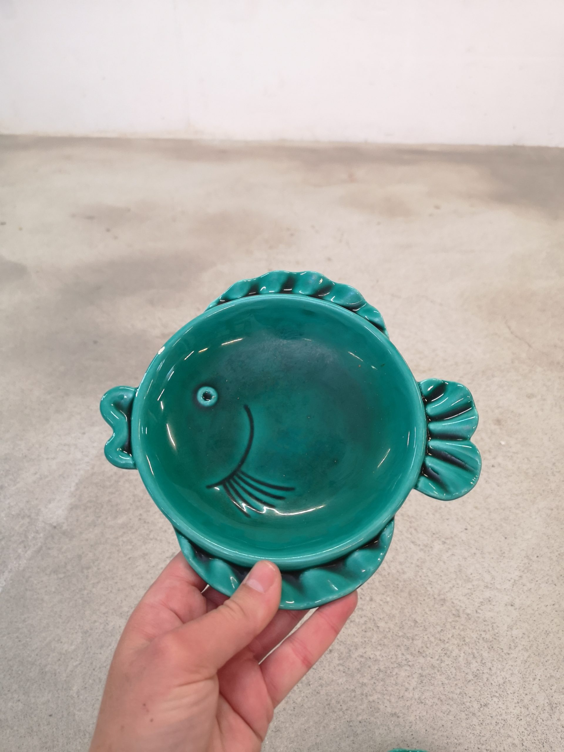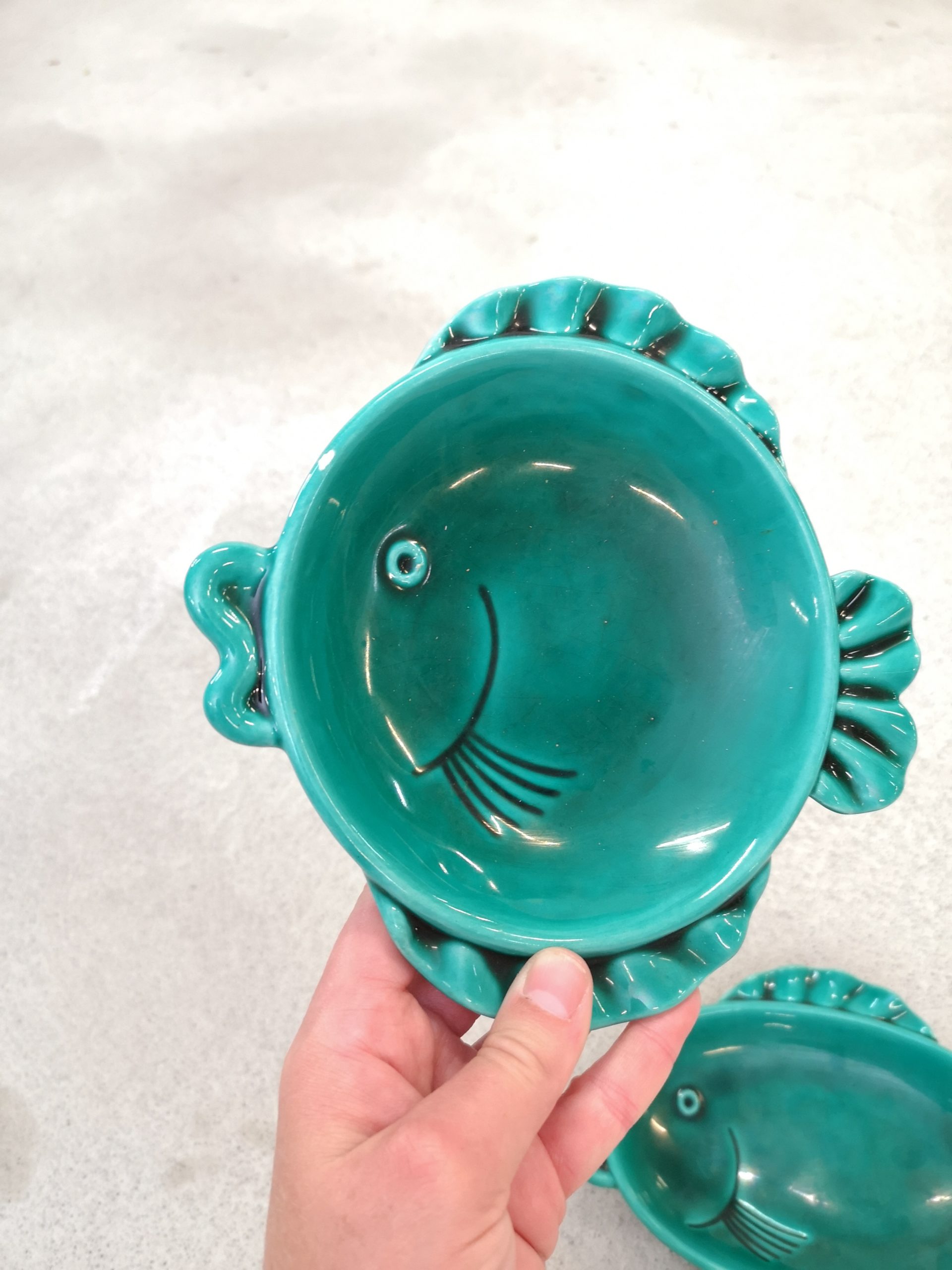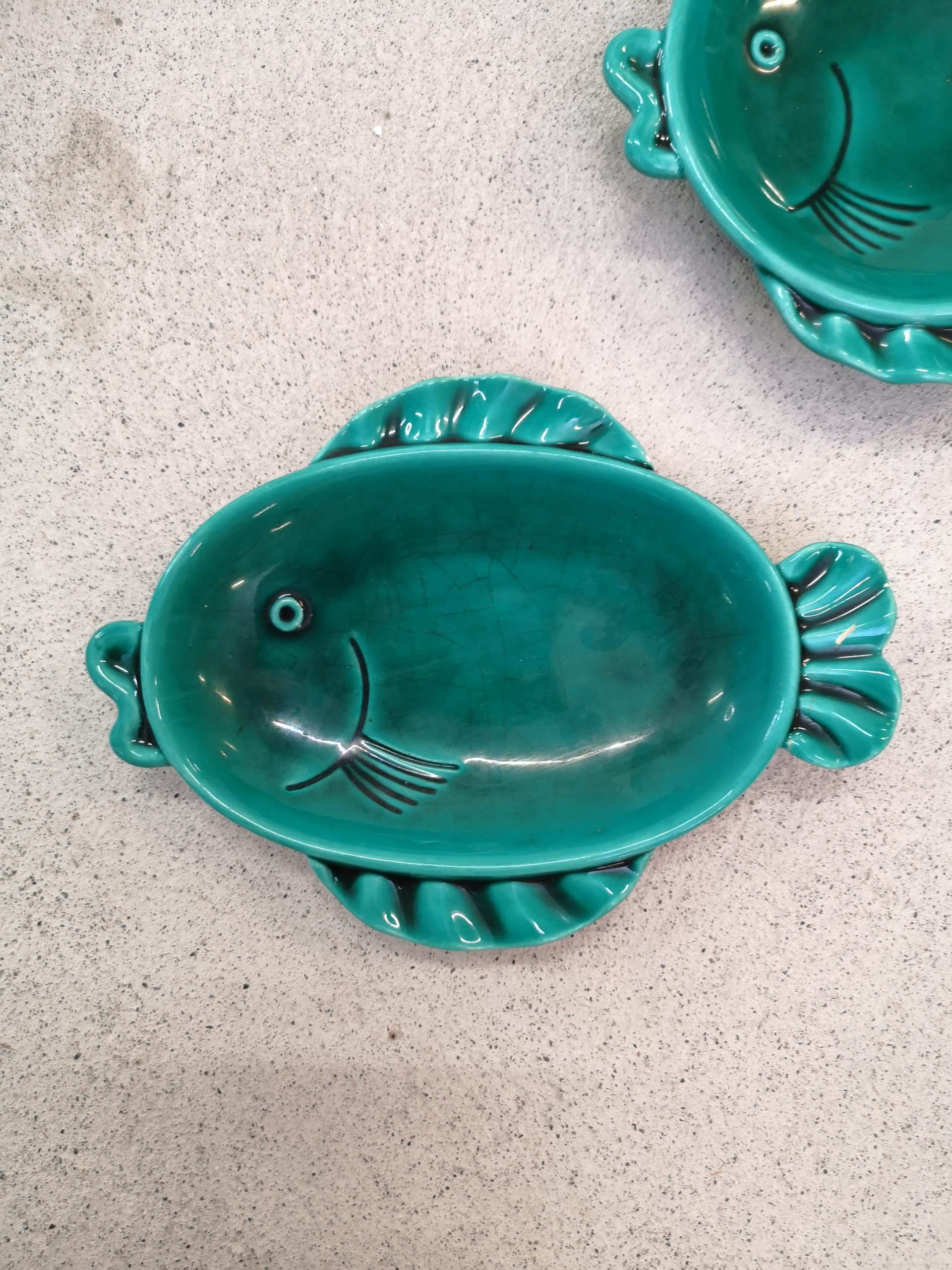 Produit venduPaire de petit plats de la forme d’un poisson de couleur bleu/vert avec au dos l’inscription ” V Made in France”. Le poisson le plus long (dimensions : 18.5 x 19.5 x 4 cm) a un éclat au niveau de la queue. Le poisson le plus rond (dimensions : 16.5 x 23 x 4 cm) a un éclat au dessus de la bouche.