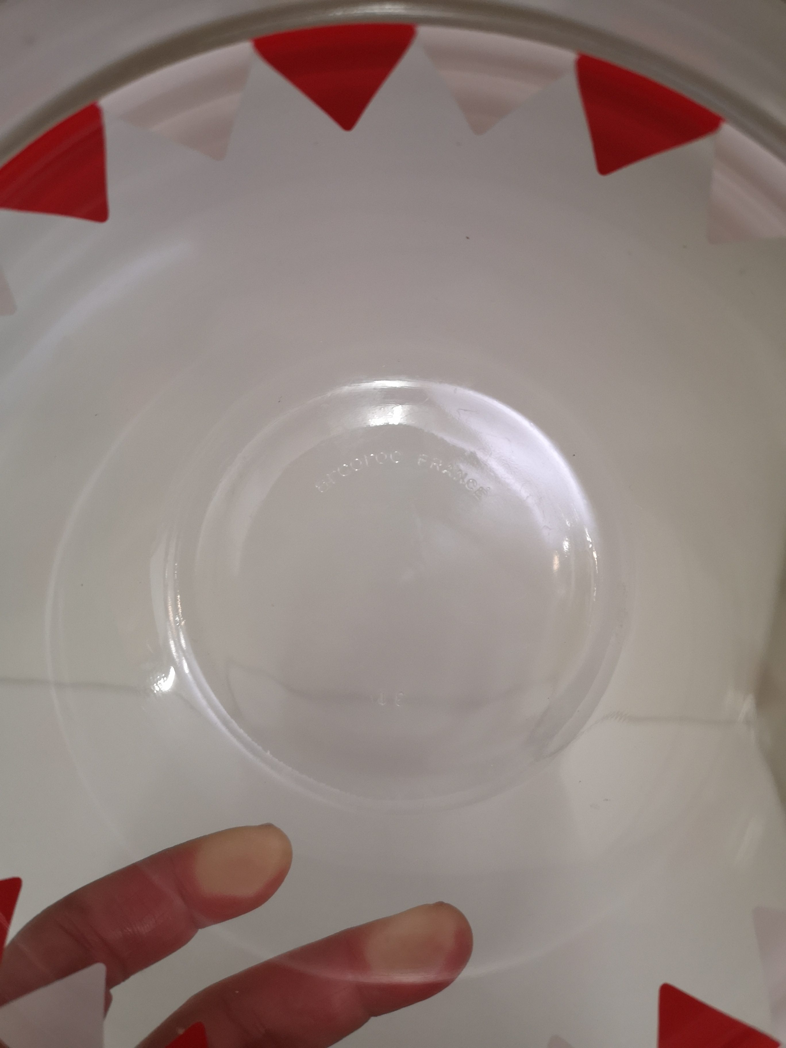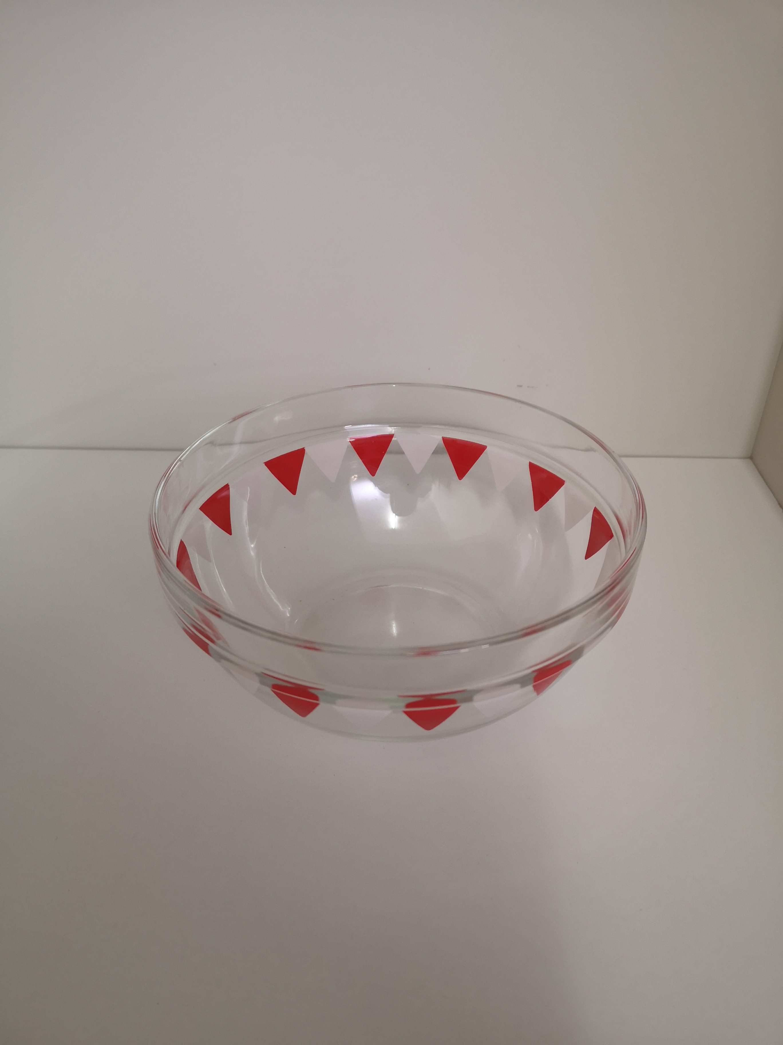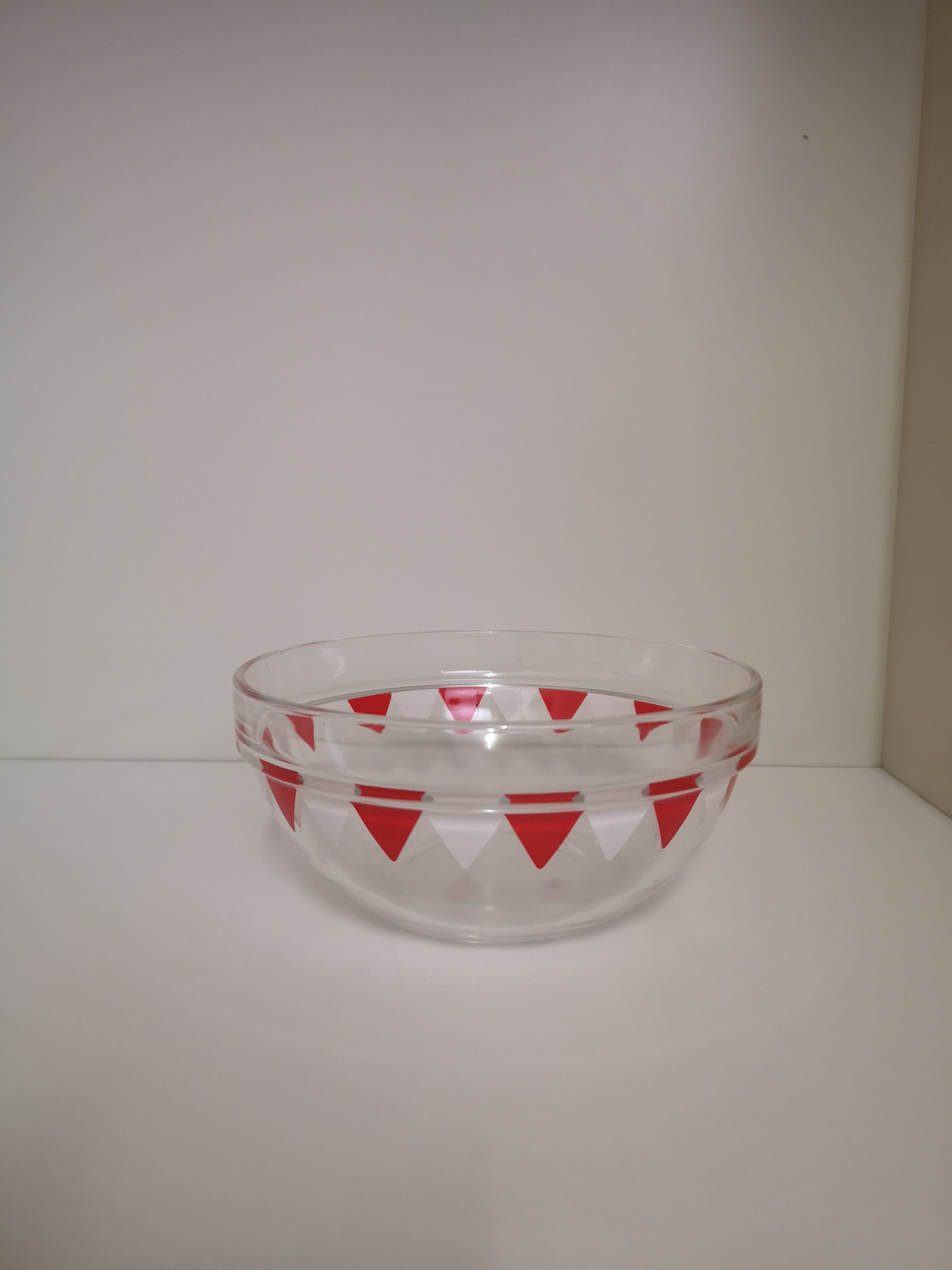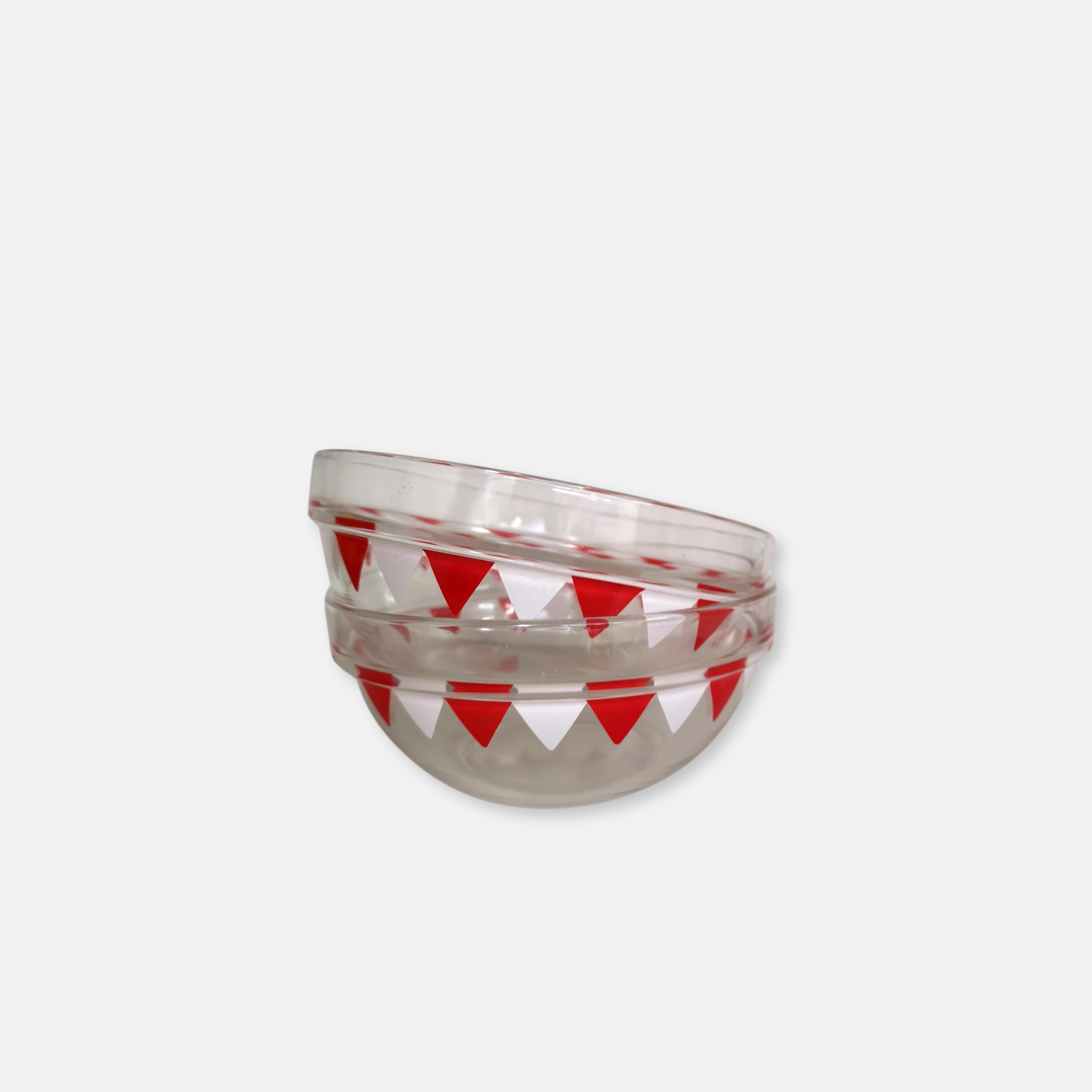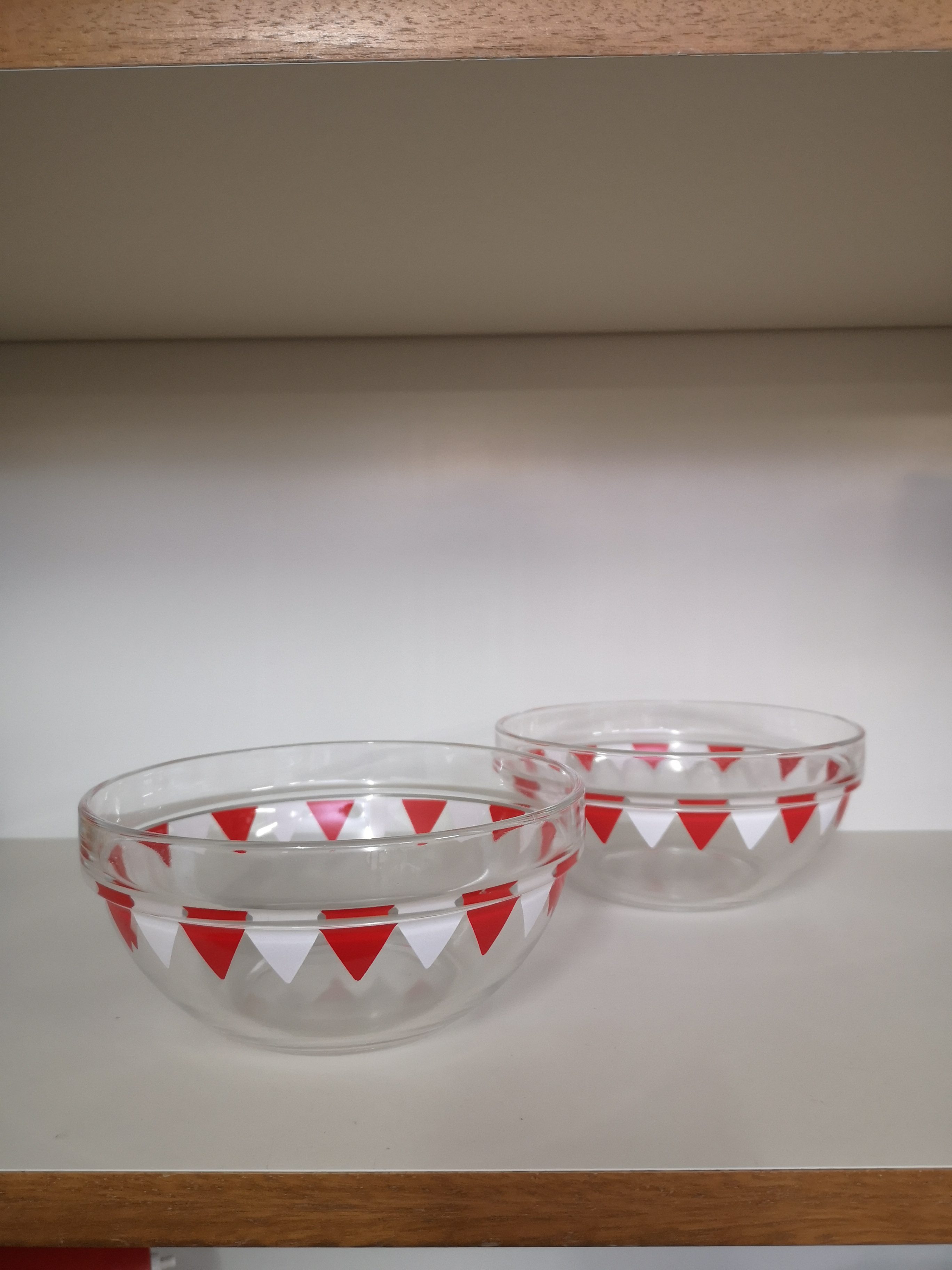 Produit venduPaire de saladiers en verre et empilables de la marque Arcoroc (France) avec une jolie banderole rouge et blanc.