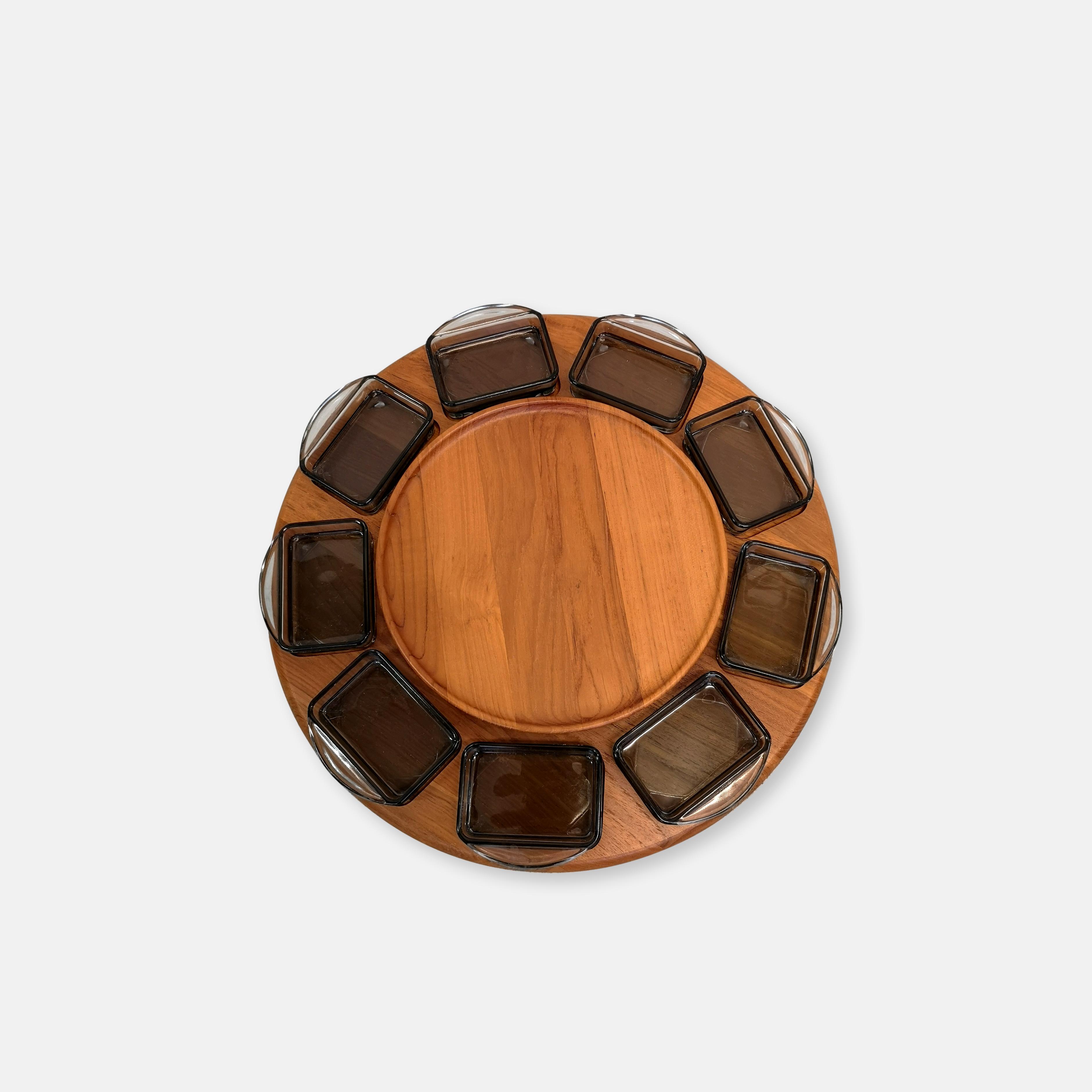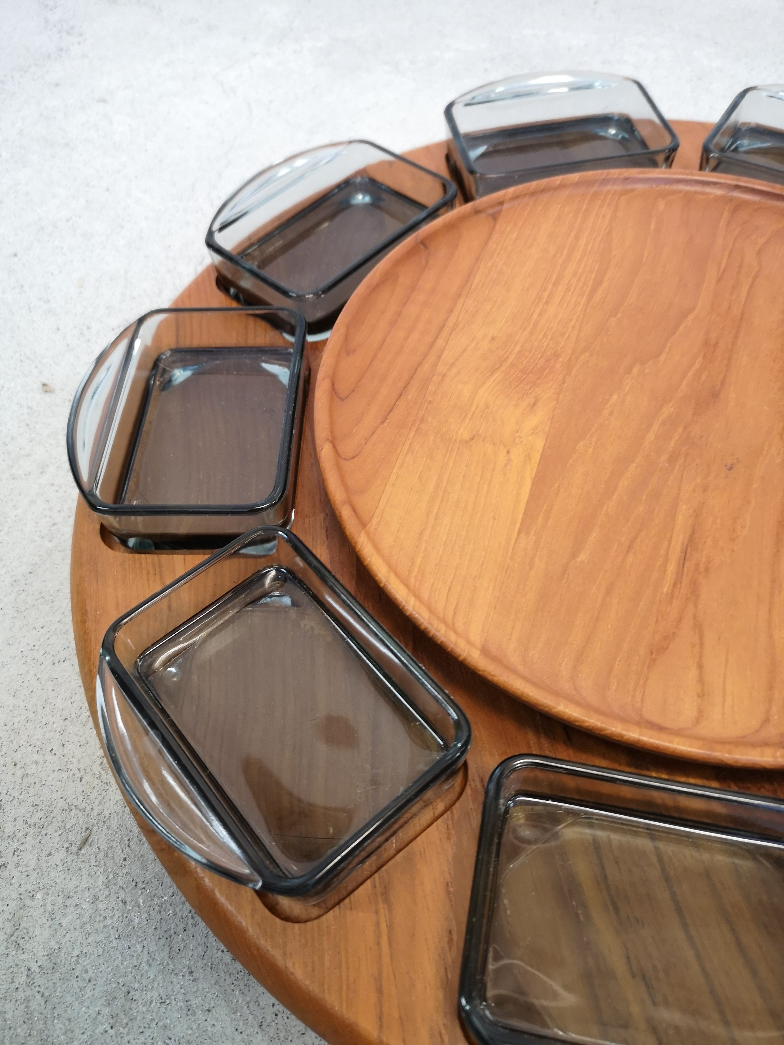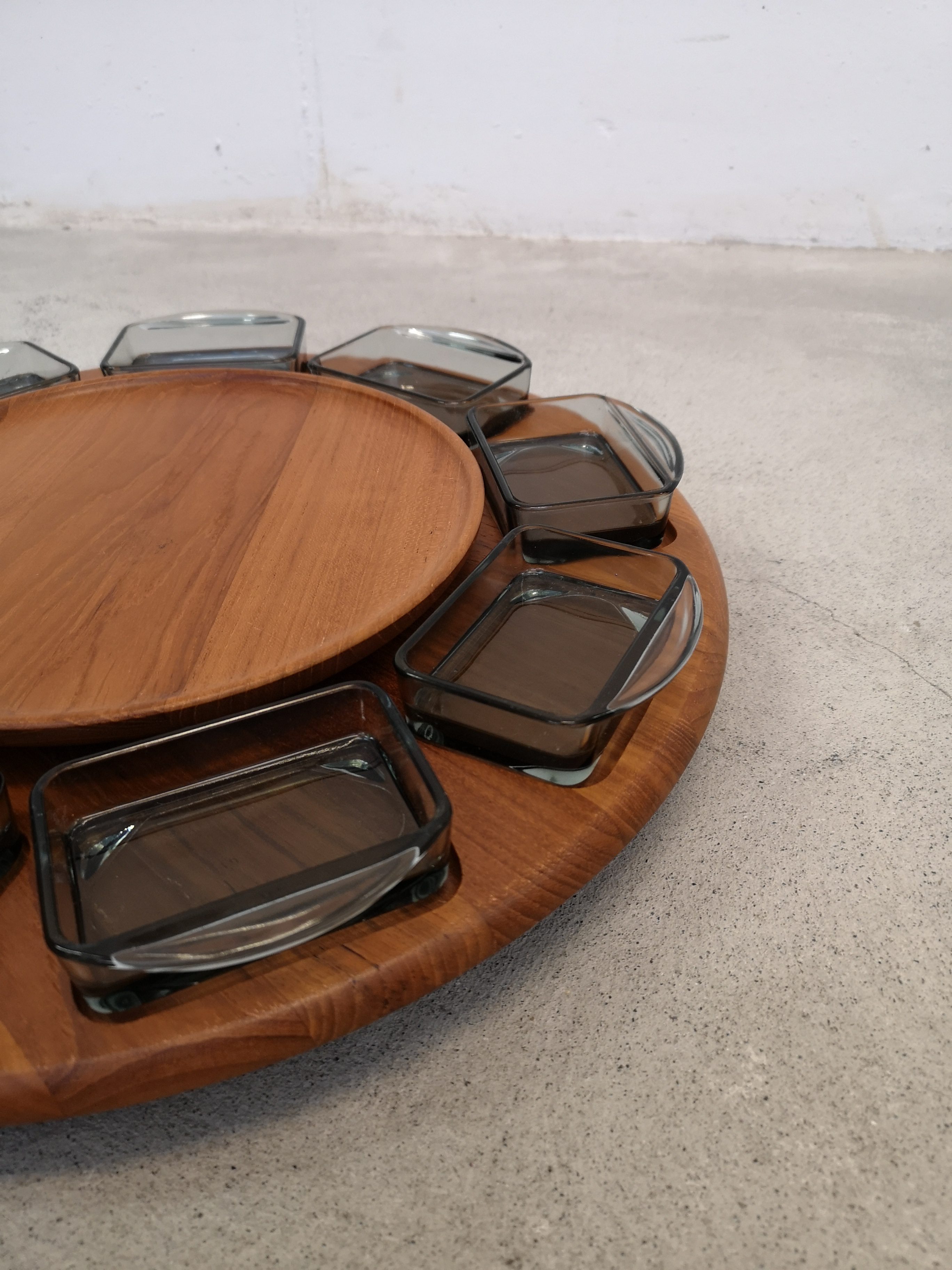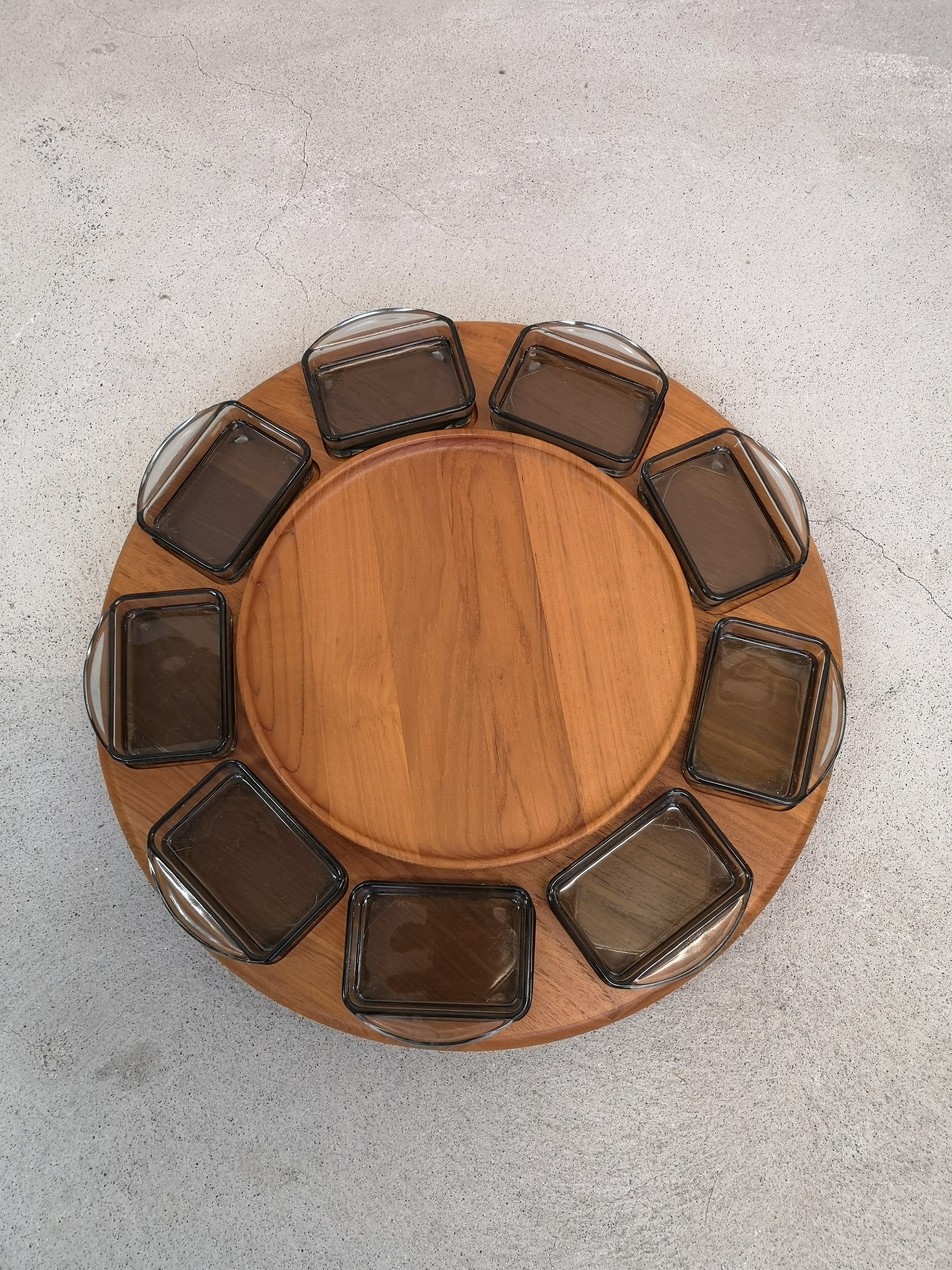 Produit venduPlateau tournant danois de la marque Flemming Digsmed pour Nissen en teck avec ces 9 raviers en verre fumé. Le plateau tourne très bien et les raviers sont en parfait état.