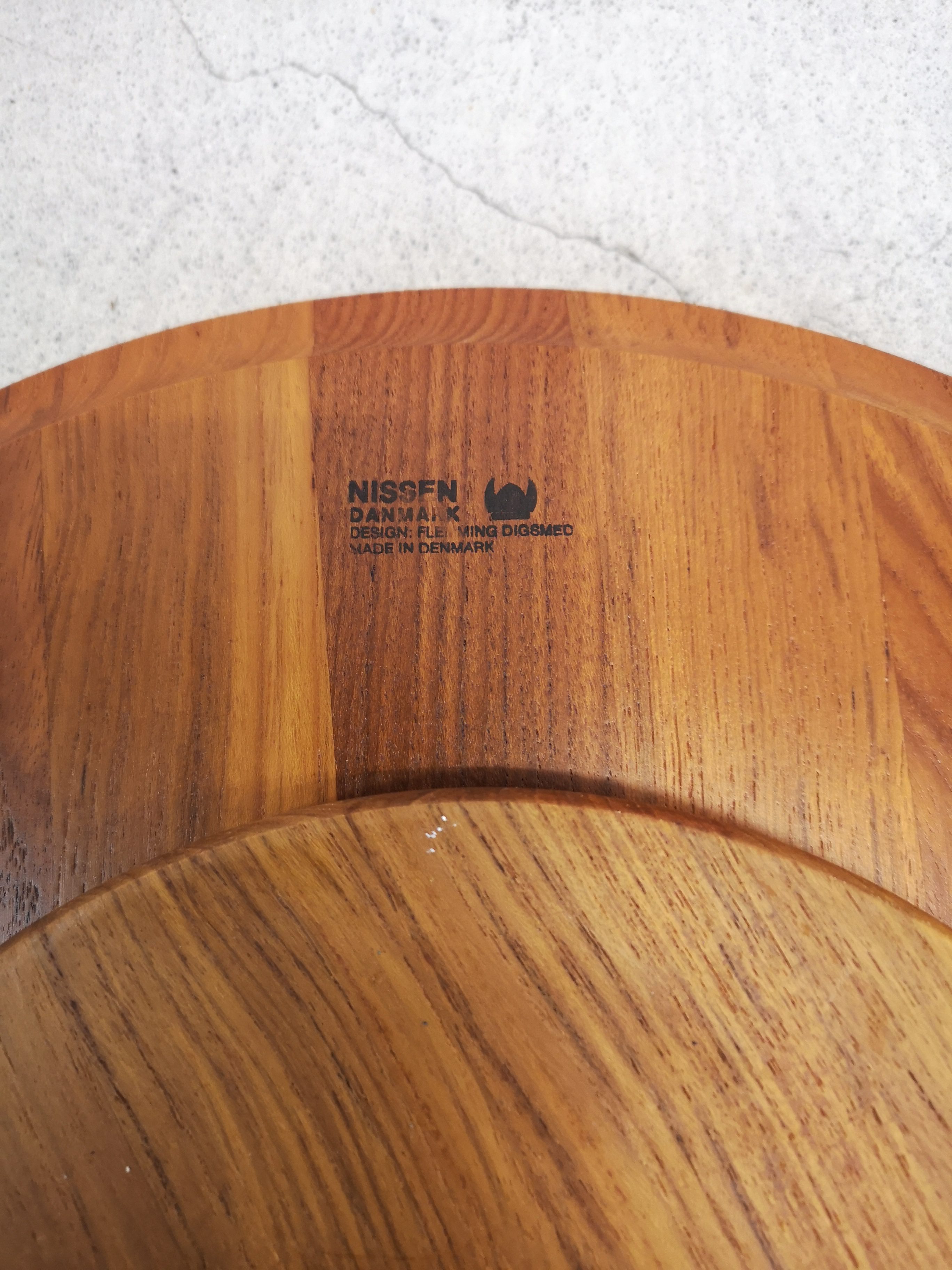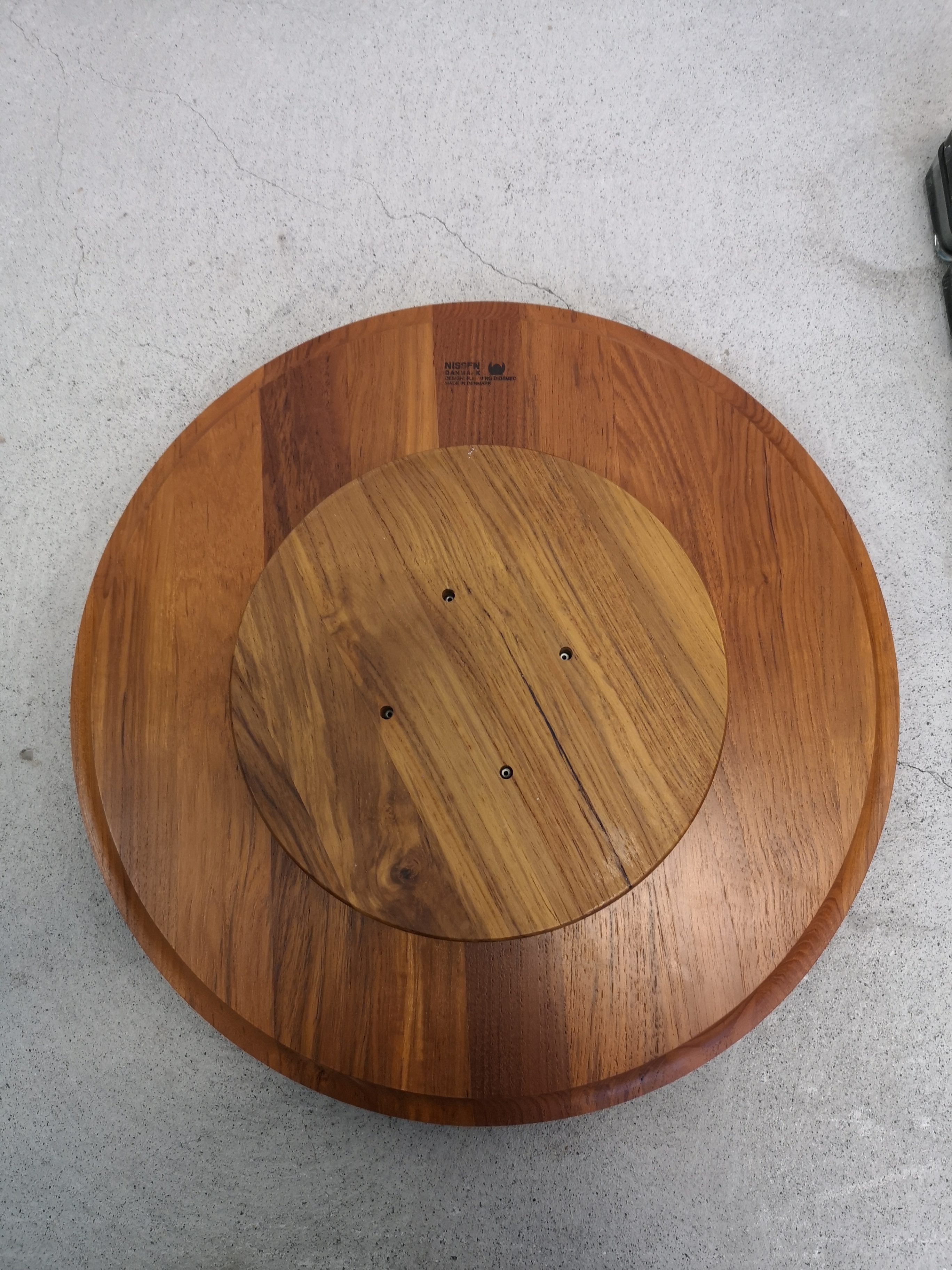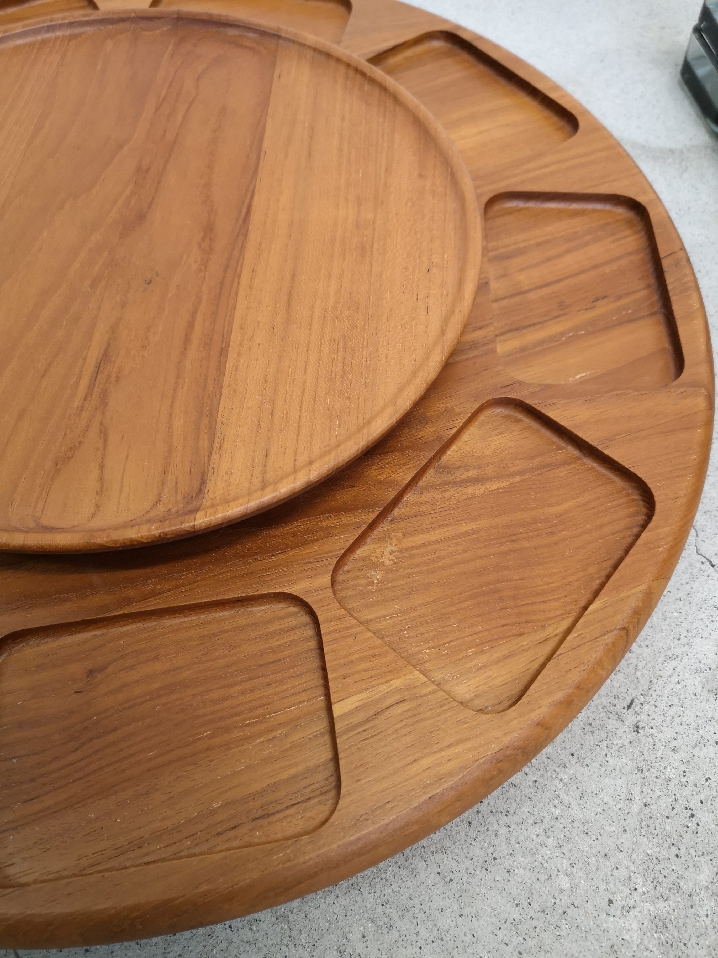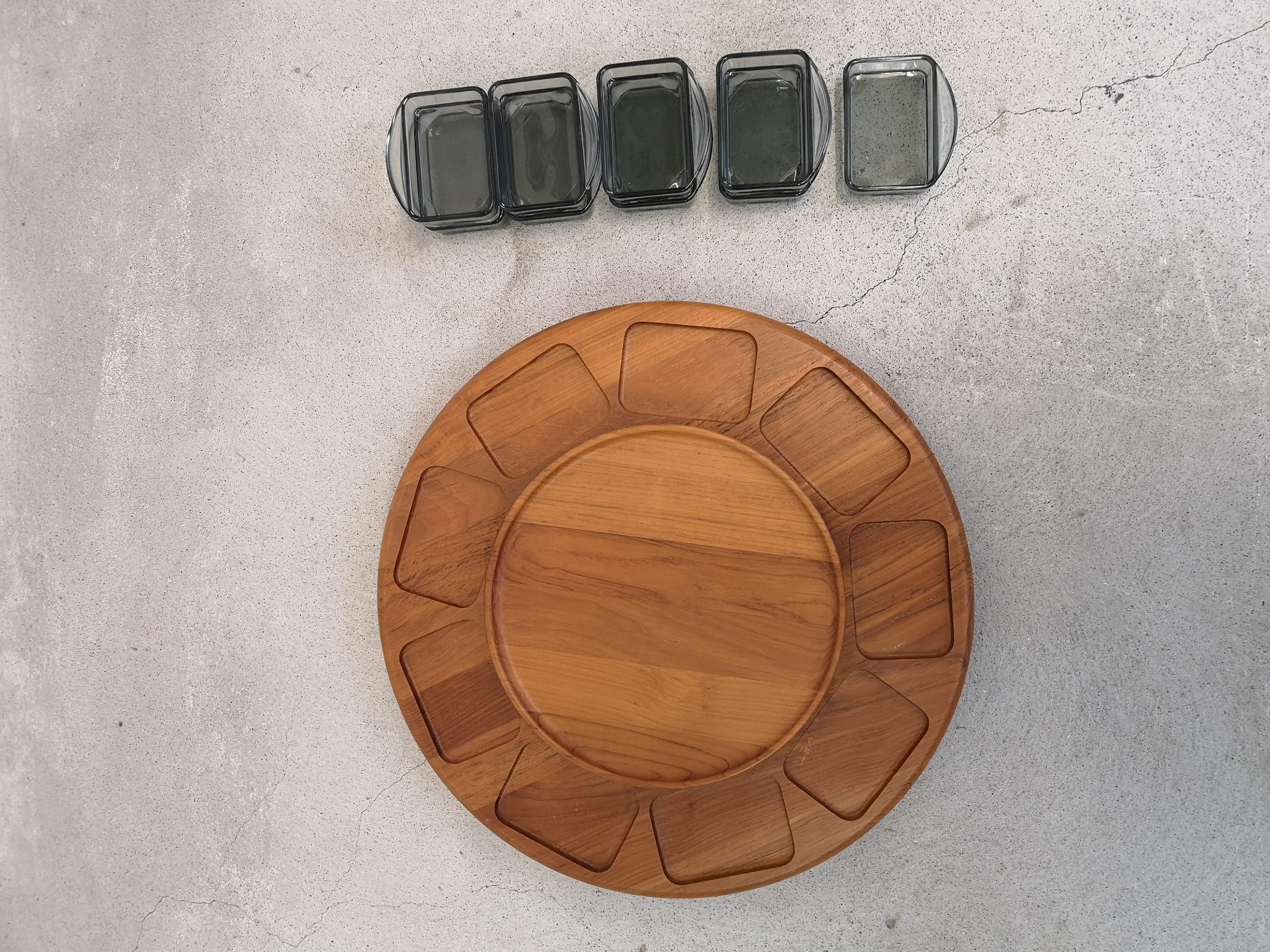 Produit venduPlateau tournant danois de la marque Flemming Digsmed pour Nissen en teck avec ces 9 raviers en verre fumé. Le plateau tourne très bien et les raviers sont en parfait état.