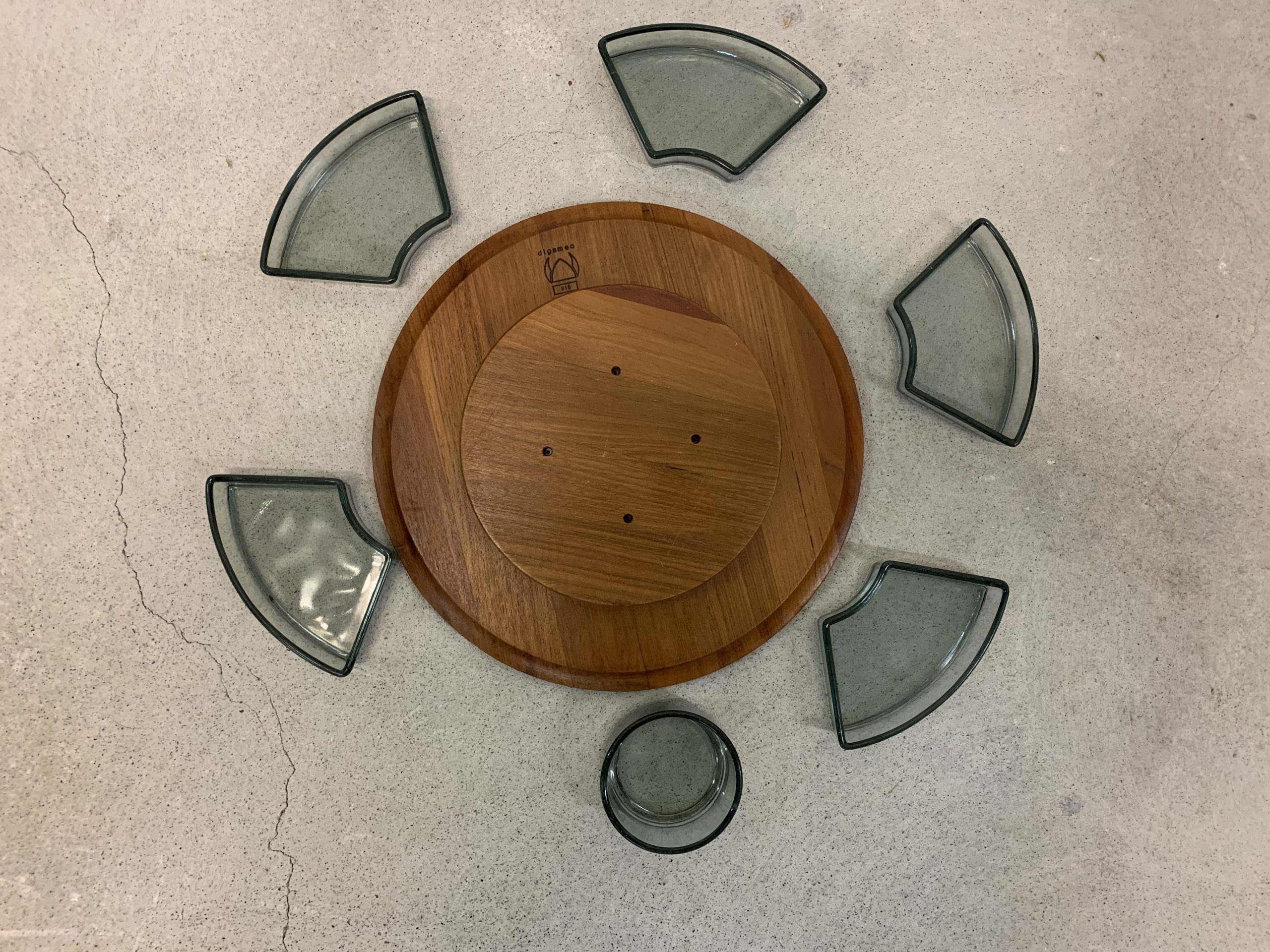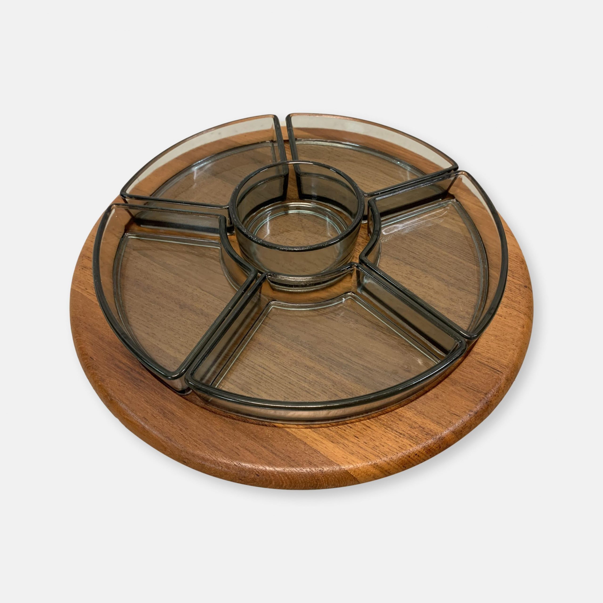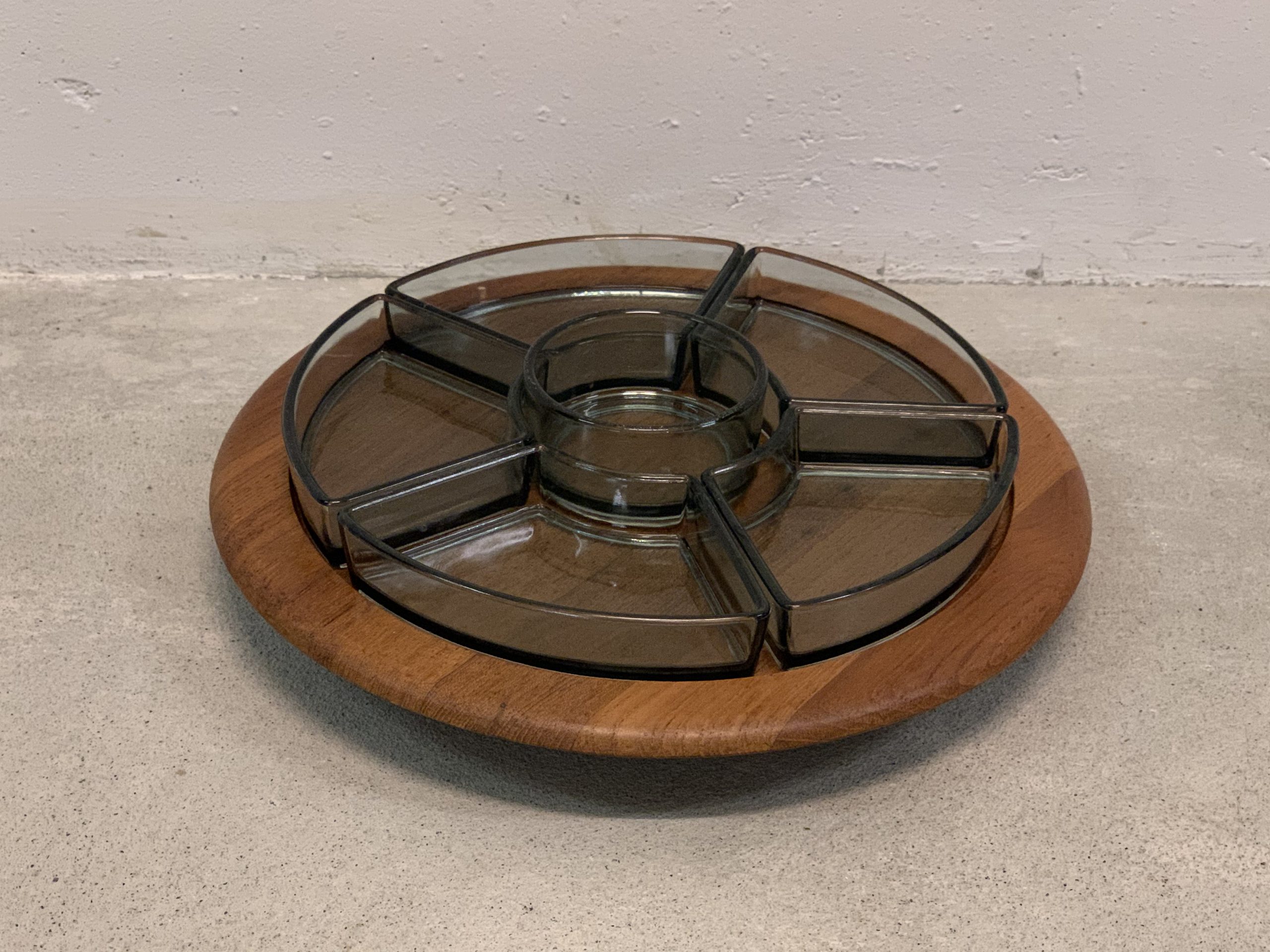 Produit venduPlateau pivotant avec 6 raviers pour bien séparer les olives, cacahuètes et autres victuailles qui accompagneront vos apéros endiablés. Fabrication danoise, en teck. Quelques traces d’utilisation sur le bois ainsi que sur le verre, mais rien de cassé ou de fissuré!