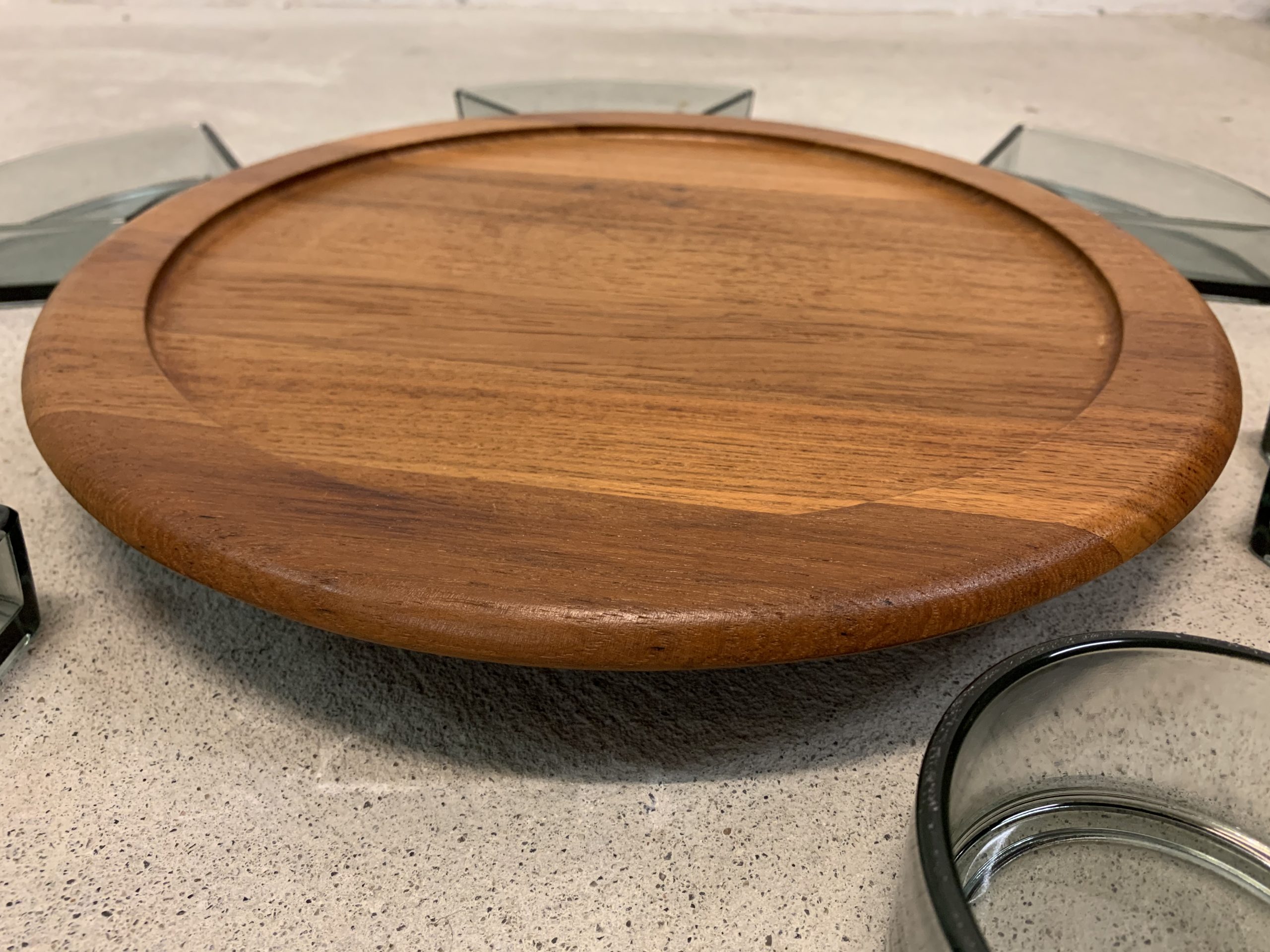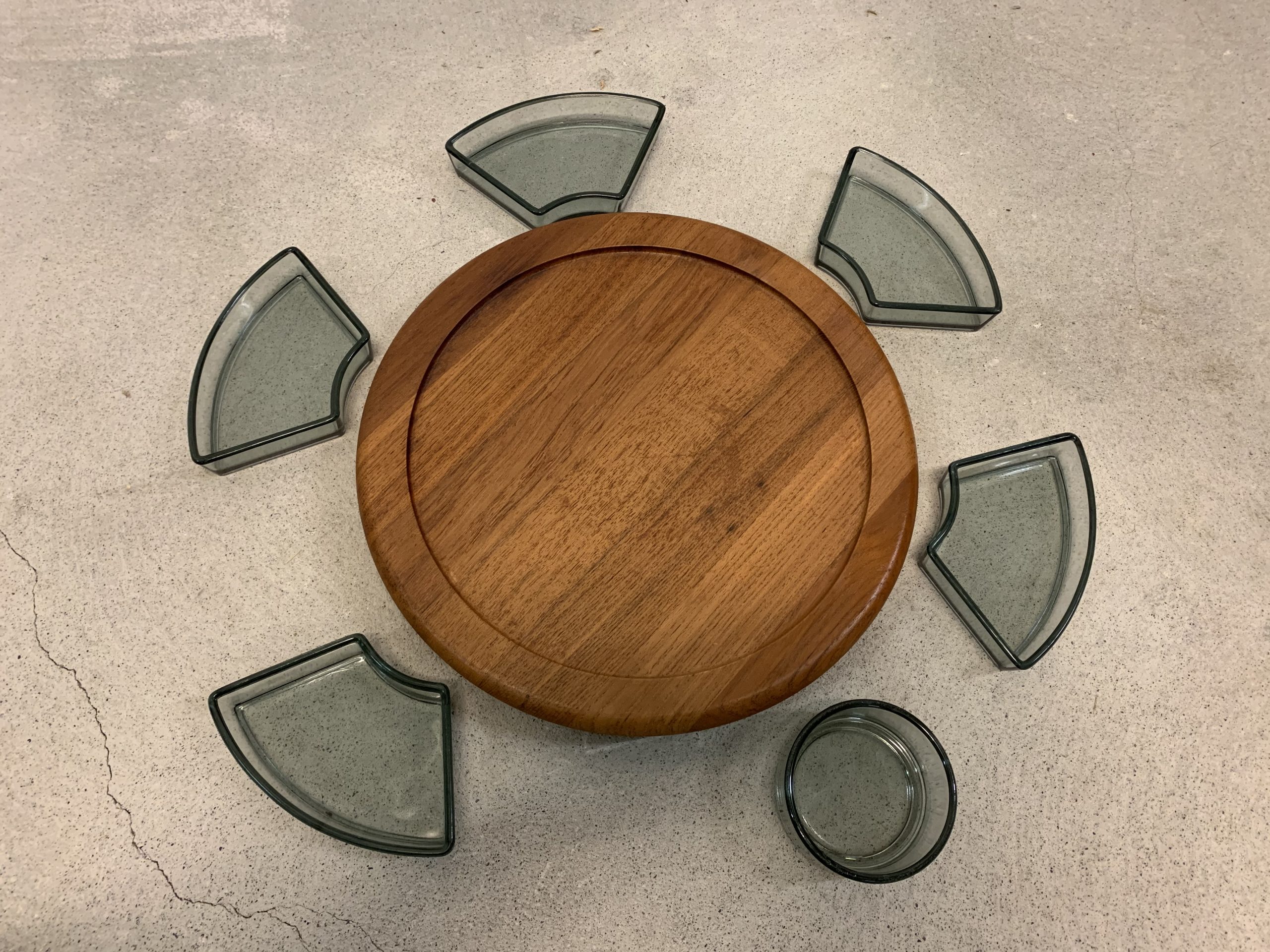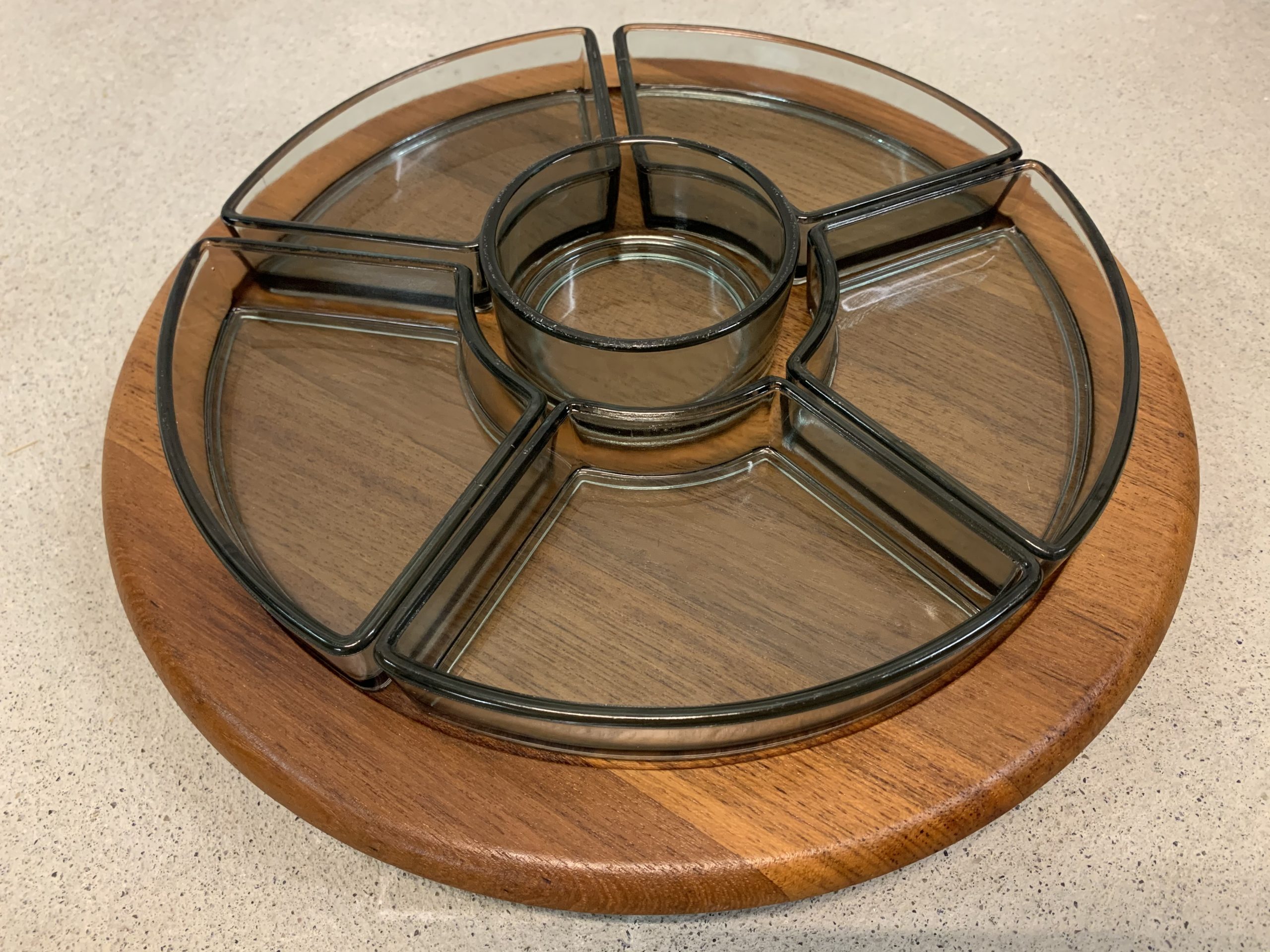 Produit venduPlateau pivotant avec 6 raviers pour bien séparer les olives, cacahuètes et autres victuailles qui accompagneront vos apéros endiablés. Fabrication danoise, en teck. Quelques traces d’utilisation sur le bois ainsi que sur le verre, mais rien de cassé ou de fissuré!