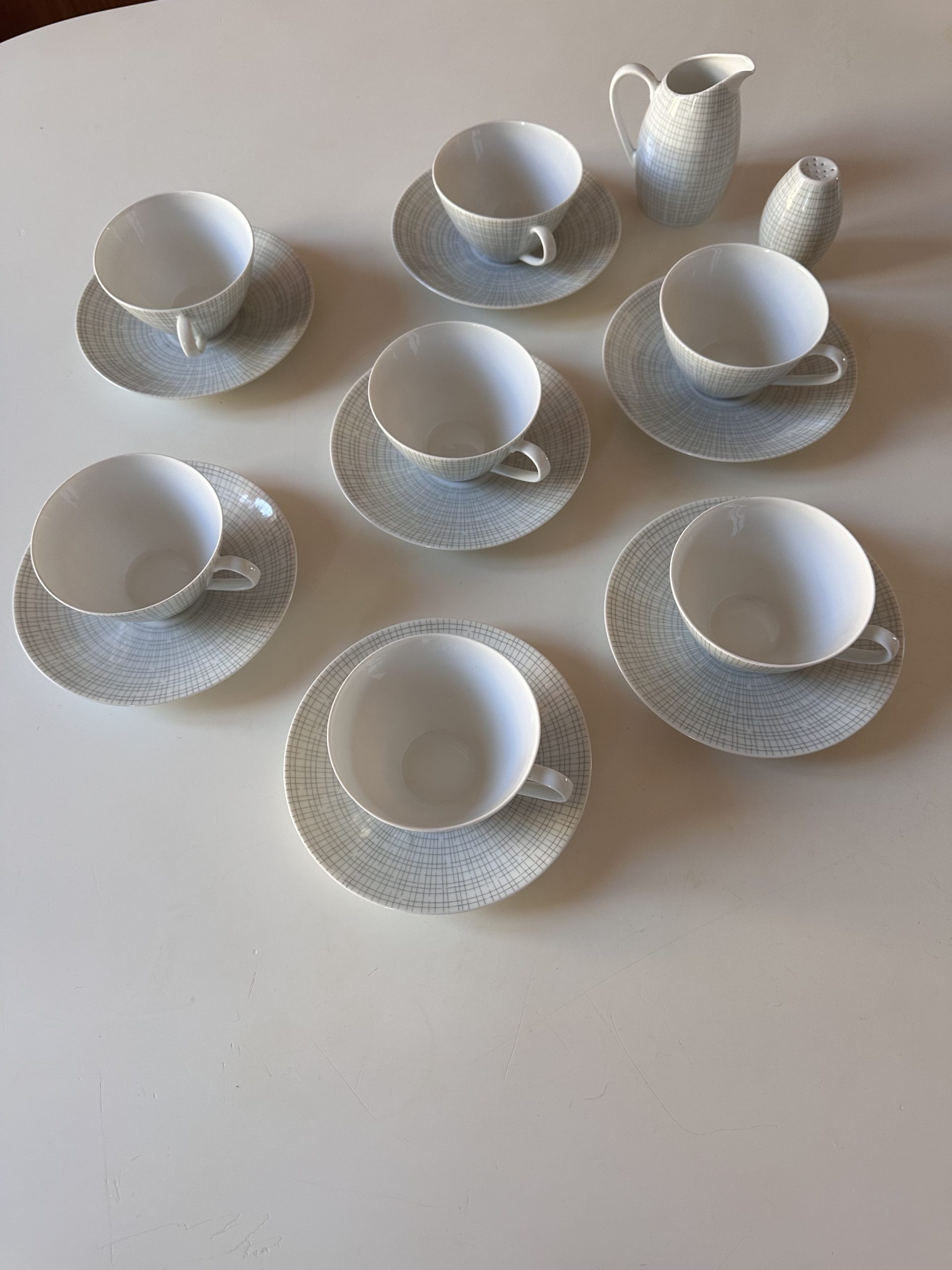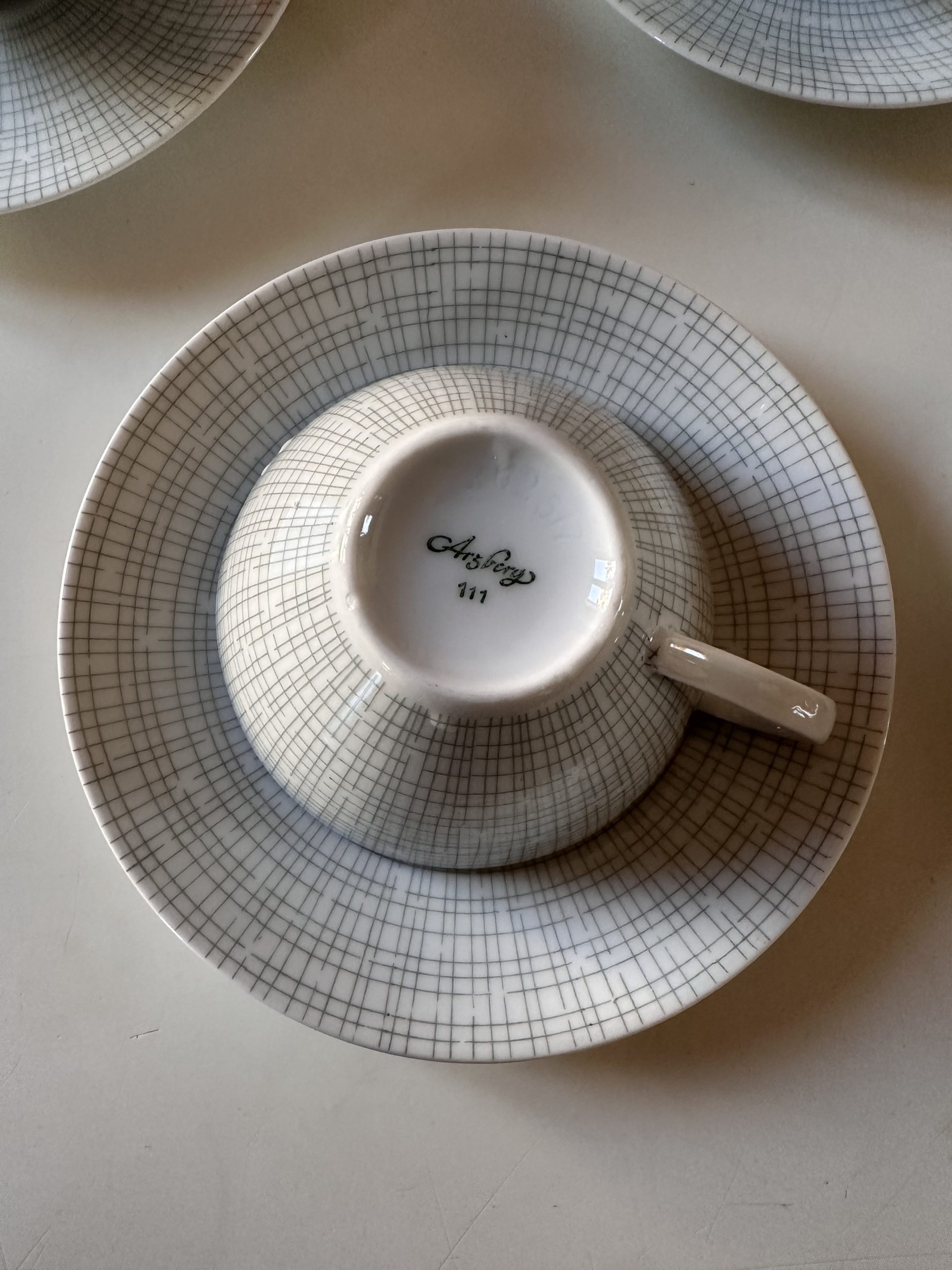 Le lot comprend 7 tasses et 7 sous-tasses en très bon état, ainsi qu’un pot à lait et un sucrier assortis. L’ensemble principal ne présente ni éclat ni fêlure. Les pièces sont propres, bien conservées et portent le marquage Arzberg sous la base.