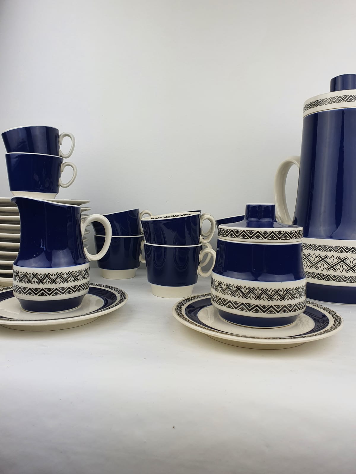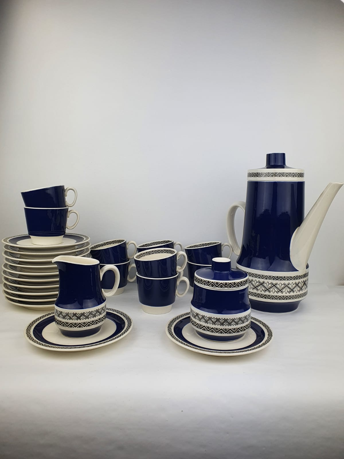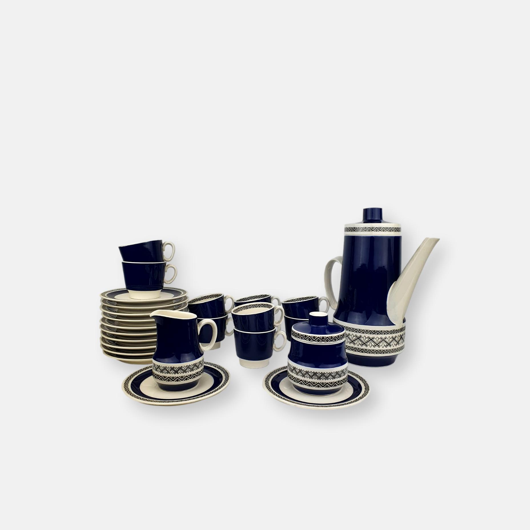 L’ensemble inclut : cafetière, pichet crème, sucrier avec couvercle, 10 tasses à café avec sous tasses.