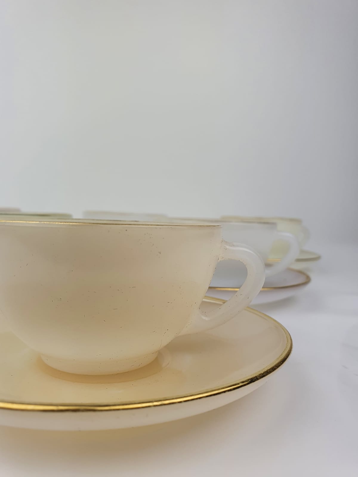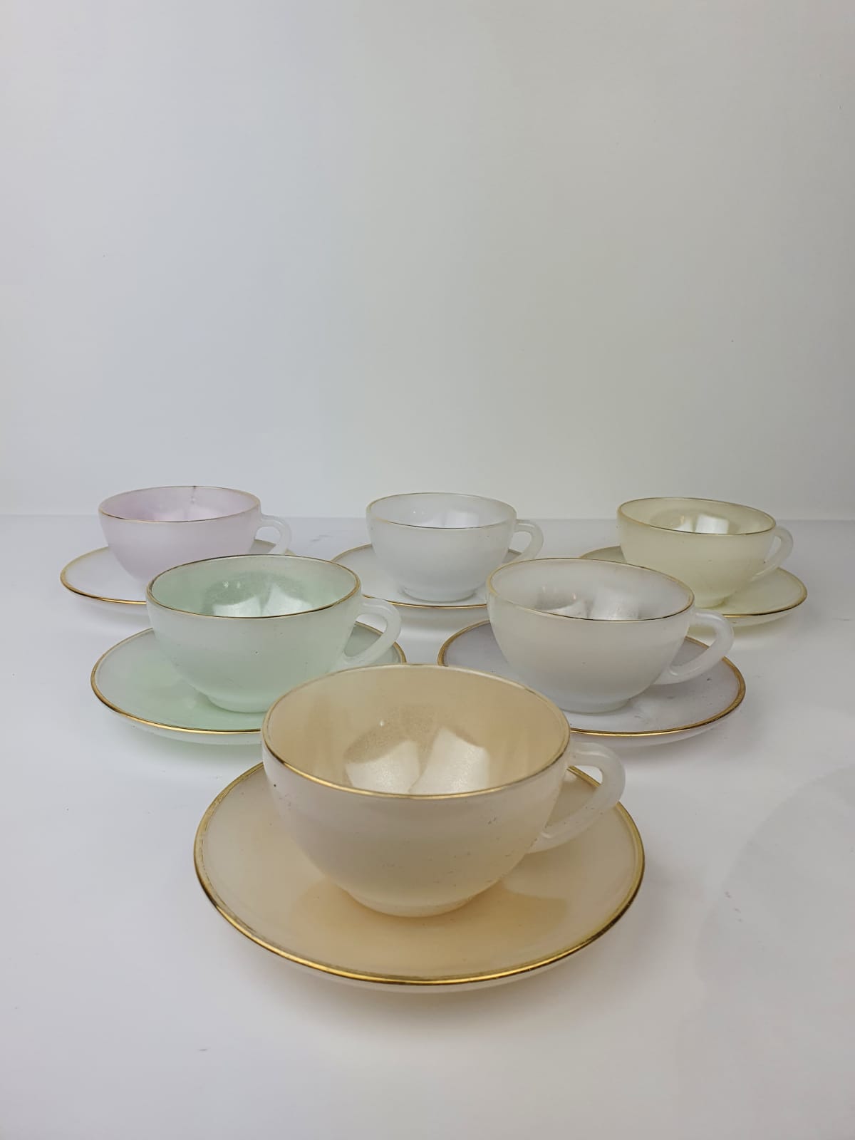 Produit venduSet de 6 tasses et sous-tasses a café en opaline. Produites par Arcopal dans les années 60.