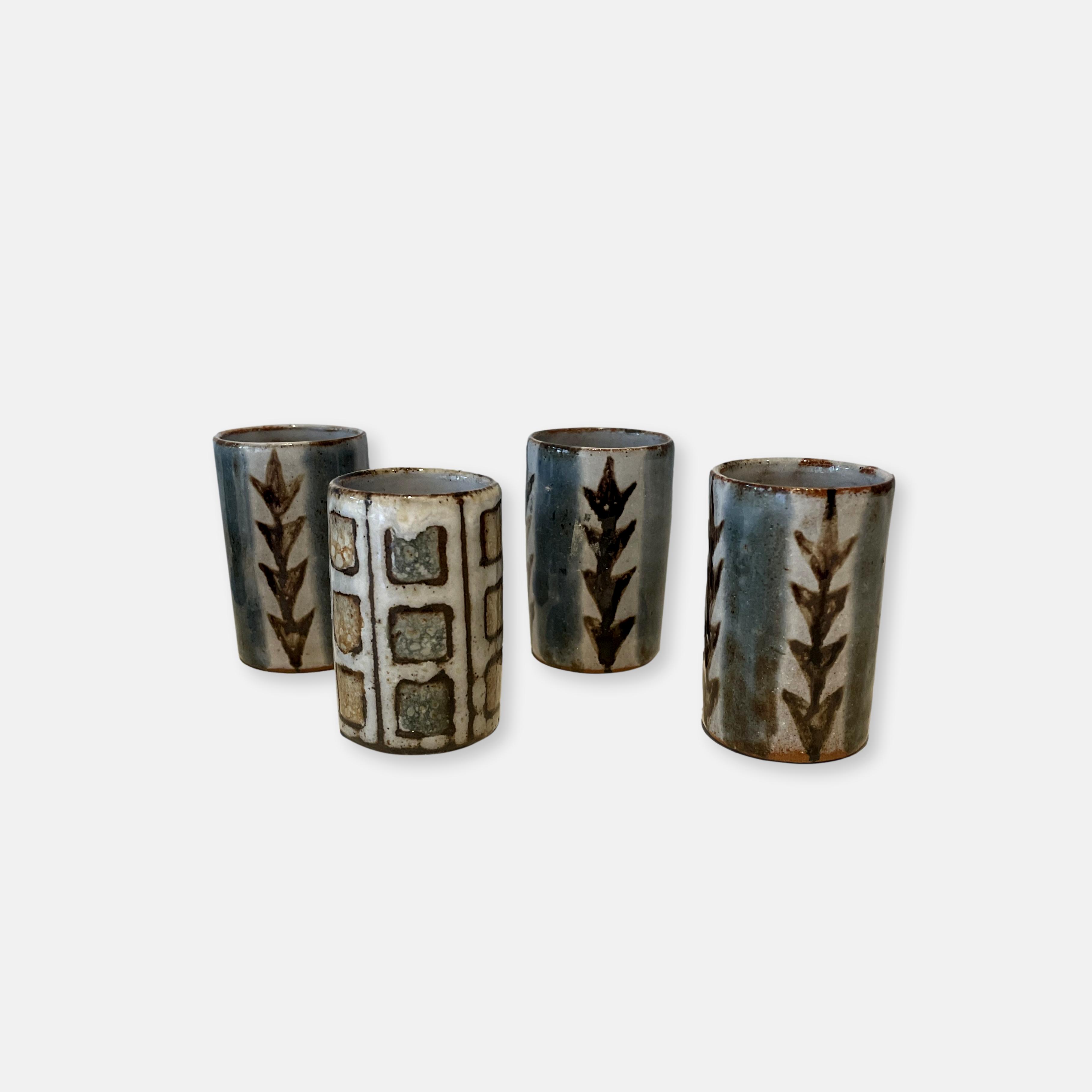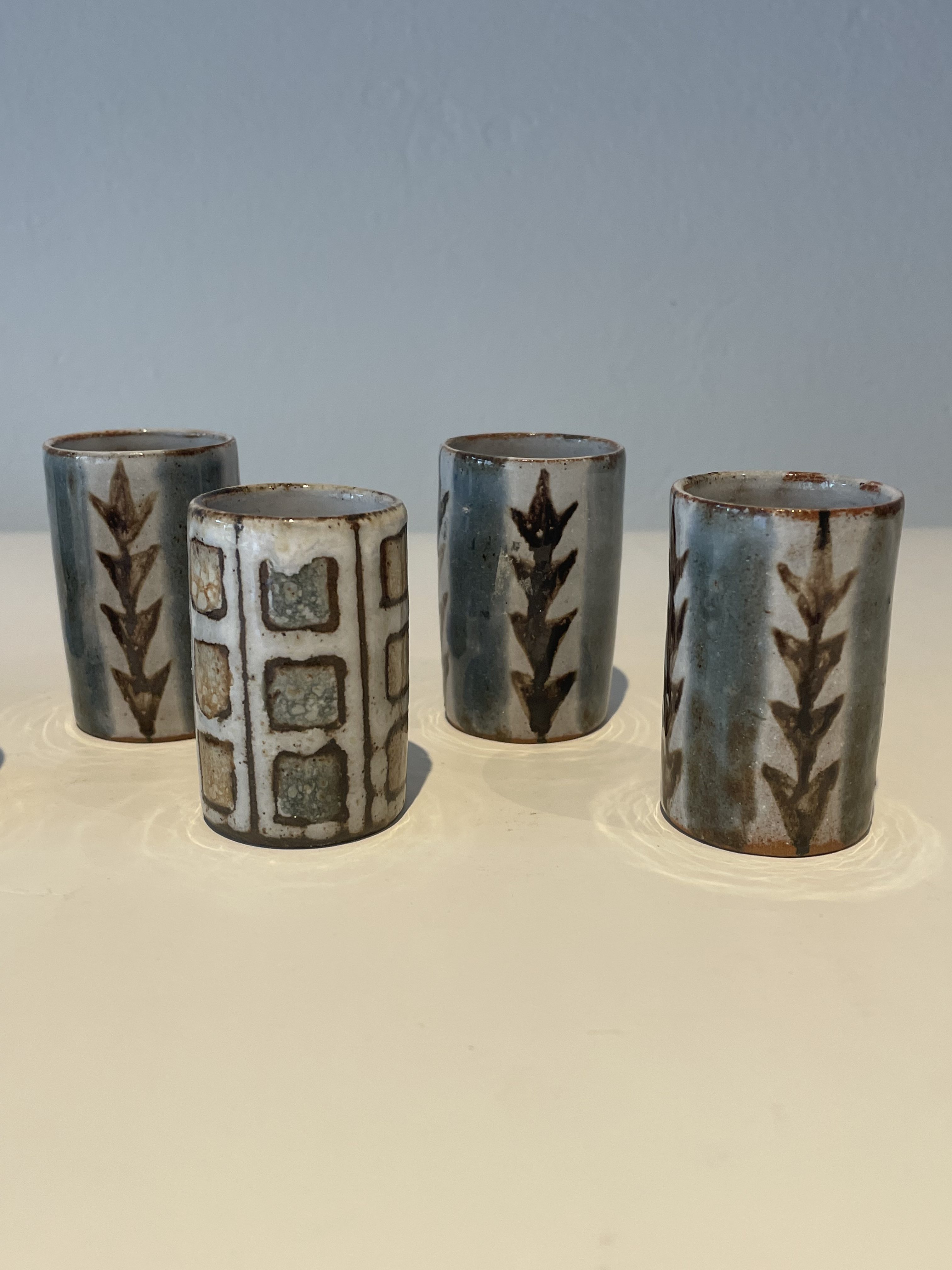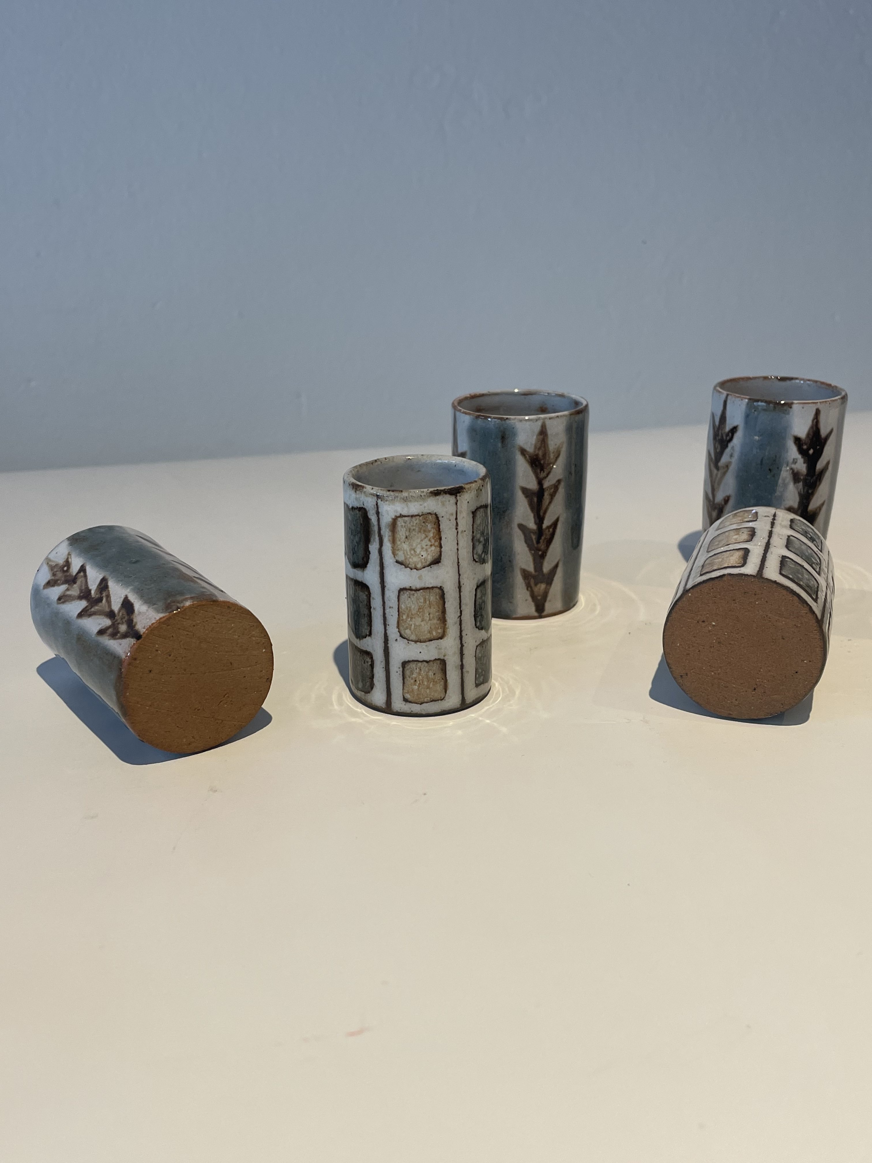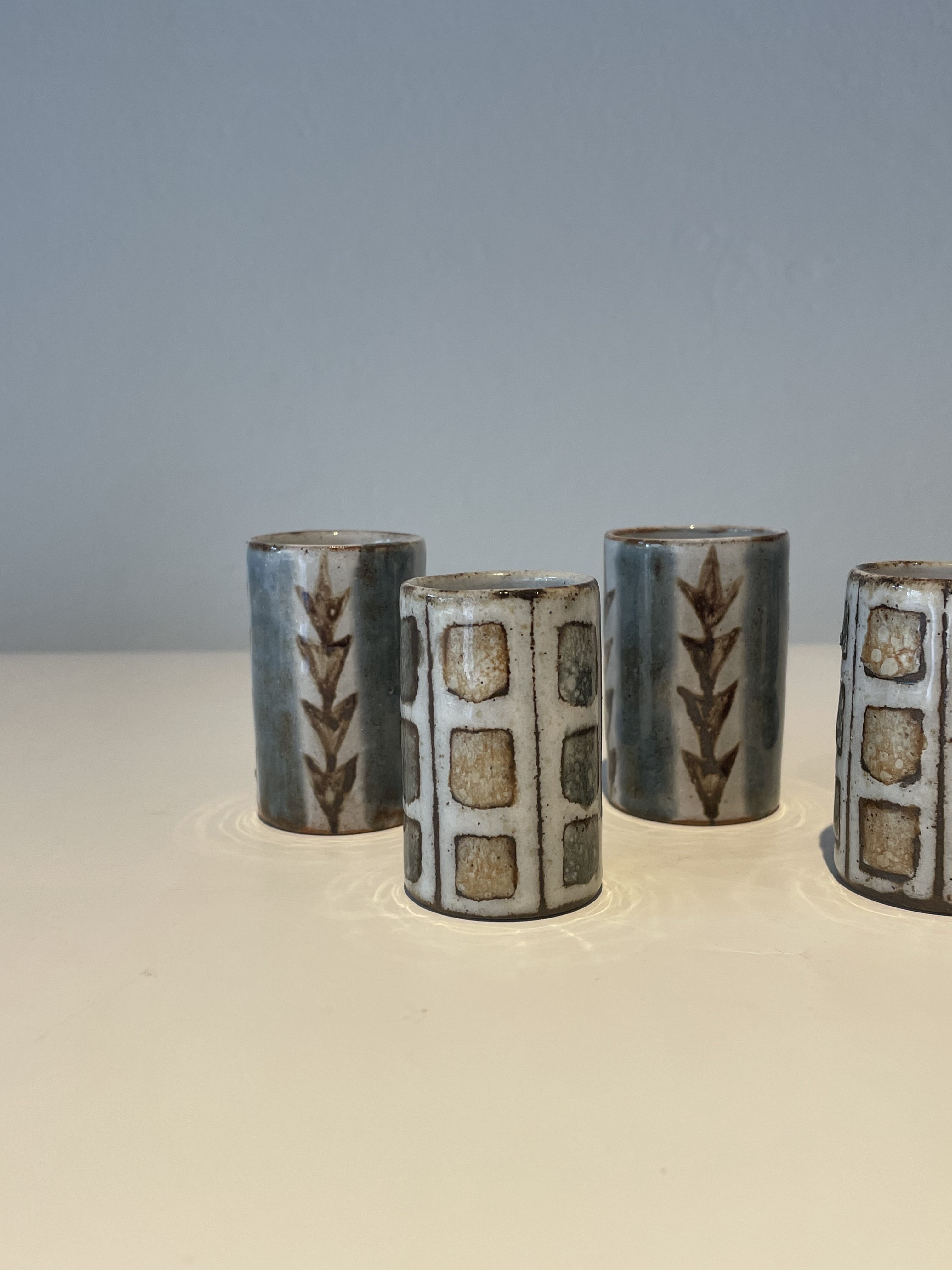 Produit venduJoli set de six verres à liqueur en céramique émaillée dans les tons gris bleu au décor graphique.