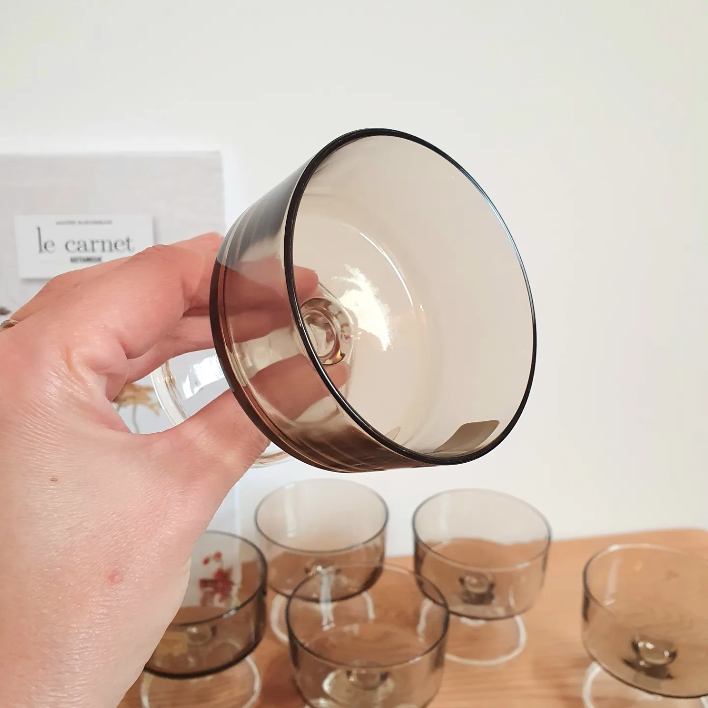 Produit venduLot de 6 coupes à champagne en verre brun fumé. Icônes des années 70, transparentes et teintés d’un joli brun fumé, dont la couleur peut osciller en fonction de la lumière et des reflets.