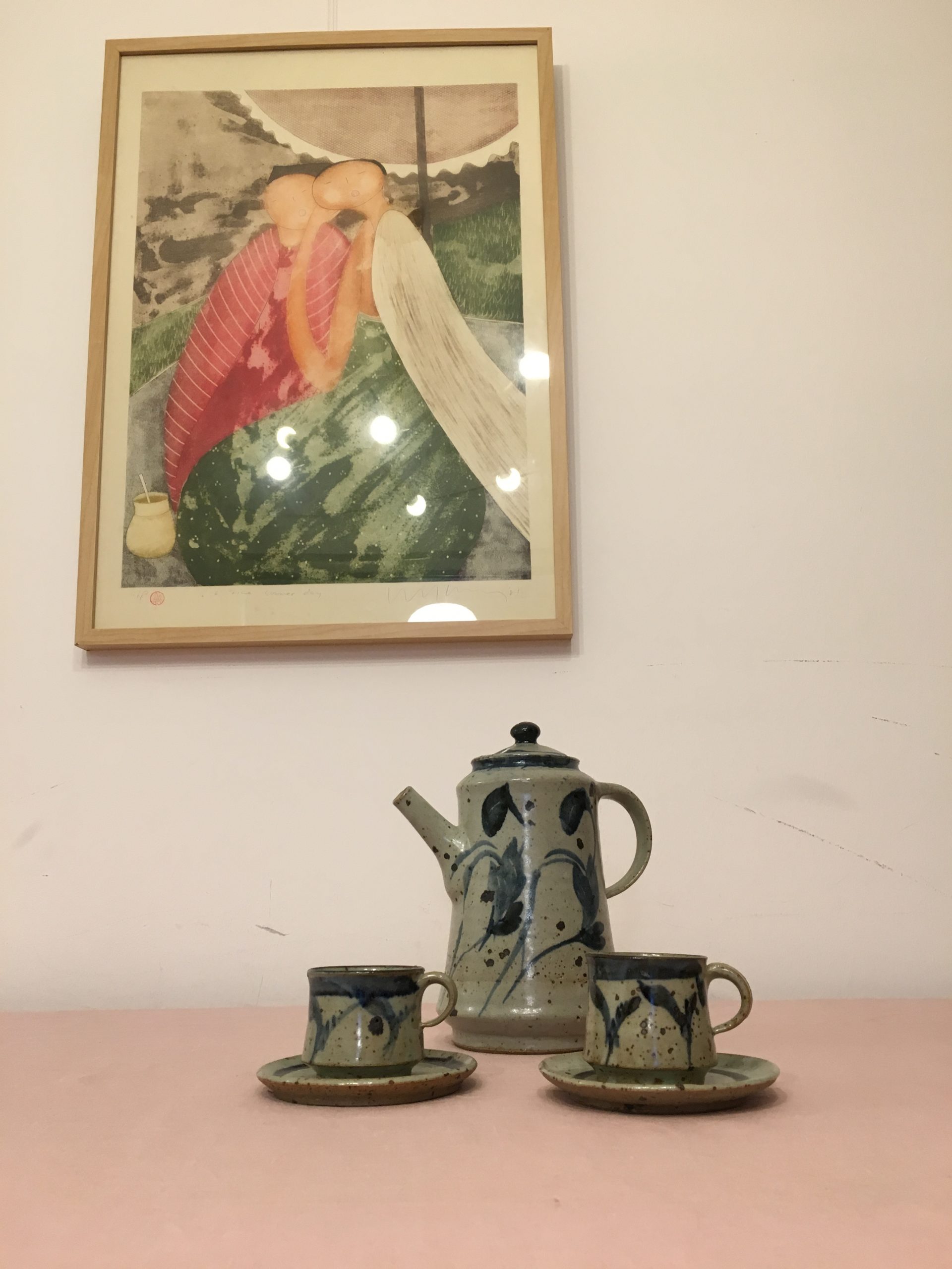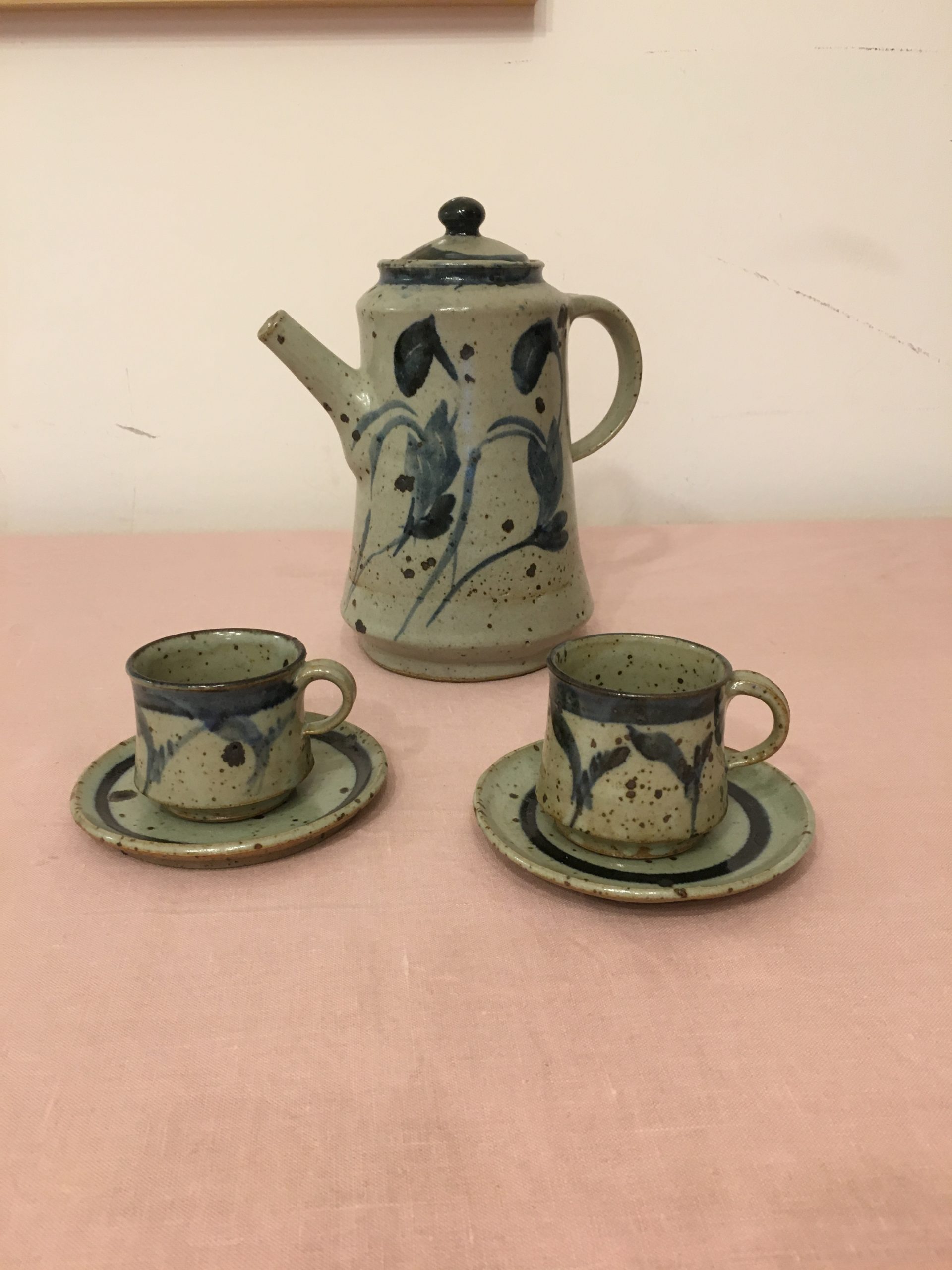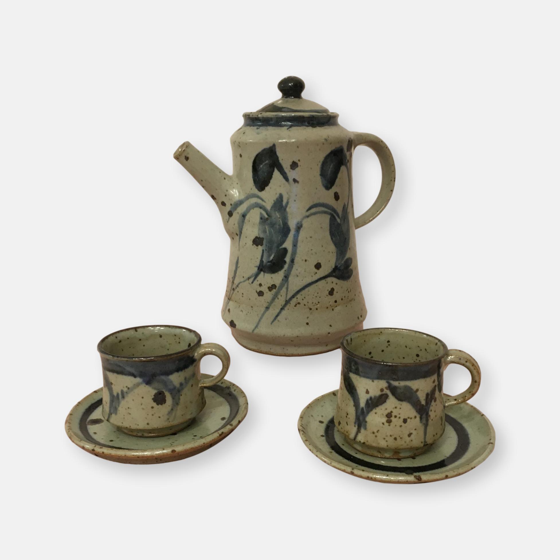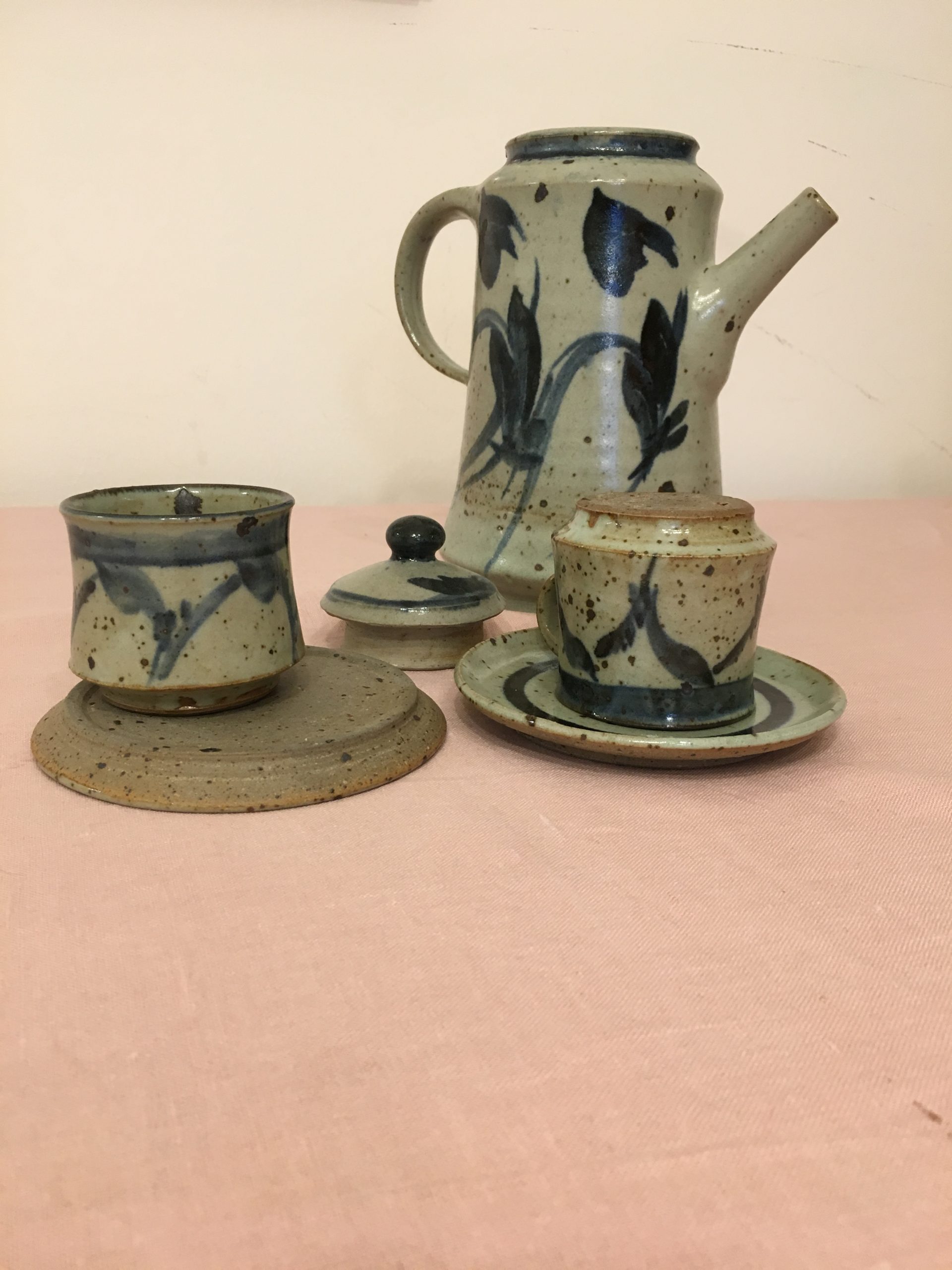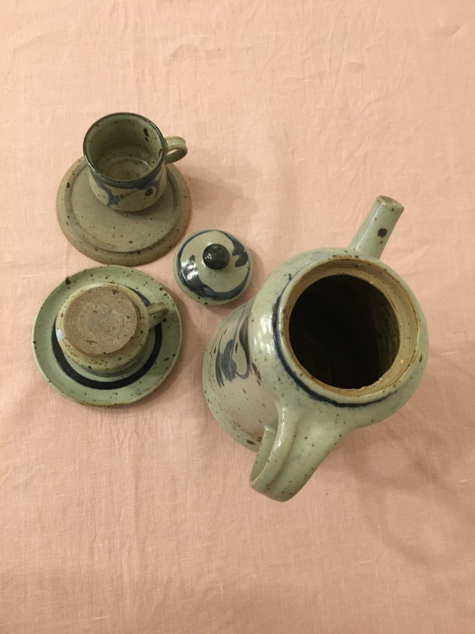 Produit venduService a thé en grès émaillé gris au décor abstrait japonisant dans les tons bleu foncé.