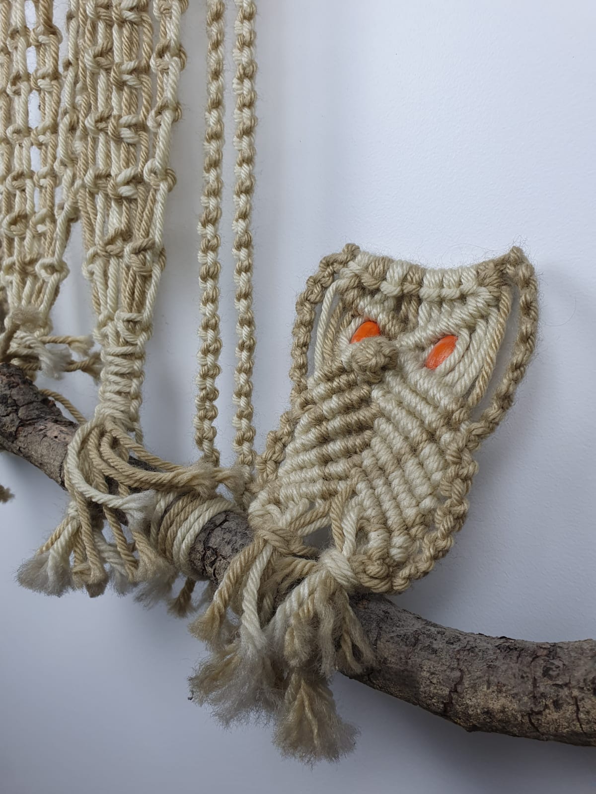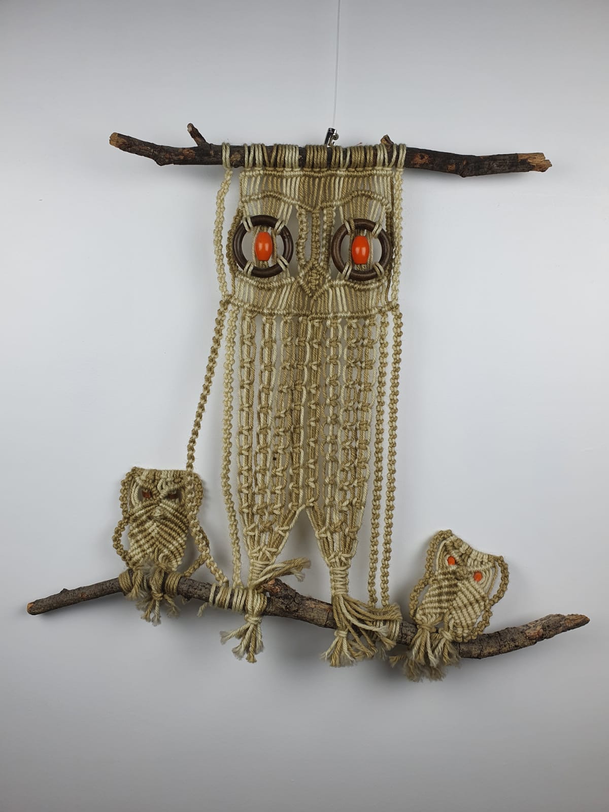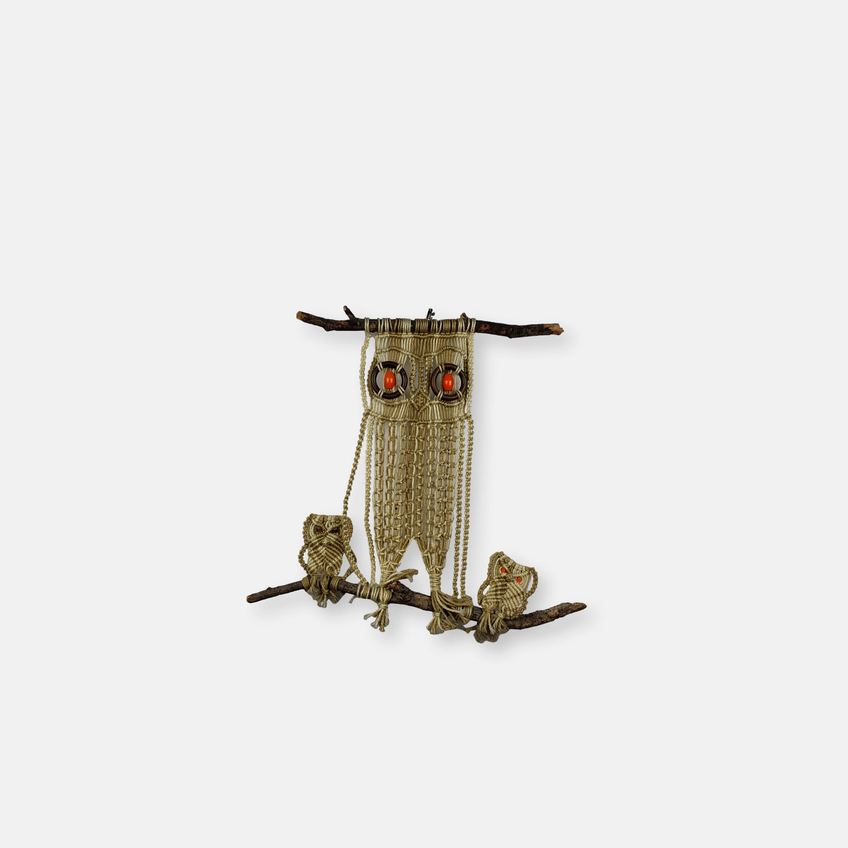 Ancien macramé “hiboux” avec perles en bois des années 70
