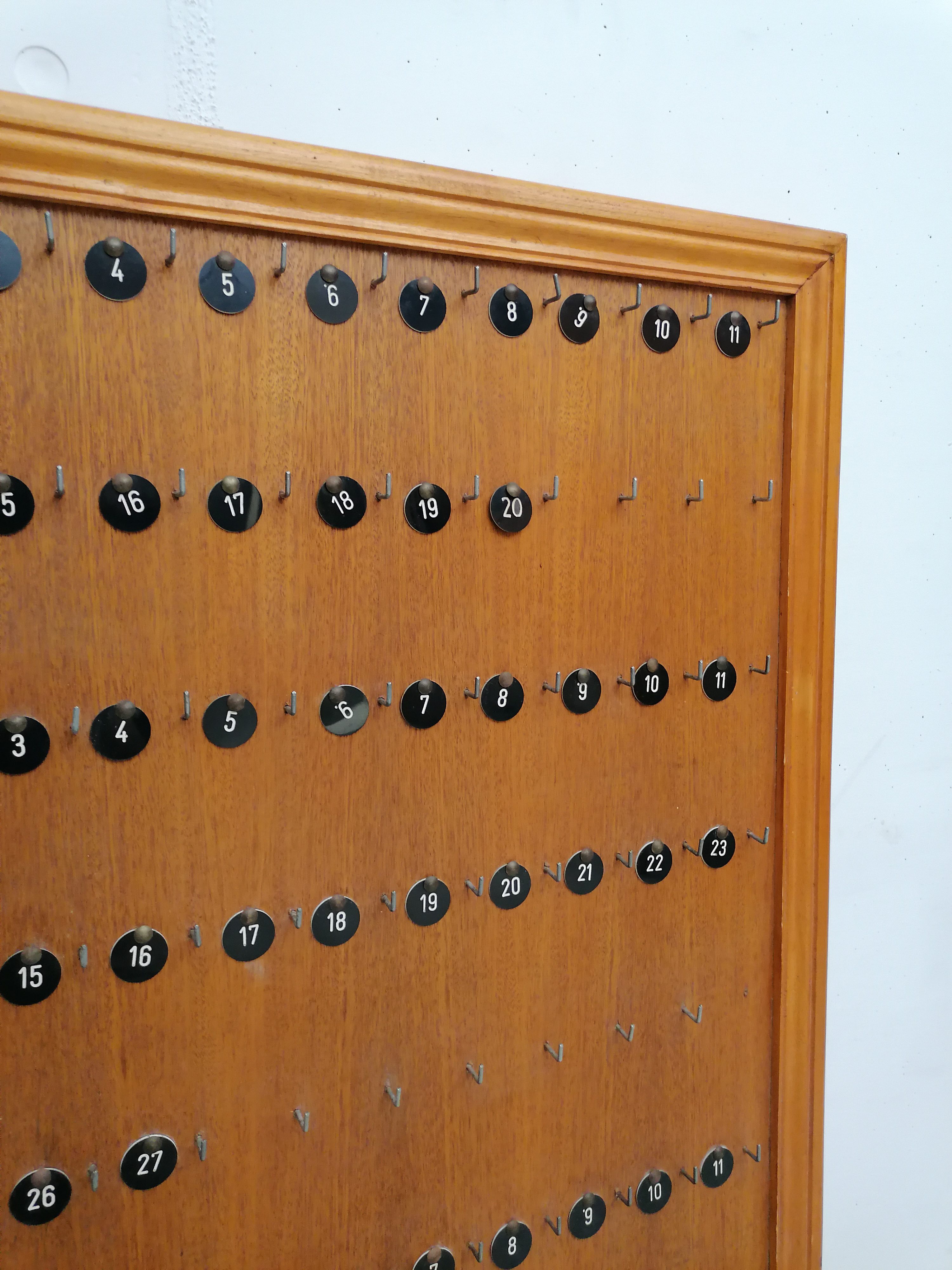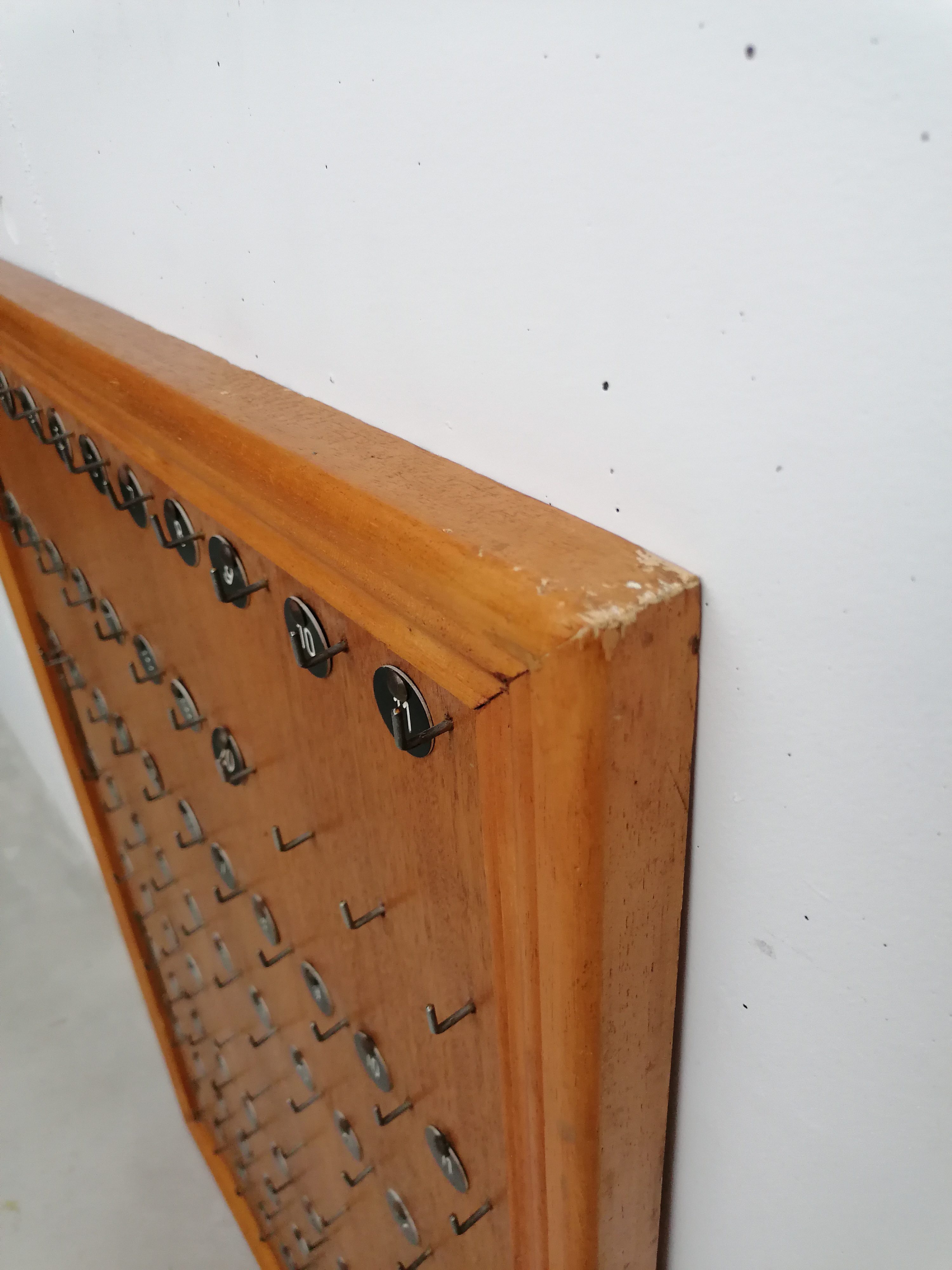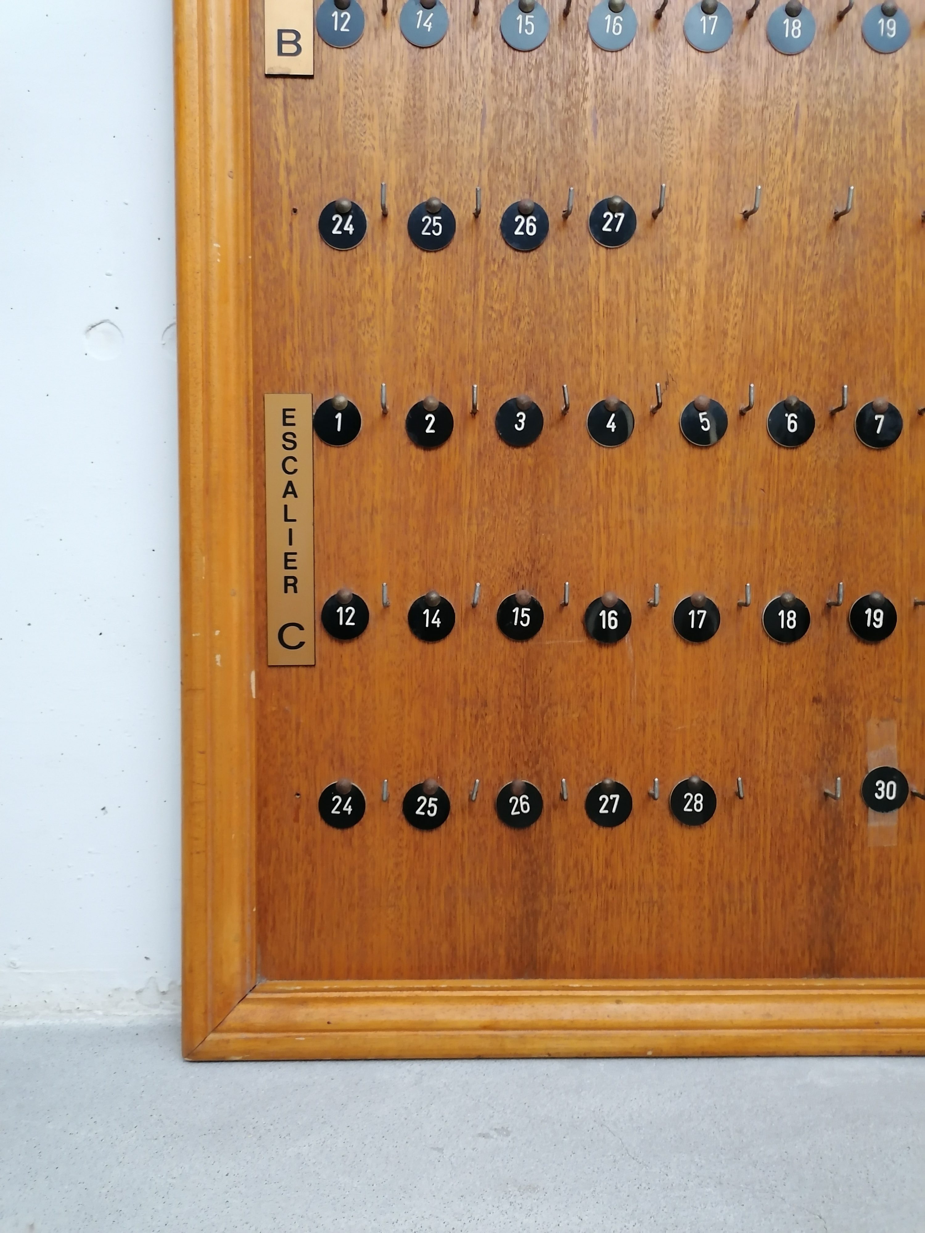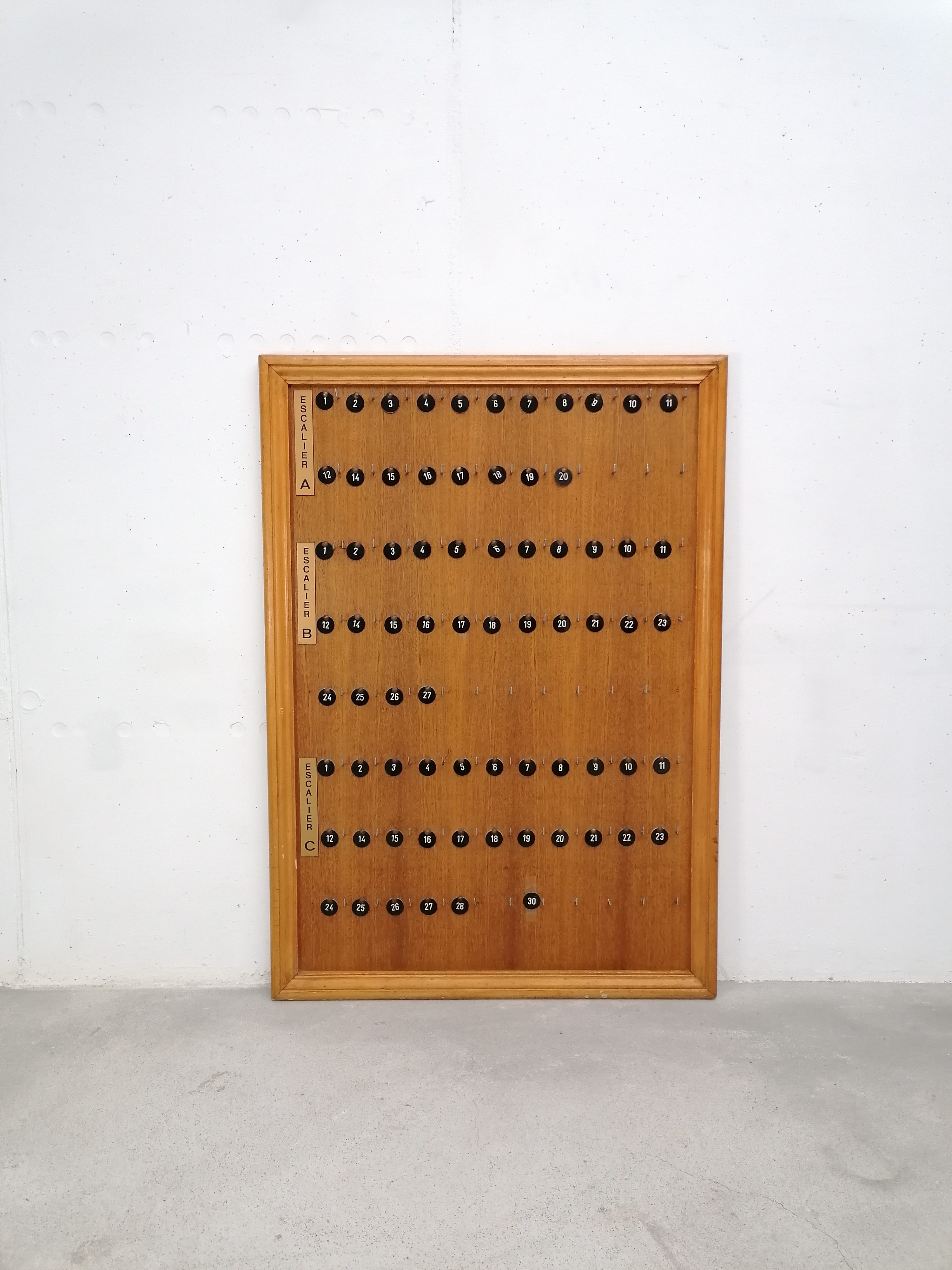 Produit venduCadre ou tableau range clé en bois. Il provient d’un hôtel du Sud de la France. Avec crochets pour les clés en métal. Des numéros de chambre sont manquants. Quelques traces d’usure. Le tableau est stable et solide. Objet très original qui peut être utilisé pour ranger les clés et d’autres objets ou simplement comme objet de décoration.