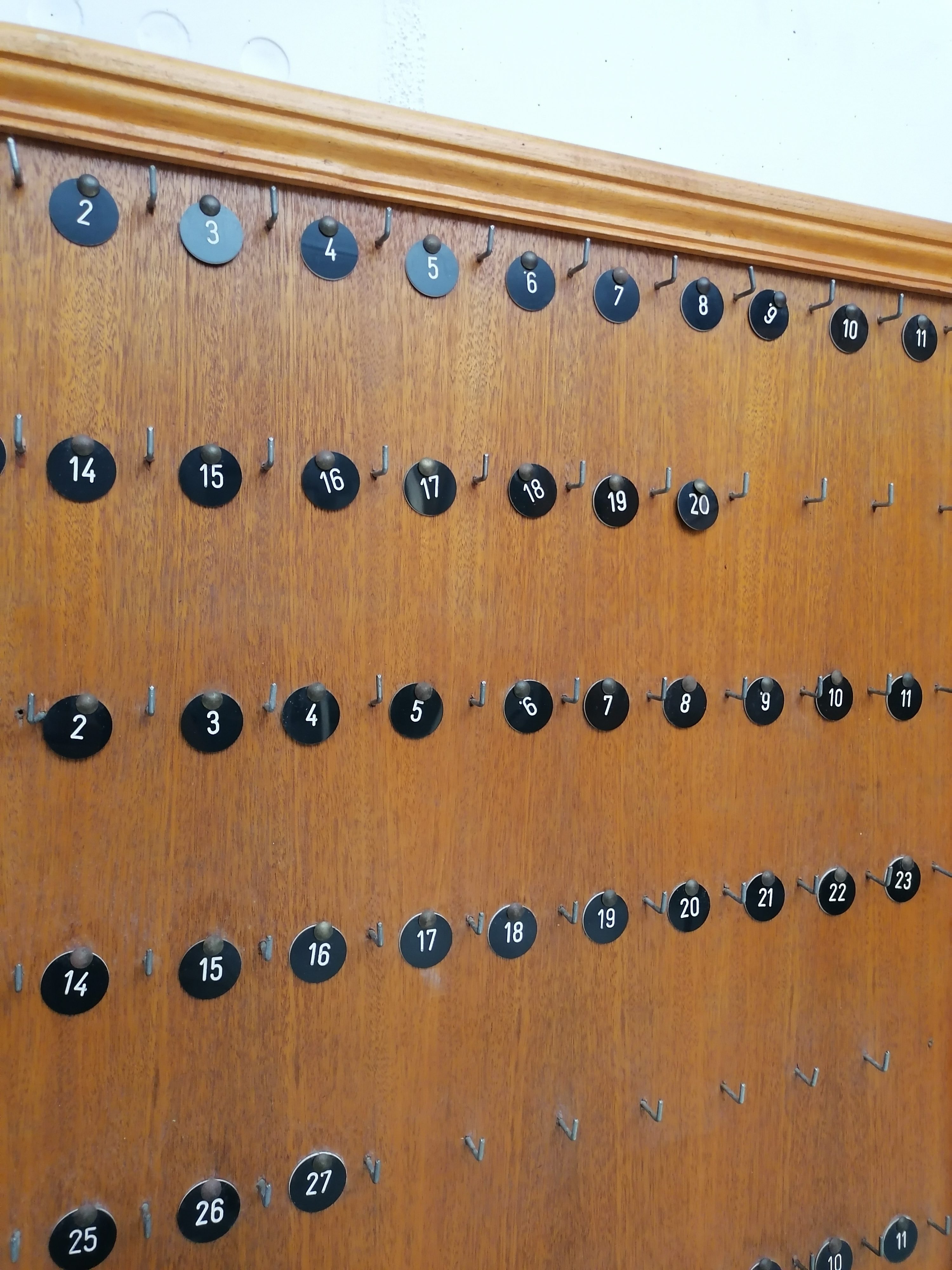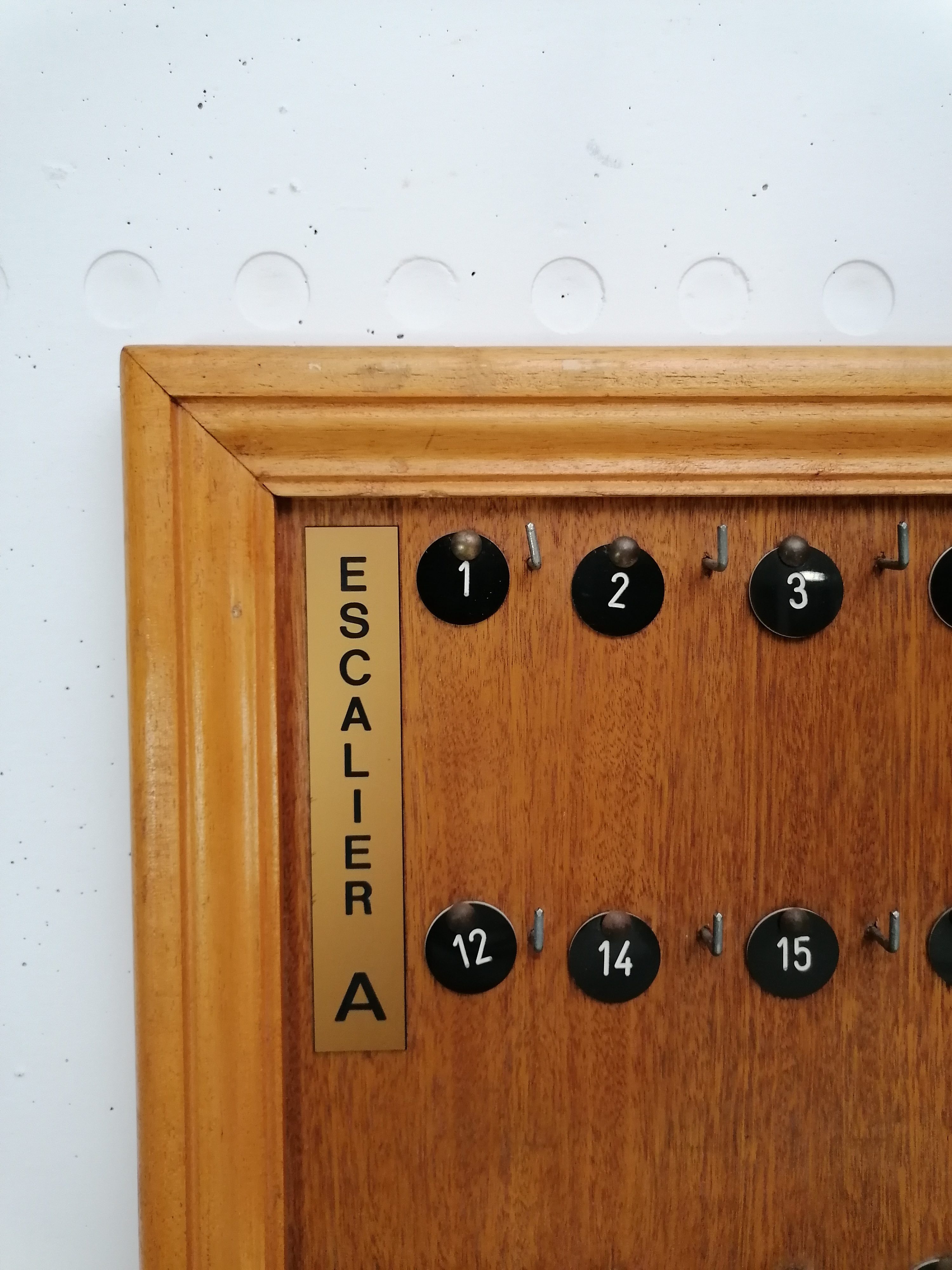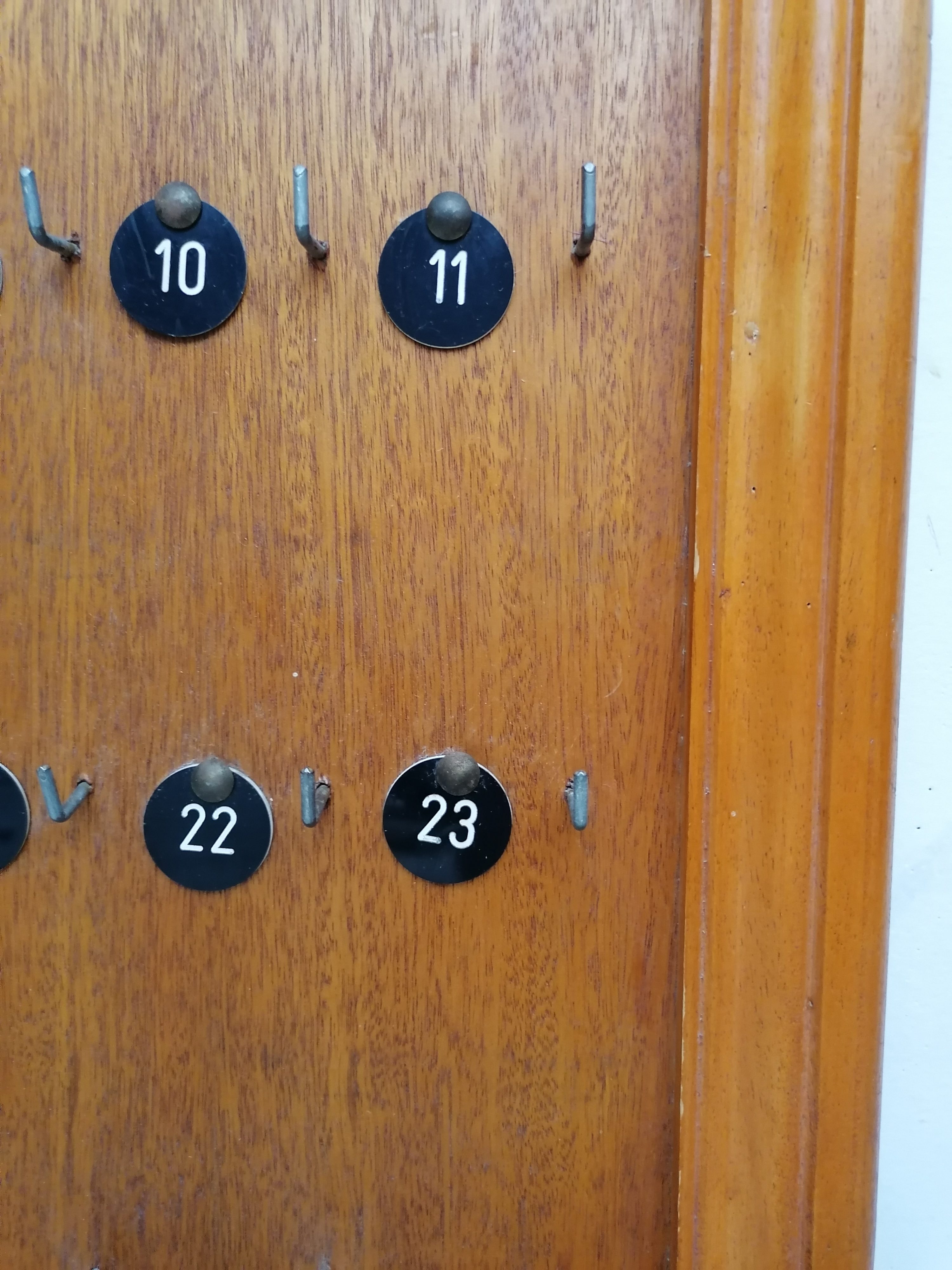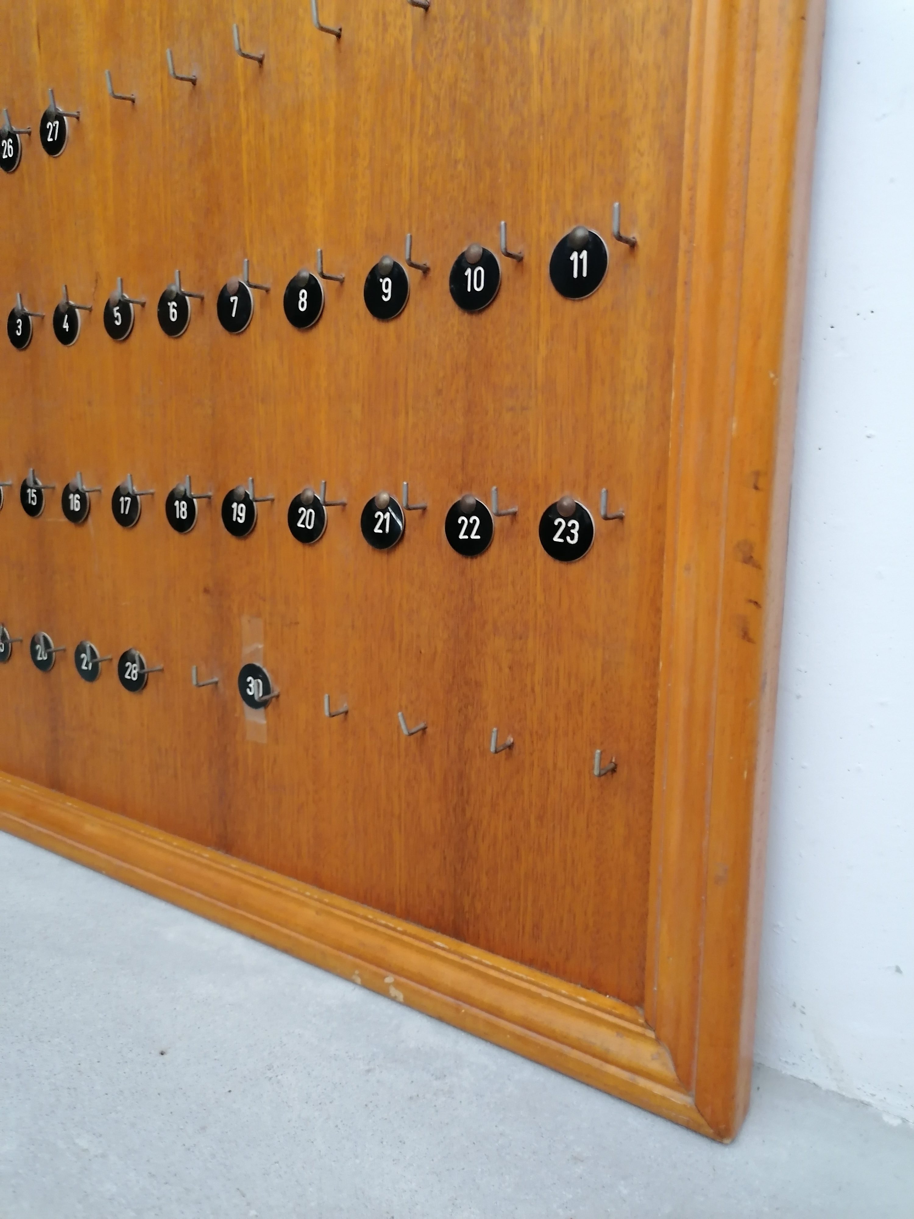 Produit venduCadre ou tableau range clé en bois. Il provient d’un hôtel du Sud de la France. Avec crochets pour les clés en métal. Des numéros de chambre sont manquants. Quelques traces d’usure. Le tableau est stable et solide. Objet très original qui peut être utilisé pour ranger les clés et d’autres objets ou simplement comme objet de décoration.