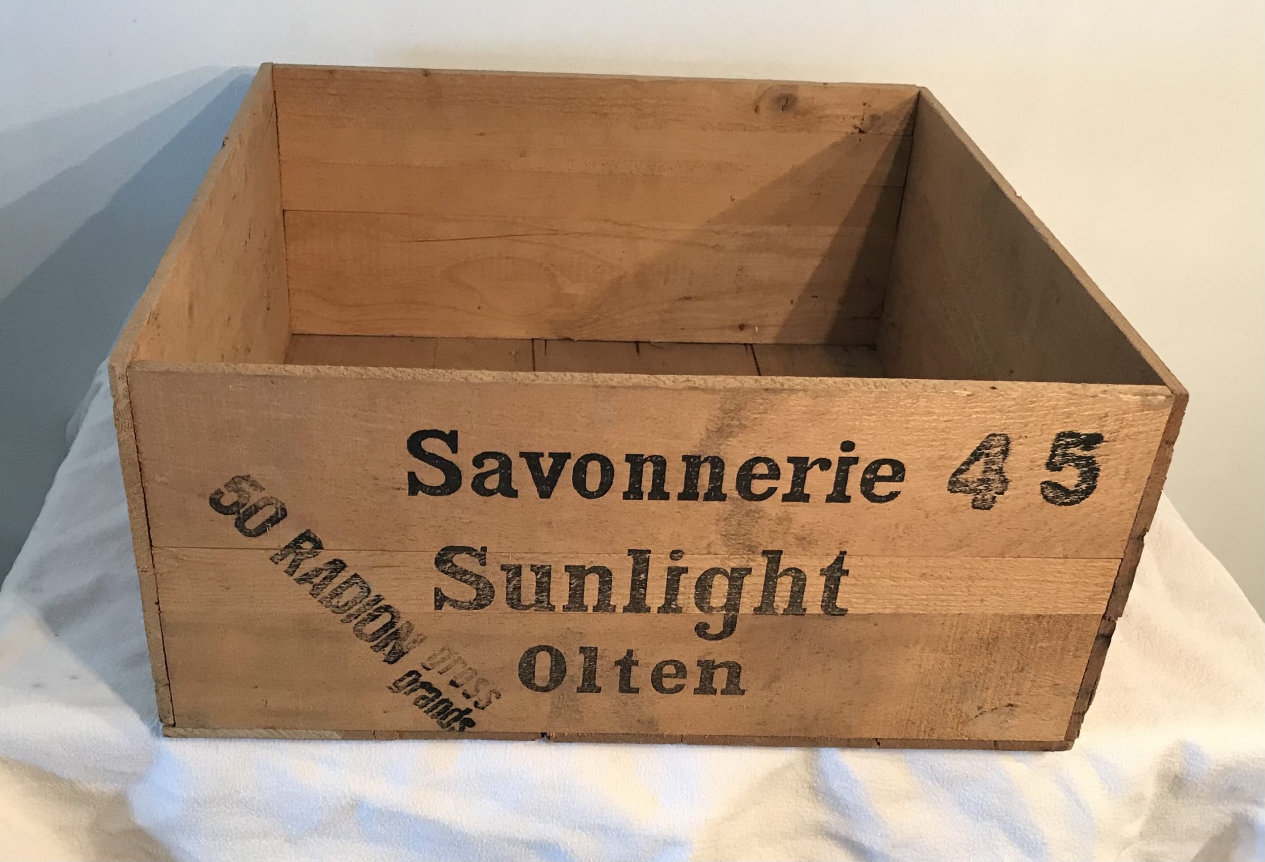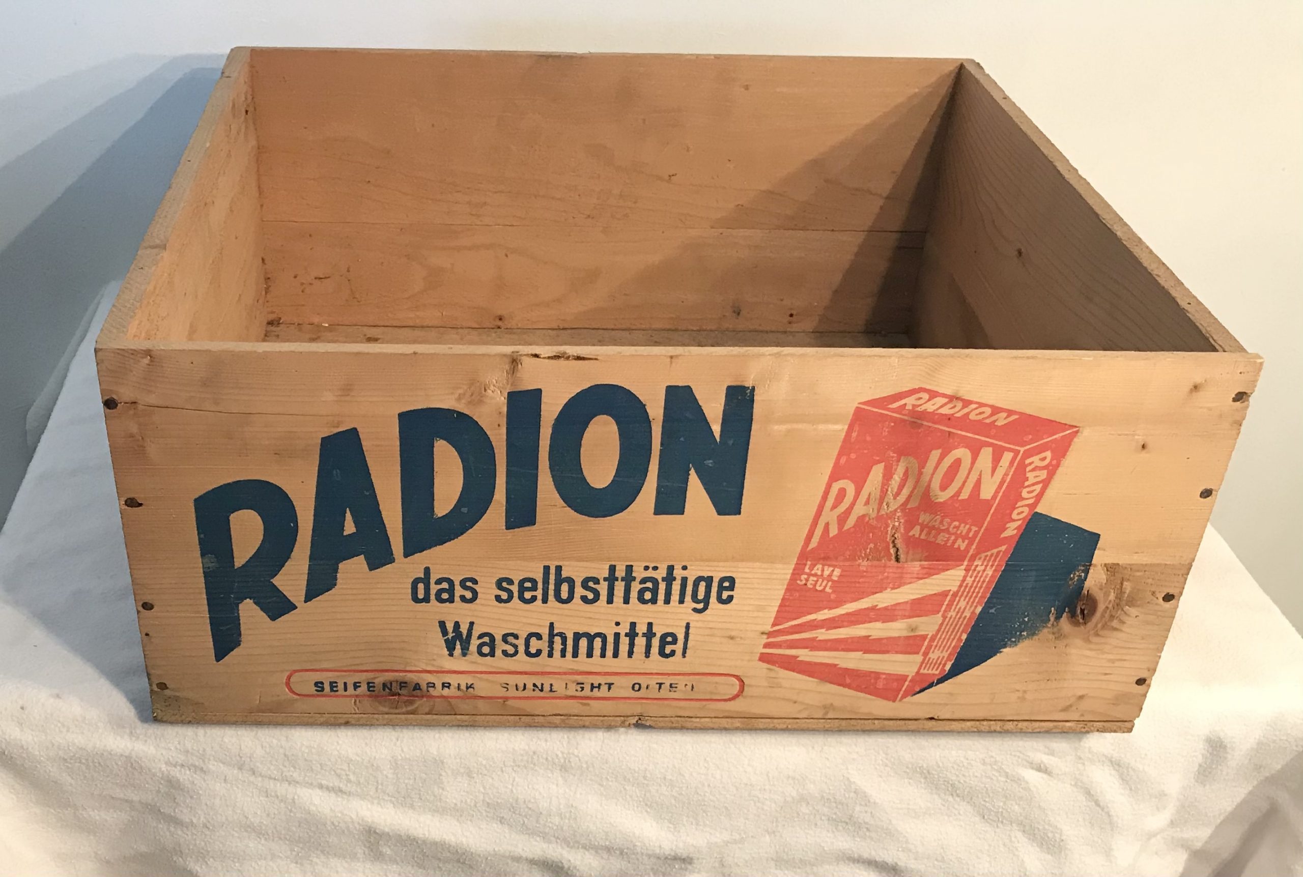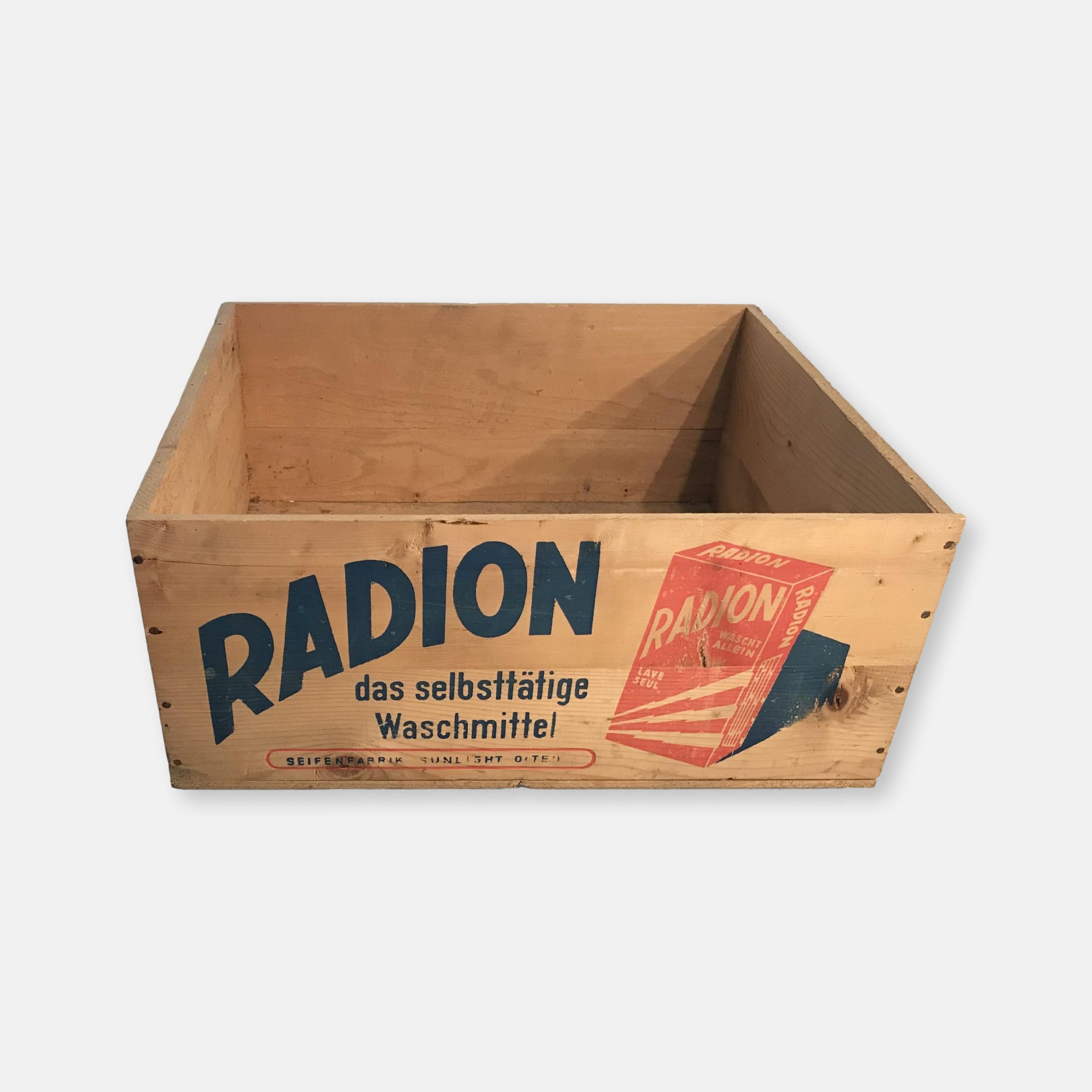 Produit venduCaisse à lessive en bois vintage, Savonnerie Sunlight à Olten « Radion ». Très bon état.