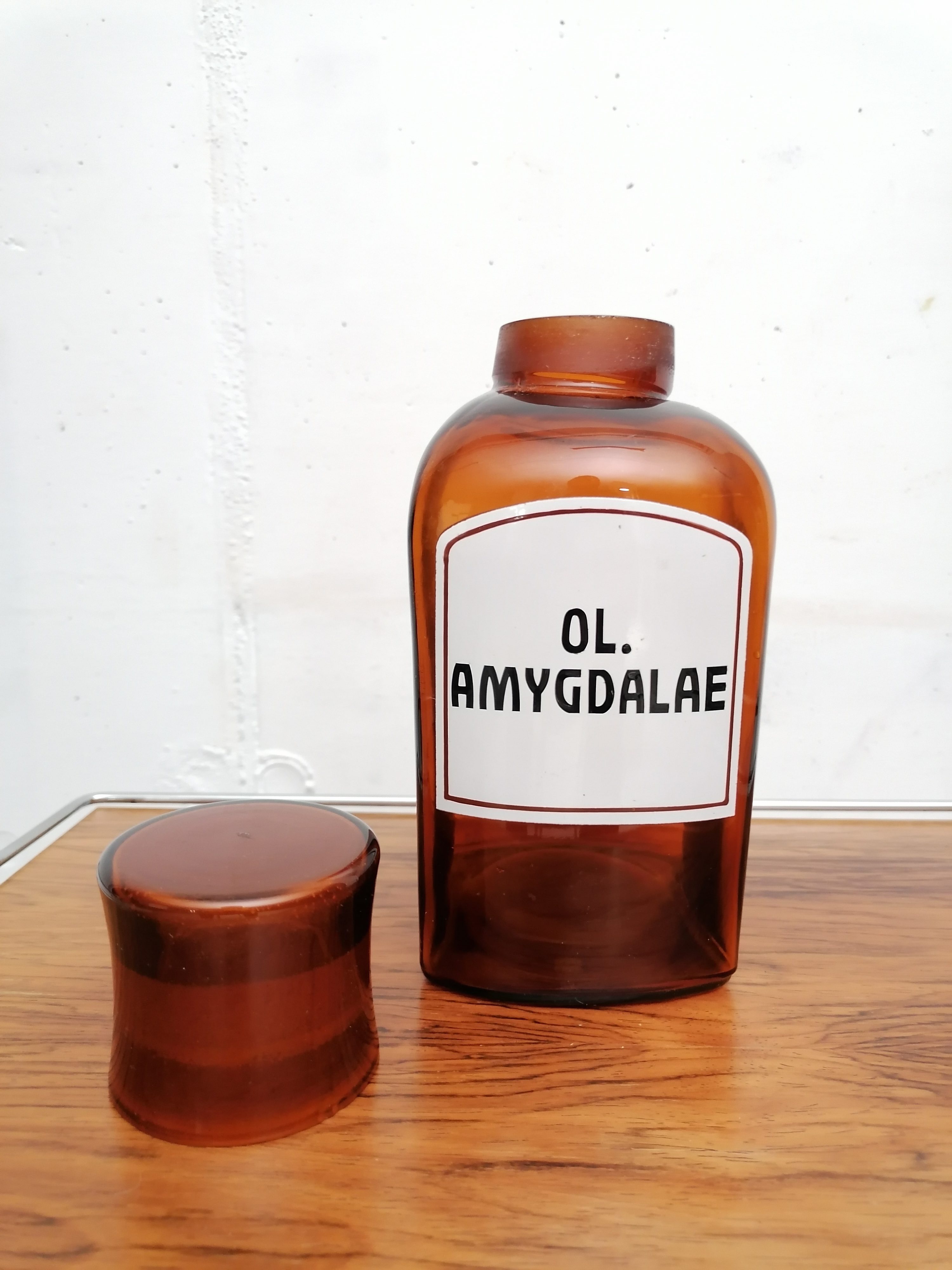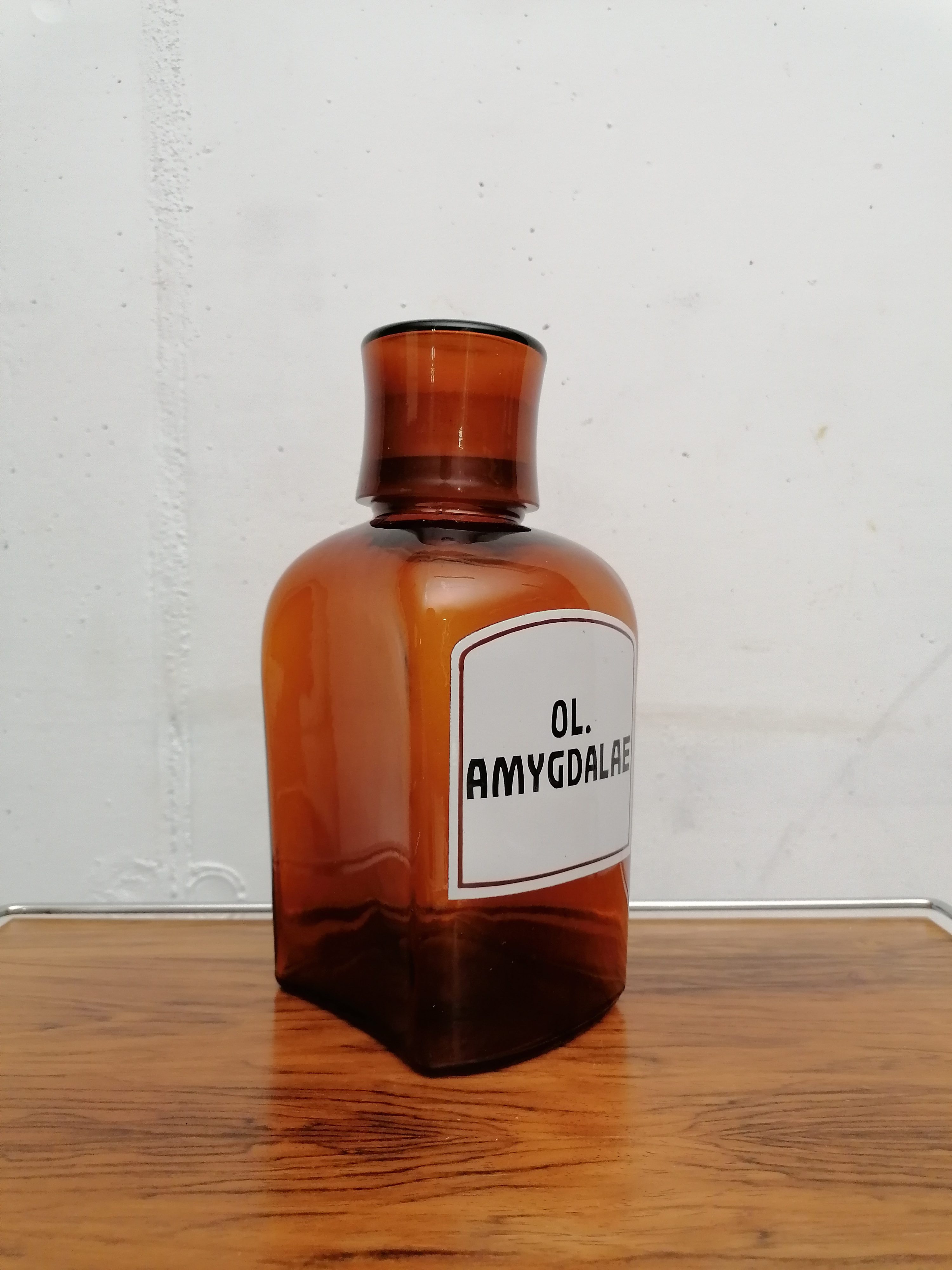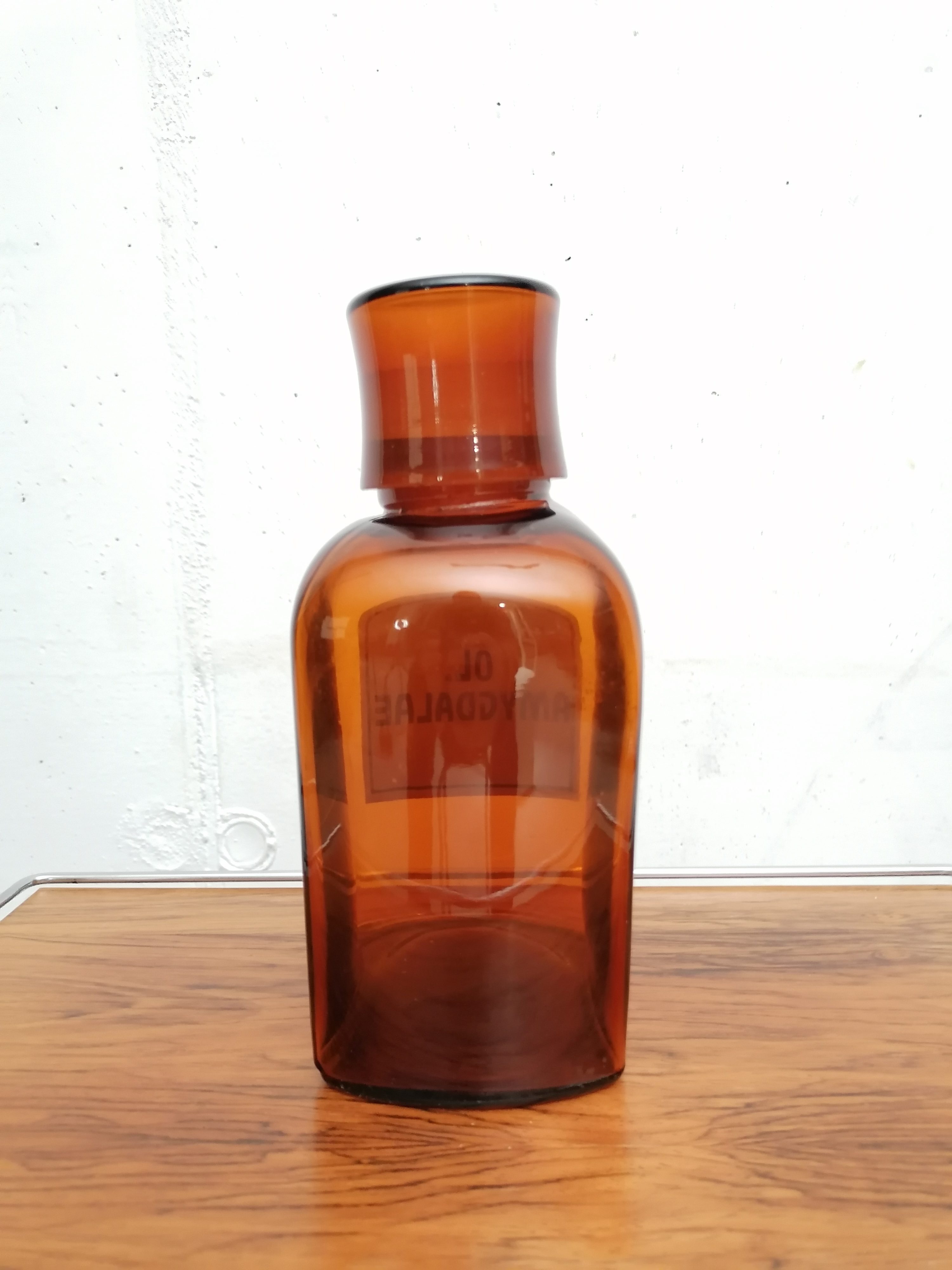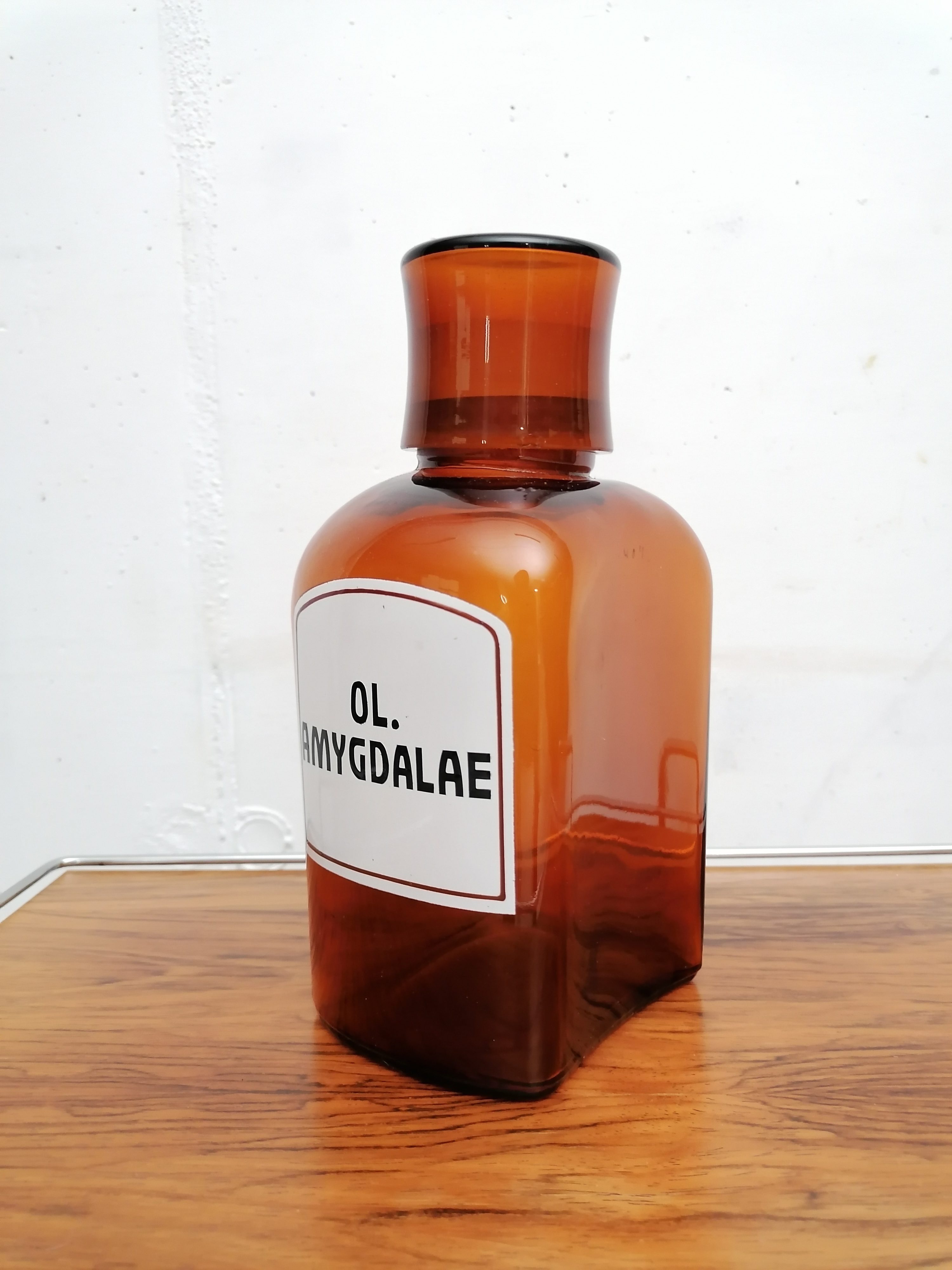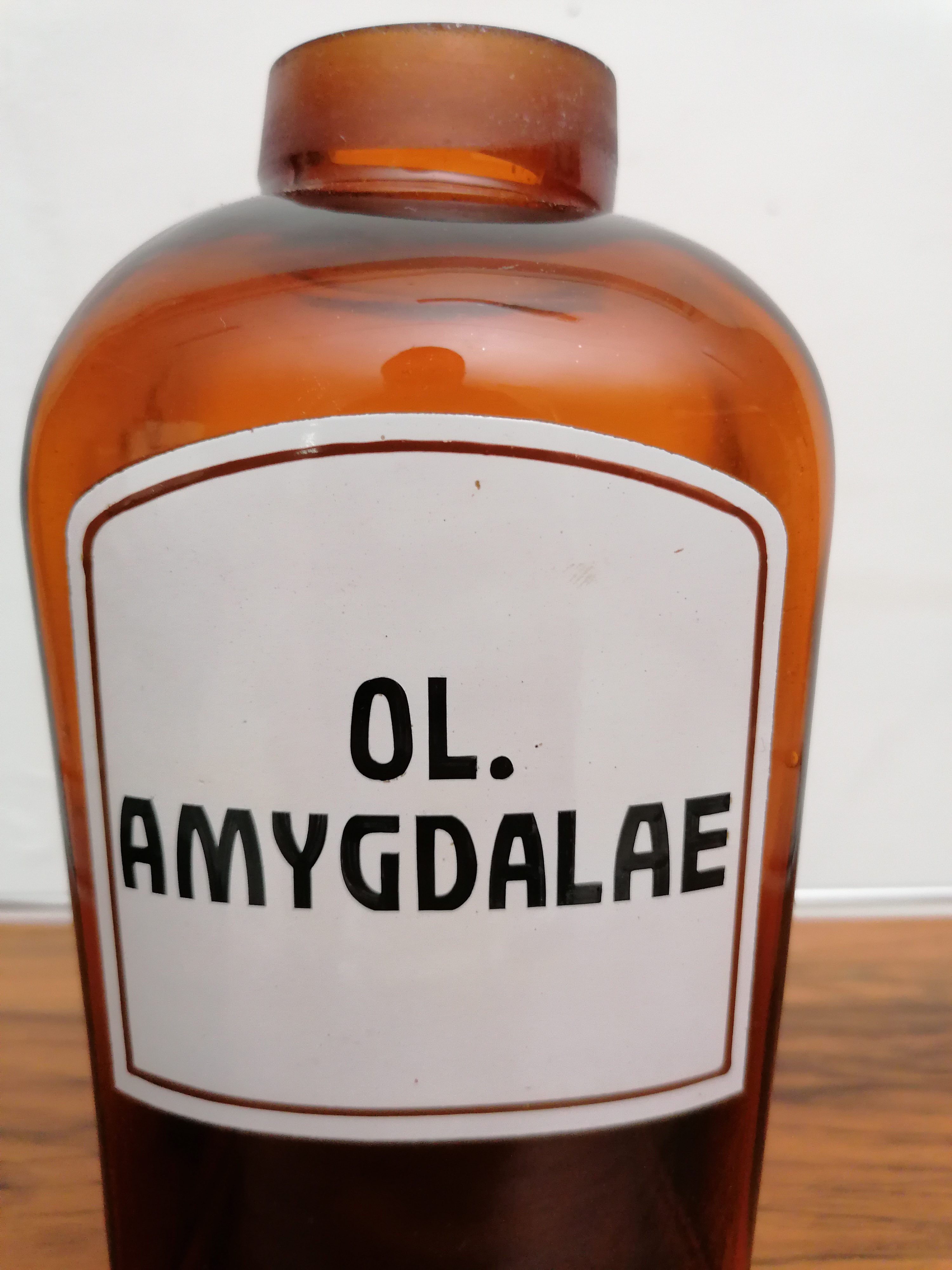 Produit venduFiole de pharmacie avec l’inscription “Ol. amygdalae” en émail.