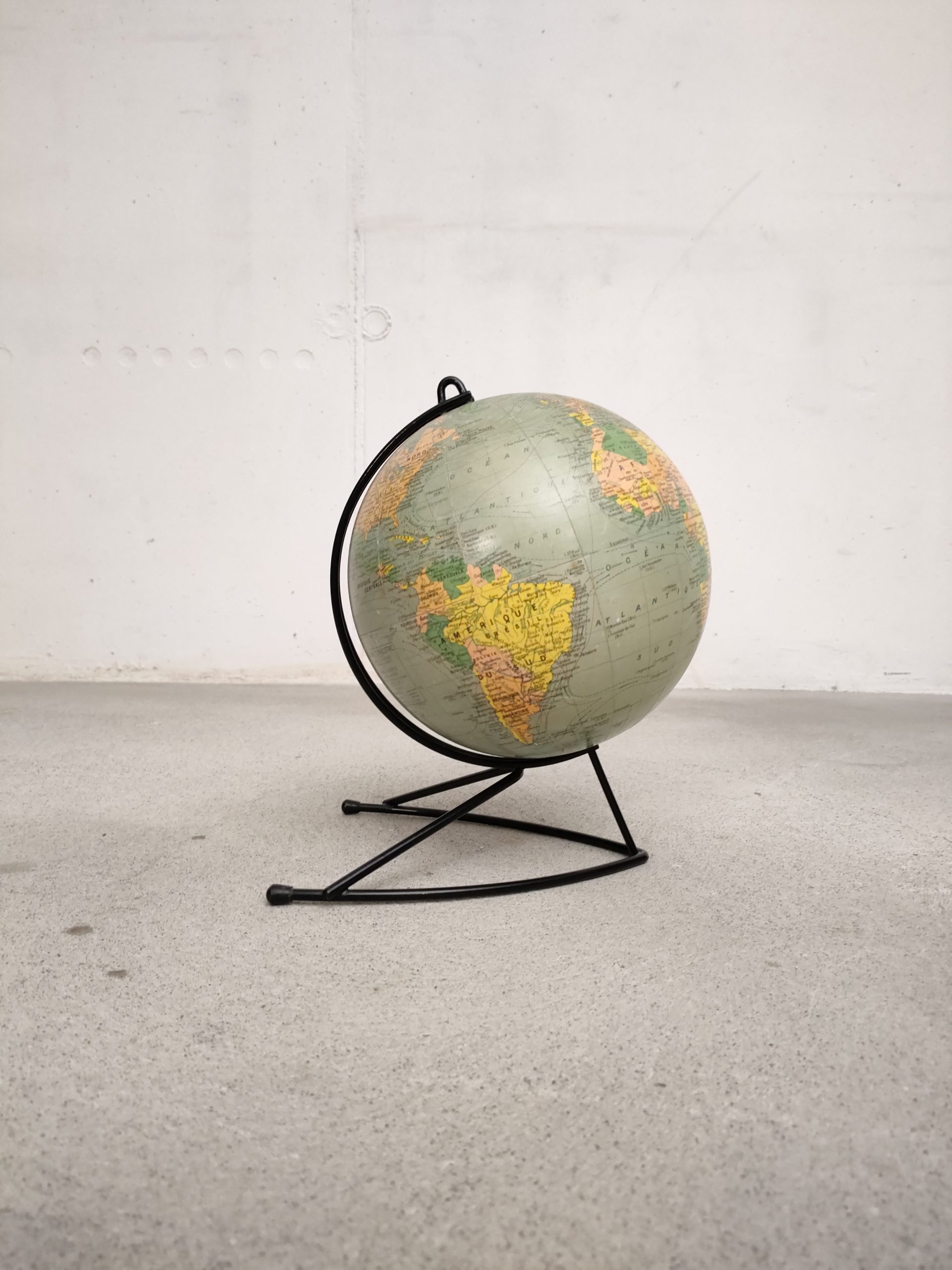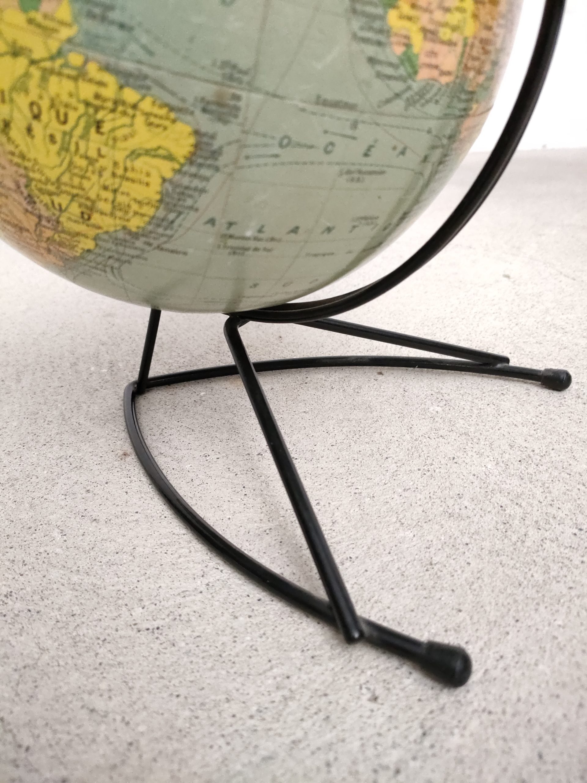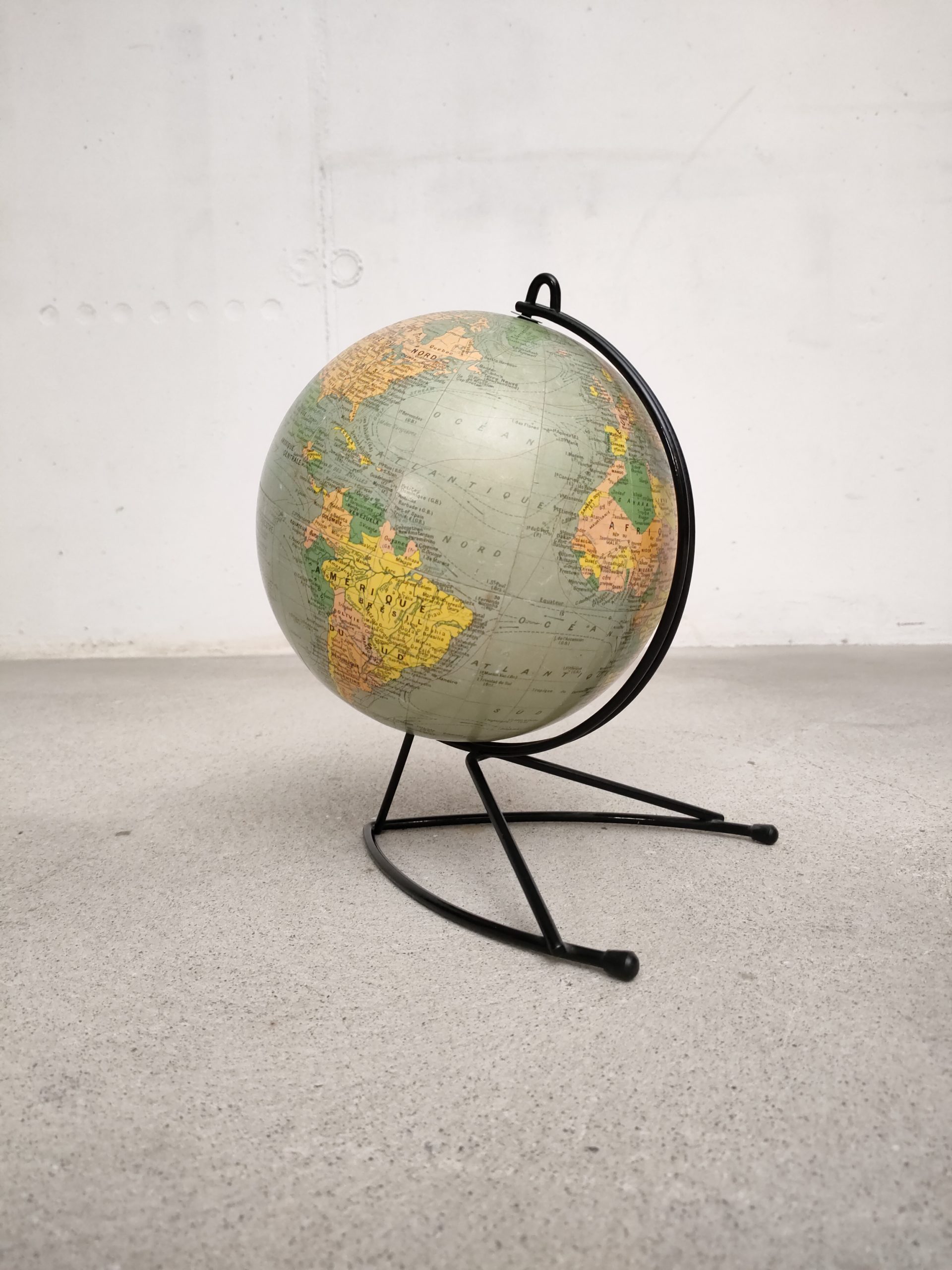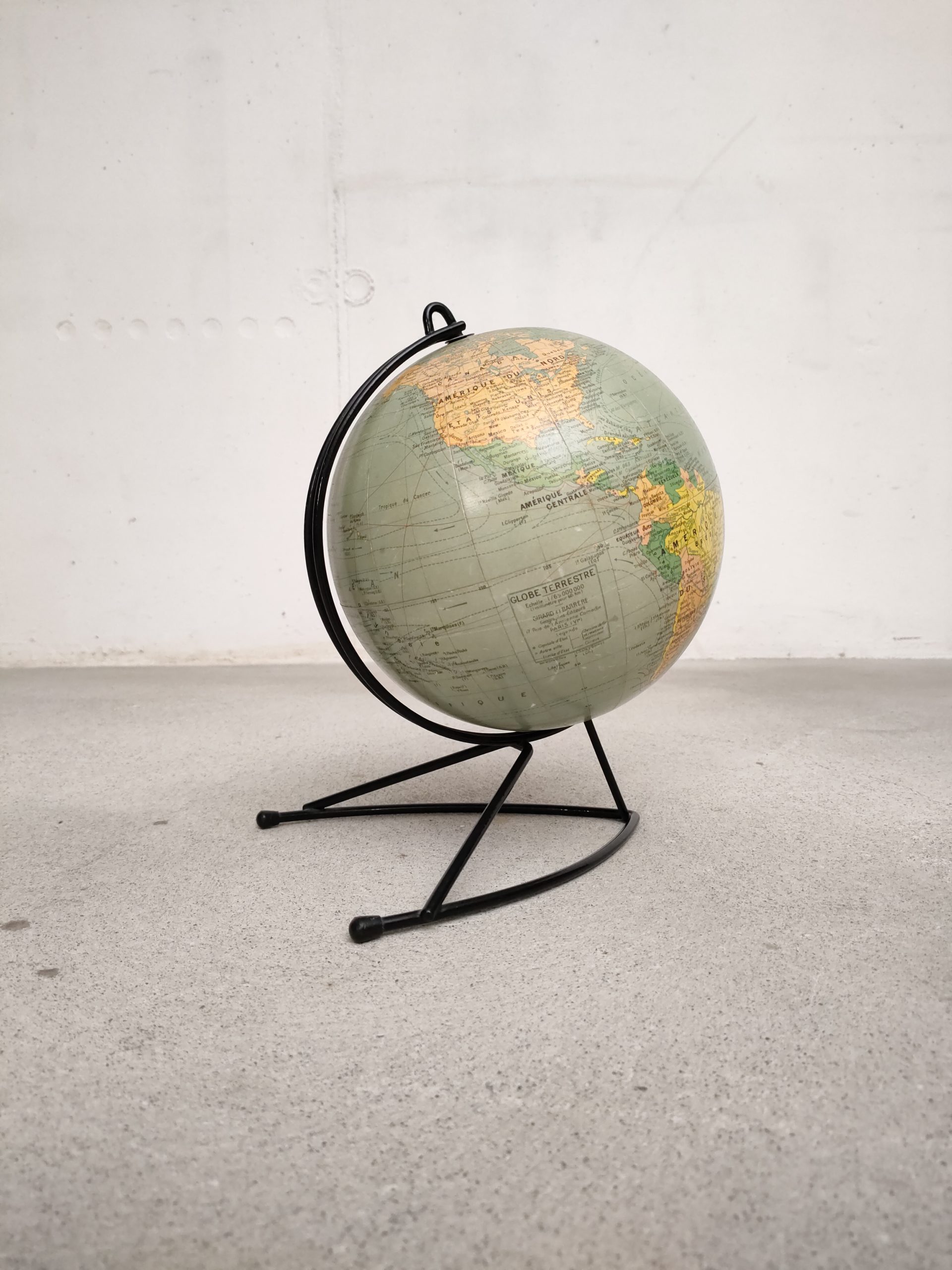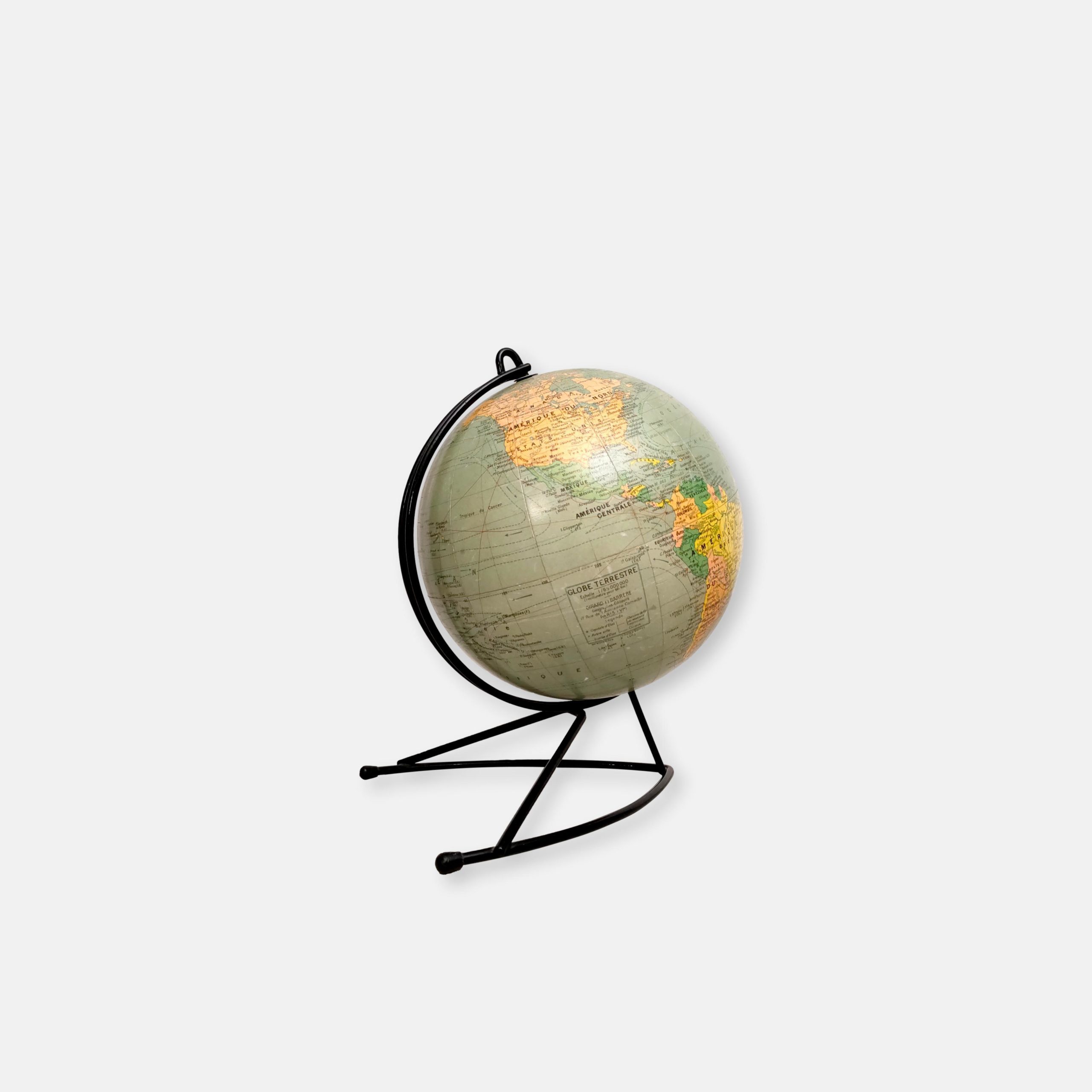 Produit venduGlobe terrestre ancien (Éditions Girard & Barrère) avec sphère en carton/papier et piètement en métal noir.