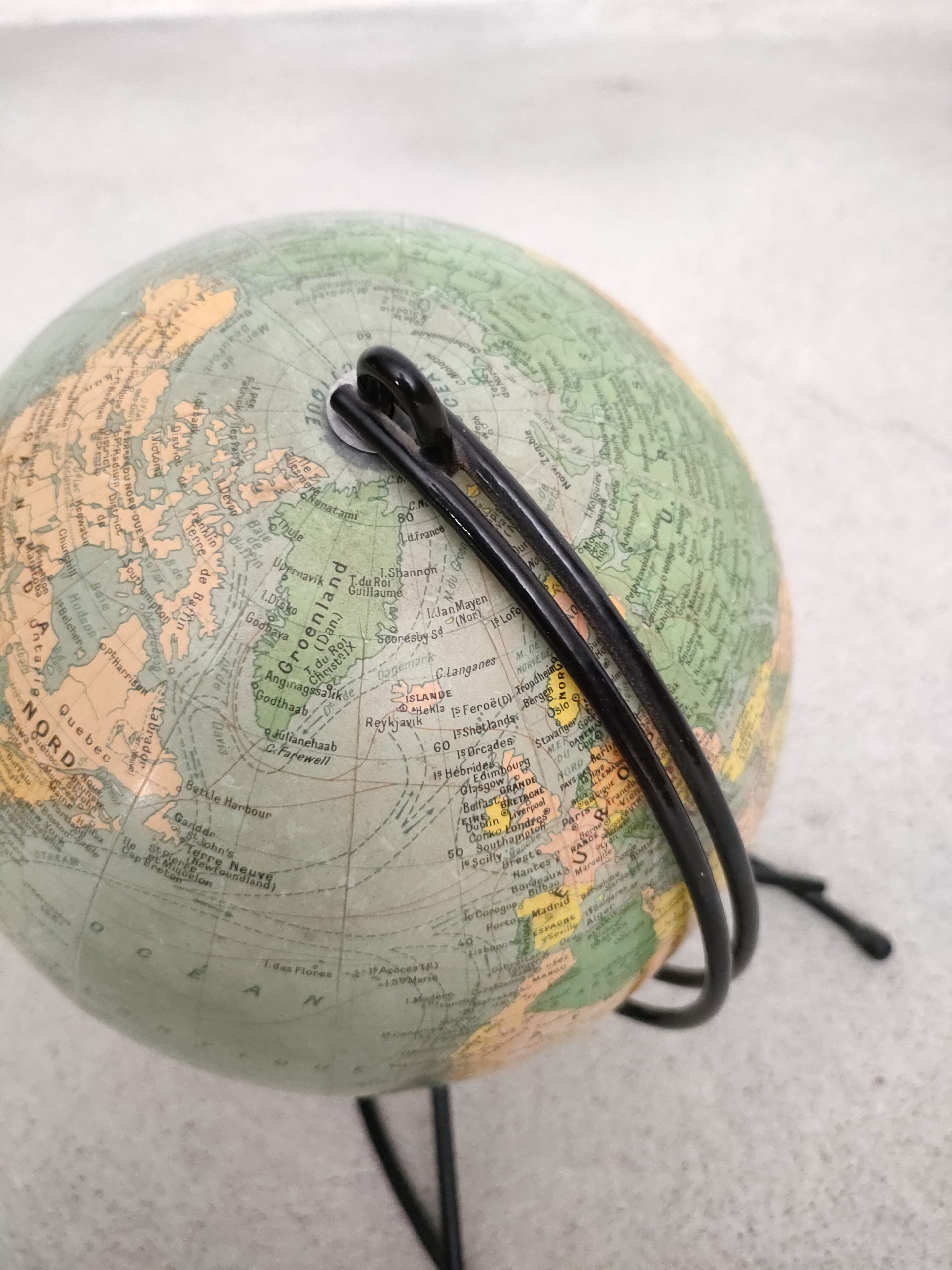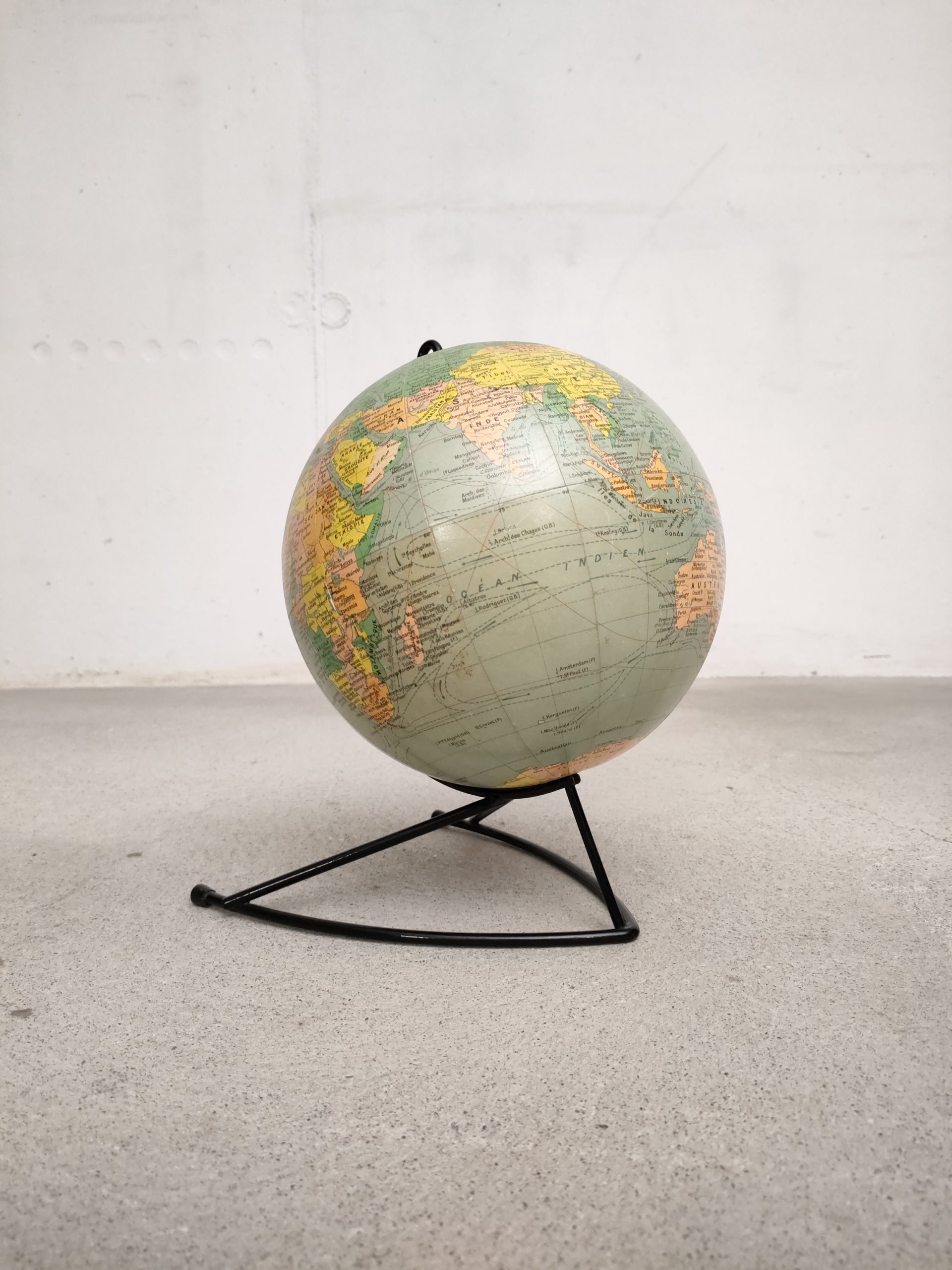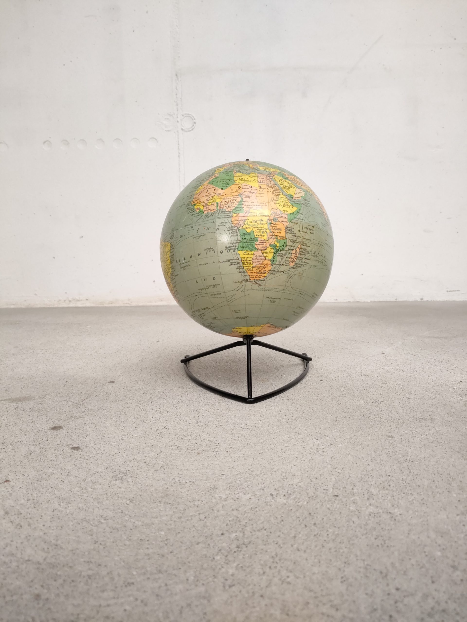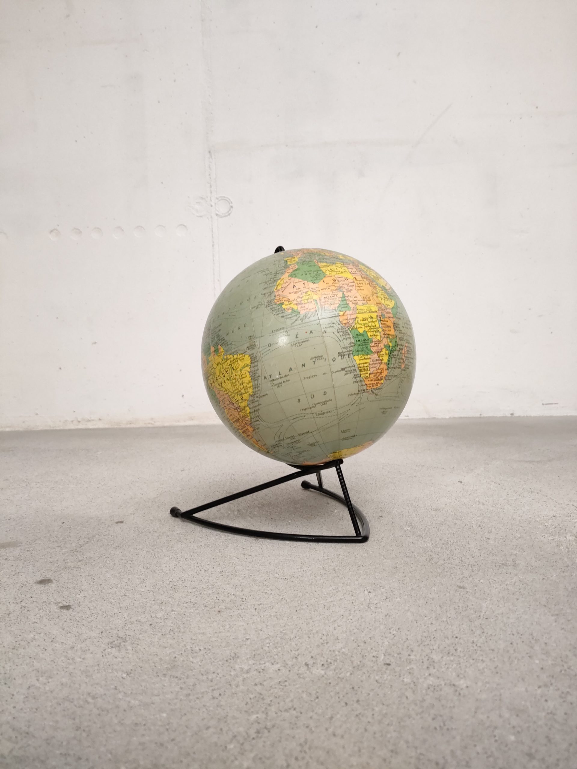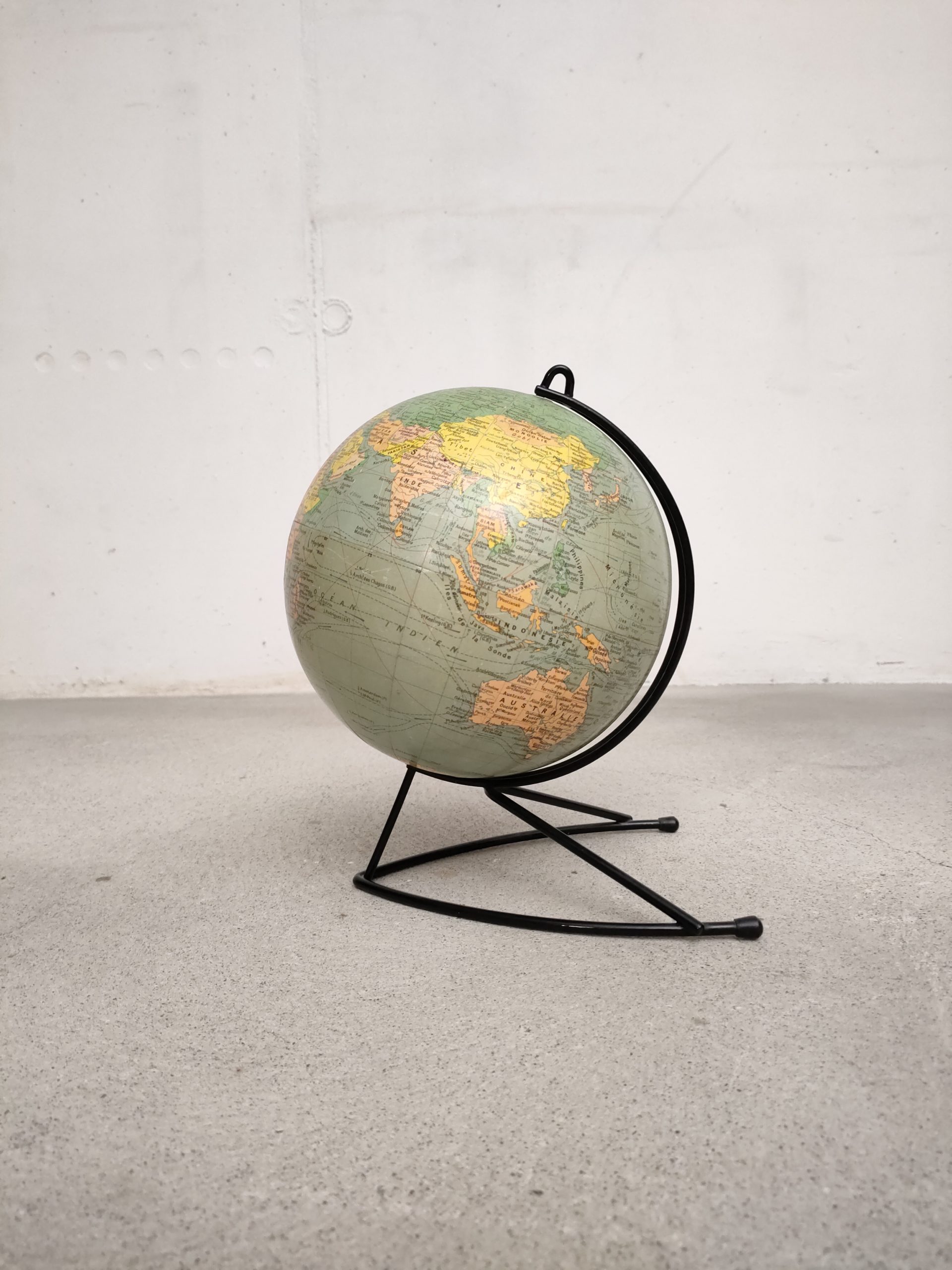 Produit venduGlobe terrestre ancien (Éditions Girard & Barrère) avec sphère en carton/papier et piètement en métal noir.