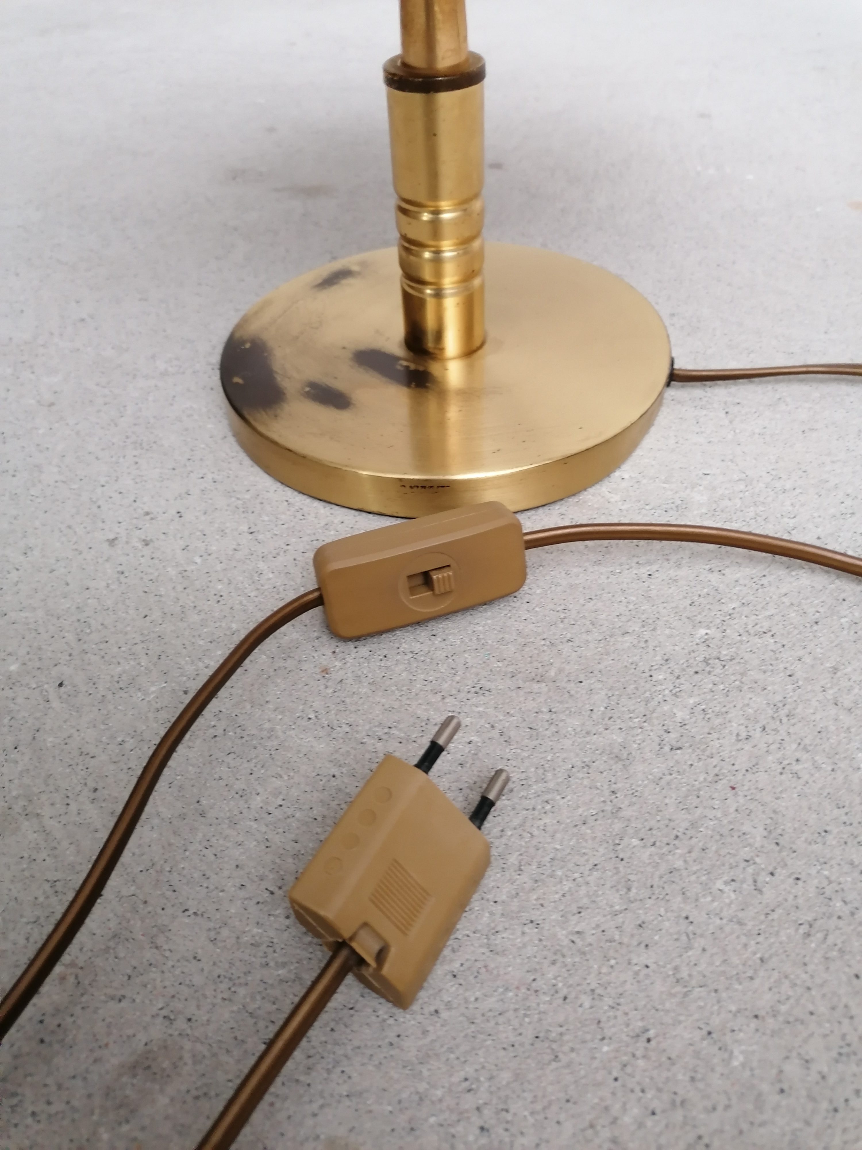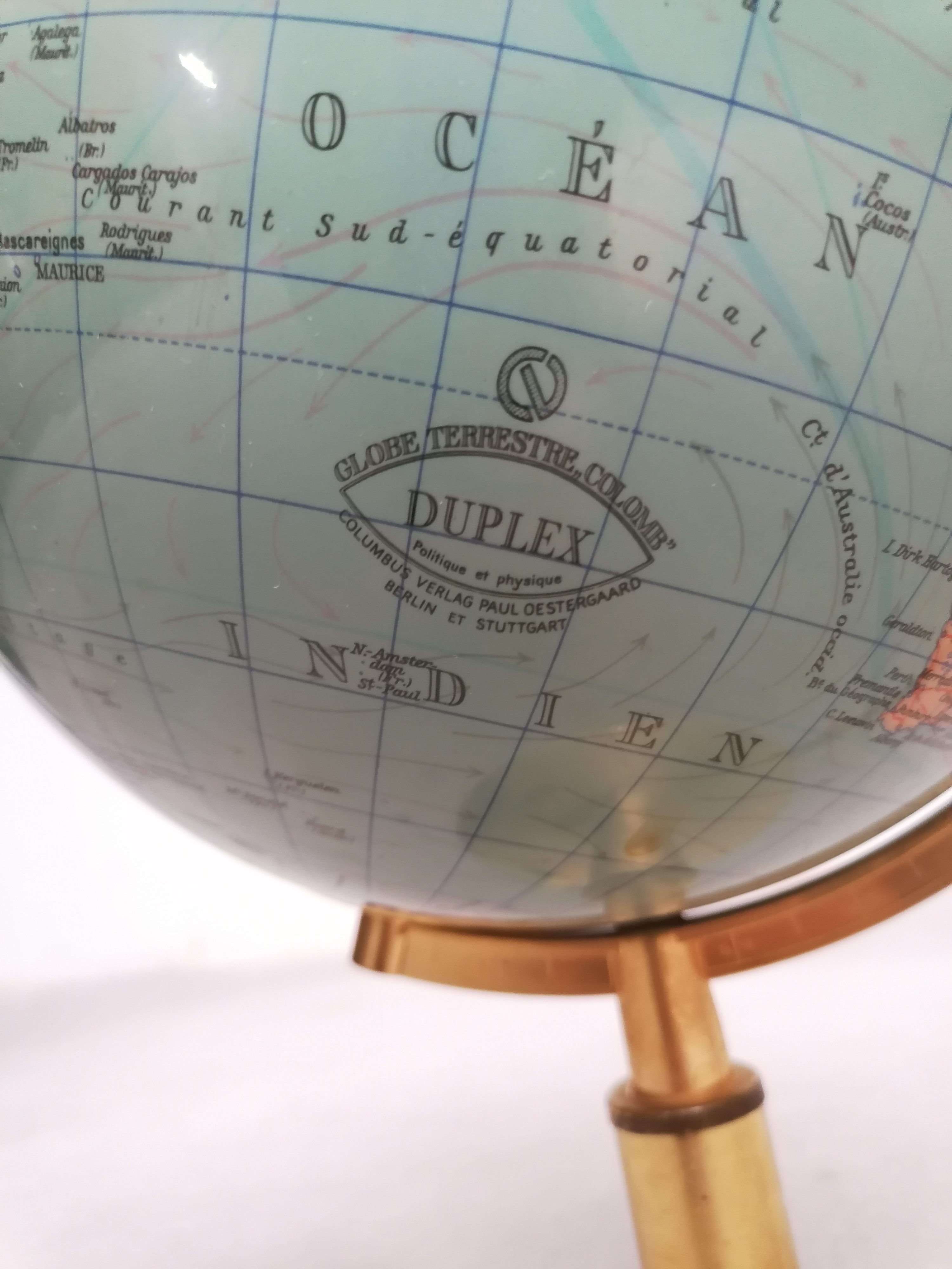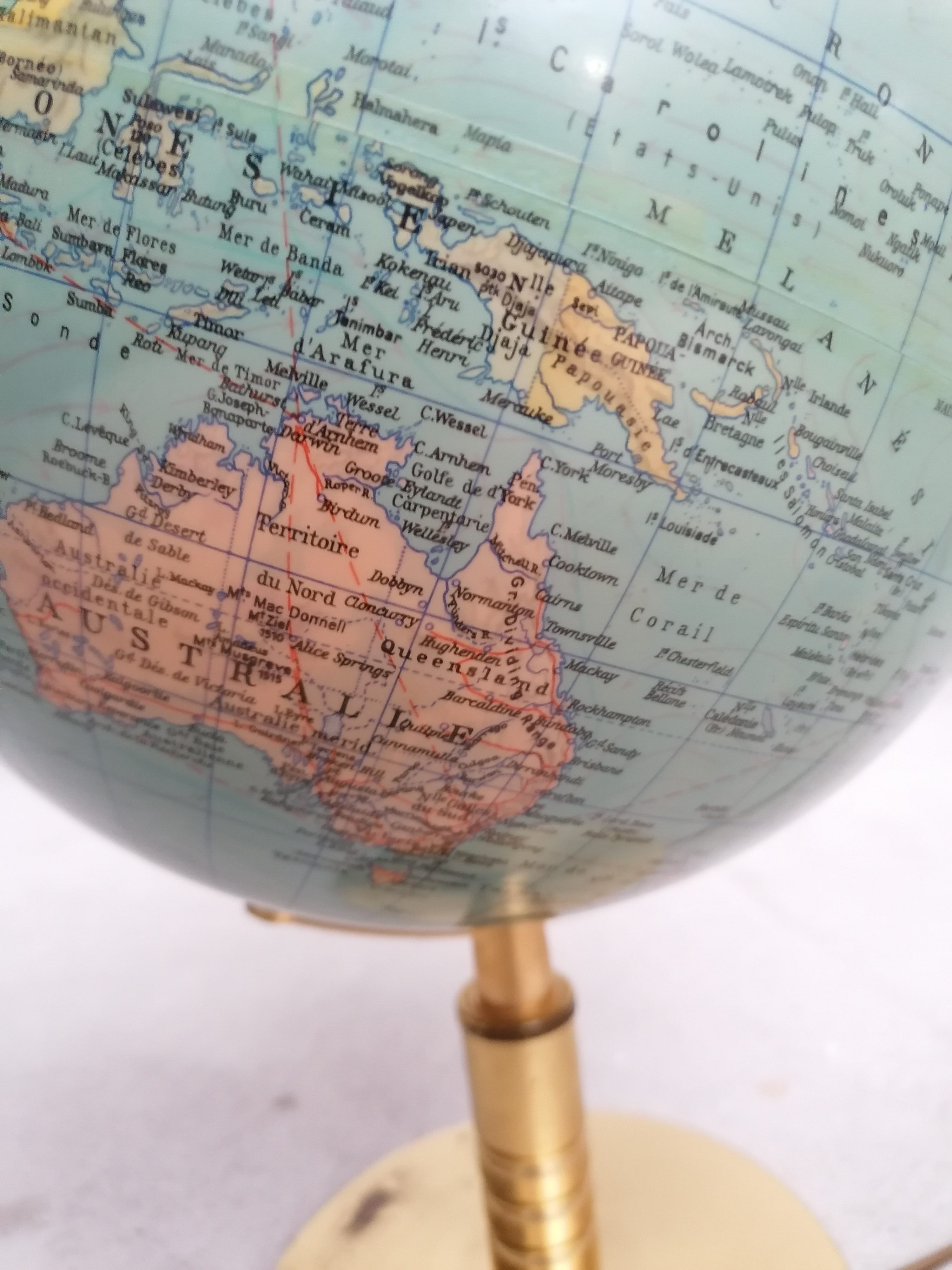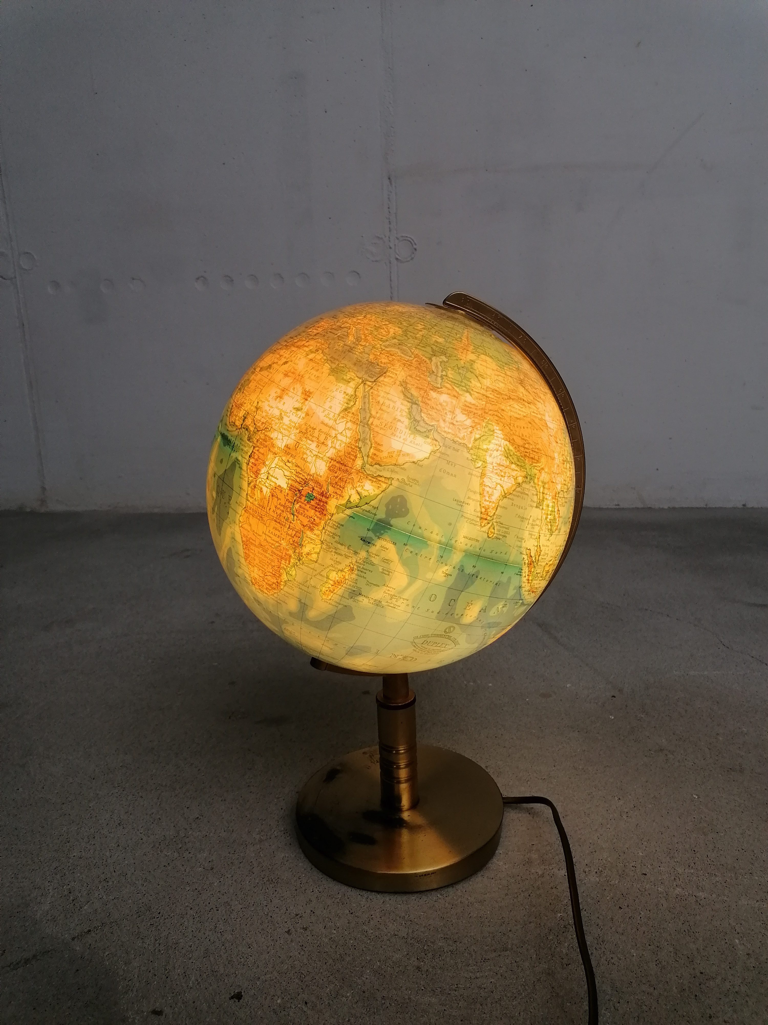 Globe terrestre lumineux vintage en plastique avec socle en métal doré. Produit par Columbus Verlag Paul Oestergaard. Traces noires sur le socle et un léger enfoncement au sommet du globe. Parfaitement fonctionnel.