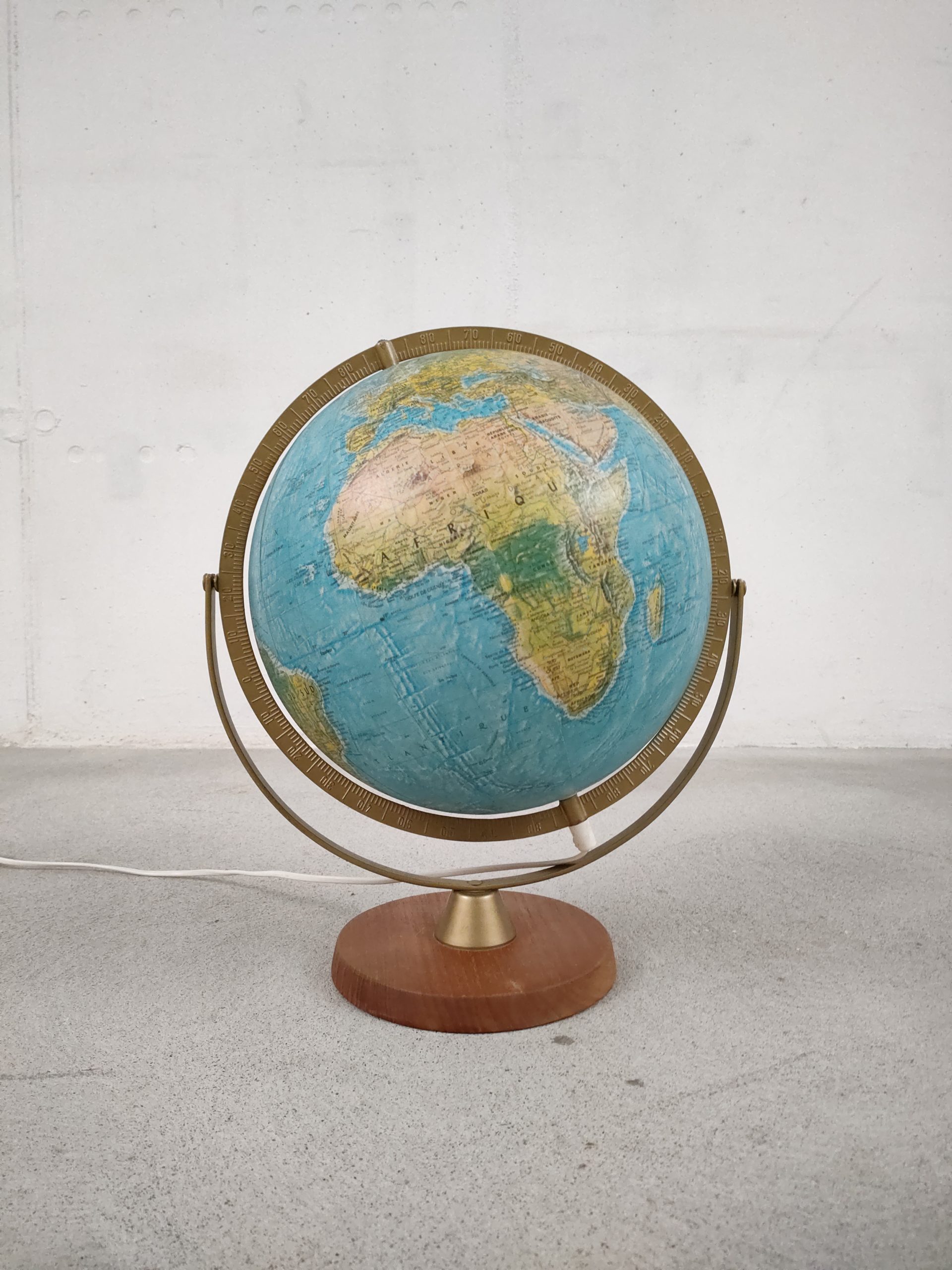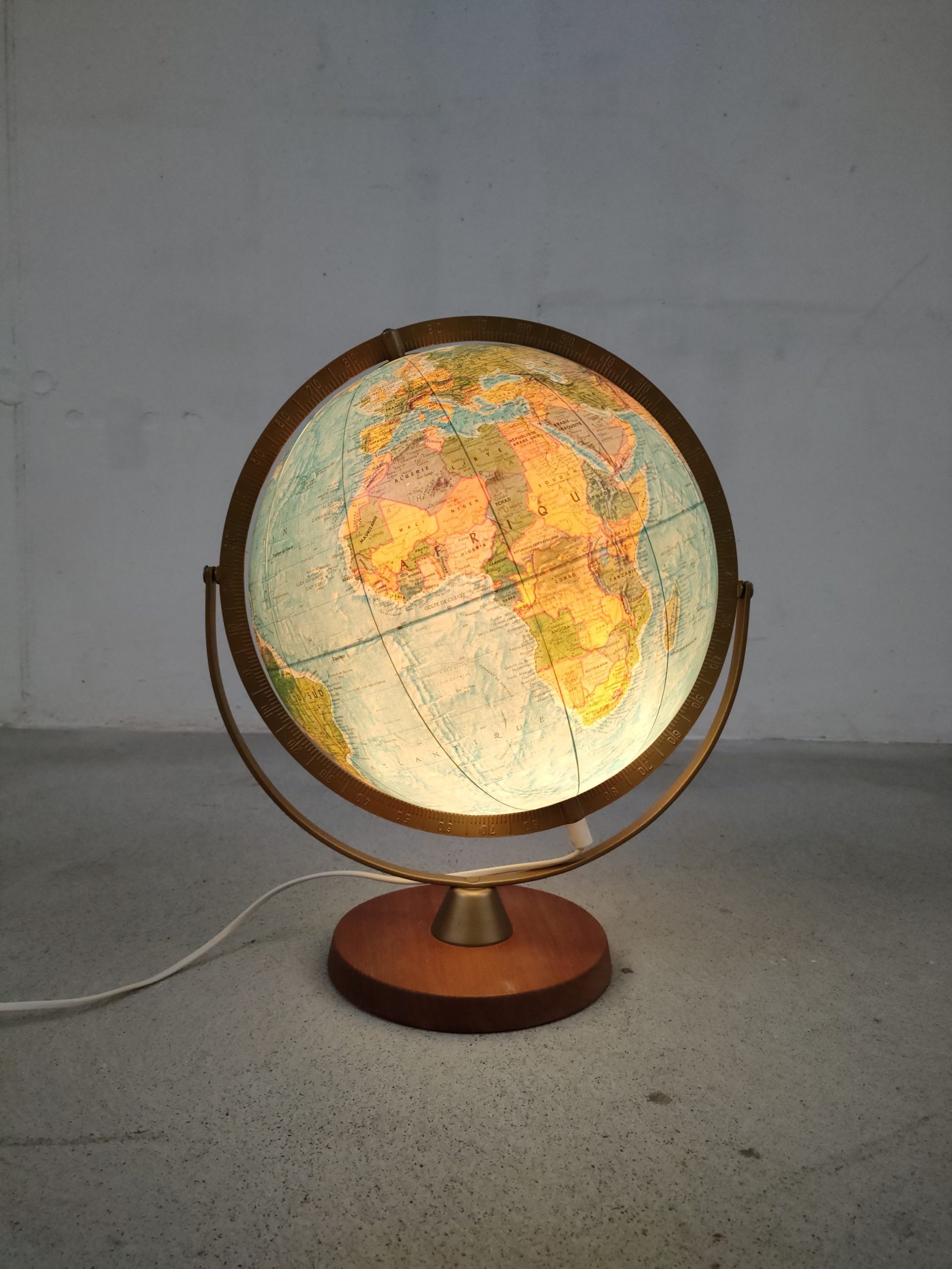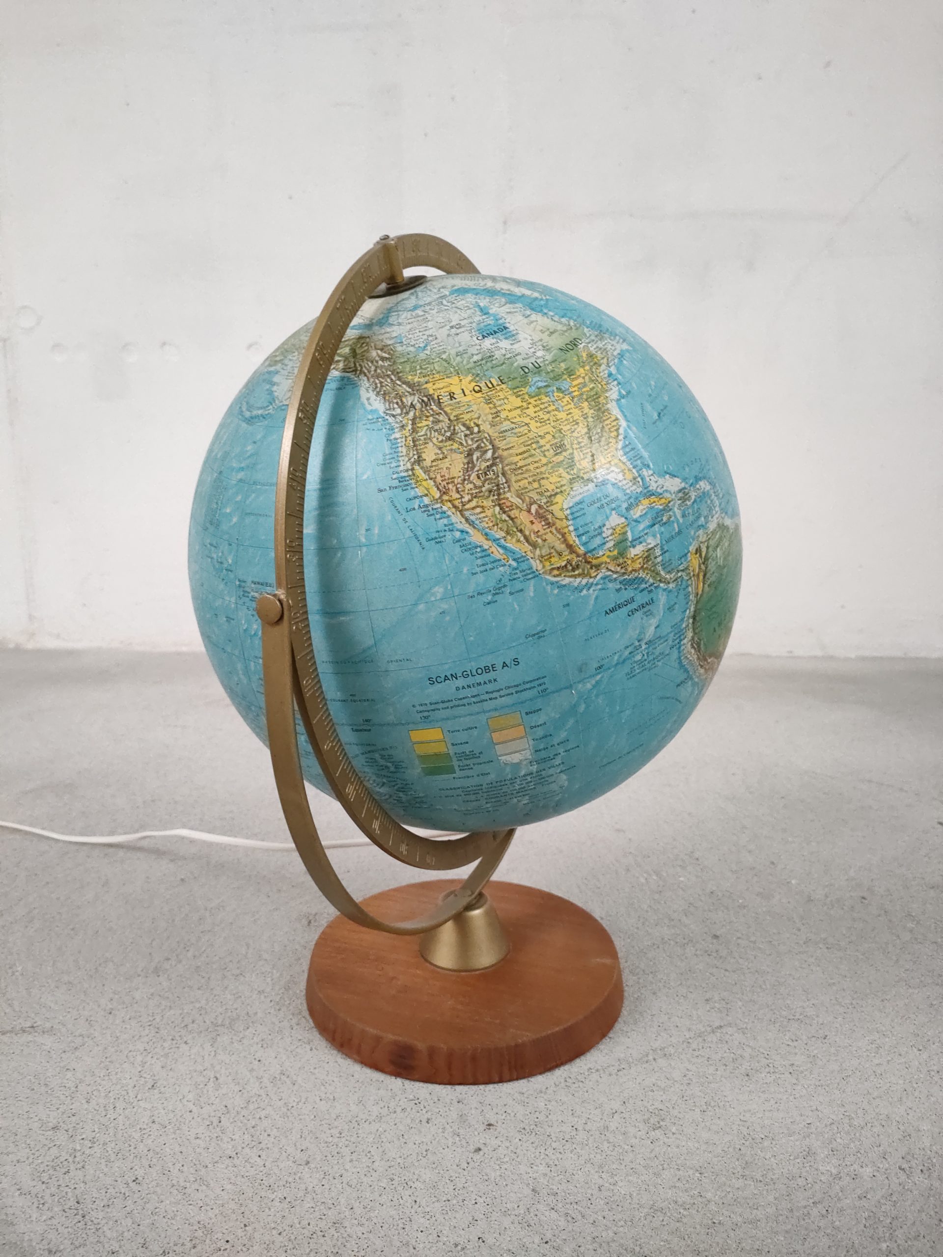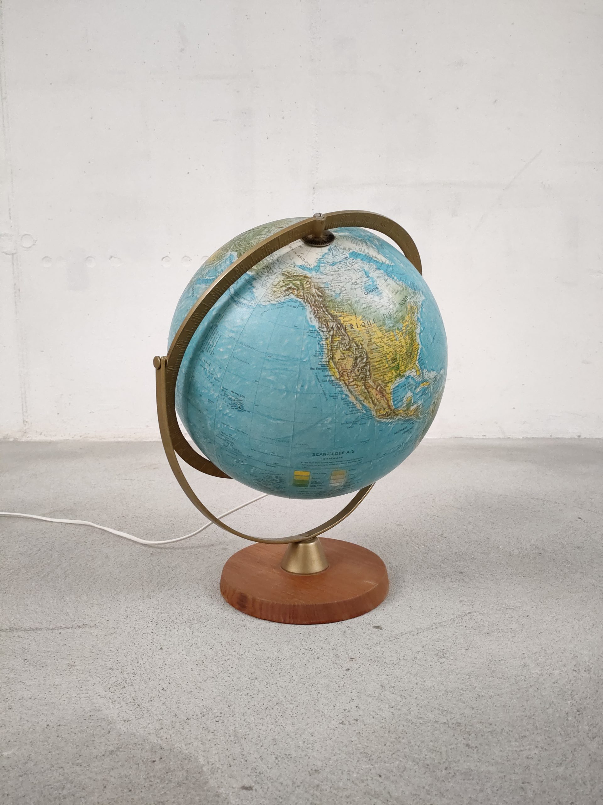 Produit venduGlobe terrestre lumineux en plastique et papier avec socle en bois. Produit très probablement au début des années 90 par l’entreprise danoise Scan-Globe A/S. Il fonctionne parfaitement, le globe est en parfait état.