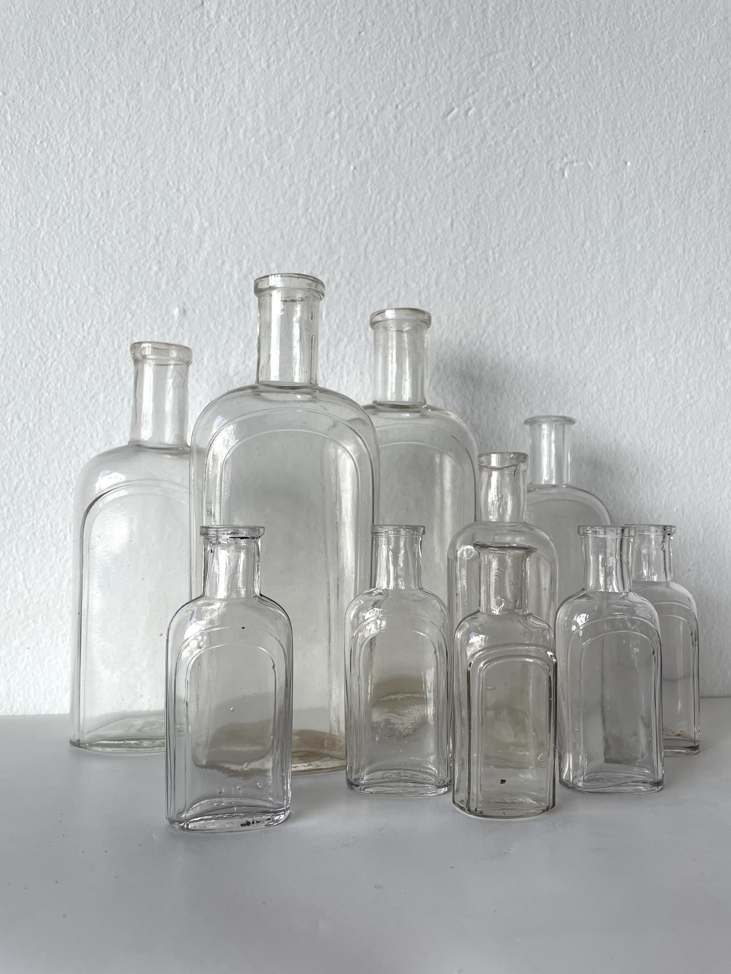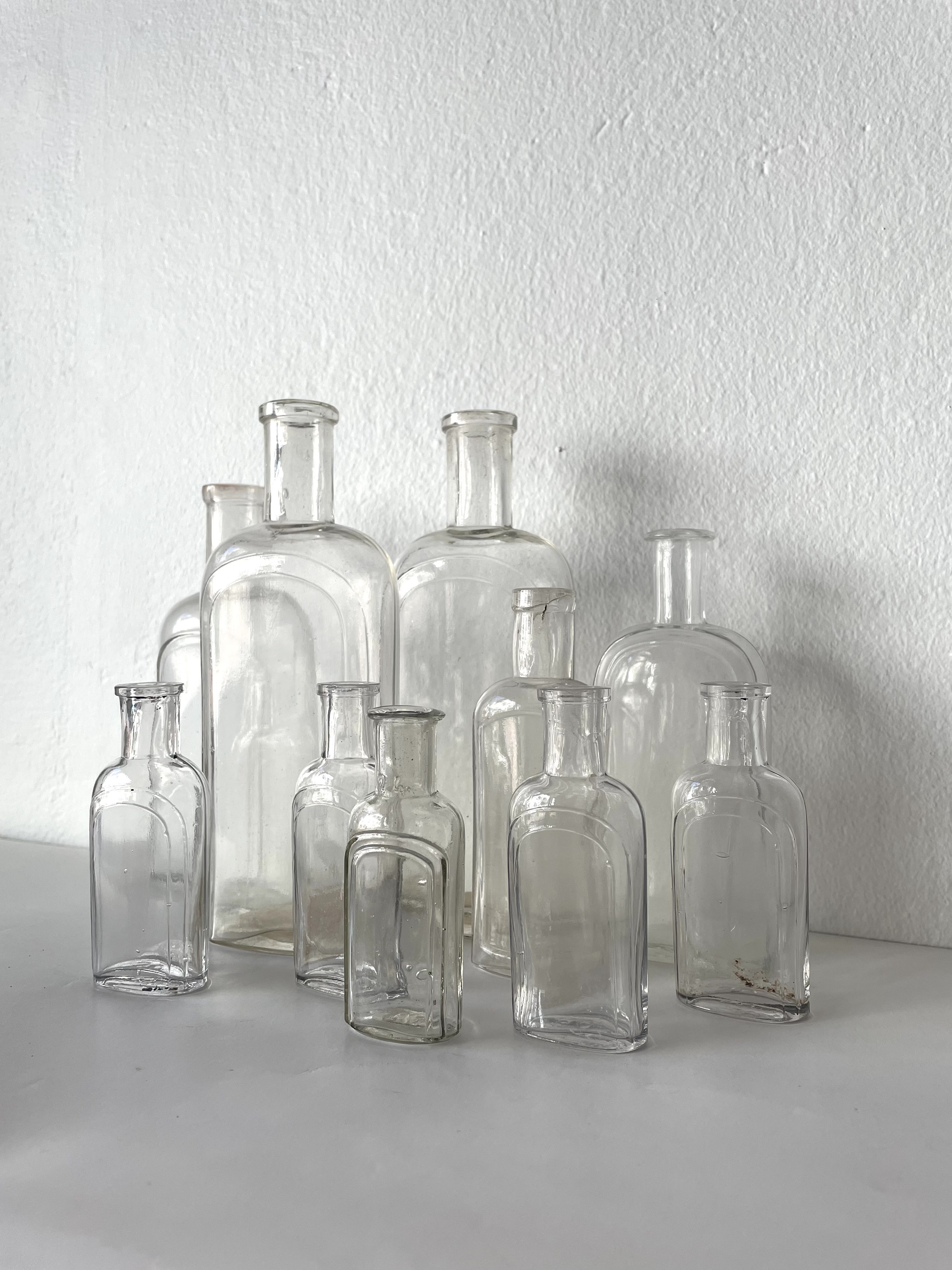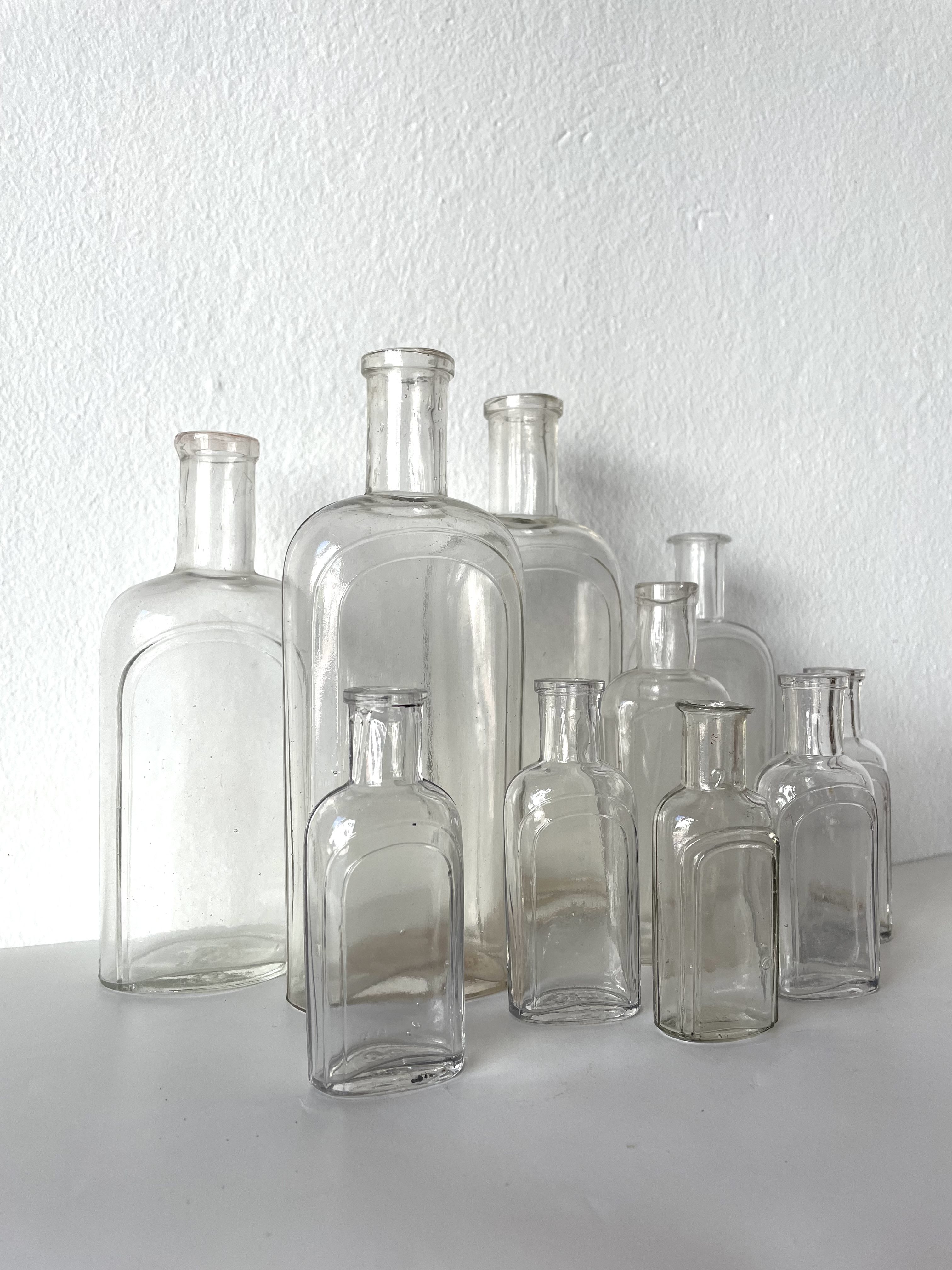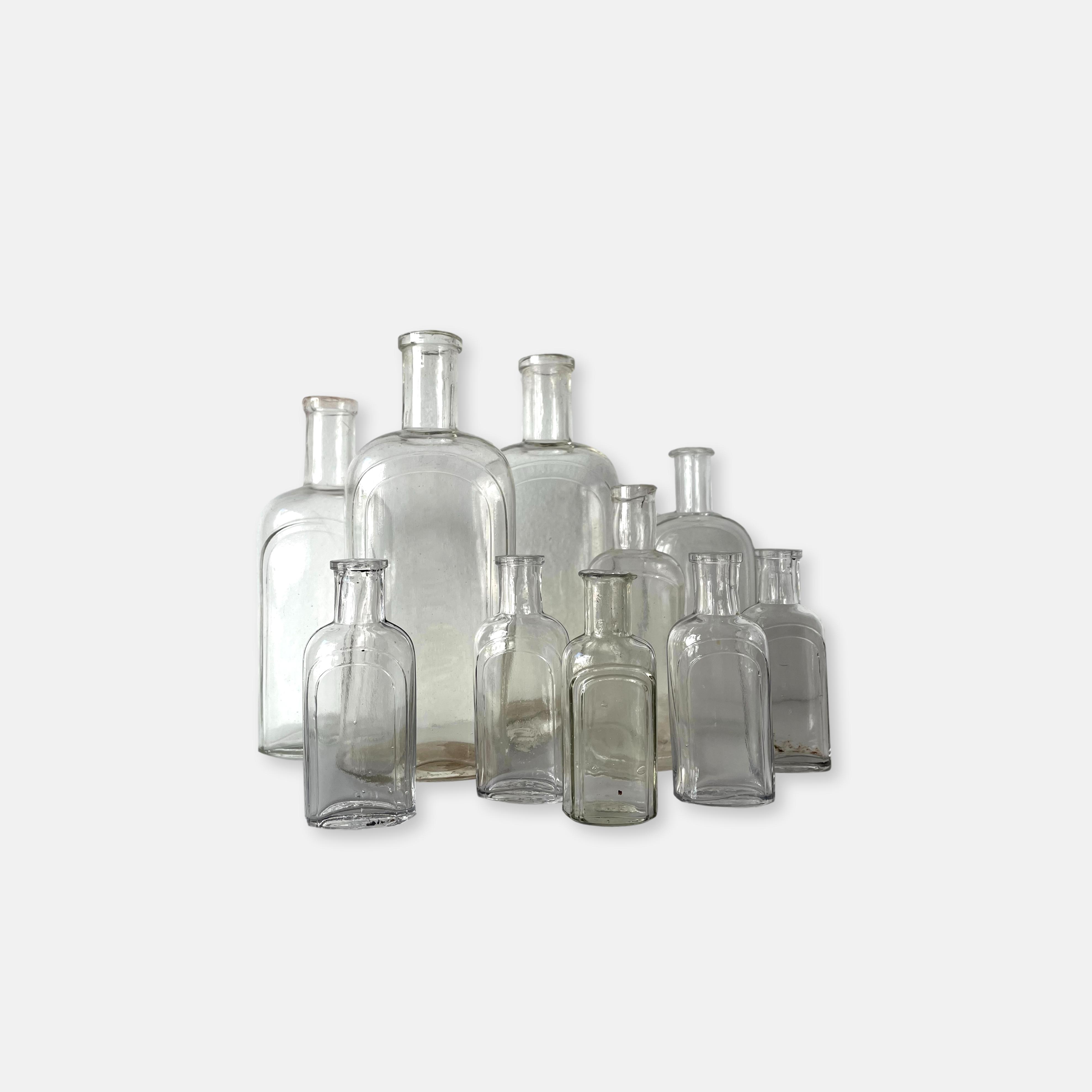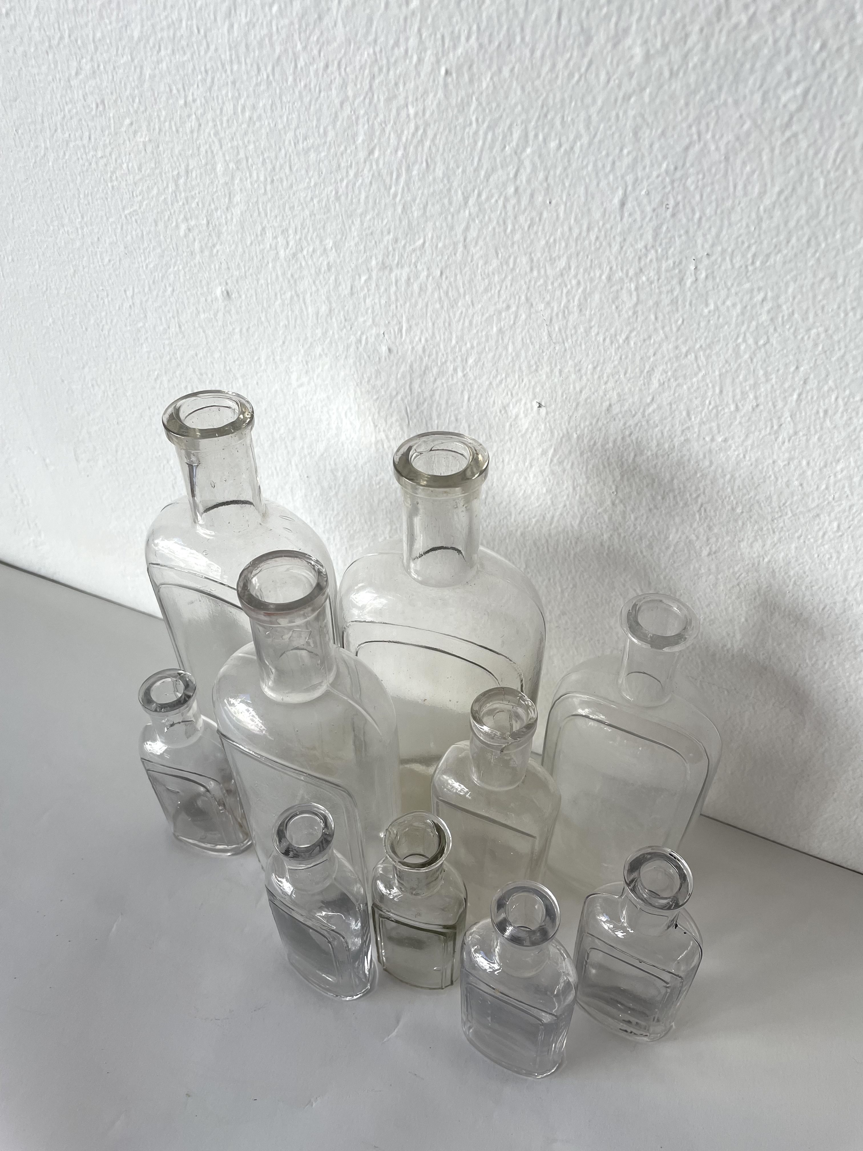 Produit venduJoli lot de fioles pharmaceutiques de forme bouteille plate avec liseré en demi cercle, de couleur transparente.