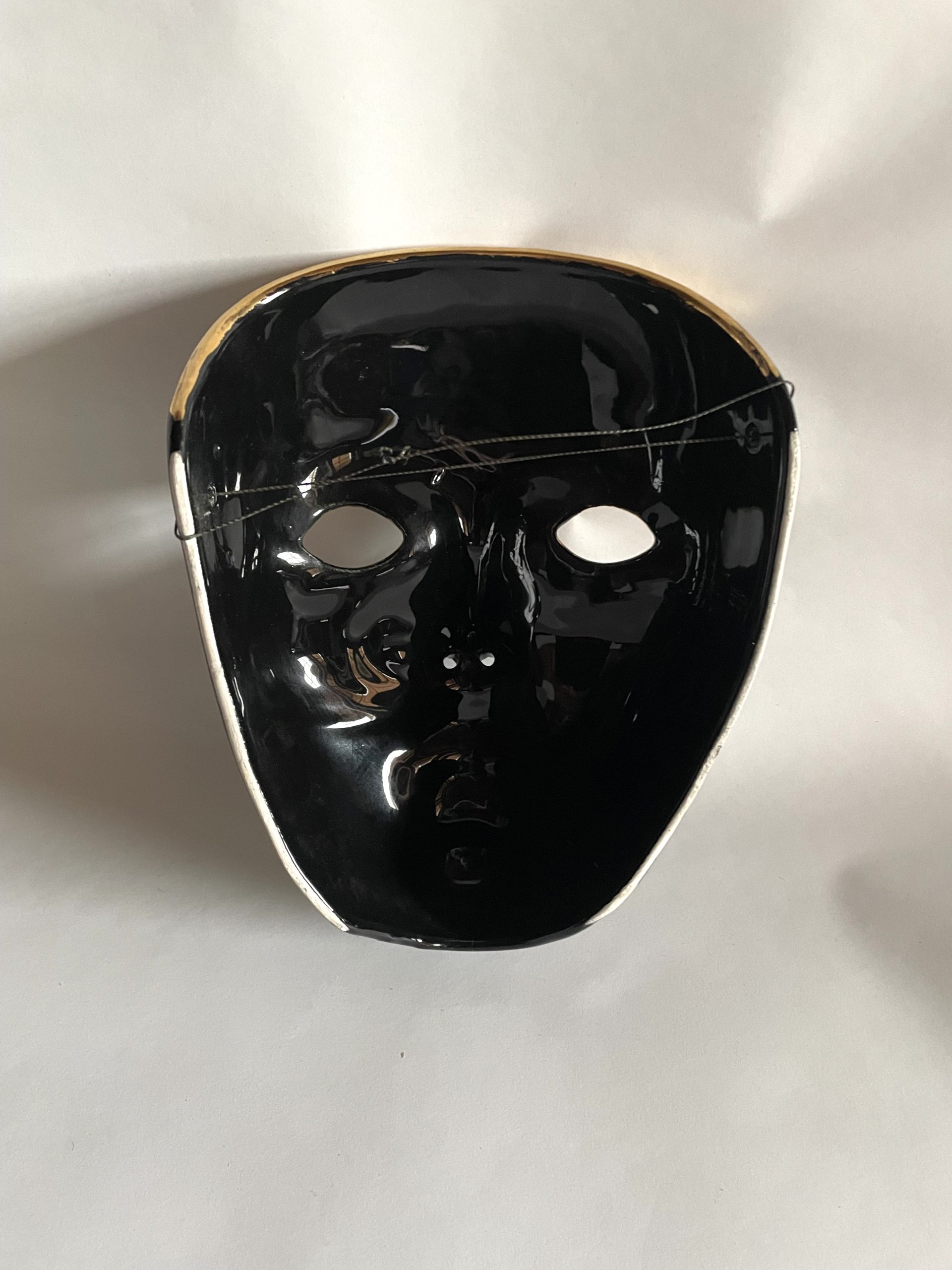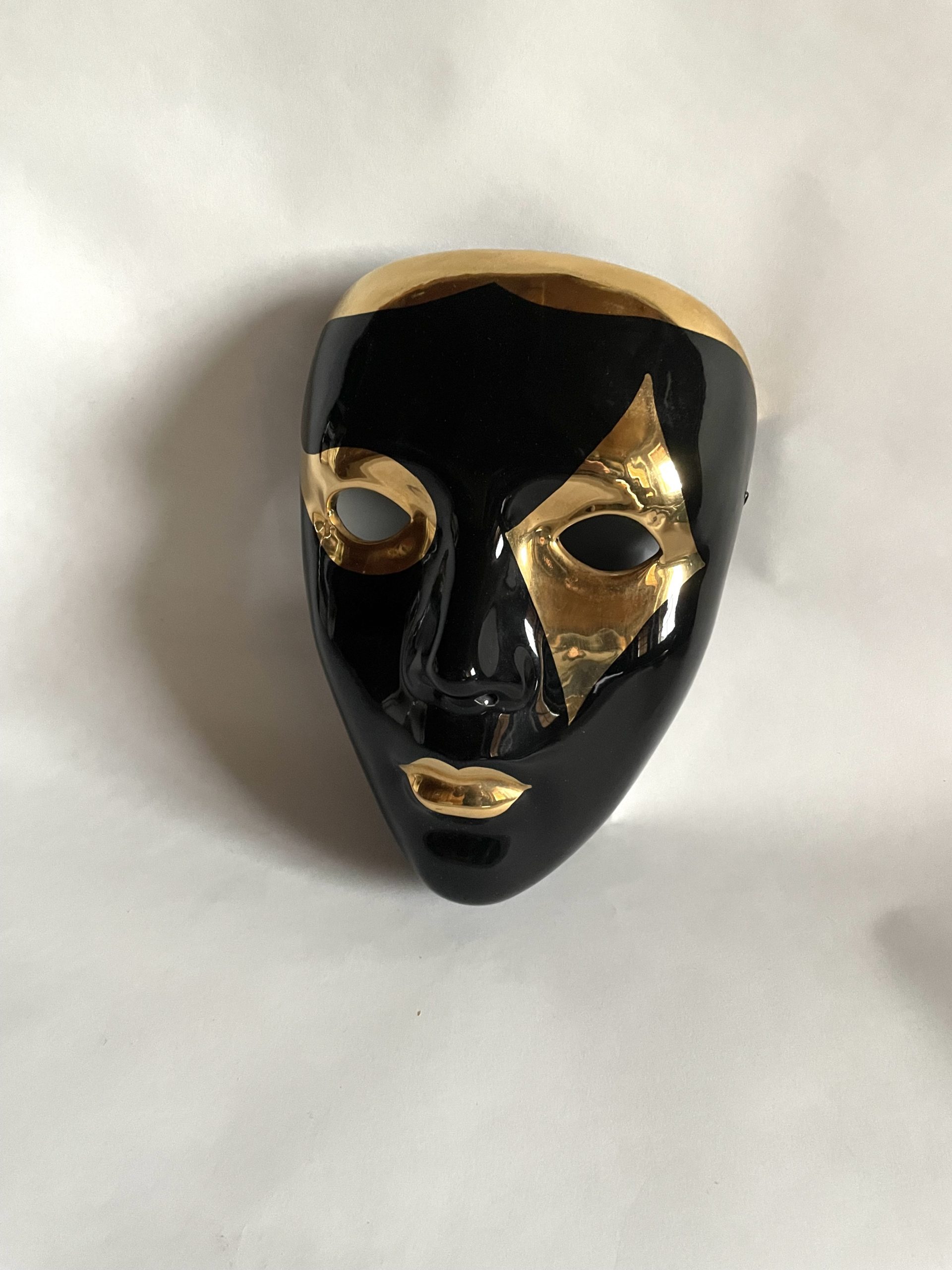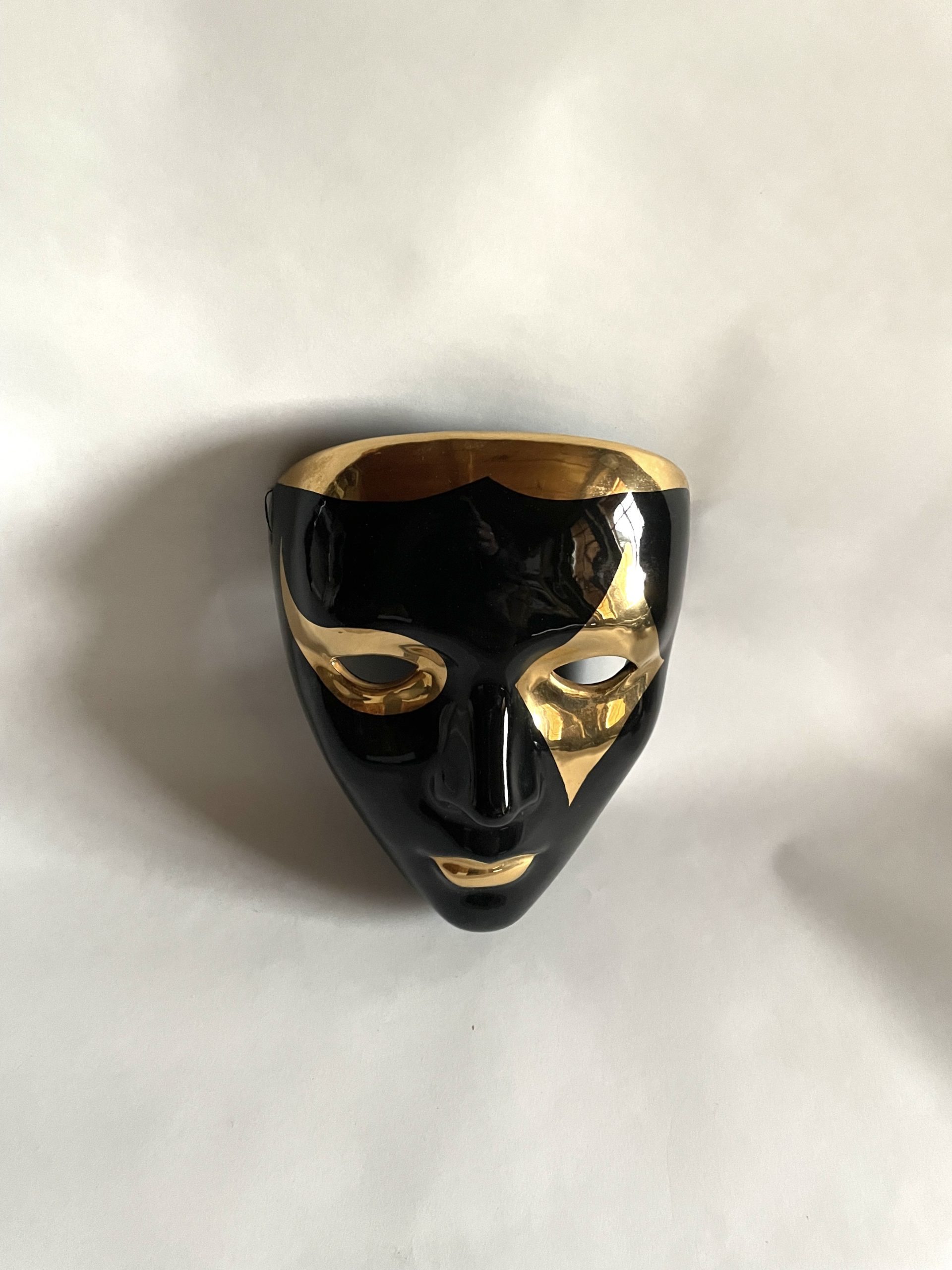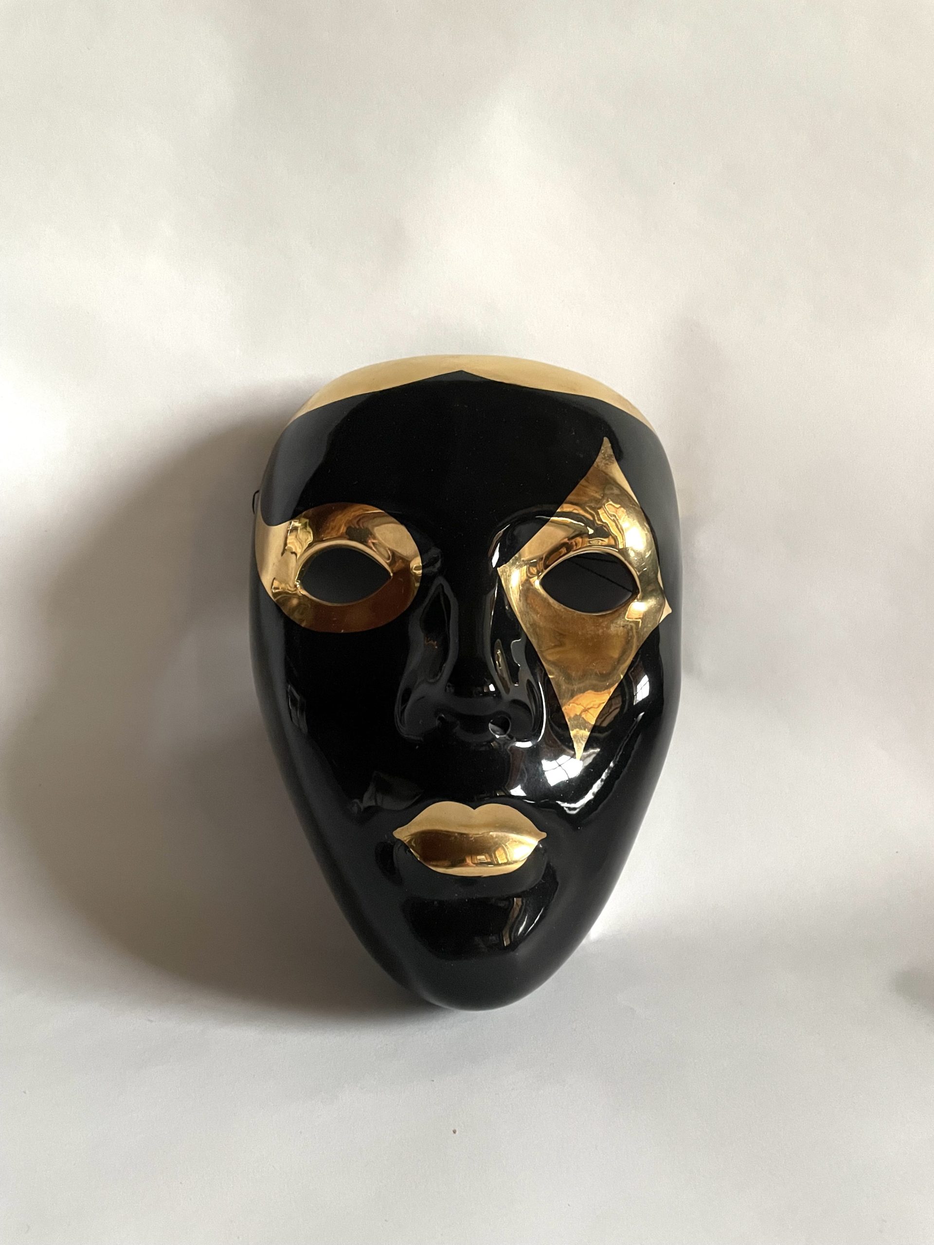Produit venduMasque vénitien en céramique laqué noir et or. Vintage. Décoration murale ou autre. Excellent état.