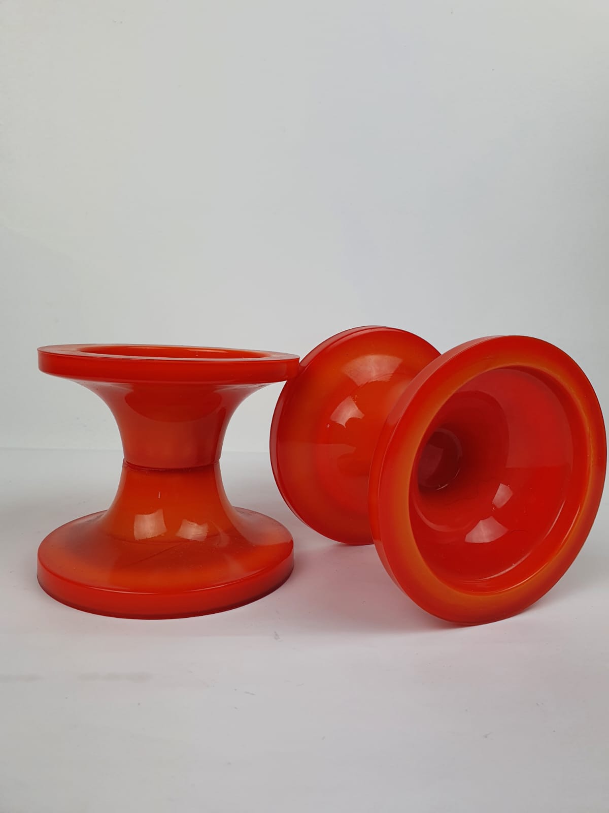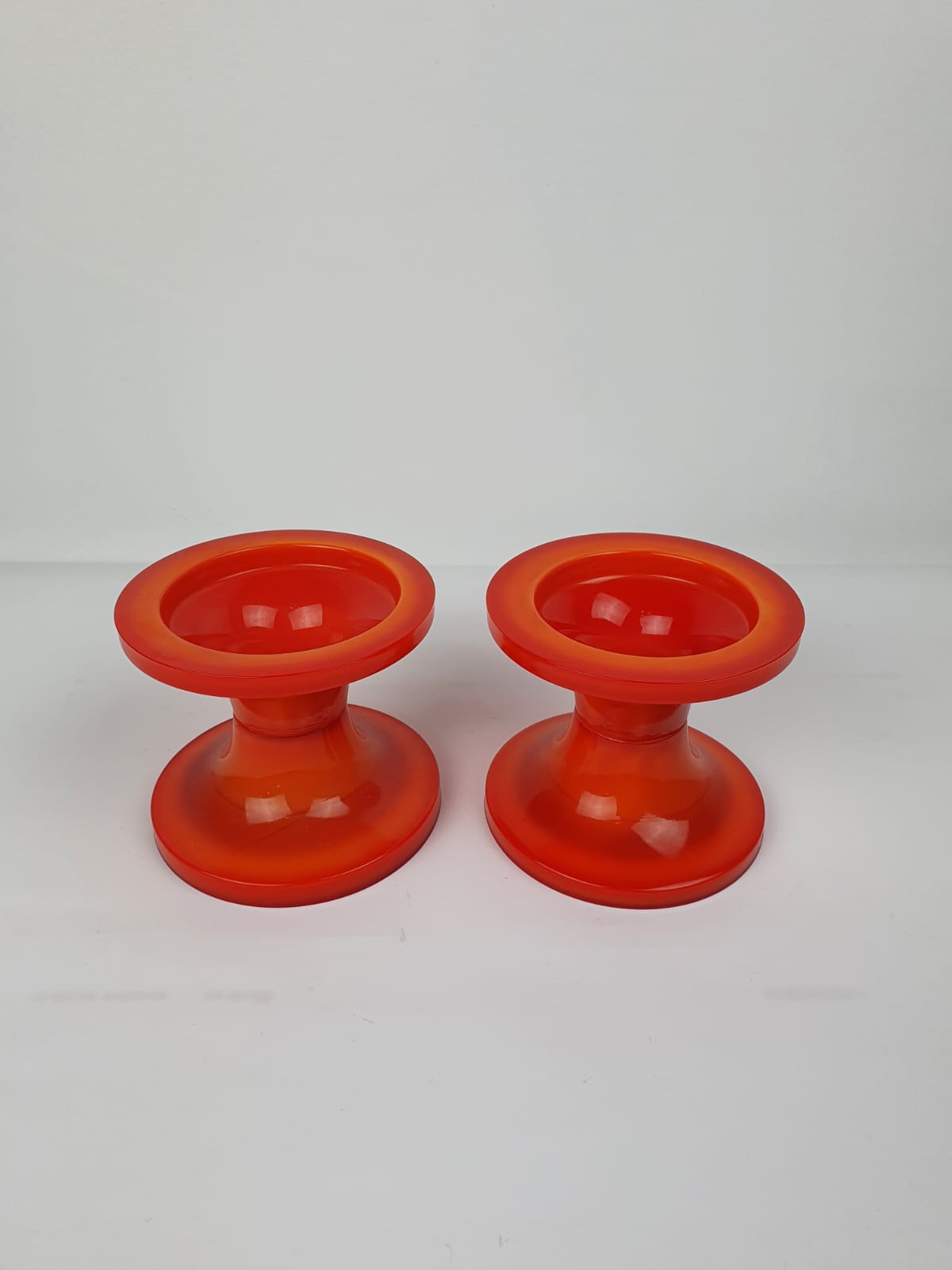 Produit venduPaire de bougeoirs en verre, fait main en Italie dans les années 70, en forme de “tamtam” de couleur orange style space age.