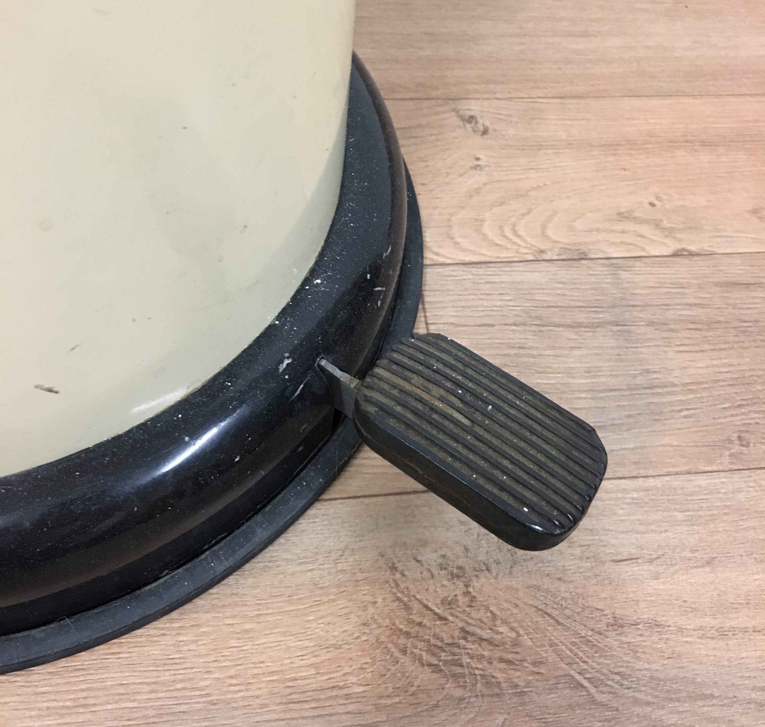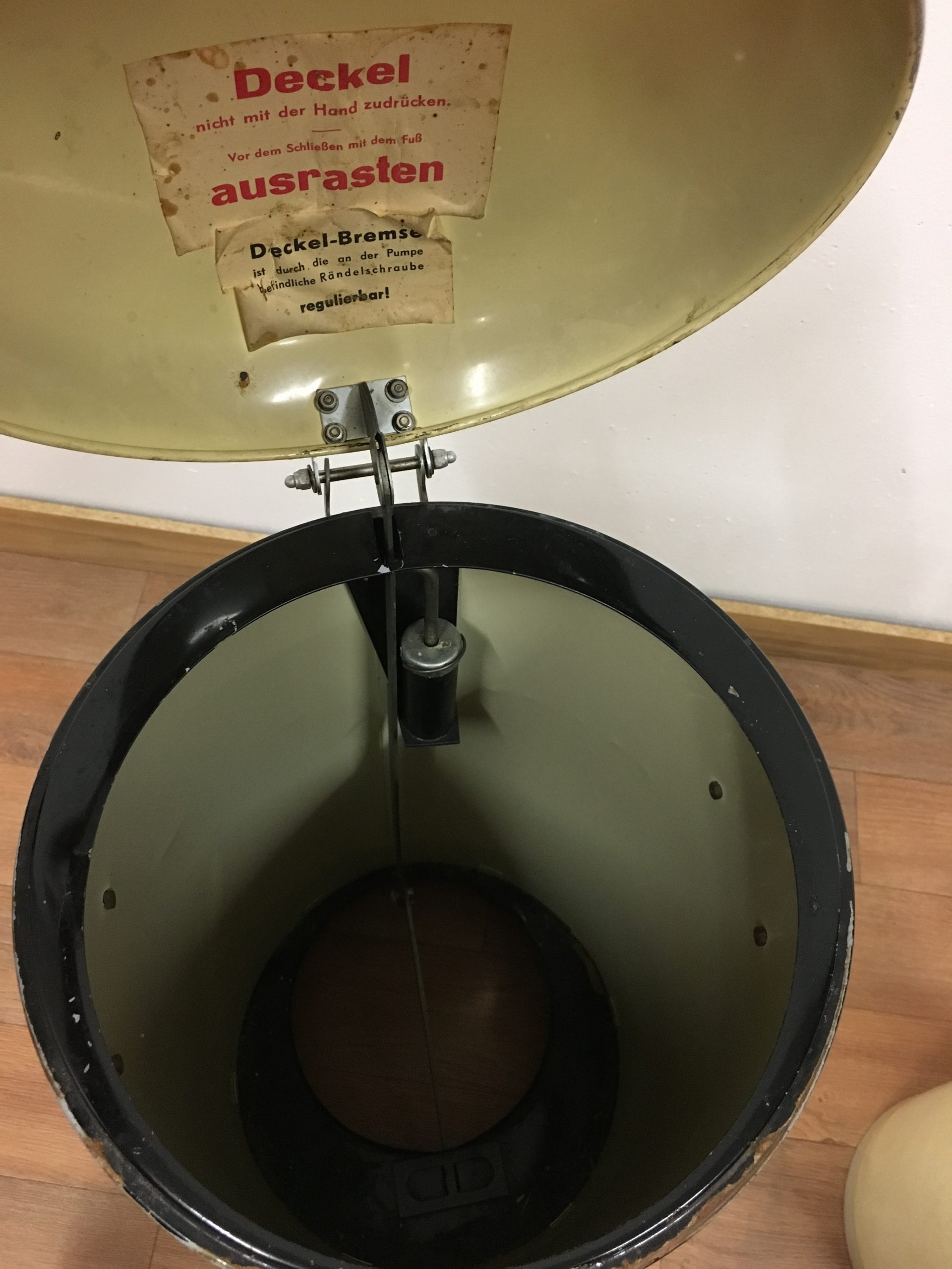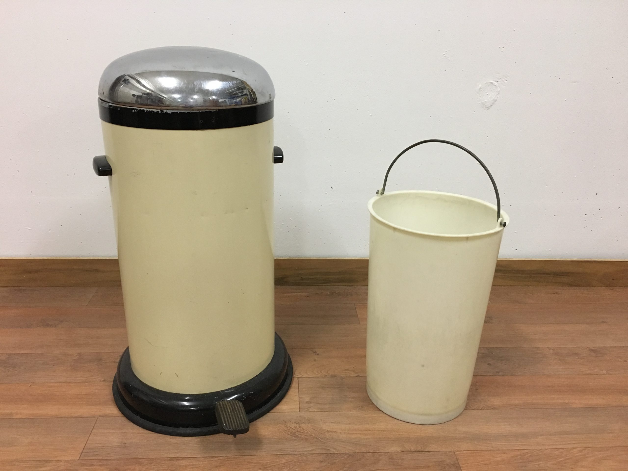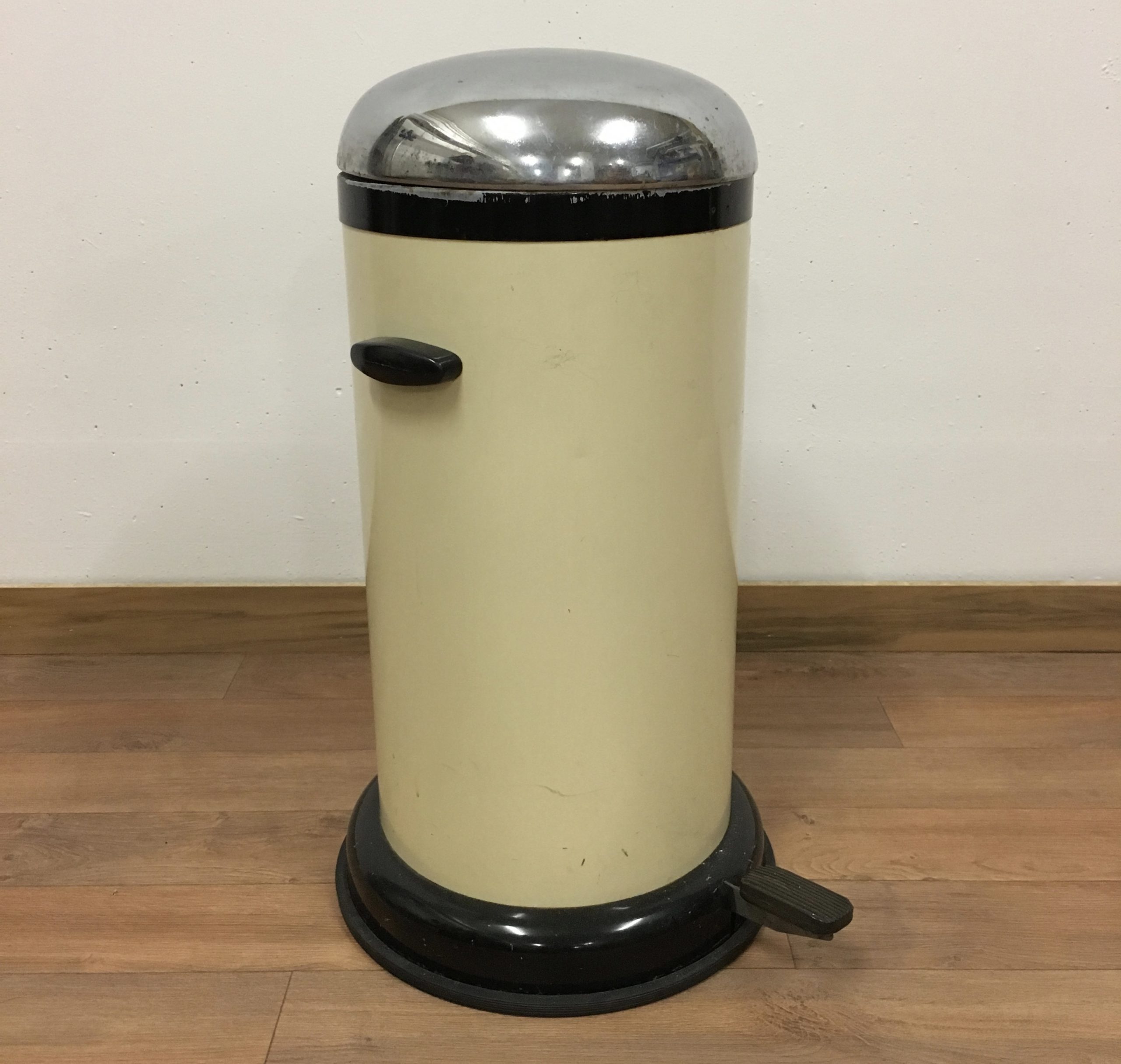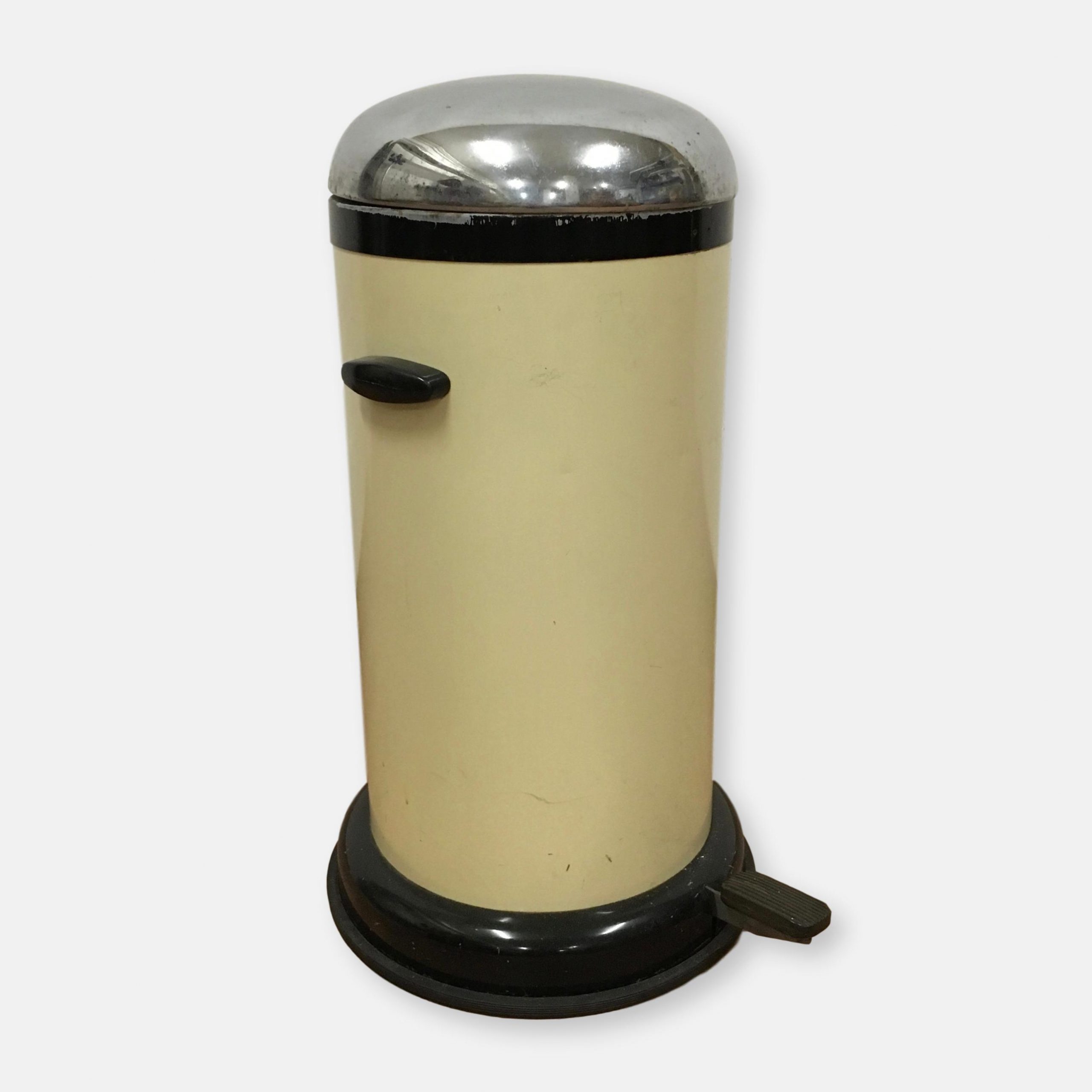 Produit venduPoubelle vintage à pédale avec bidon intégré, années 60-70. Dimensions du bidon intérieur: 34 cm (hauteur) x 22 cm (diamètre).