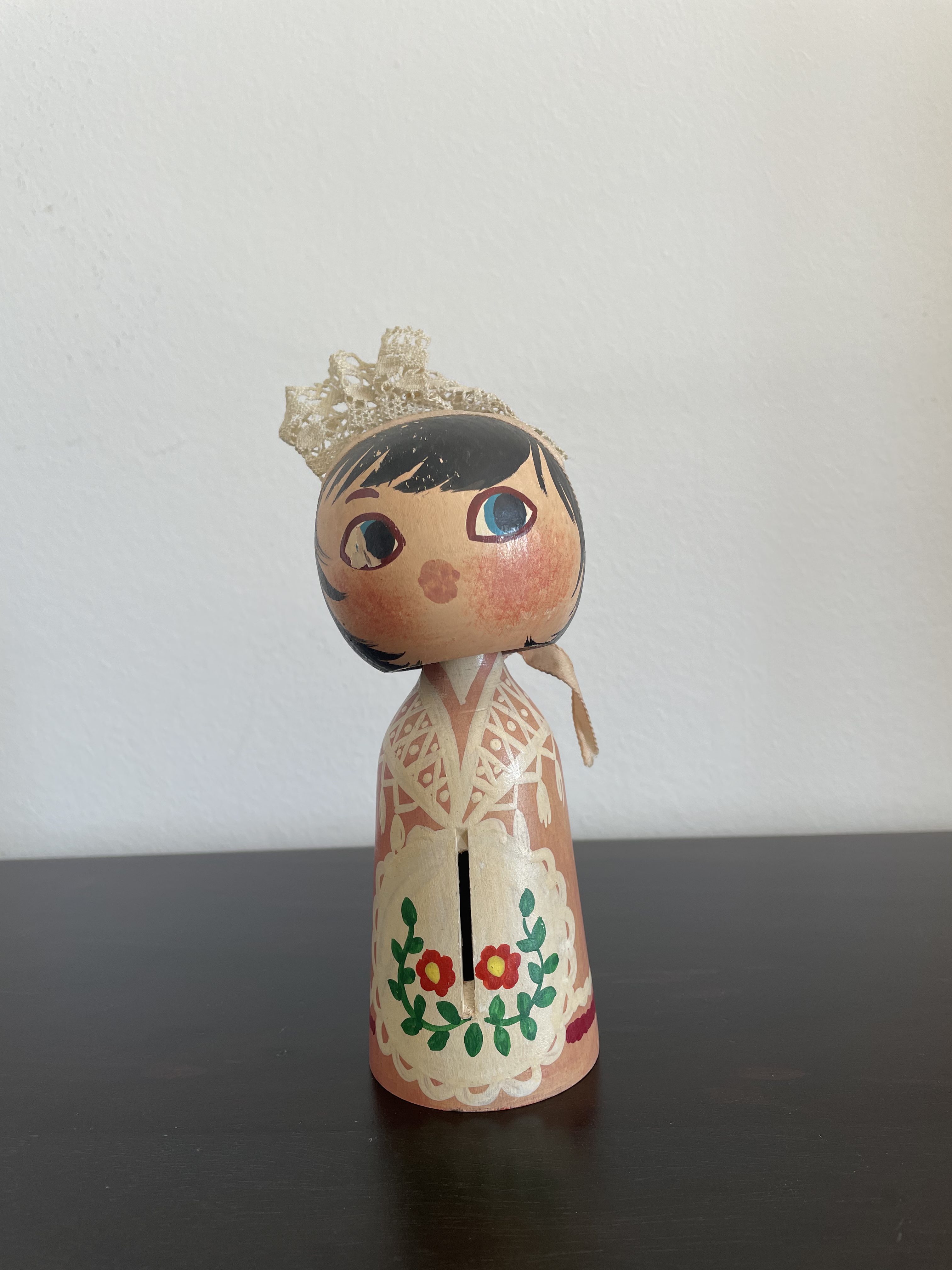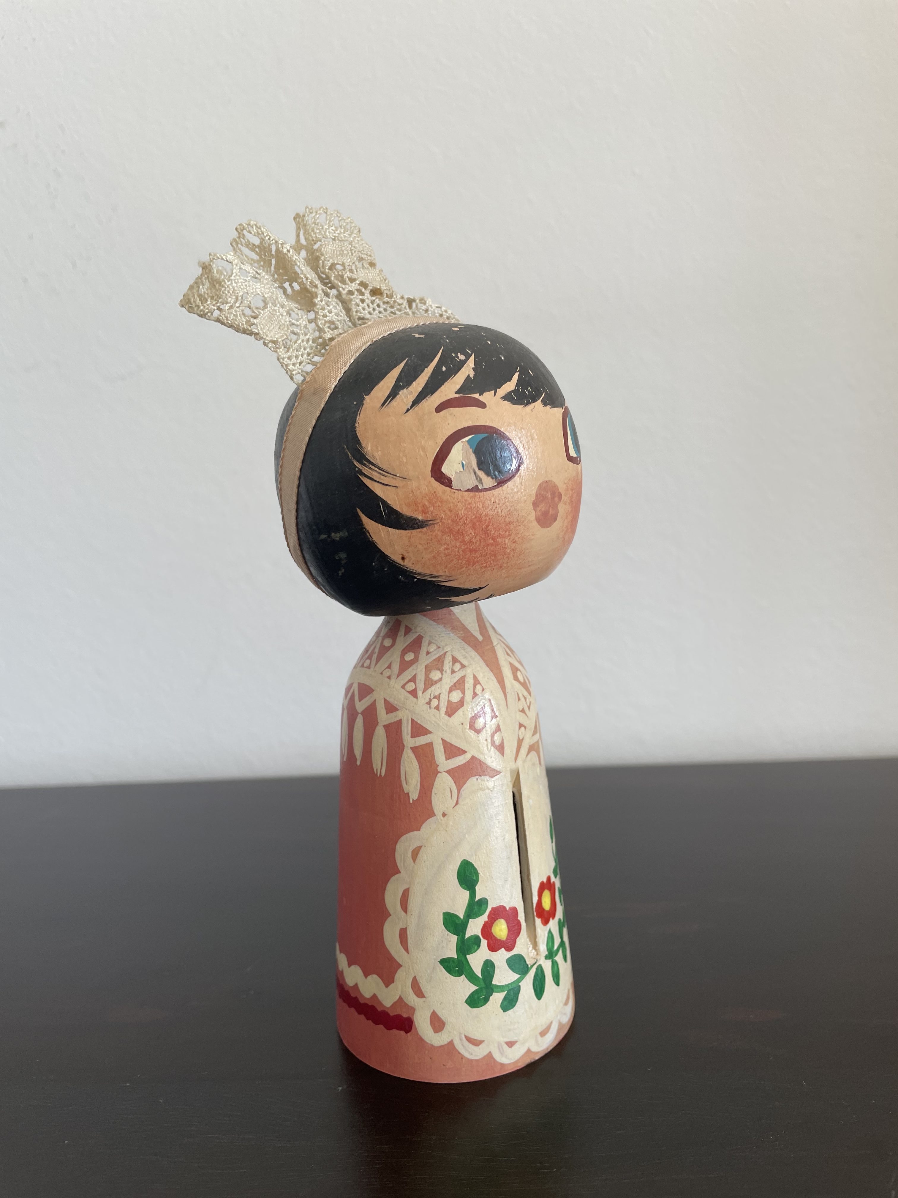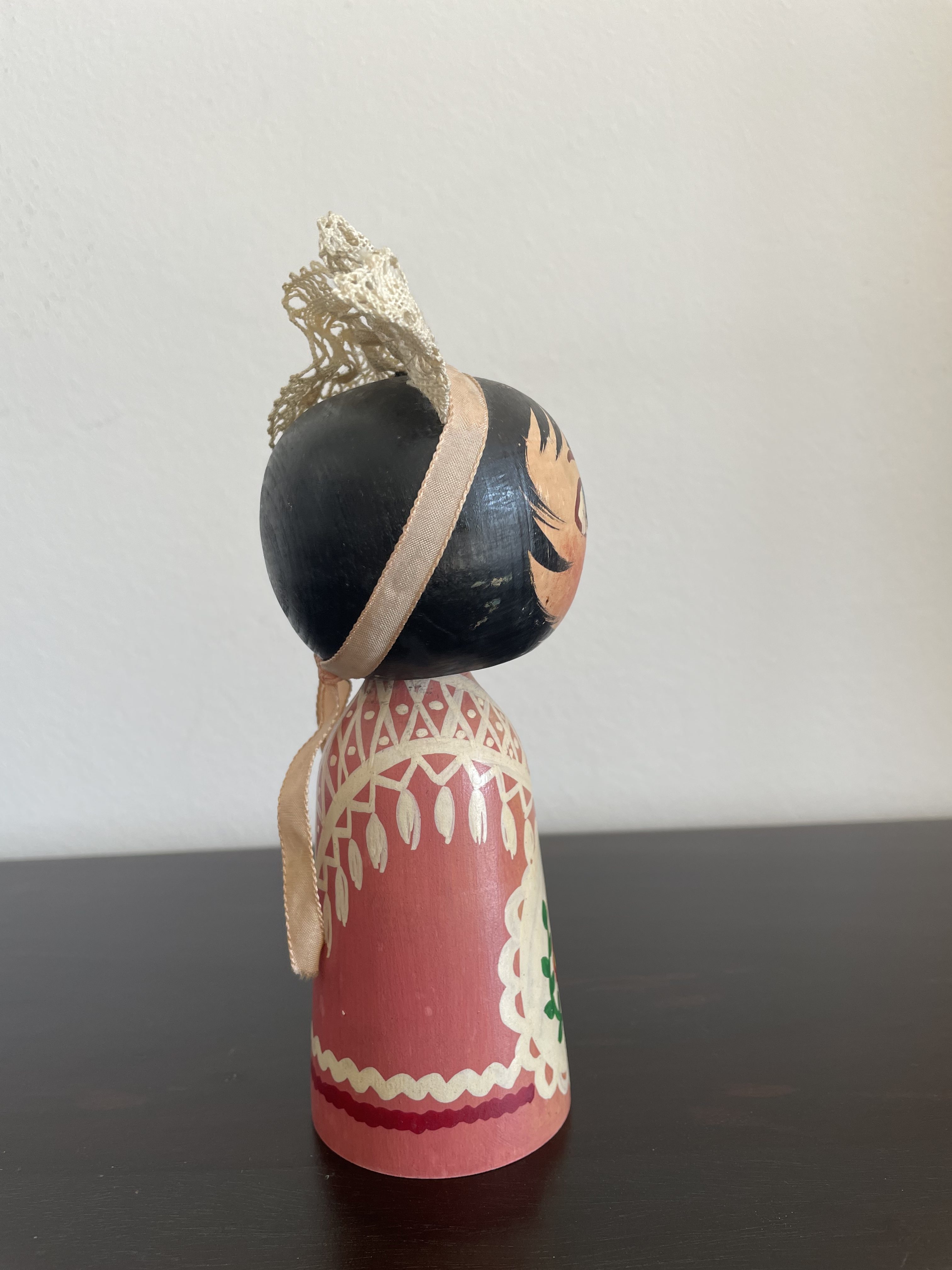 Réalisée en bois, peinte à la main et agrémentée de petite dentelle, sa tête oscille légèrement, tout comme les poupées originales.