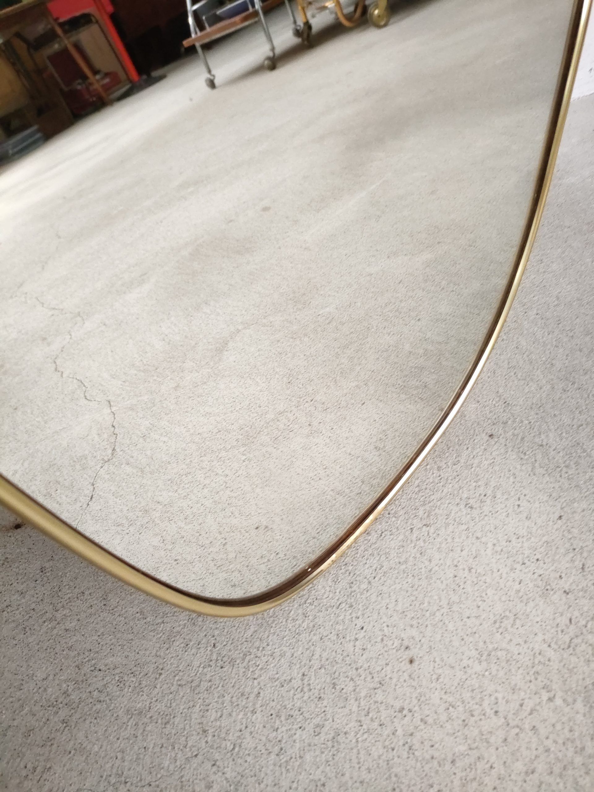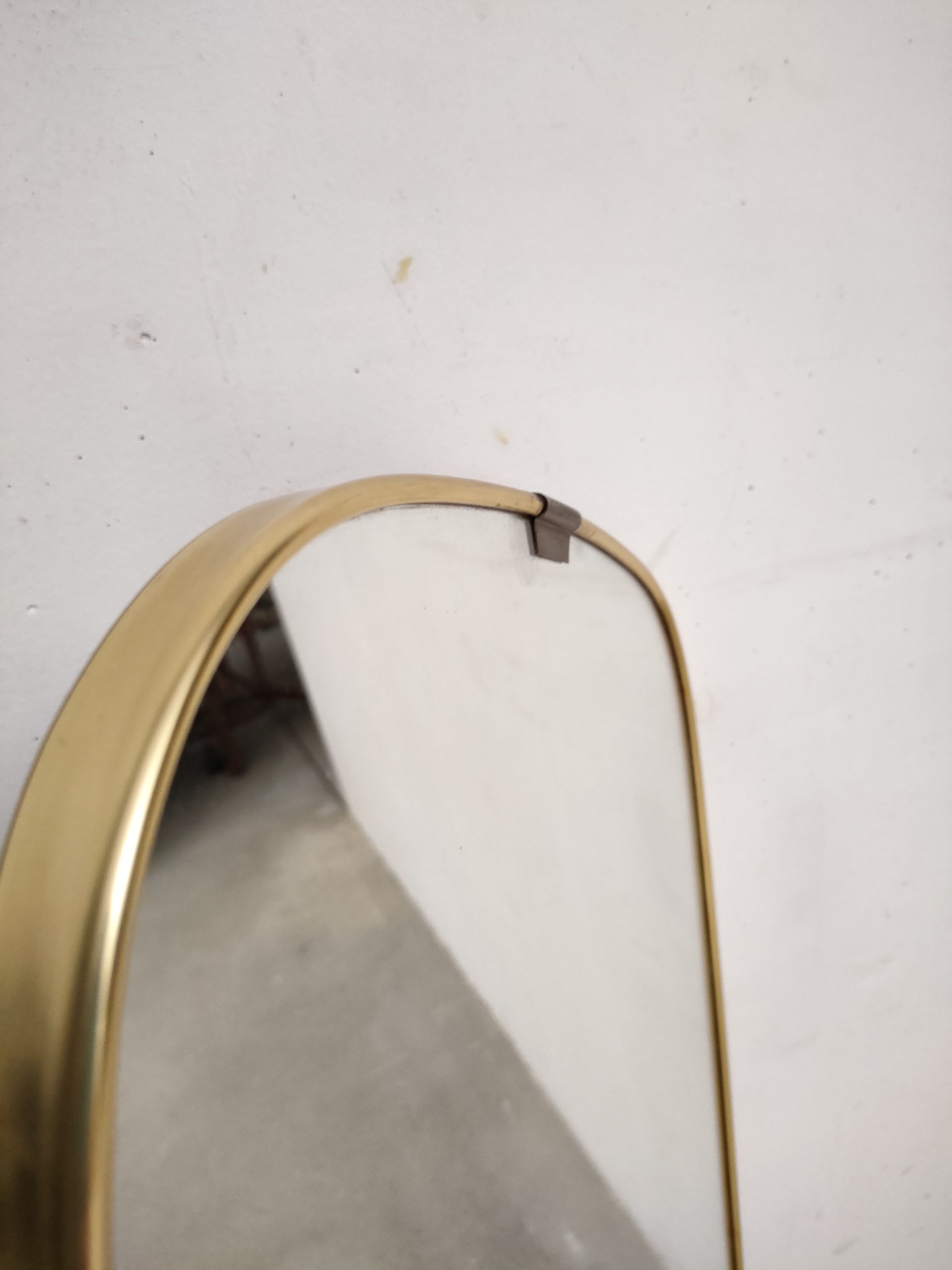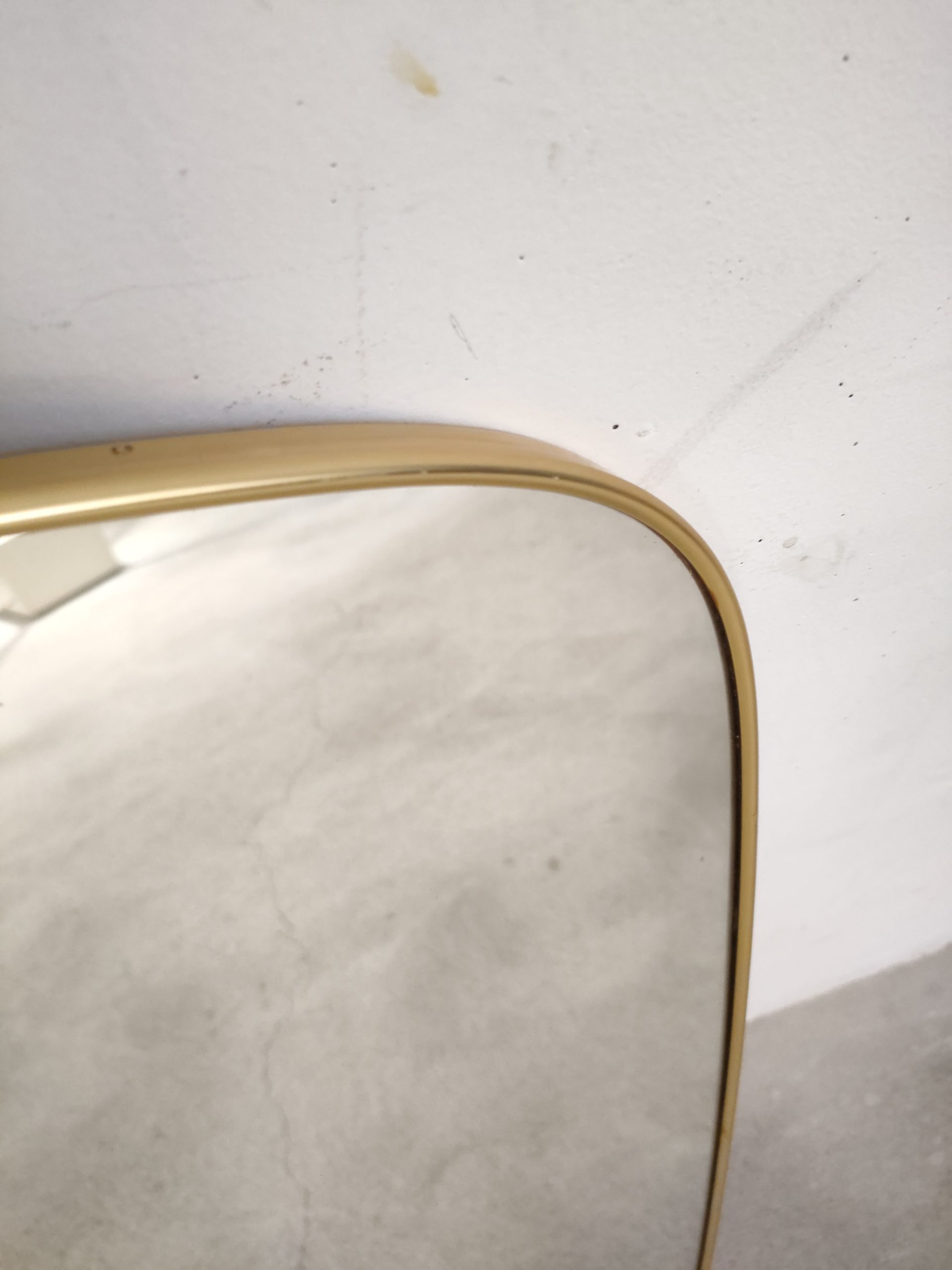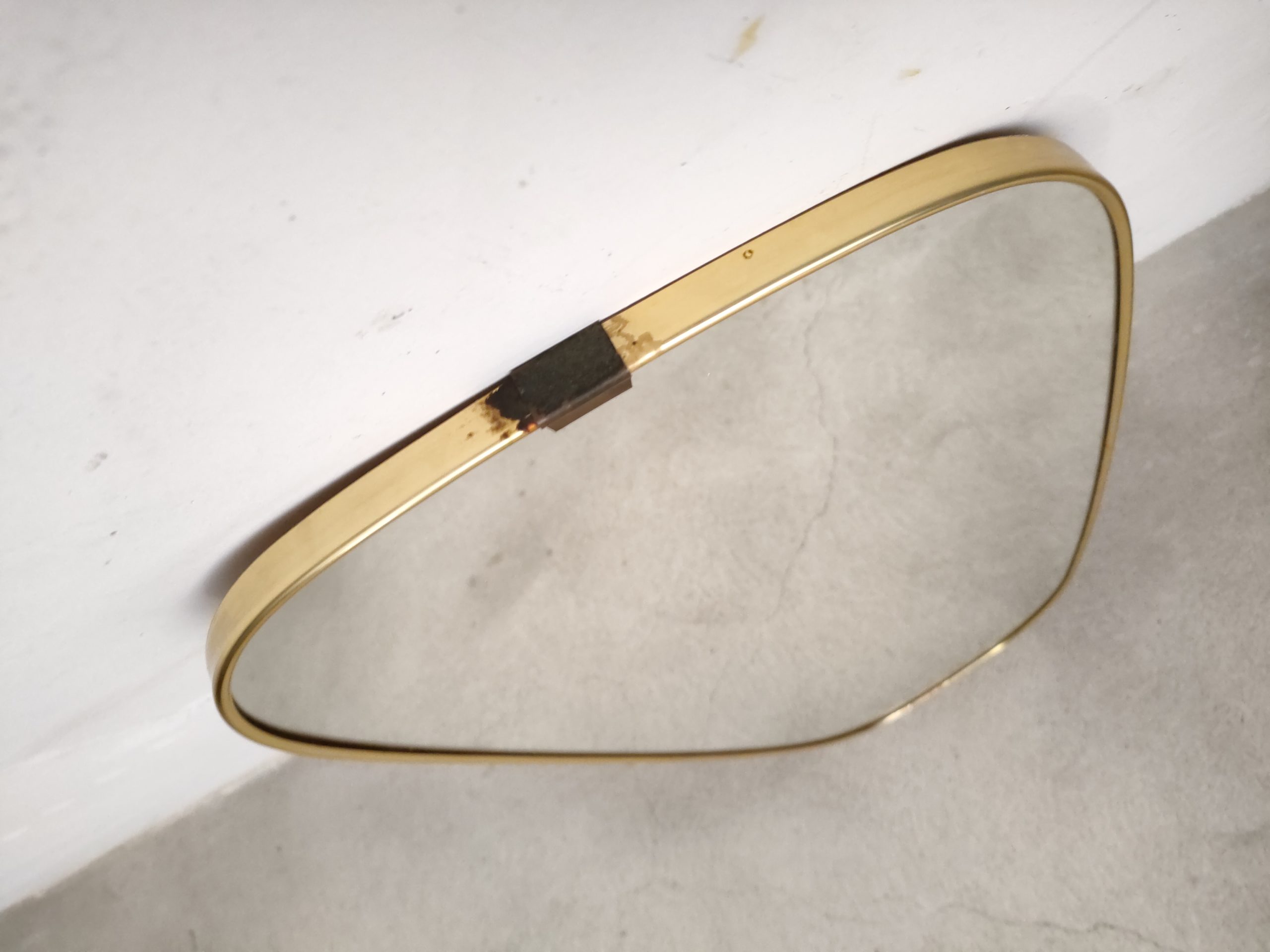 Miroir vintage de forme asymétrique avec cadre en plastique de couleur doré. Trace du temps surtout sur le dessus du miroir et en bas – voir photos.