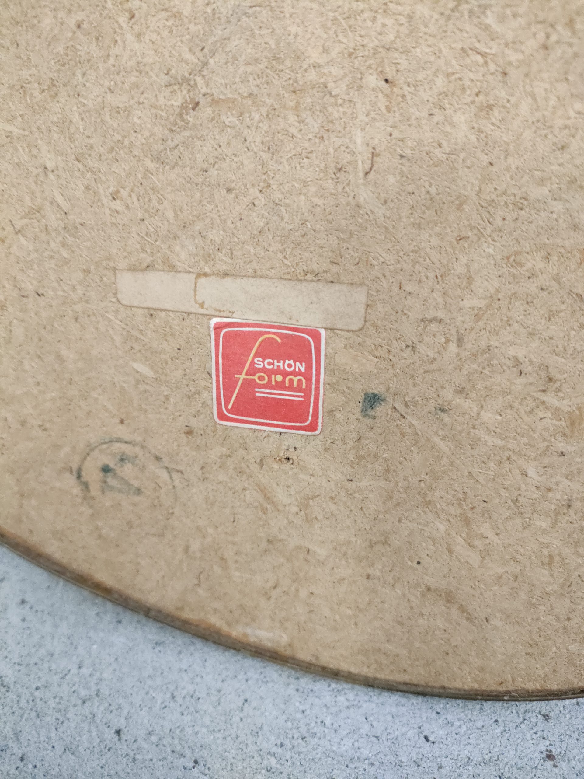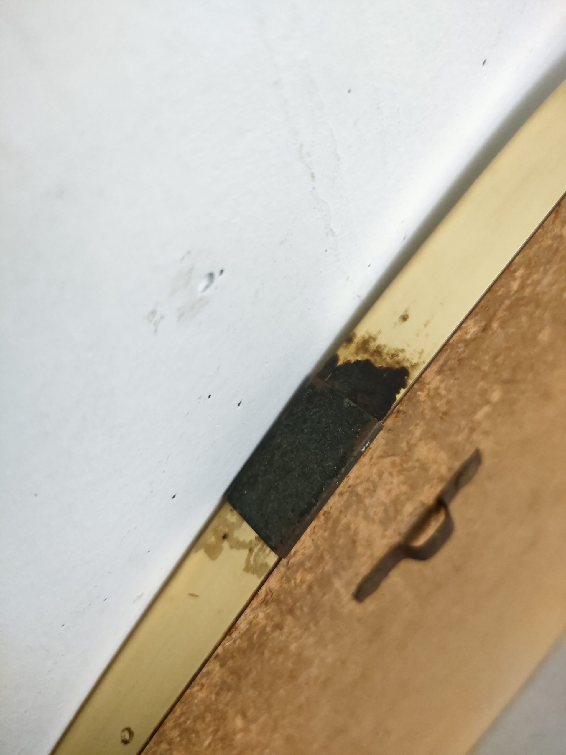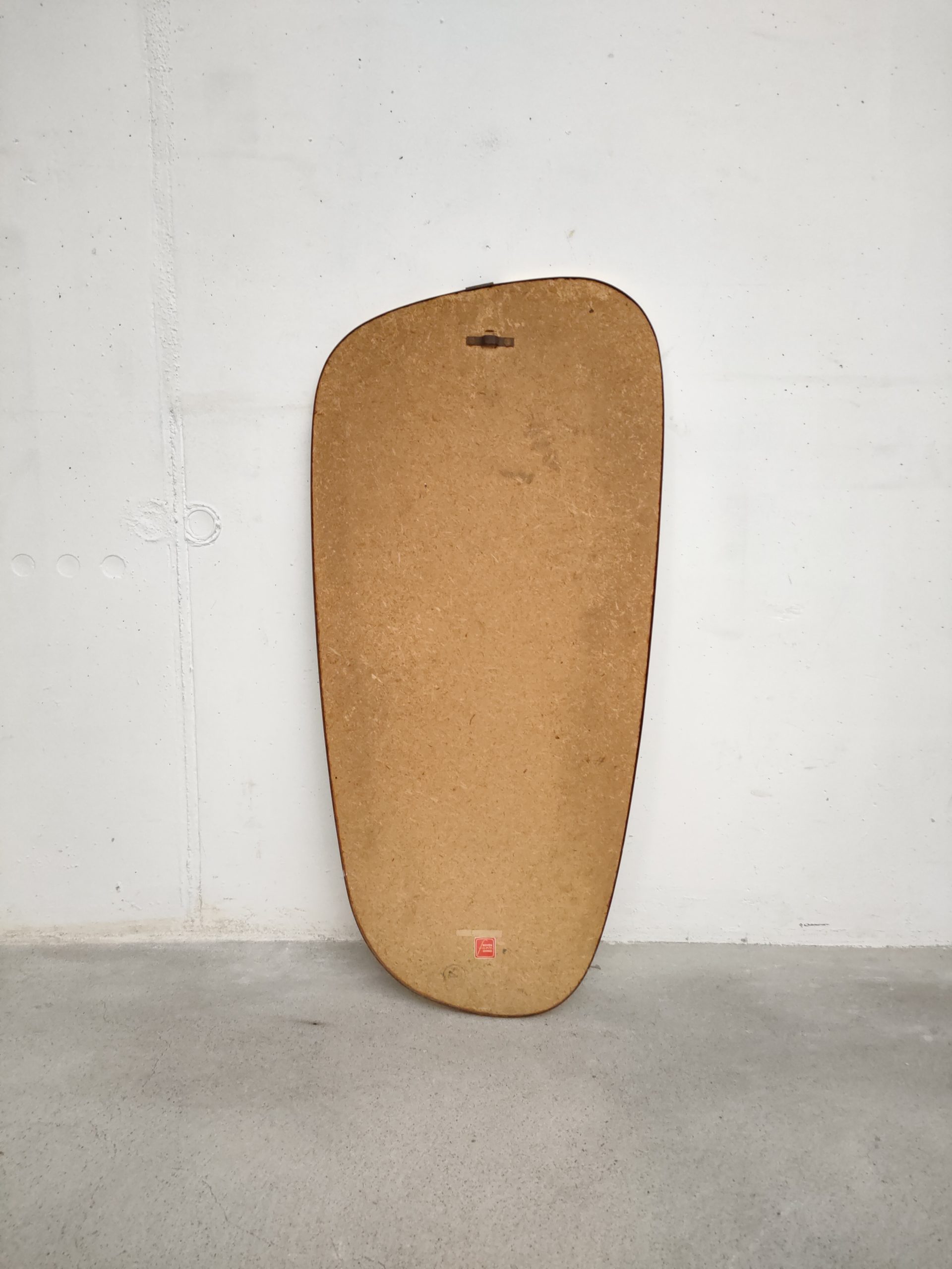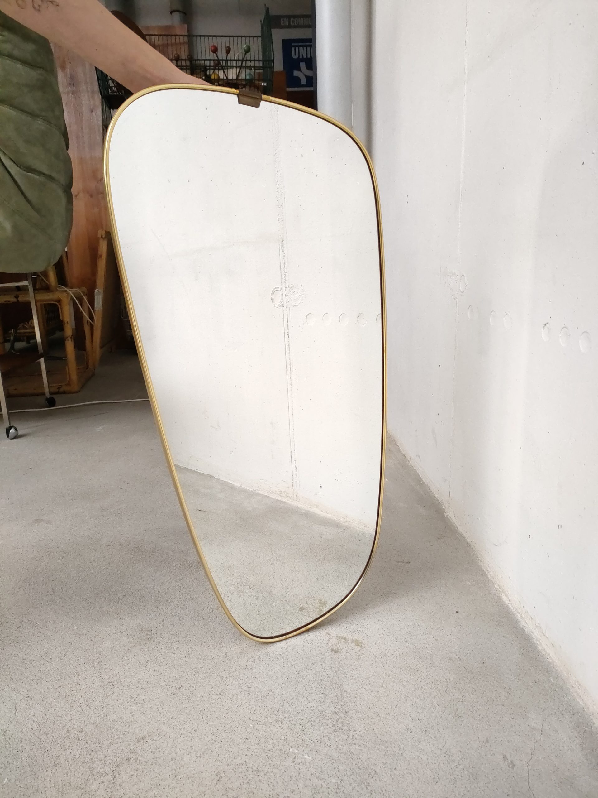 Miroir vintage de forme asymétrique avec cadre en plastique de couleur doré. Trace du temps surtout sur le dessus du miroir et en bas – voir photos.