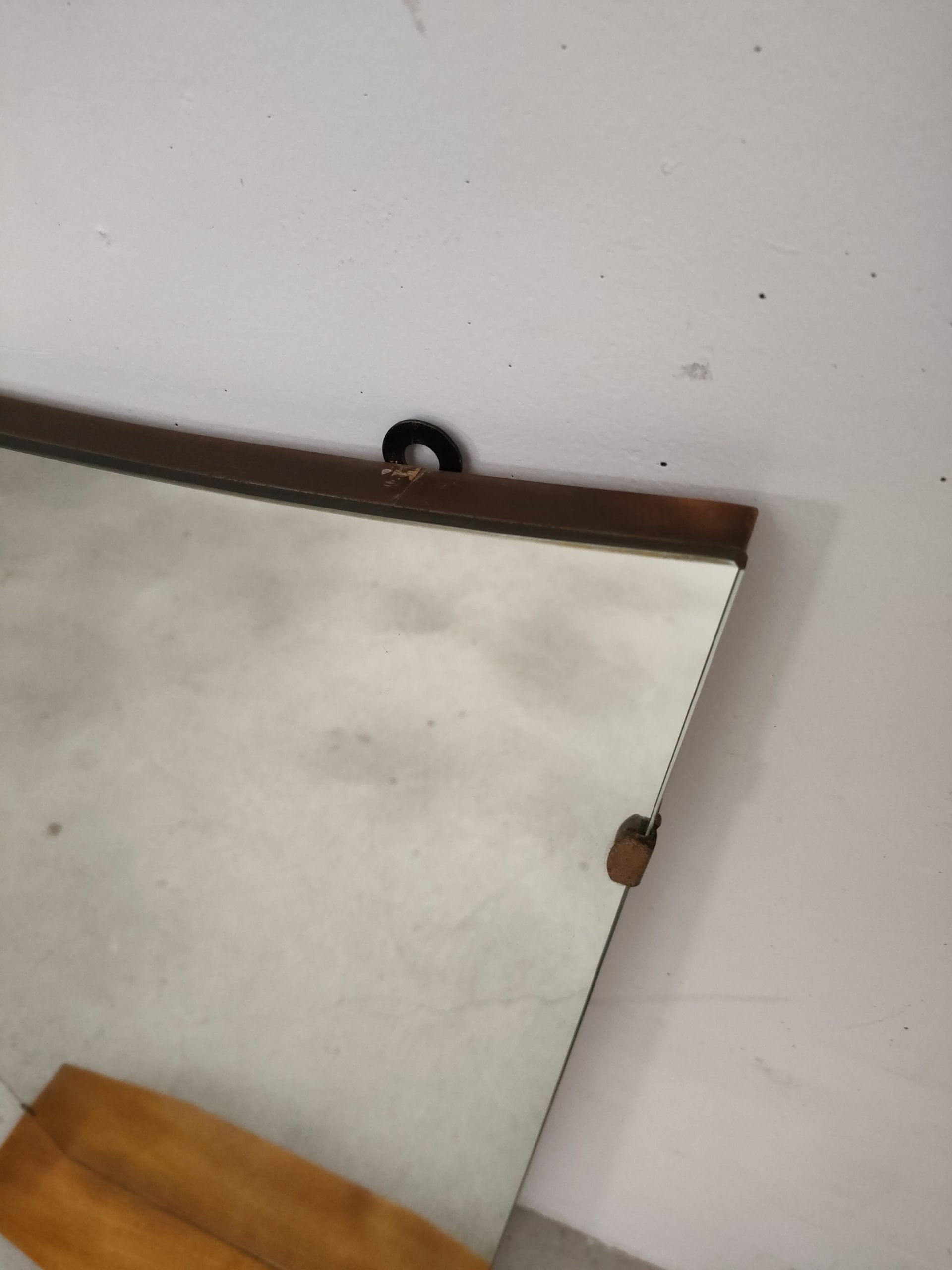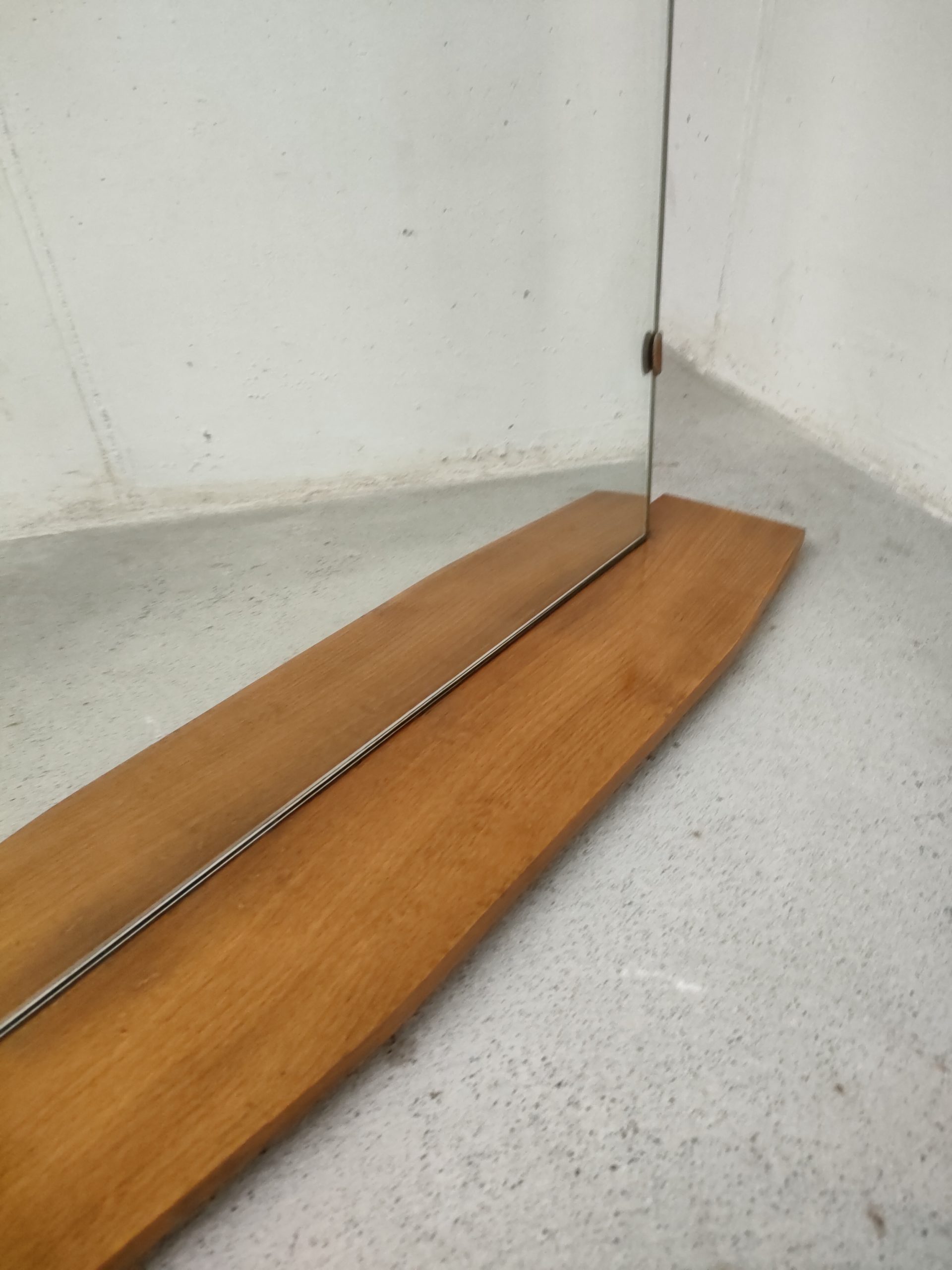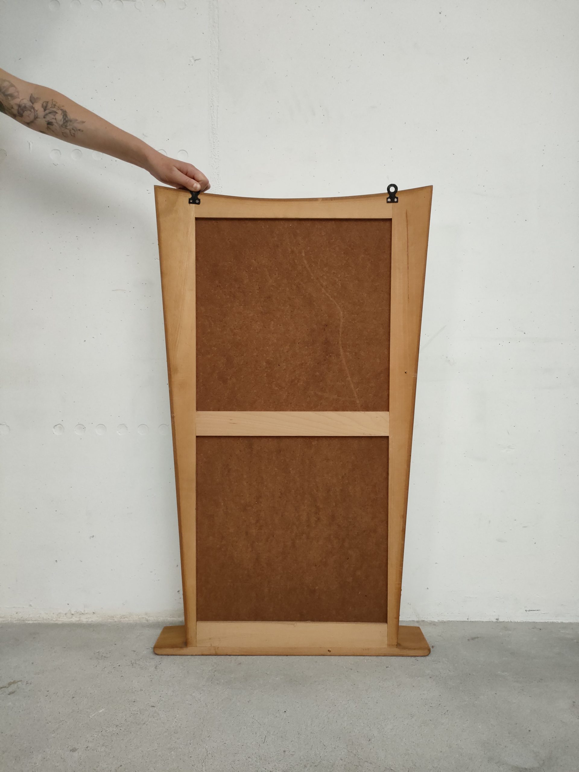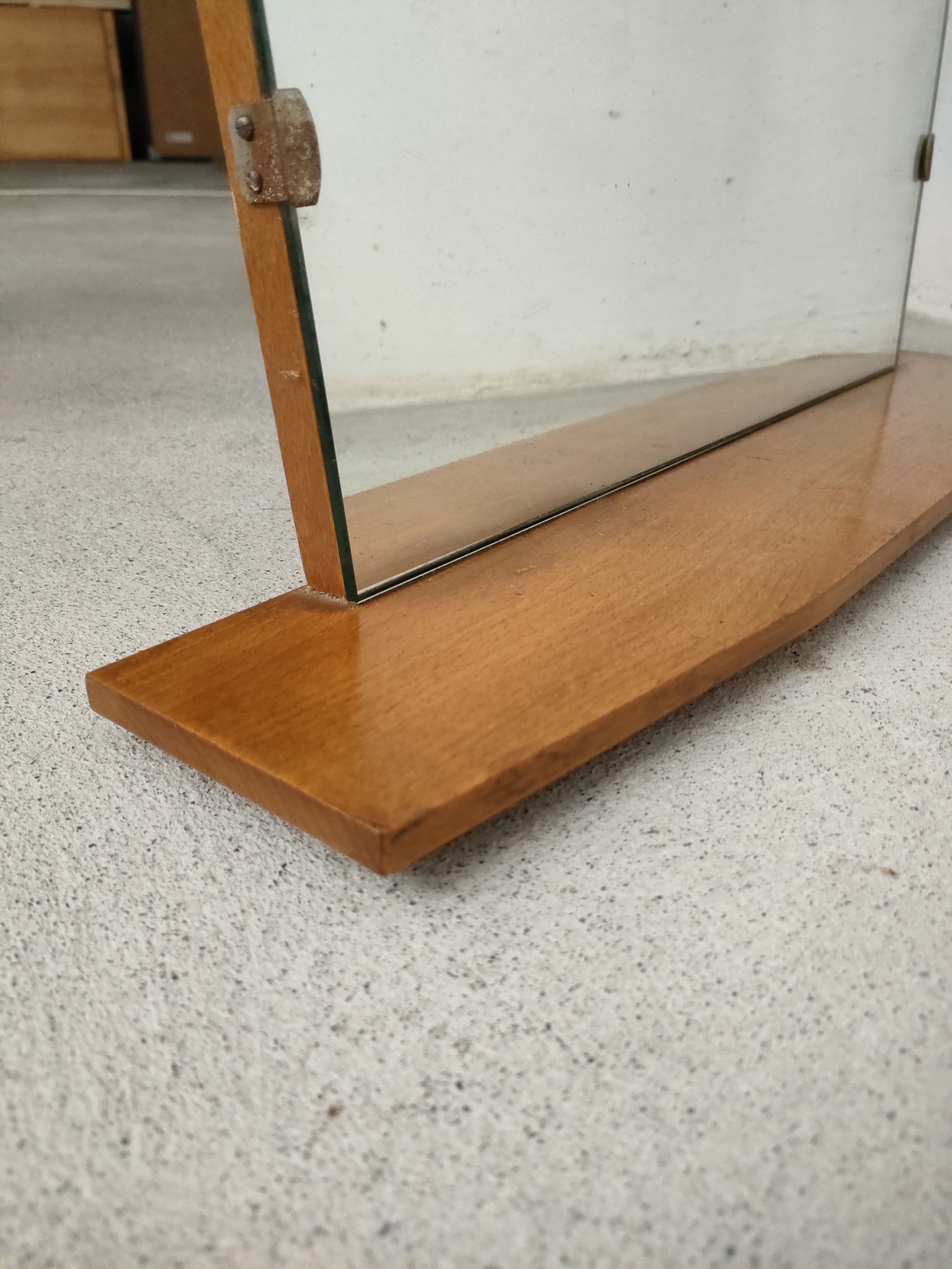 Produit venduMiroir vintage avec forme atypique et doté d’une tablette en bois et de deux crochets en métal pour l’accrocher au mur.
