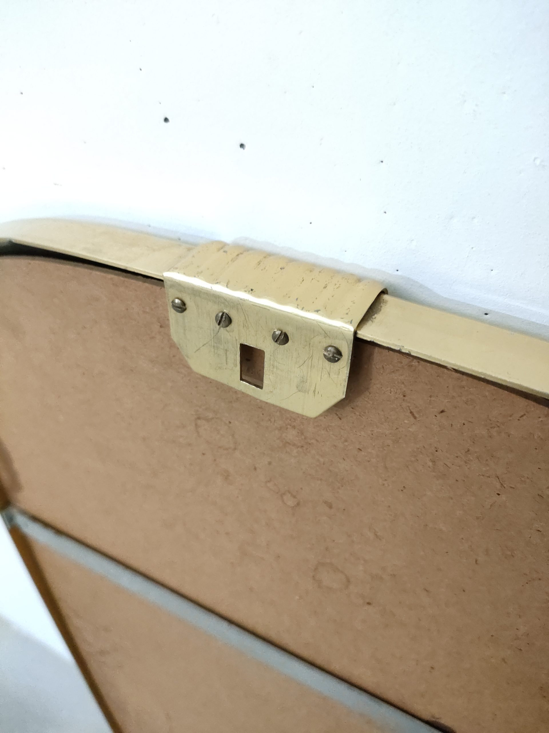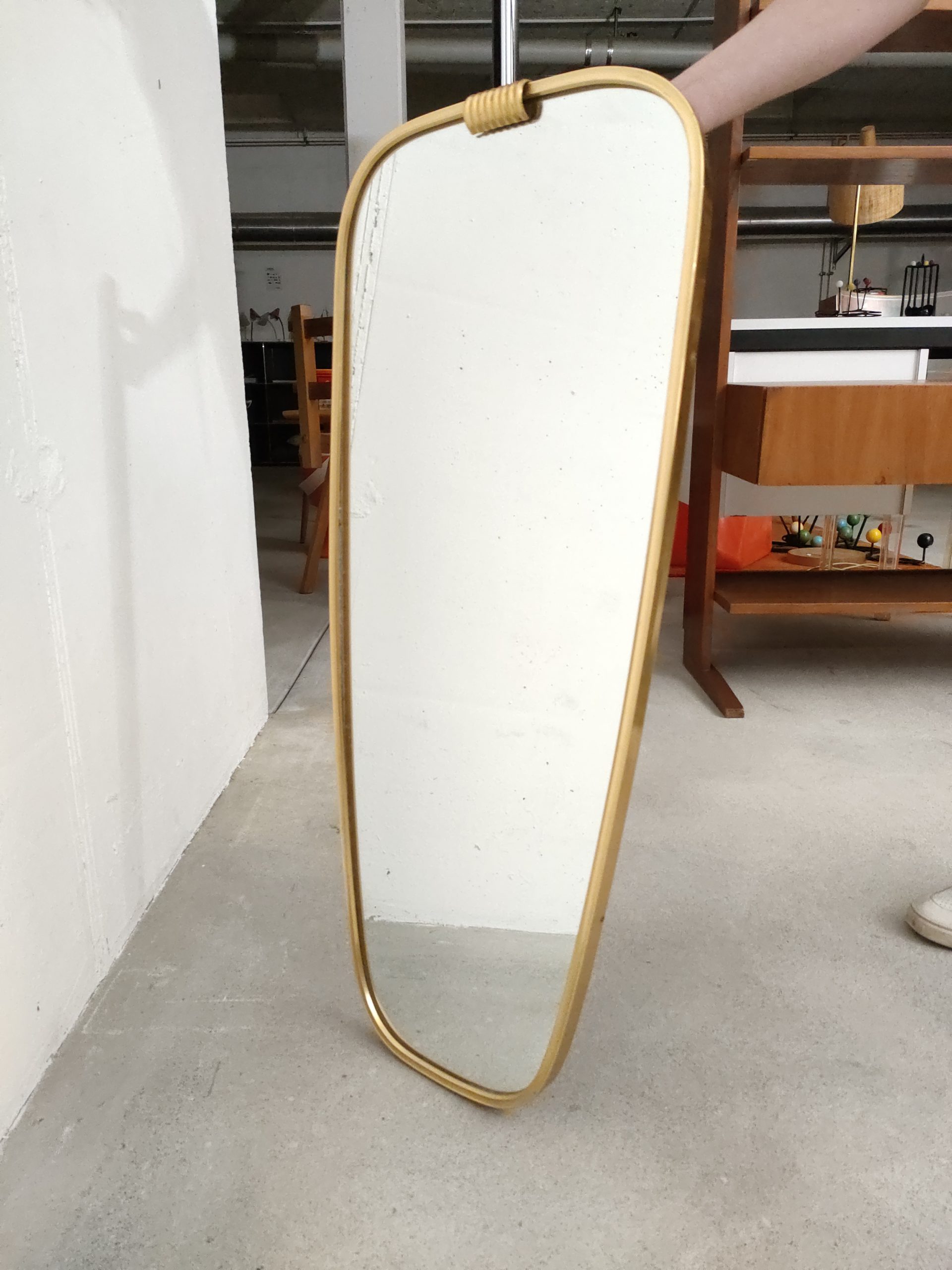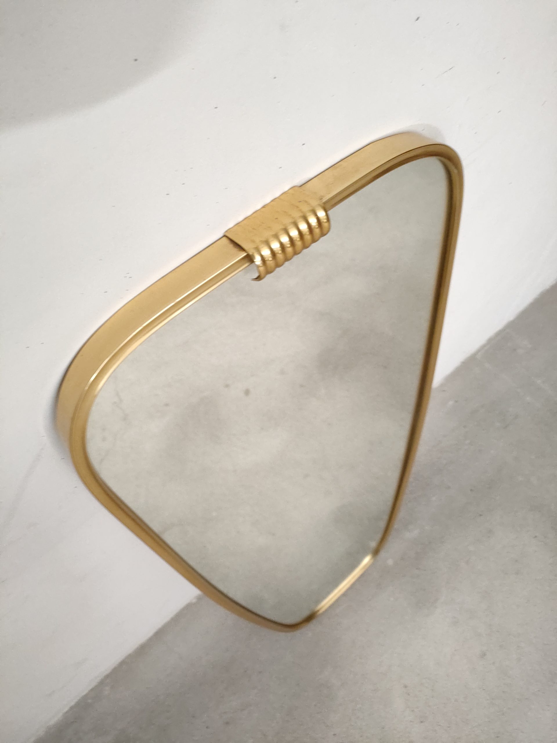 Produit venduÉlégant miroir vintage avec structure en métal doré. Doté d’une accroche au dos pour l’accrocher au mur. Largeur du miroir en haut: 34 cm, en bas : 20 cm.