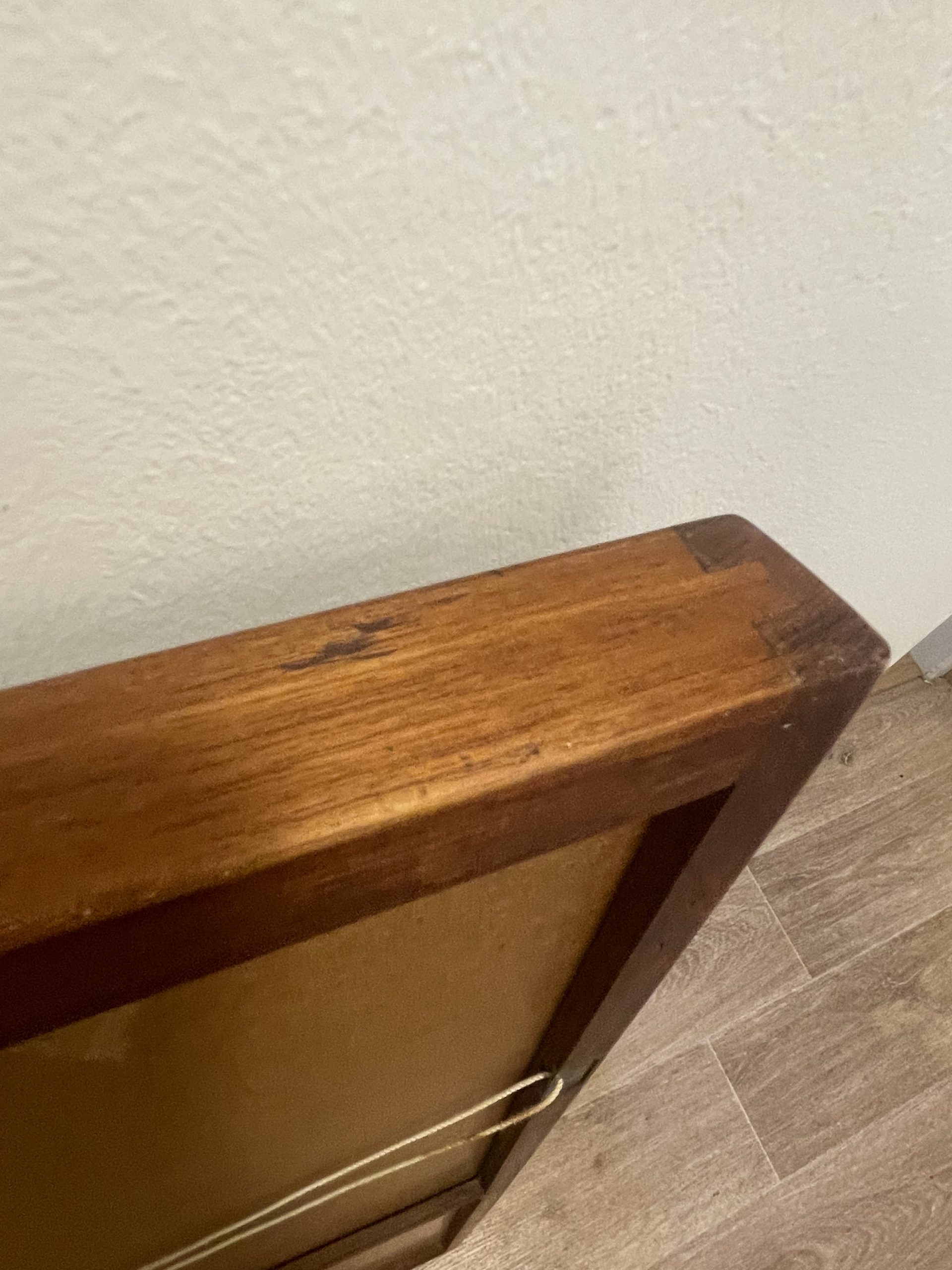 En bon état, le miroir a cependant quelques légères marques d’usage, l’un des cotés semble également avoir été recollé et le bois est légèrement décalé (voir photos)