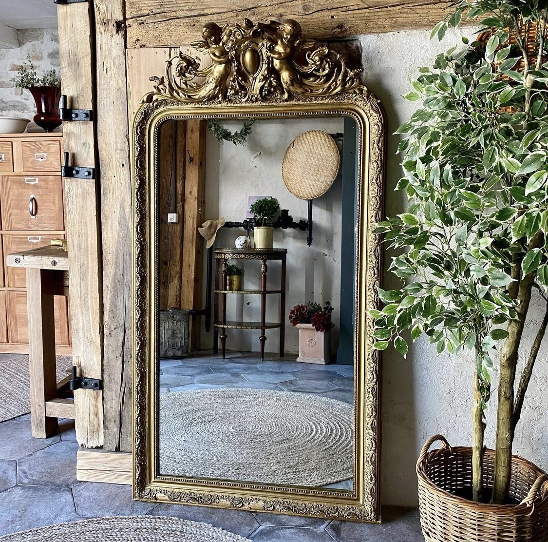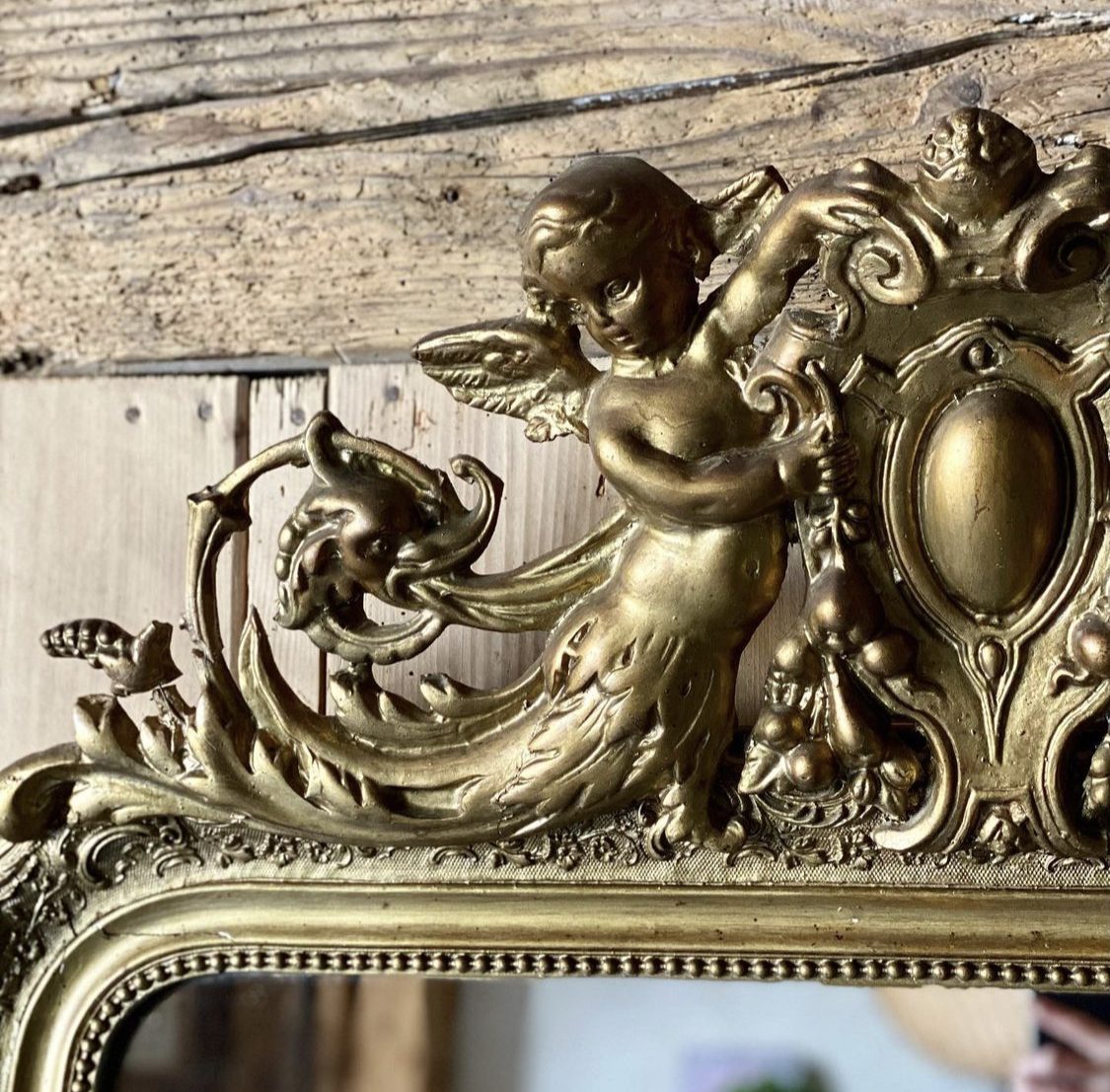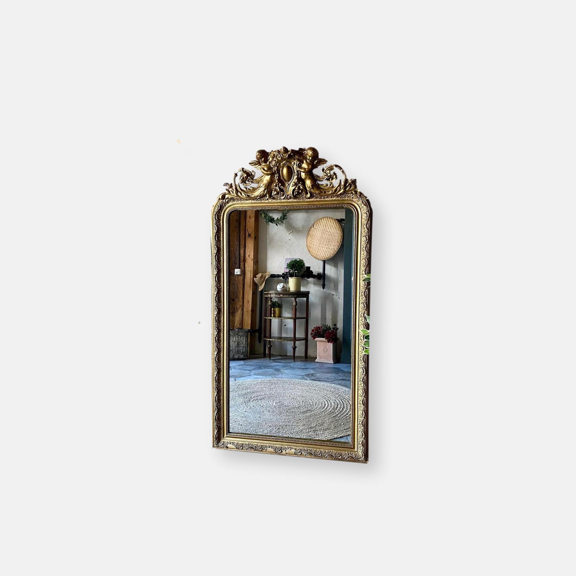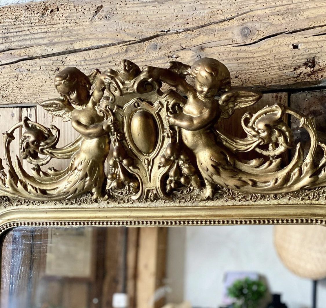 Produit venduMiroir ancien surmonté d’un fronton représentant deux angelots, glace au mercure, quelques traces de son grand âge mais charme indéniable!✨