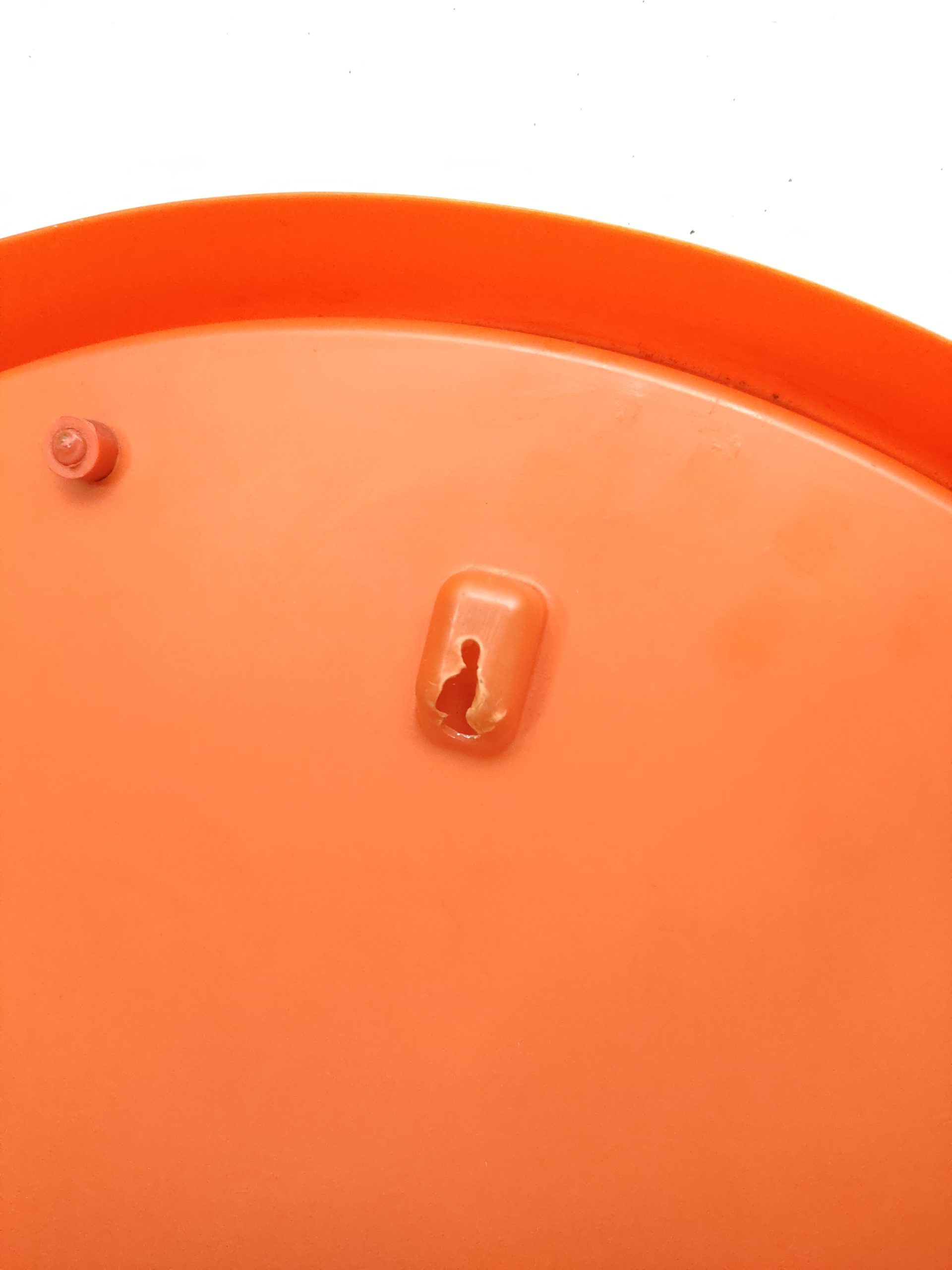 Produit venduGrand miroir rond de couleur orange avec structure en plastique avec de légères traces et une décoloration en dessous (peu visible).