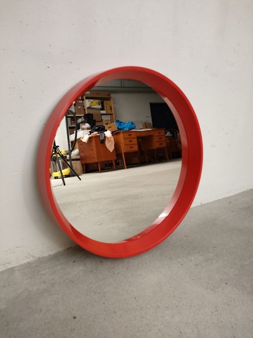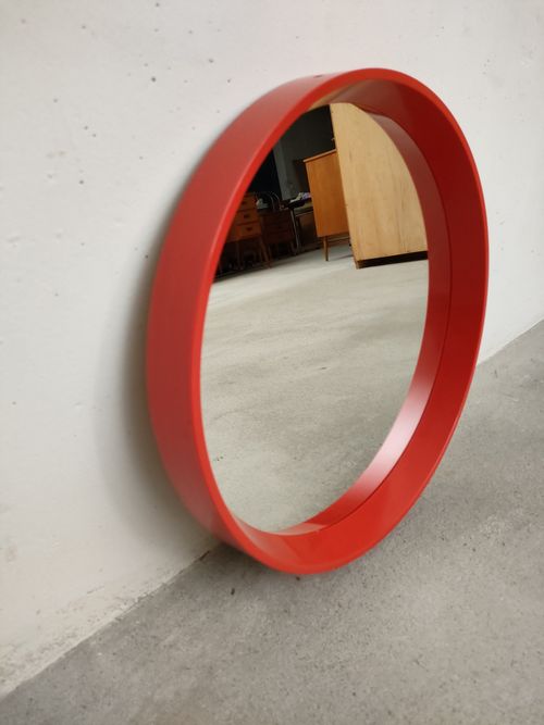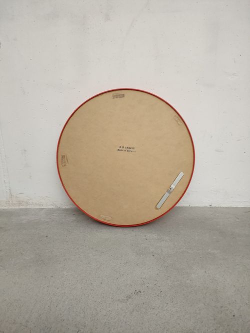 Produit venduMiroir vintage danois et rond de couleur rouge avec inscription du fabricant au dos : D.M.J Spejle – Made in Denmark.