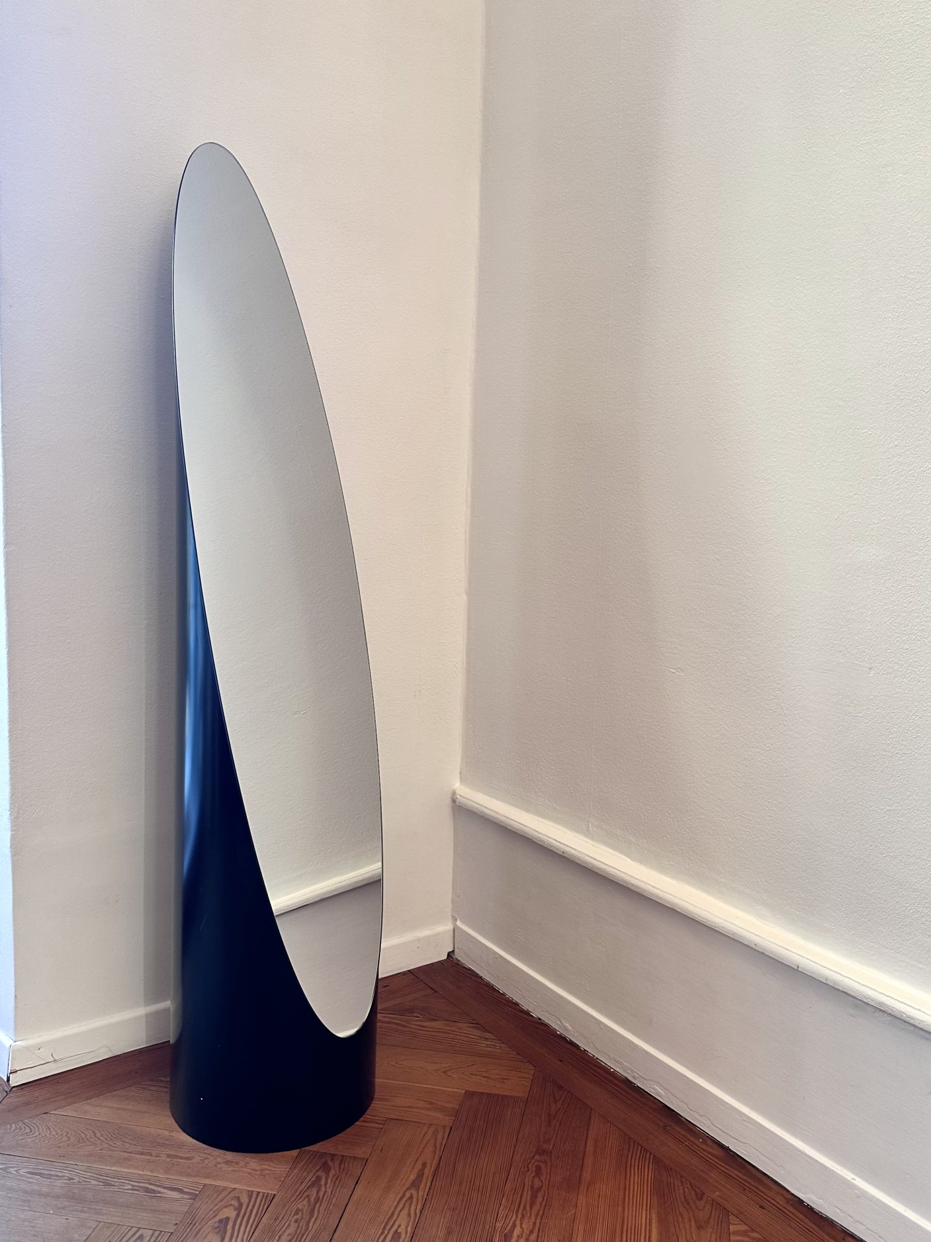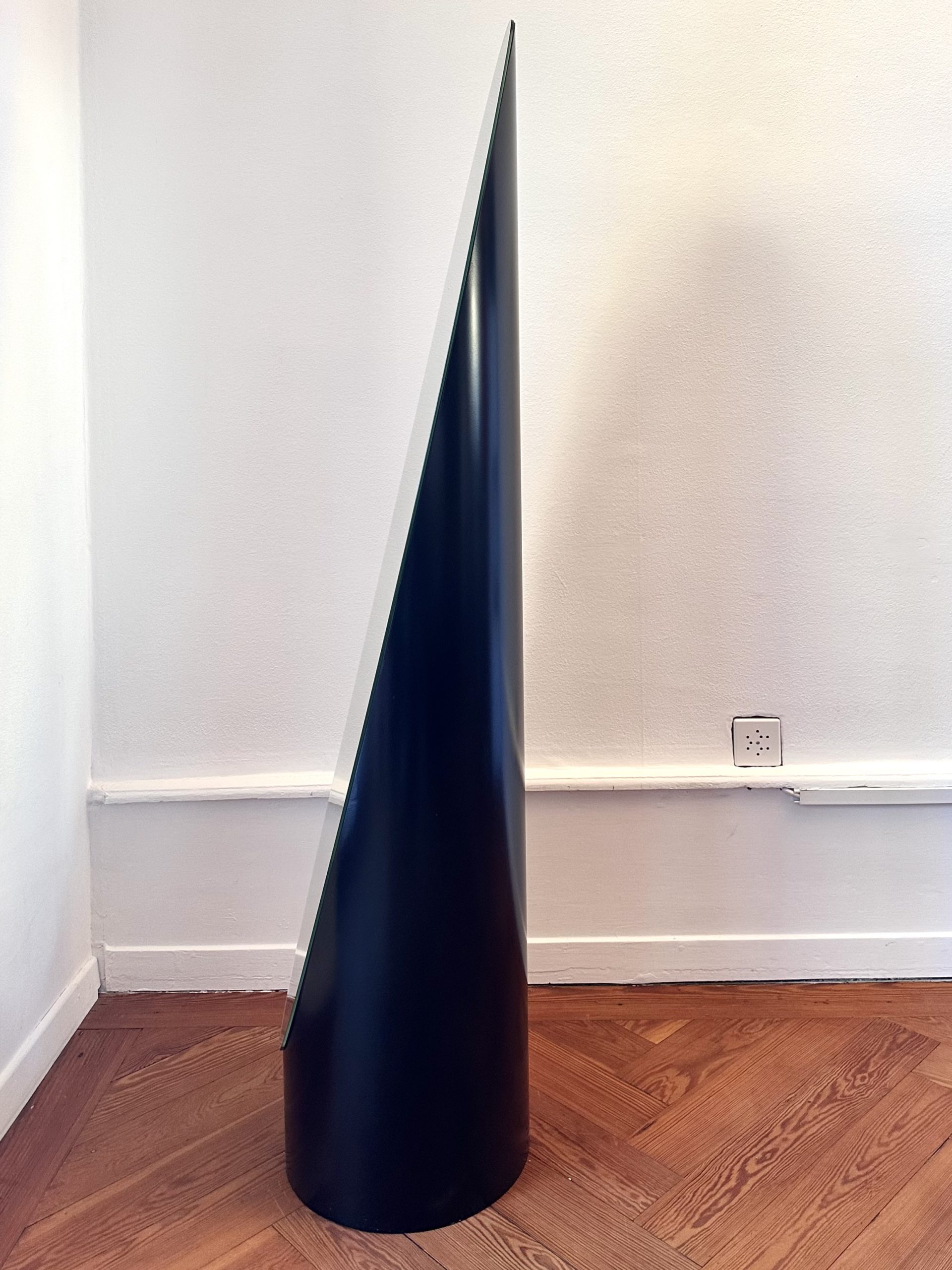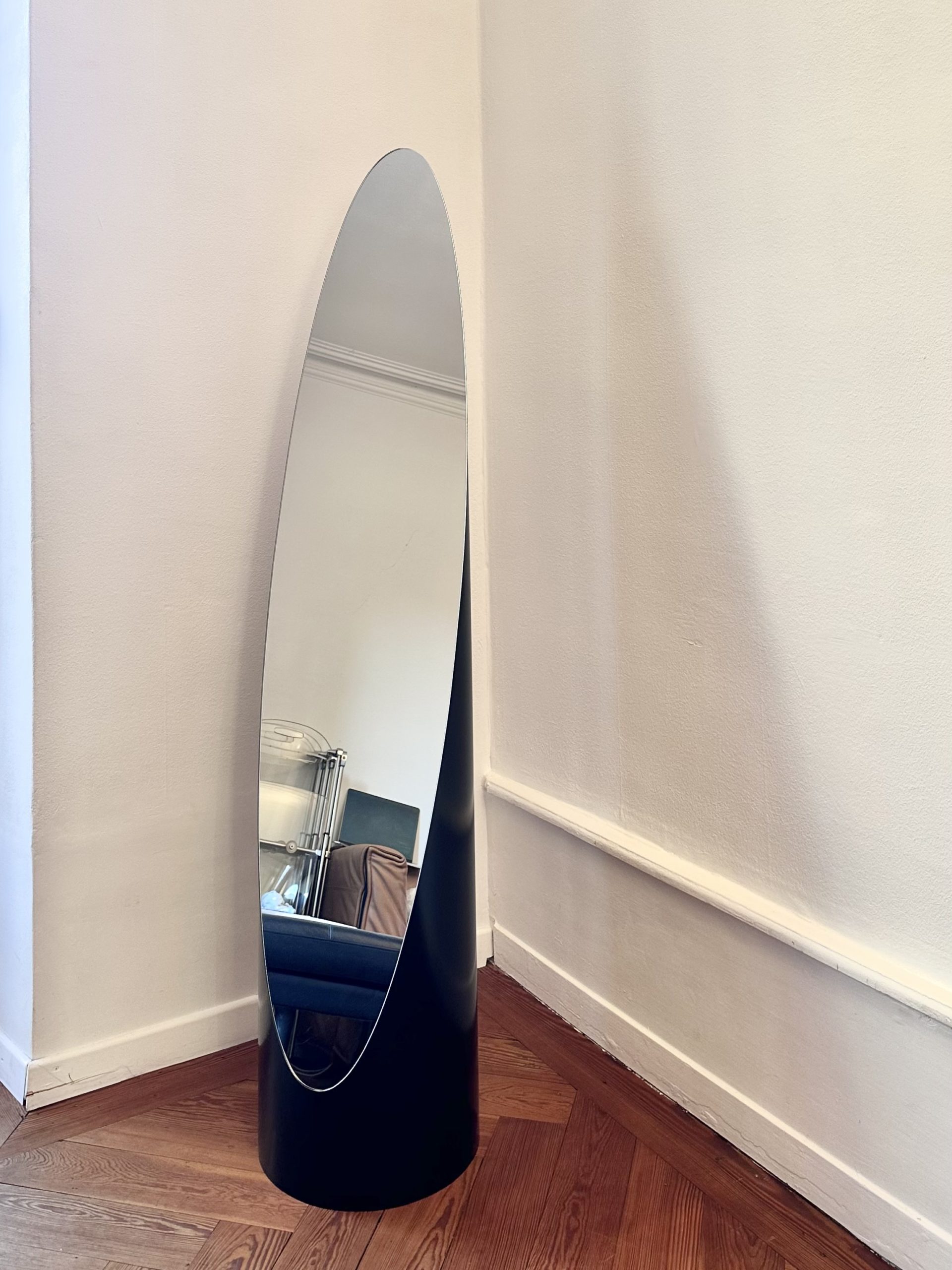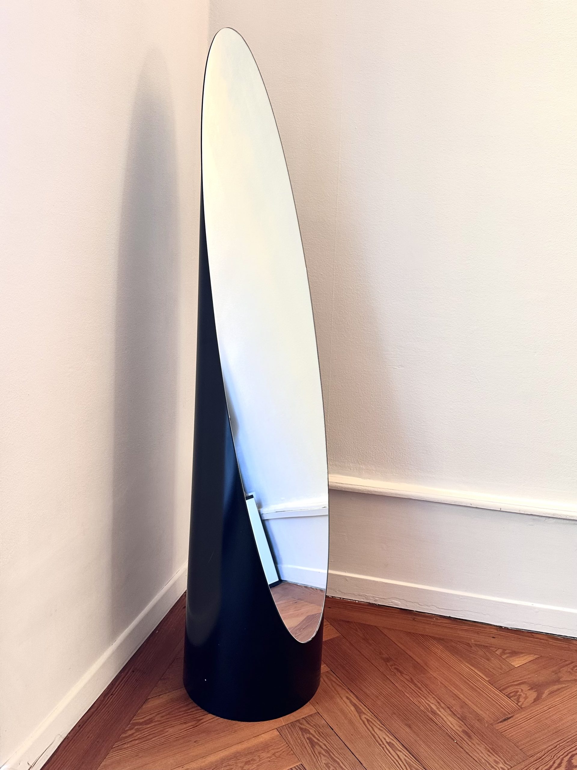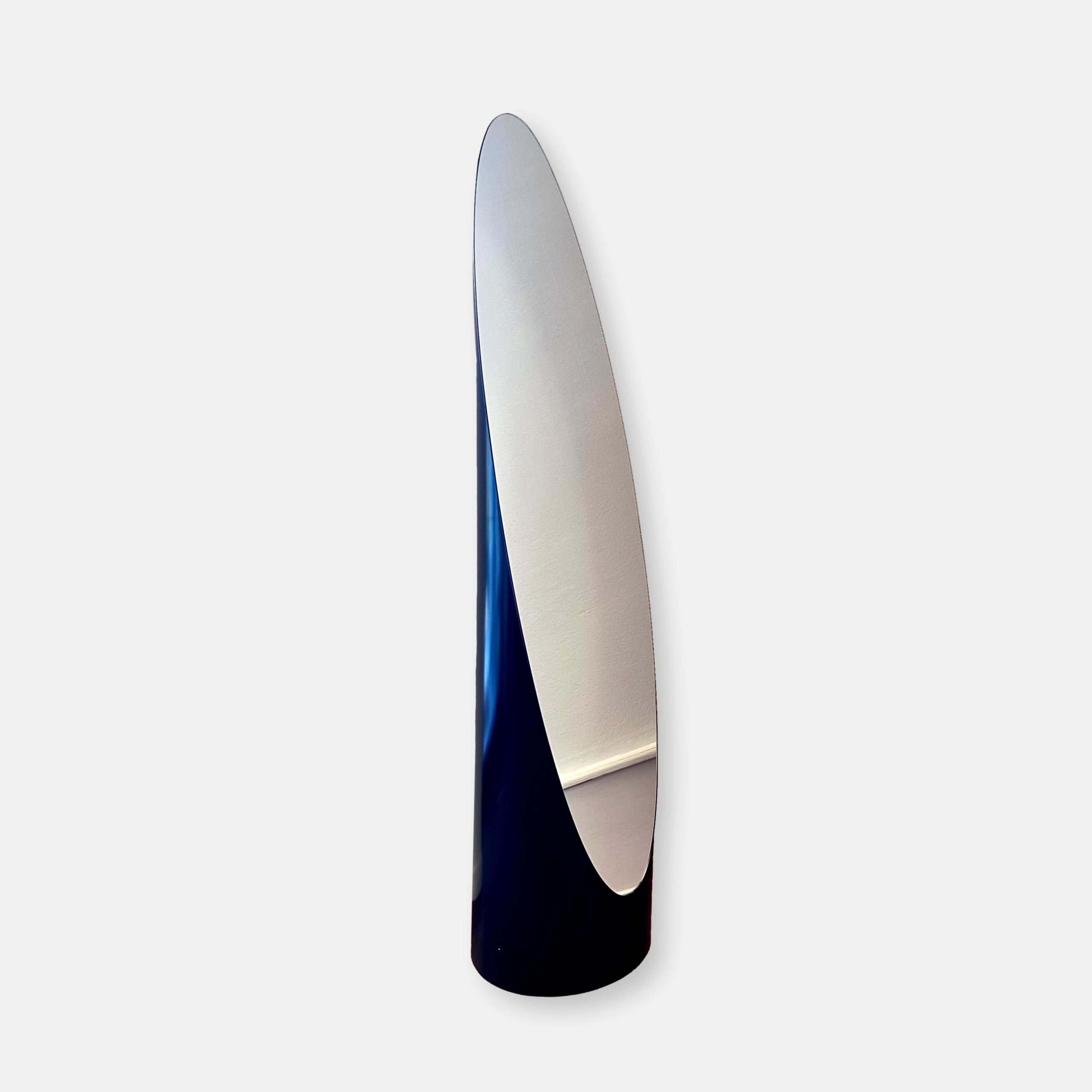 Pièce emblématique du design français des années 70-80, à la frontière entre objet fonctionnel et sculpture. Silhouette totem, présence forte dans l’espace, typologie iconique du miroir lipstick. Un objet qui structure immédiatement un intérieur, autant par sa forme que par sa verticalité.