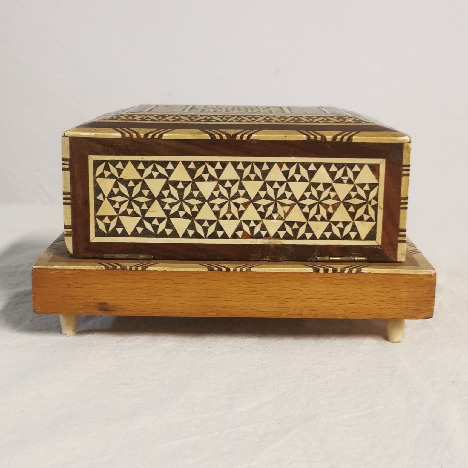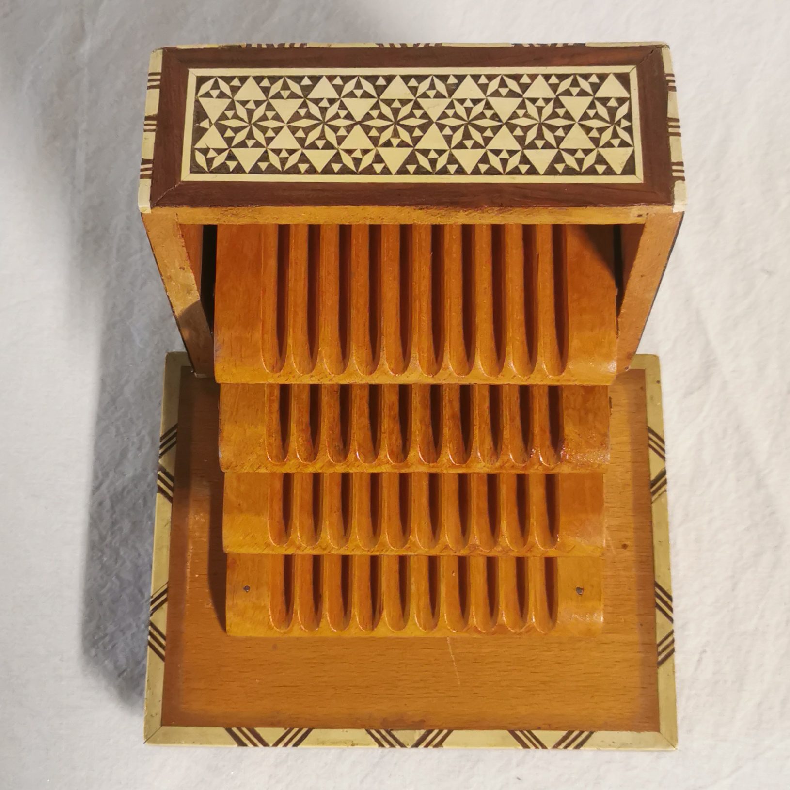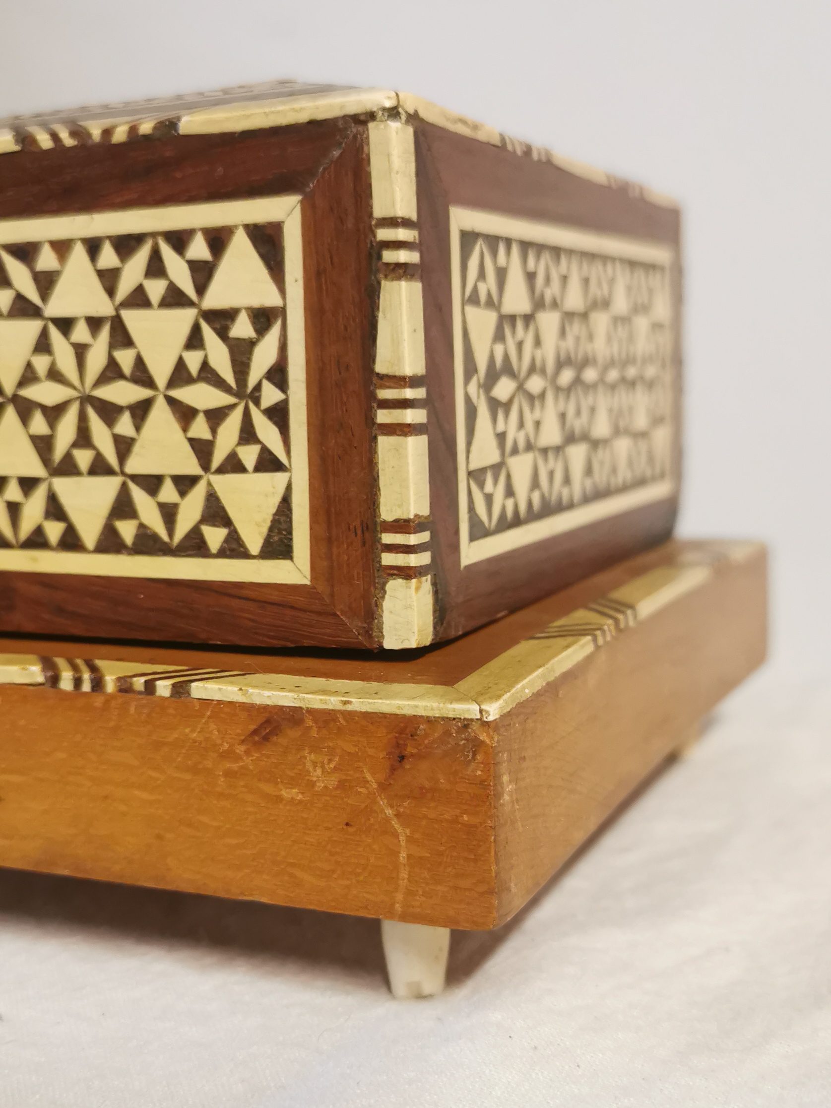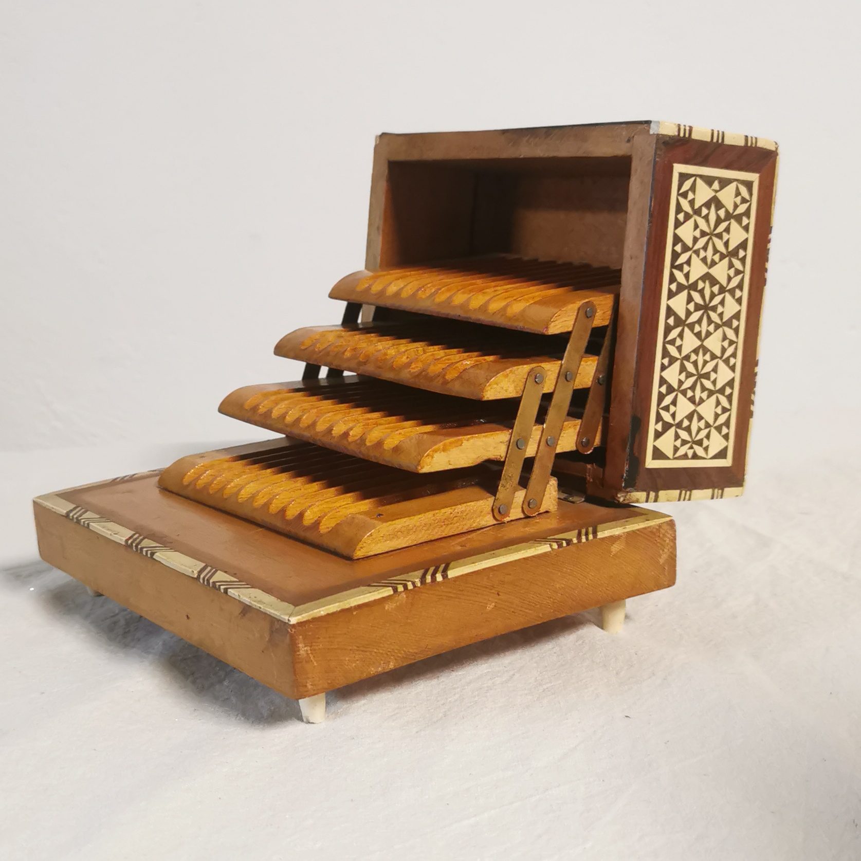 Objet étonnant et très beau travail de marqueterie.