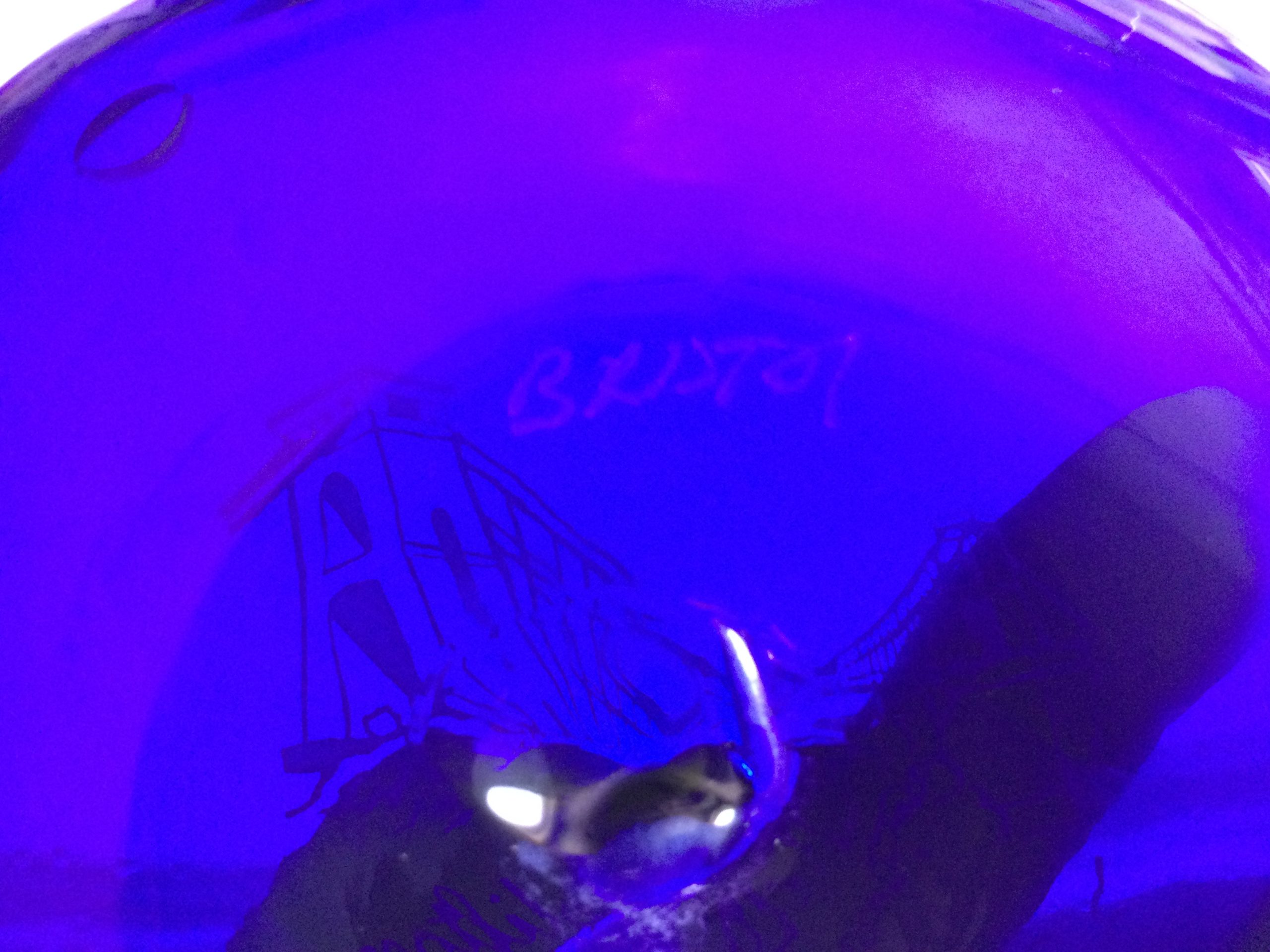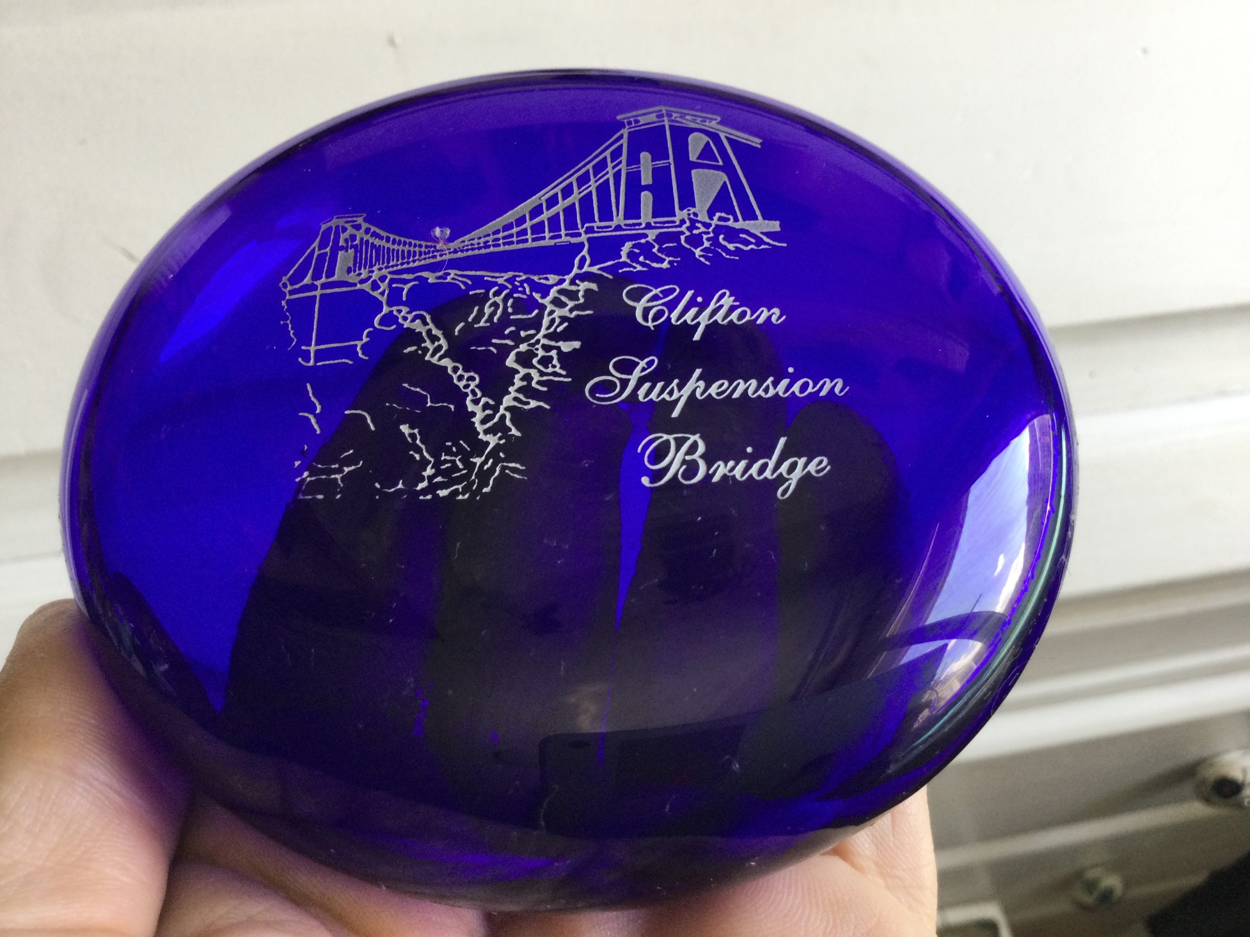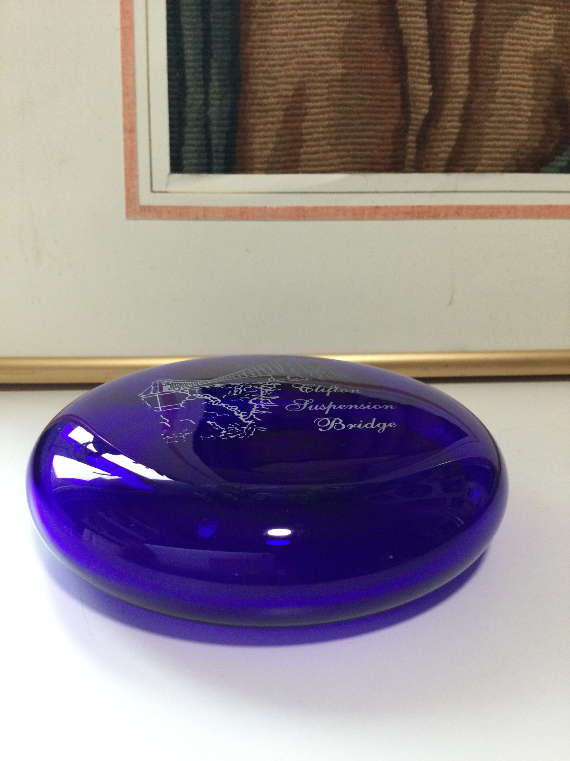 Presse-papier souvenir en verre bleu outremer avec représentation du pont suspendu de Clifton qui est un quartier de la ville de Bristol au sud de l’Angleterre. En bon état sans fêlure ni rayures, gravé le nom de Bristol au dos. Bel objet de vitrine ou pour collection.