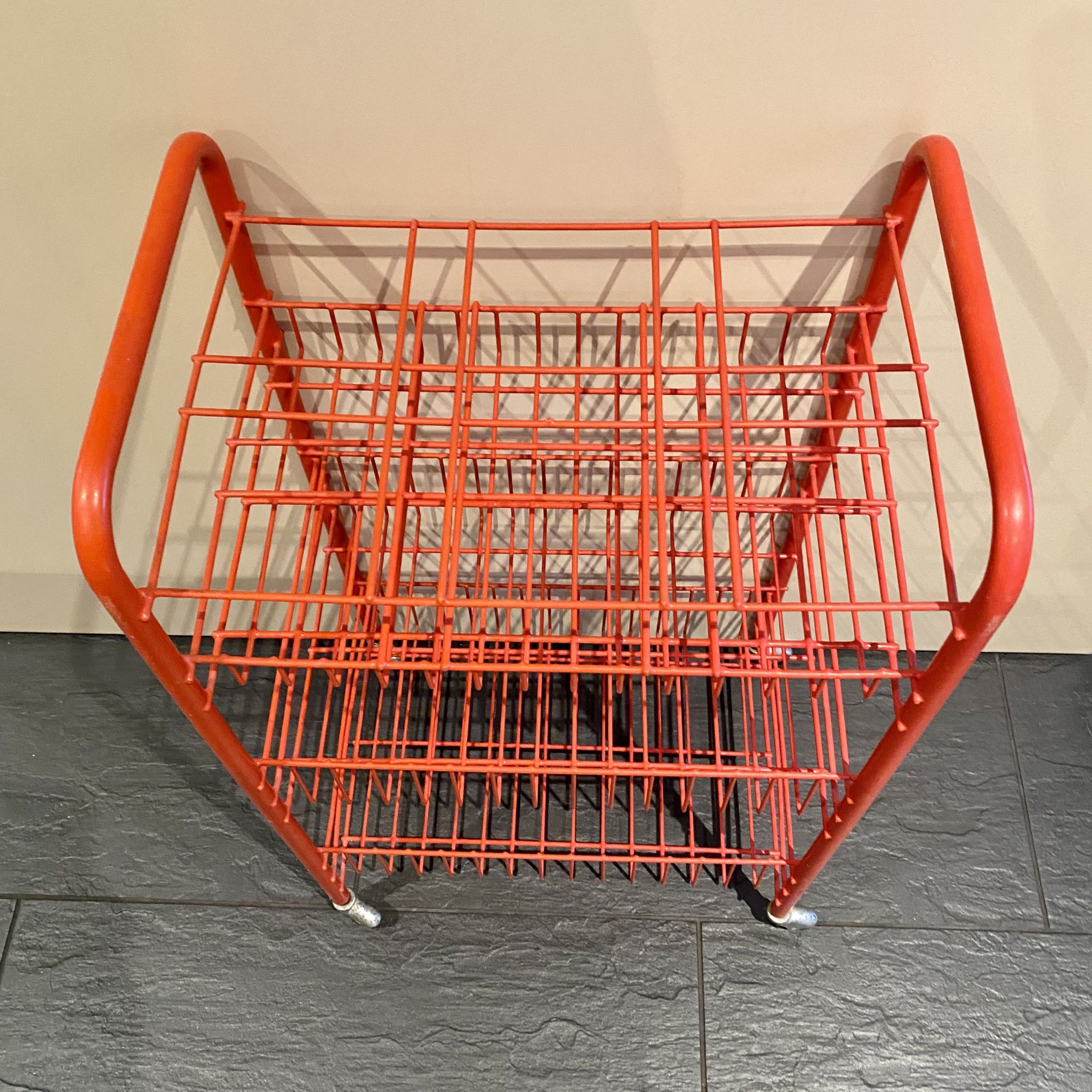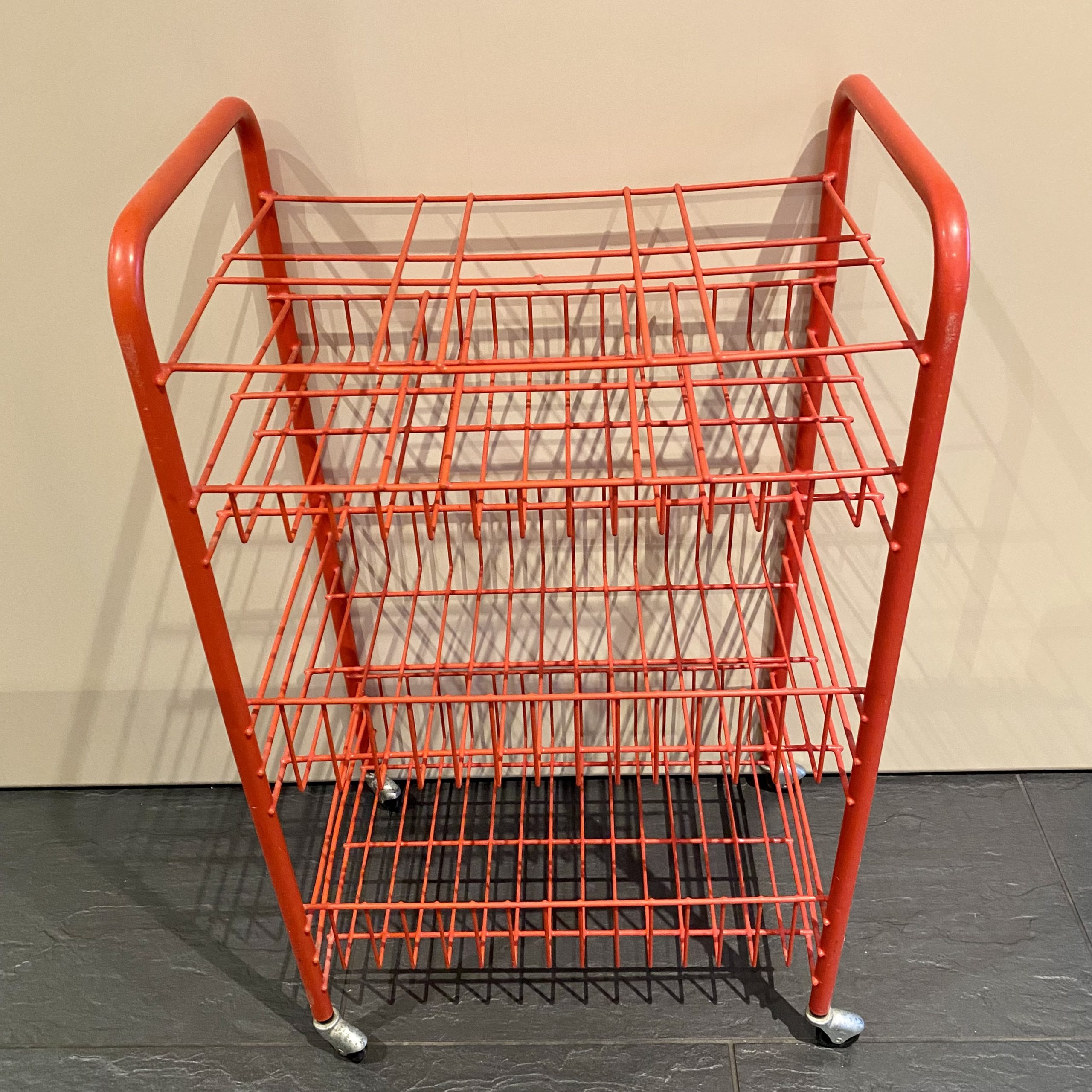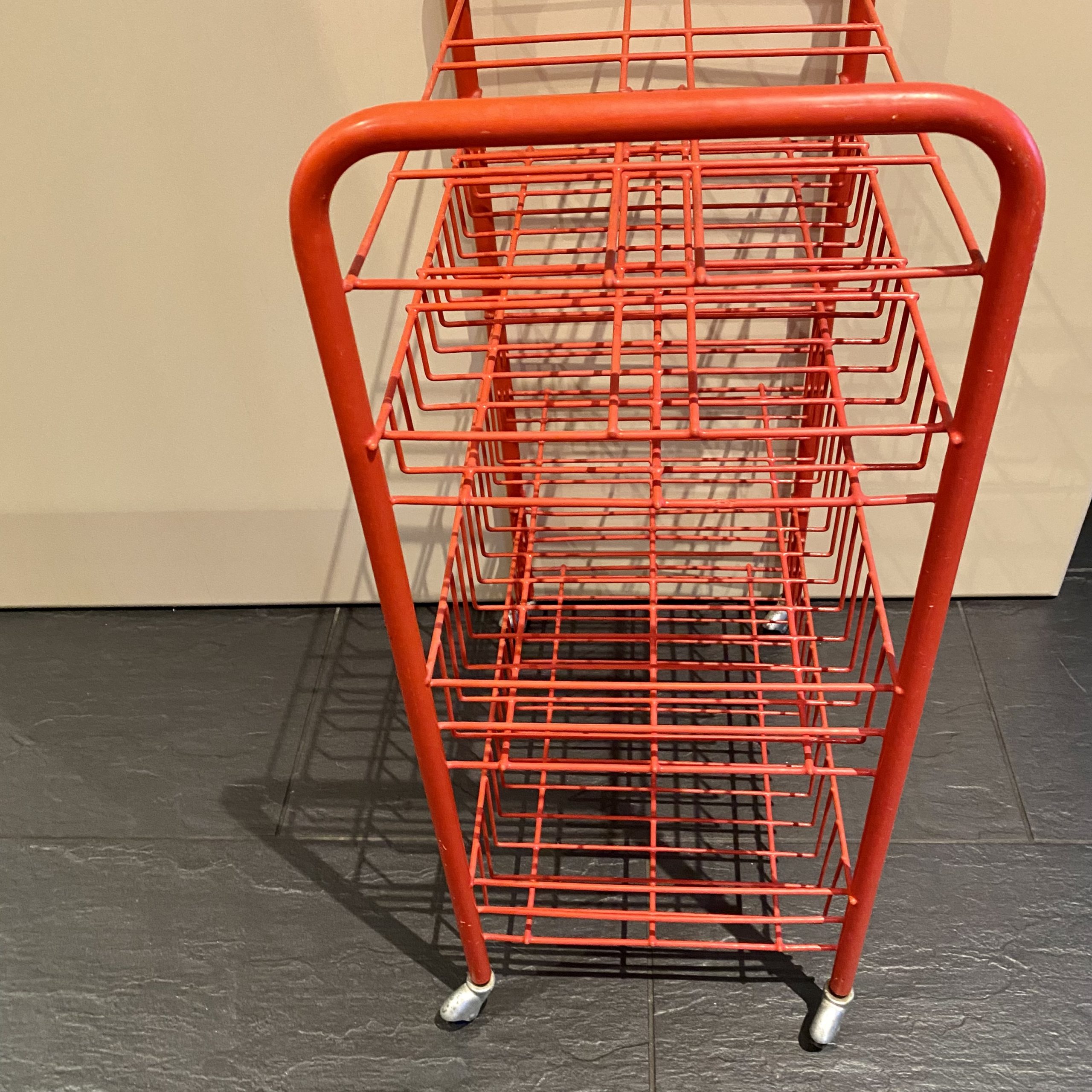 Petit chariot à roulettes rouge.