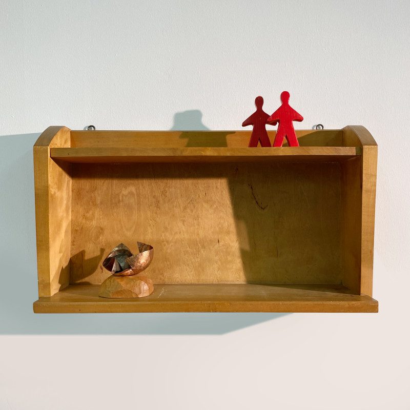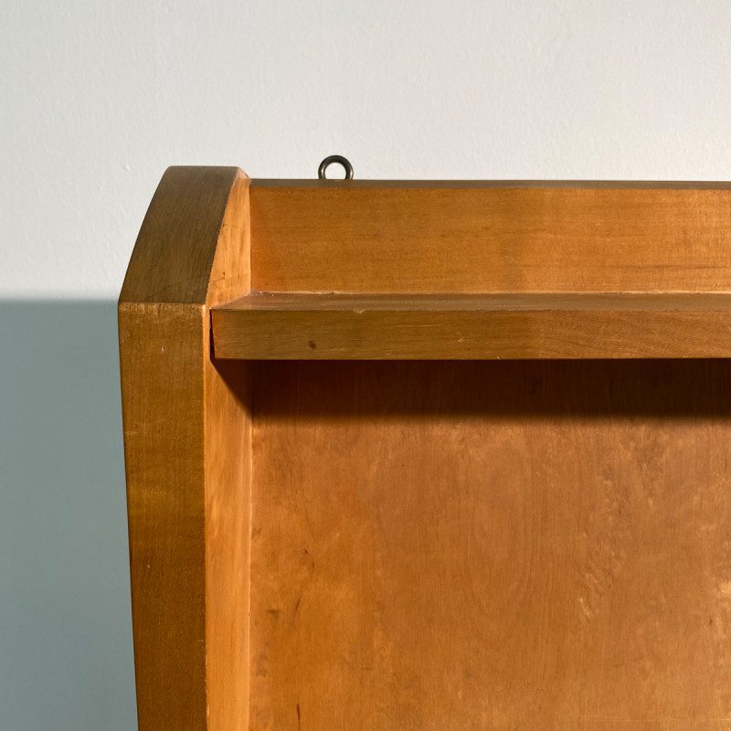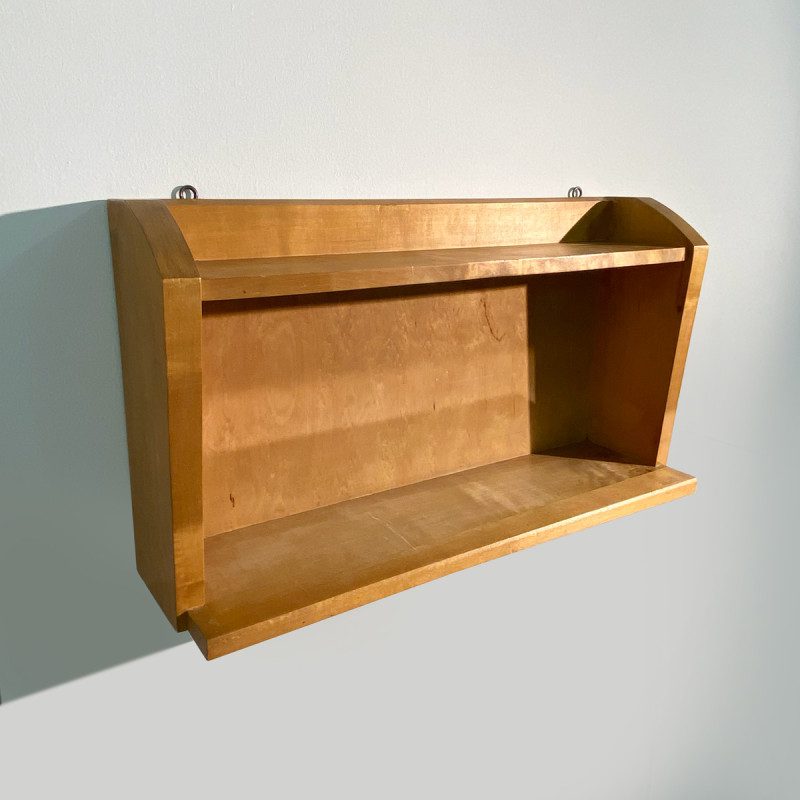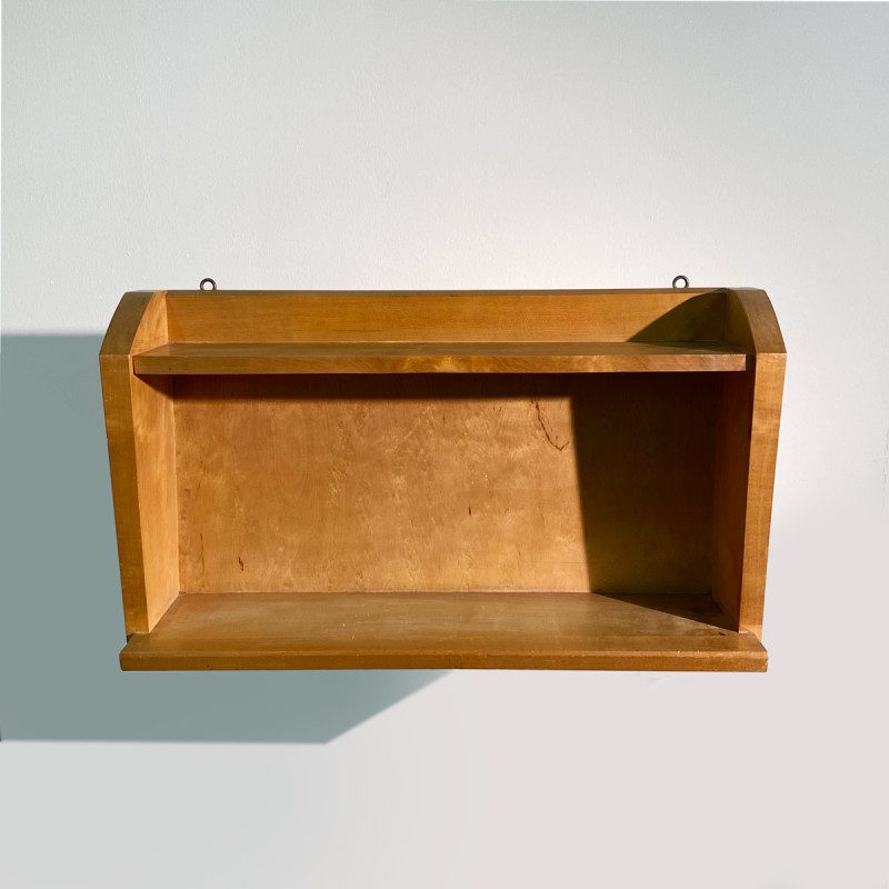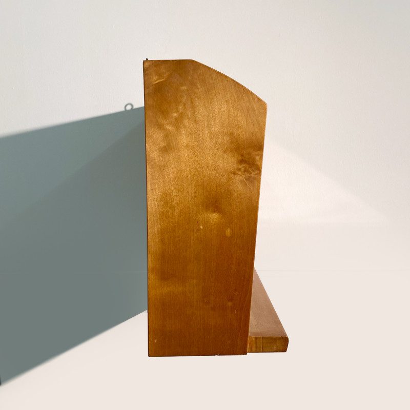 Petite étagère murale de style anthroposophique vintage en bois, elle est en bon état d’usage, quelques petites décolorations à certains endroits dues au temps, elle s’accroche au mur avec deux vis.