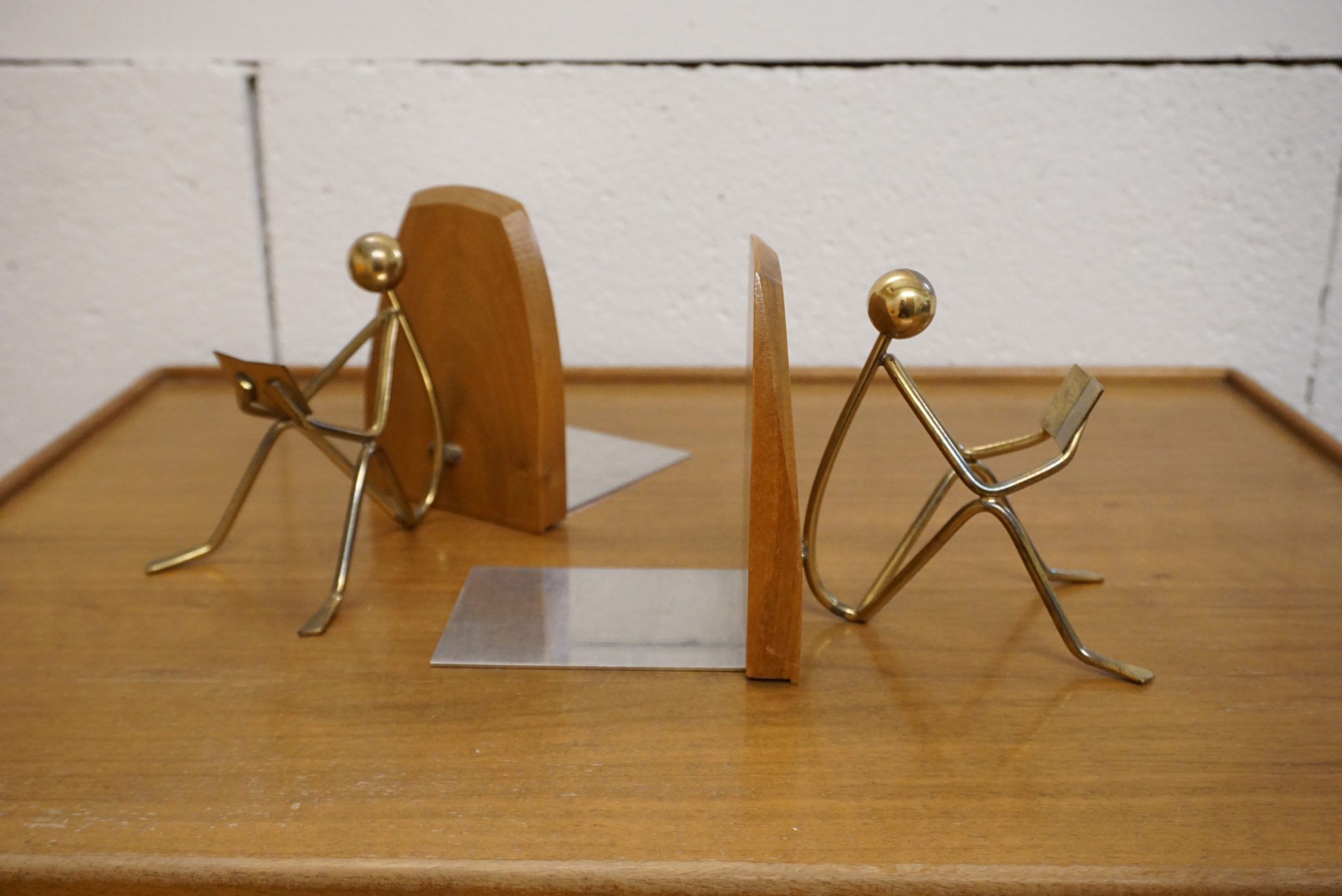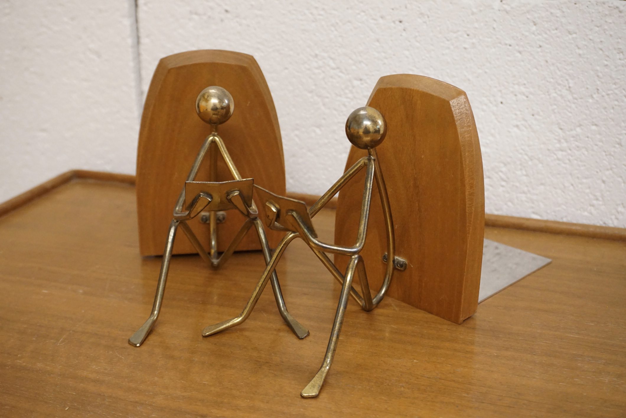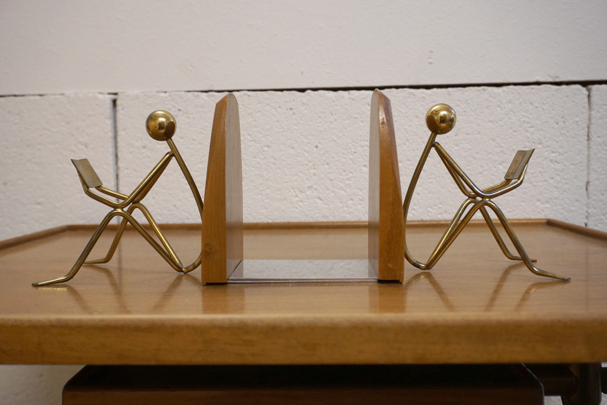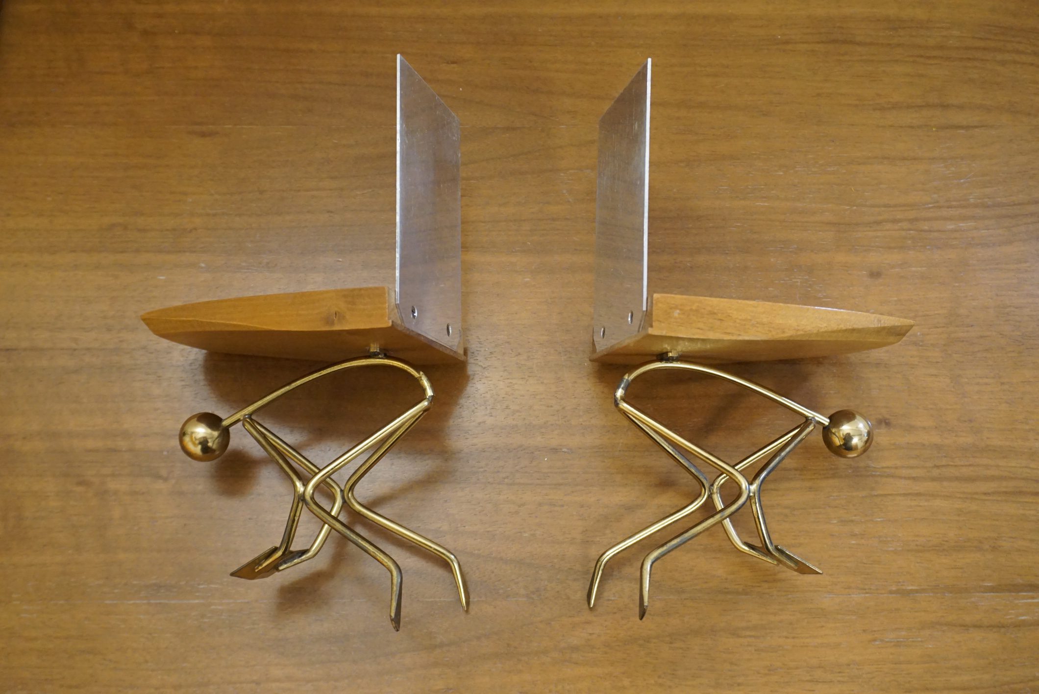 Paire de serre-livres midcentury bois et laiton très original.