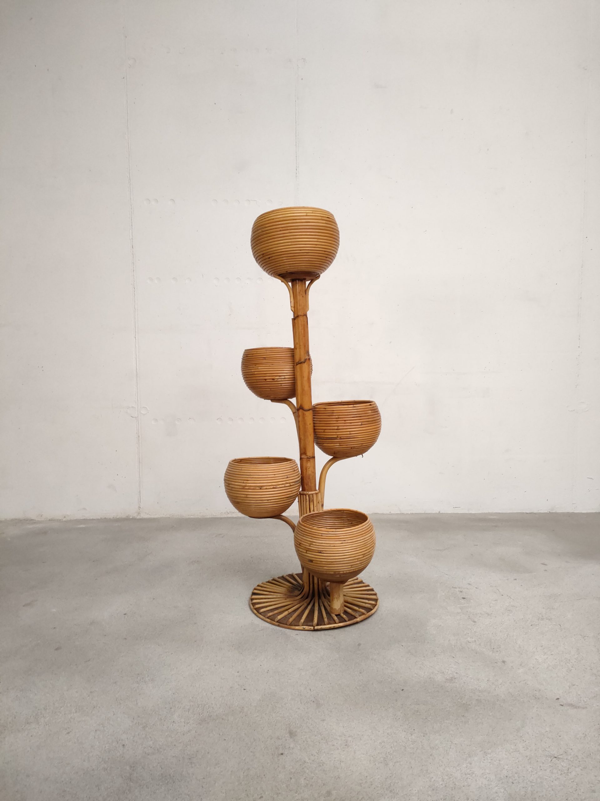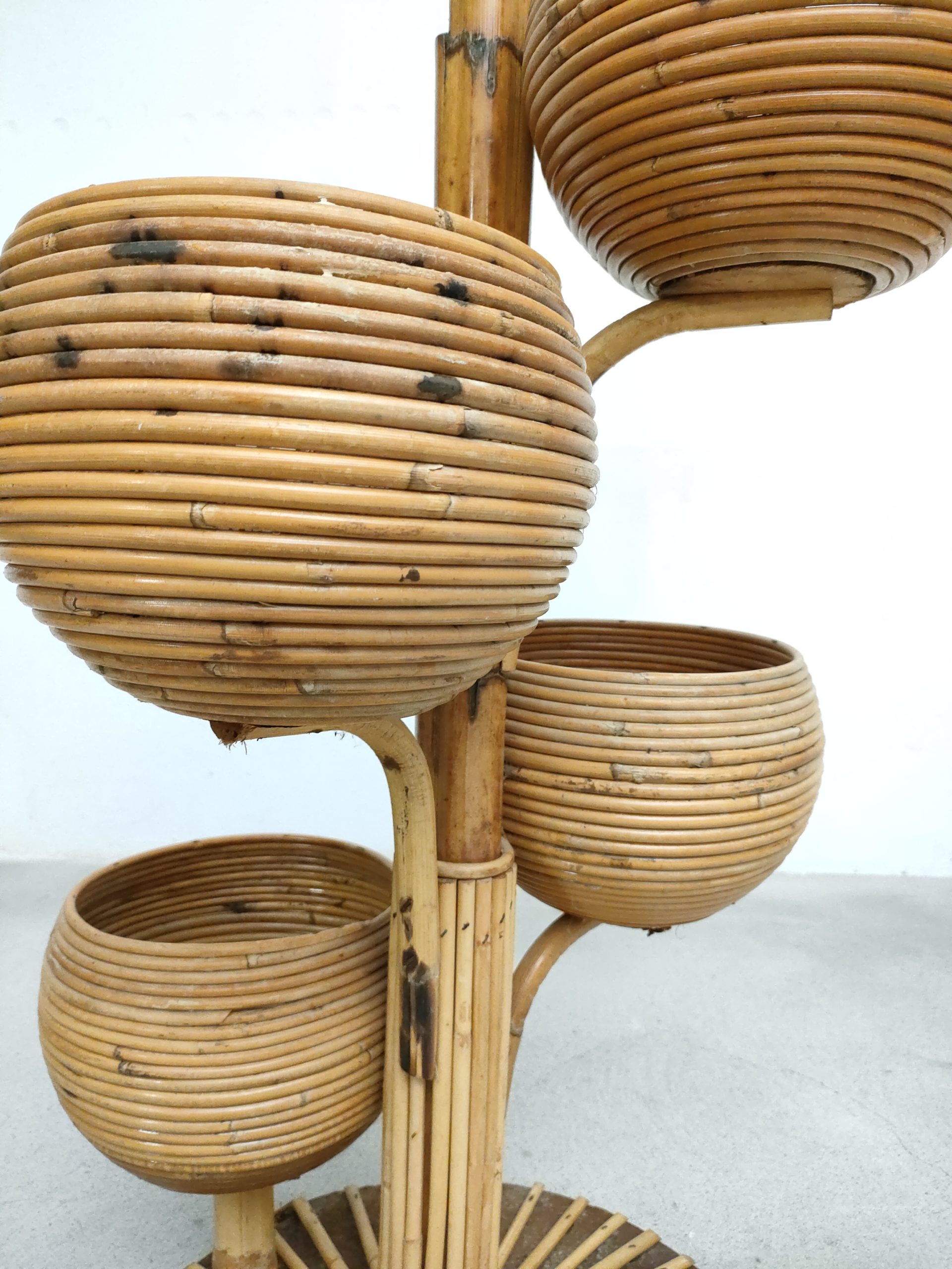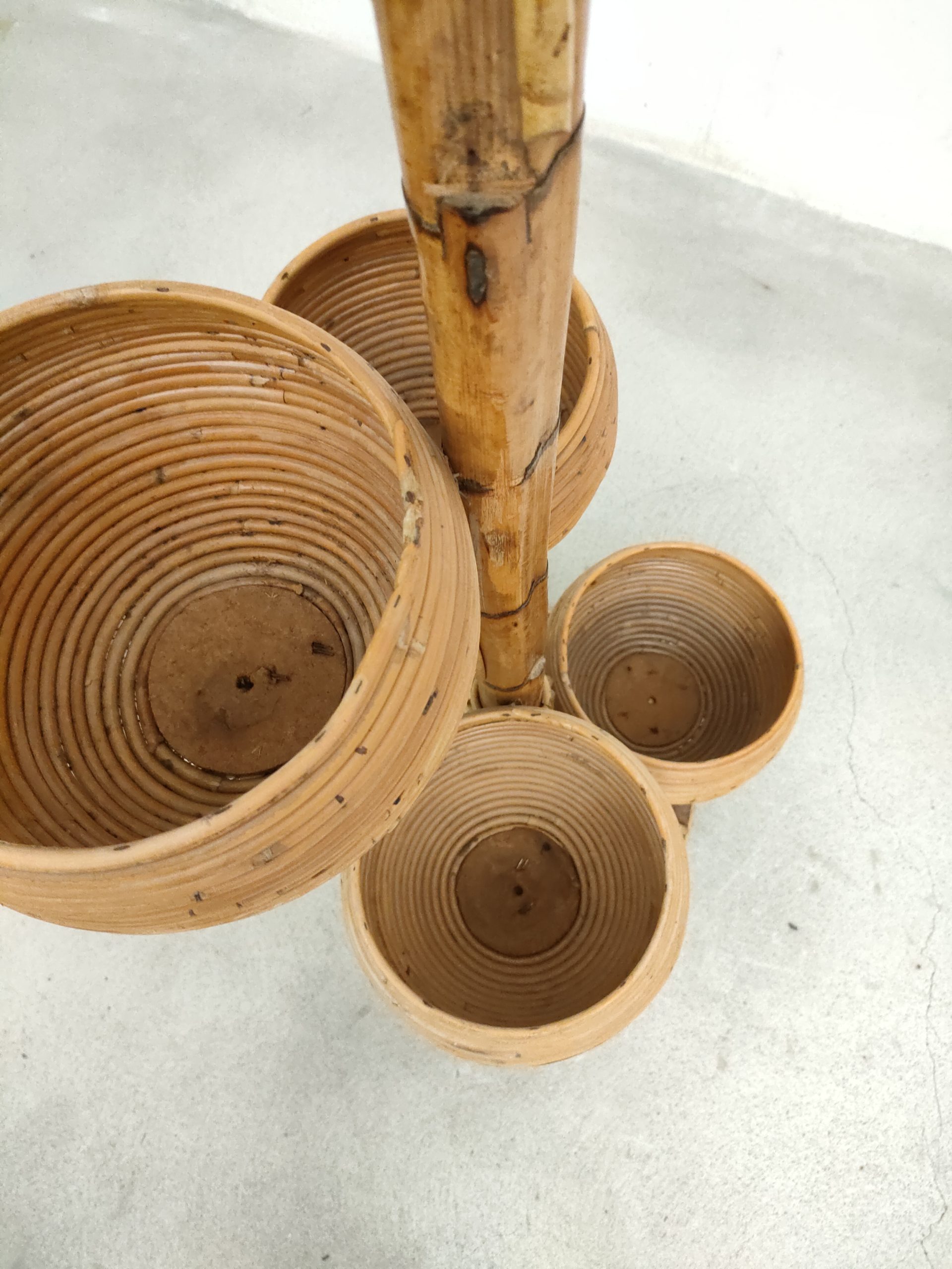Produit venduGrand porte-plantes vintage en bambou et rotin doté de 5 pots (diamètre de l’ouverture: 22 cm). Des traces d’usure et de signes de réparations sont présents. La structure penche d’un coté (voir photos) mais elle est stable et solide et parfaitement fonctionnelle.