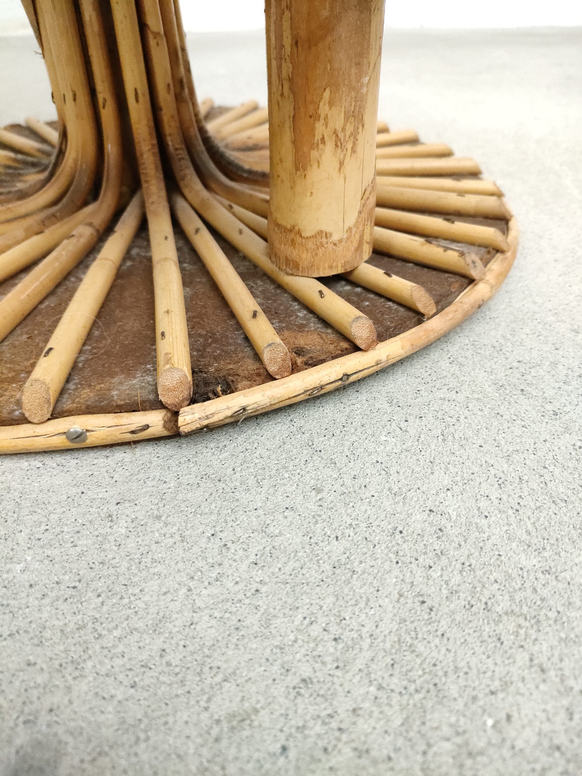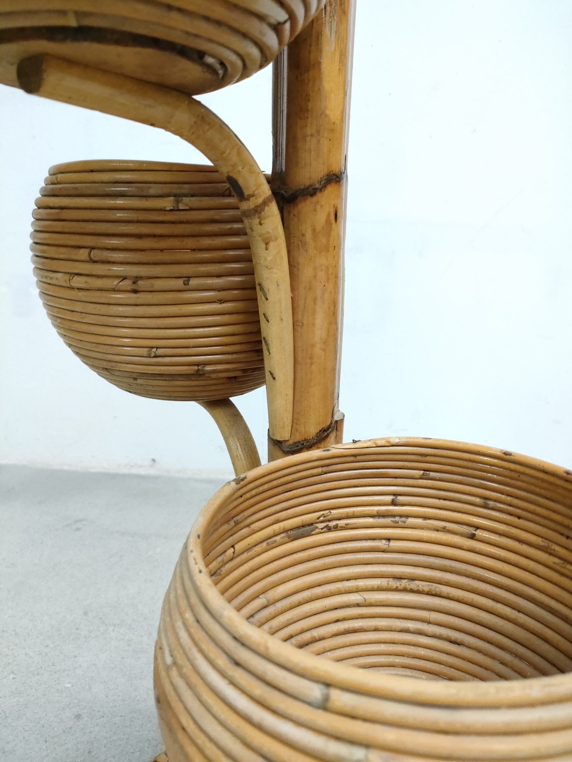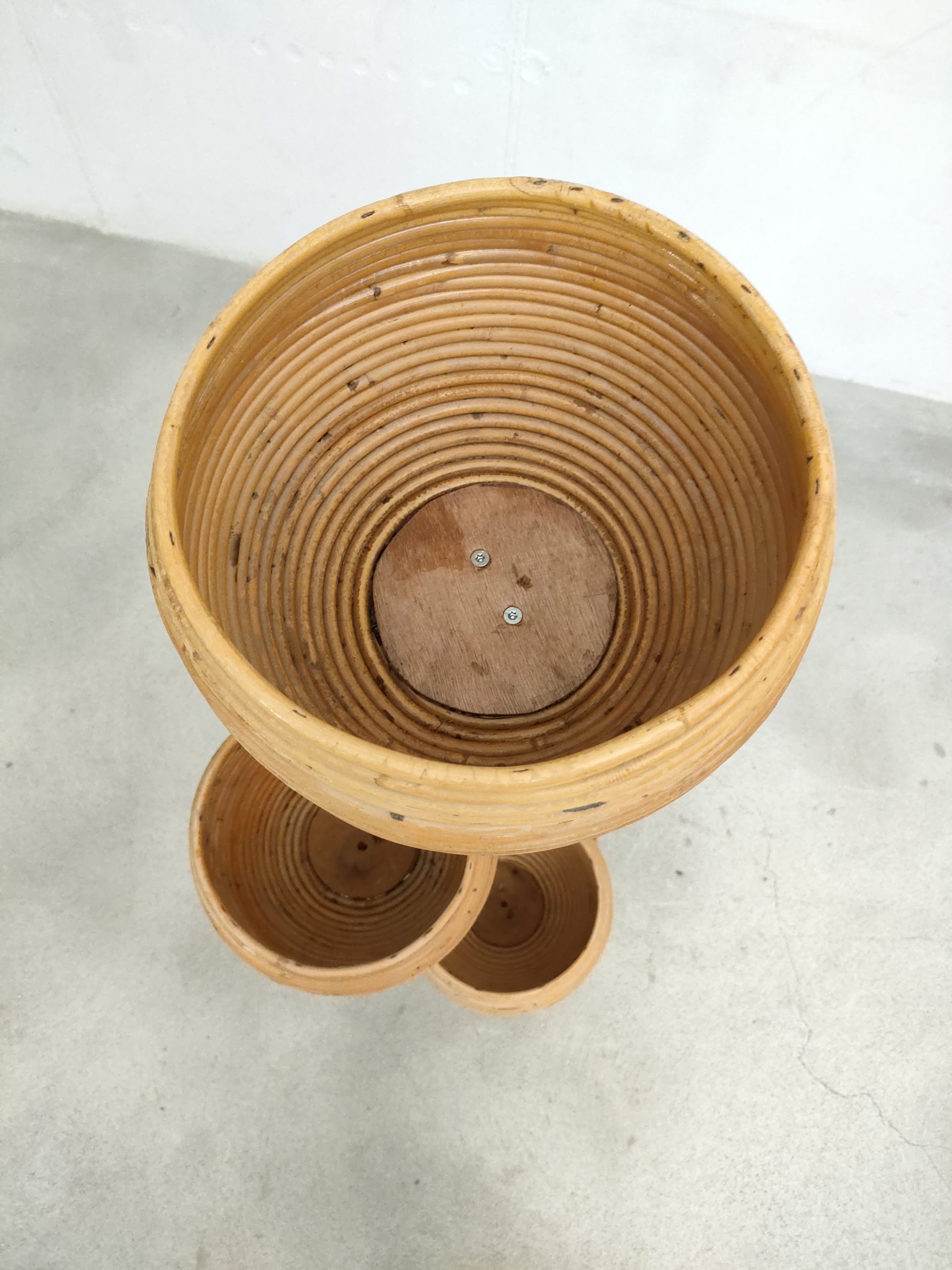 Produit venduGrand porte-plantes vintage en bambou et rotin doté de 5 pots (diamètre de l’ouverture: 22 cm). Des traces d’usure et de signes de réparations sont présents. La structure penche d’un coté (voir photos) mais elle est stable et solide et parfaitement fonctionnelle.
