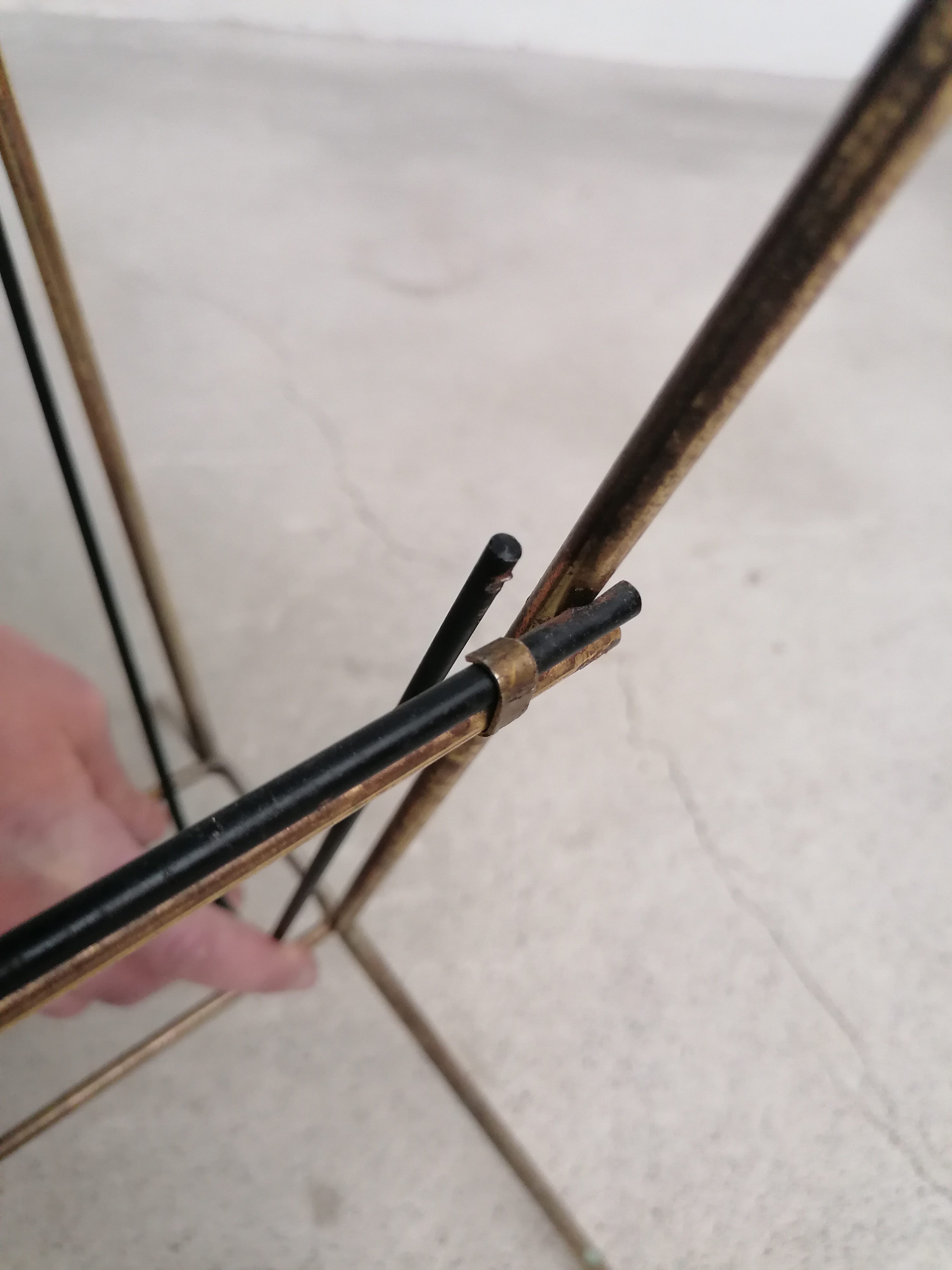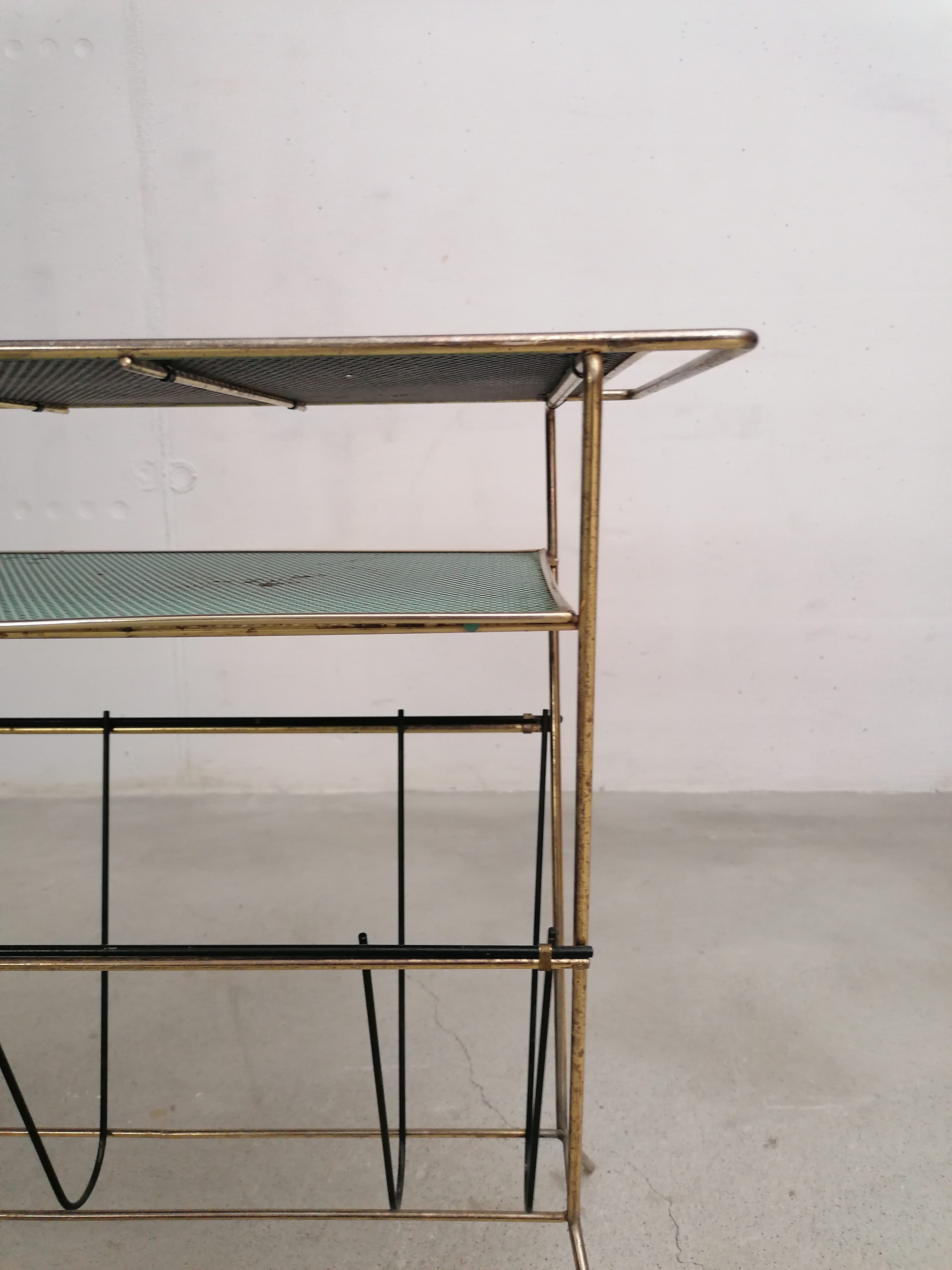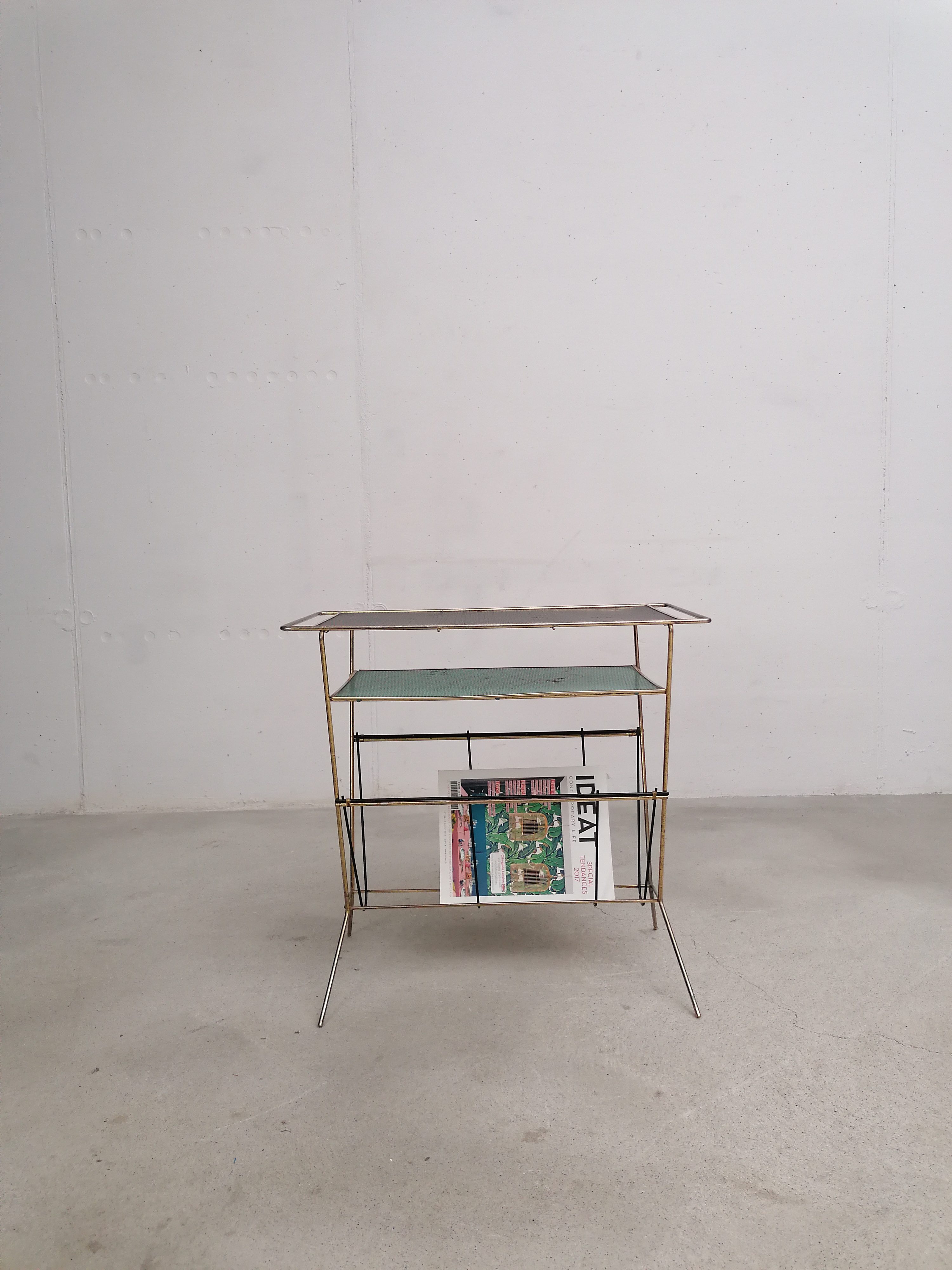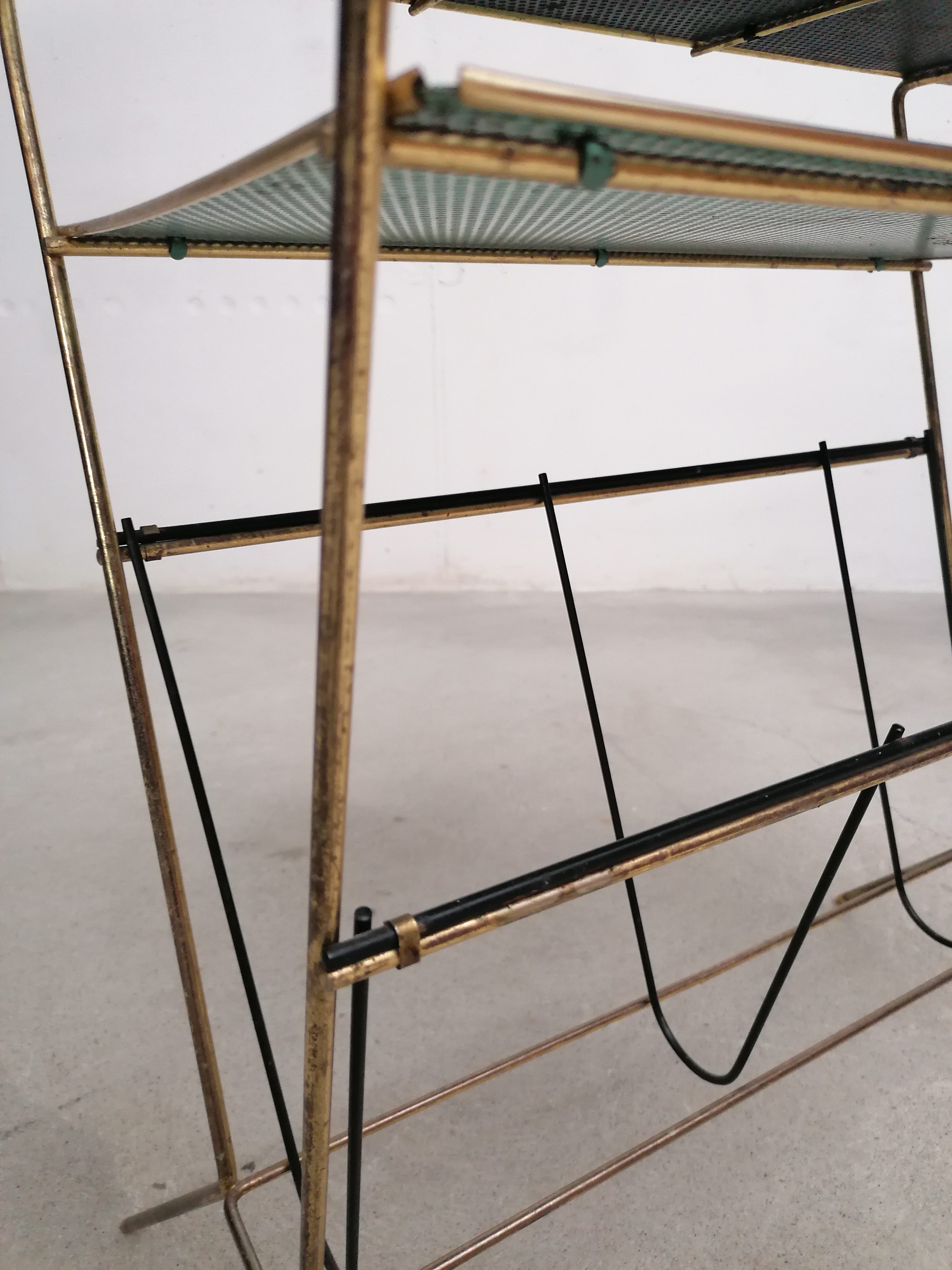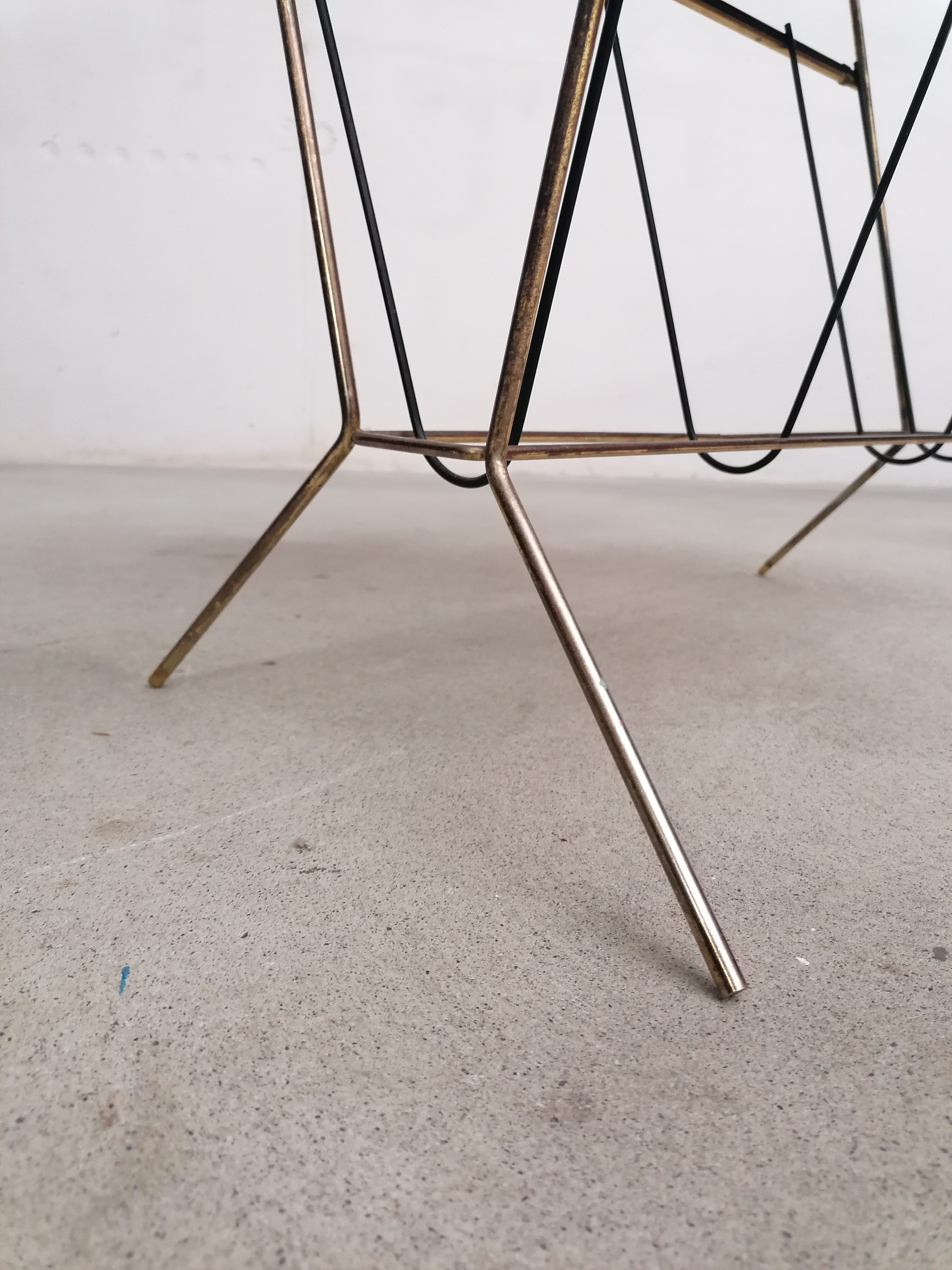 La structure en métal laitonné a perdu sa couleur d’origine. A quelques endroits, la peinture noire et verte est manquante. Une petite tige de l’espace revues est dessoudé. Malgré ces petits défauts, le porte-revues est stable et atypique car c’est rare d’en voir des aussi grands.