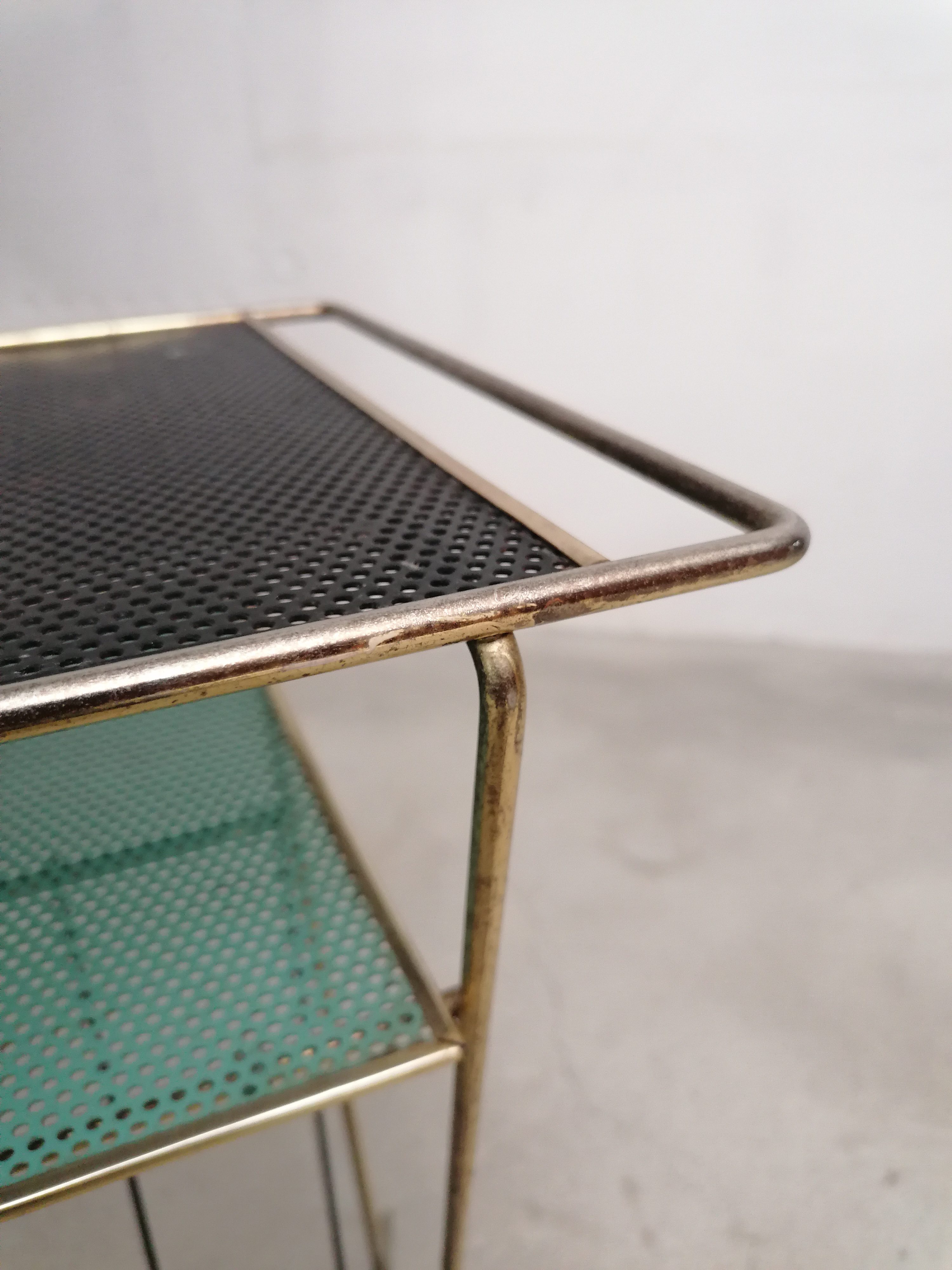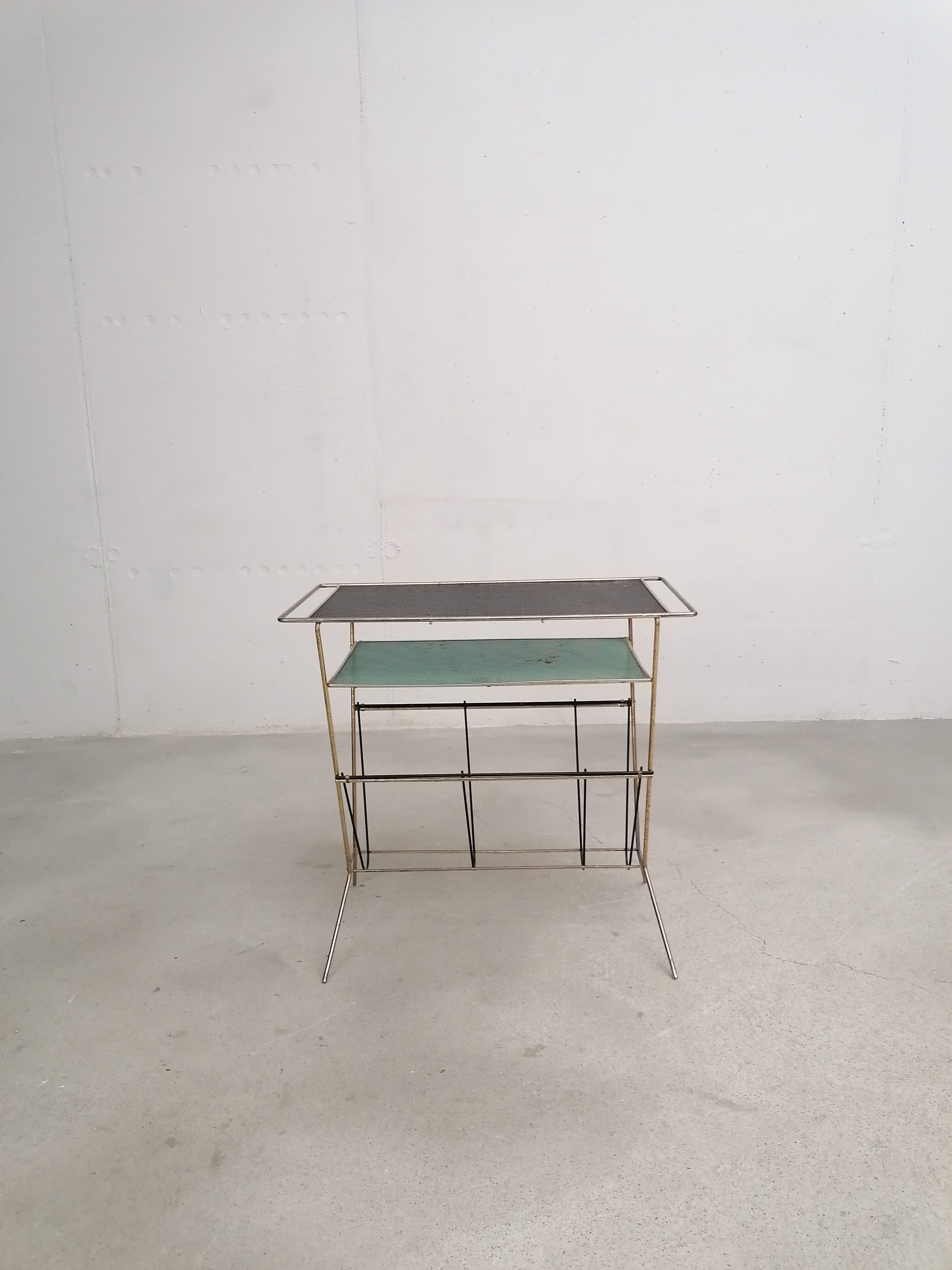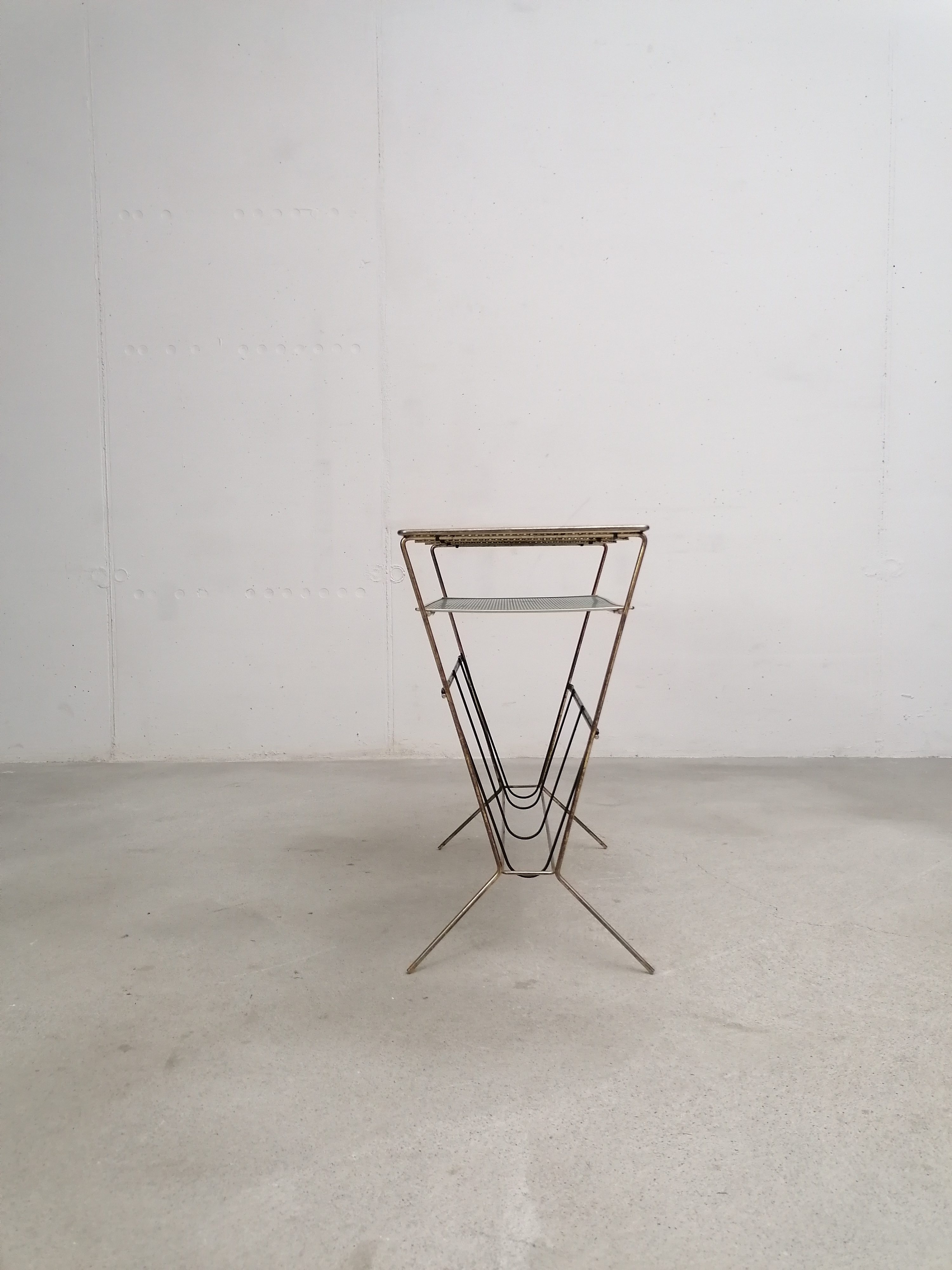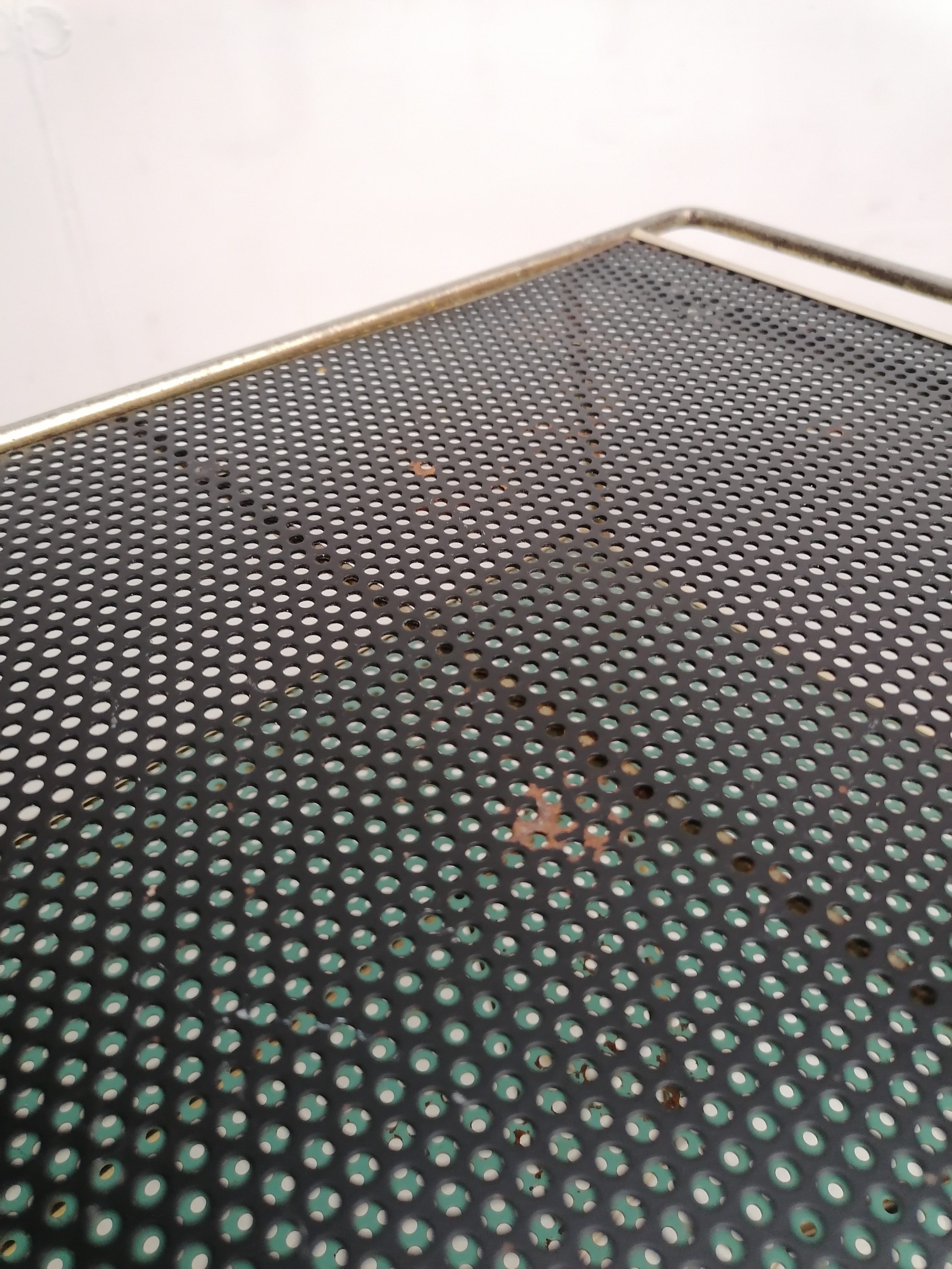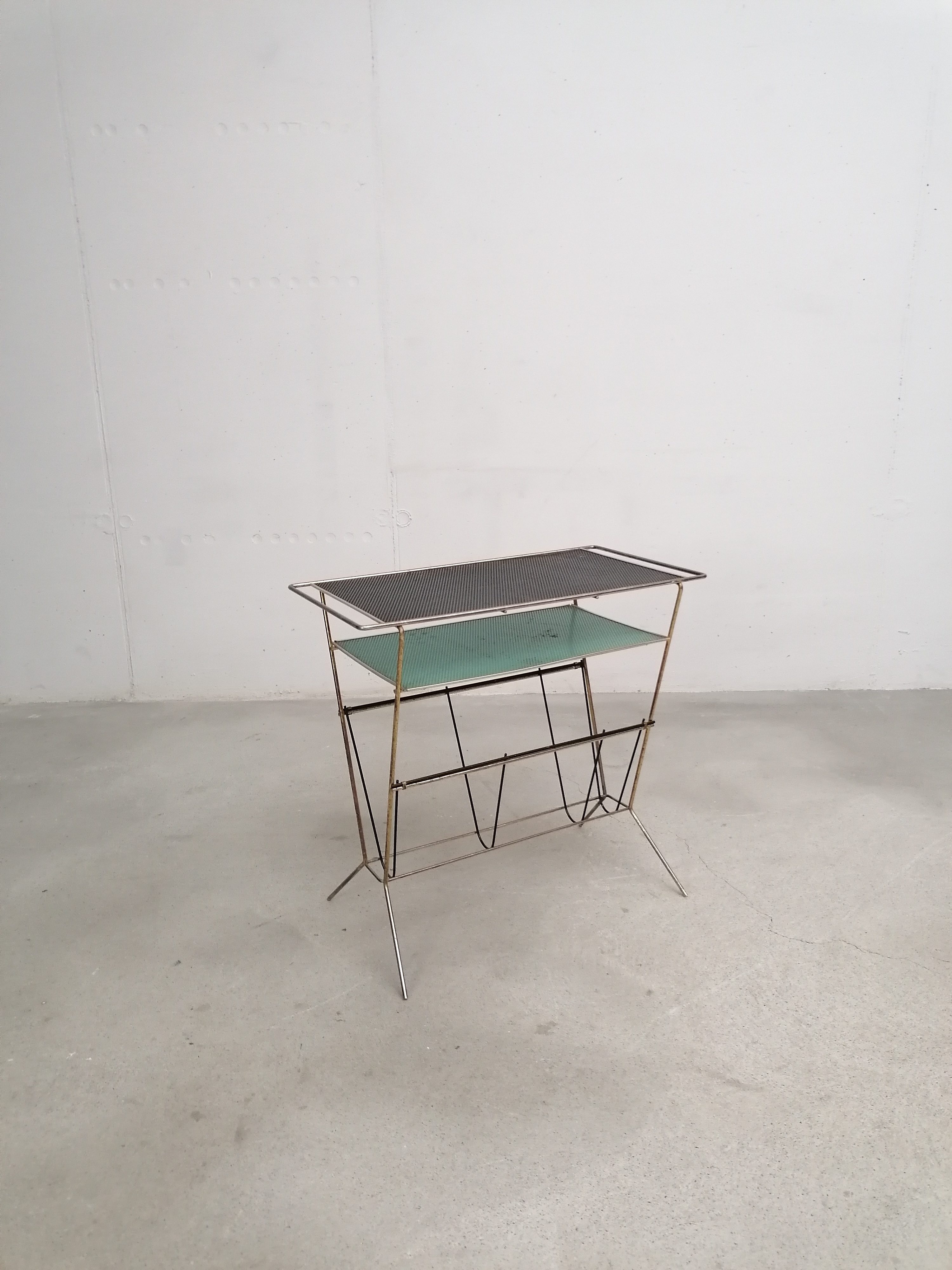 La structure en métal laitonné a perdu sa couleur d’origine. A quelques endroits, la peinture noire et verte est manquante. Une petite tige de l’espace revues est dessoudé. Malgré ces petits défauts, le porte-revues est stable et atypique car c’est rare d’en voir des aussi grands.