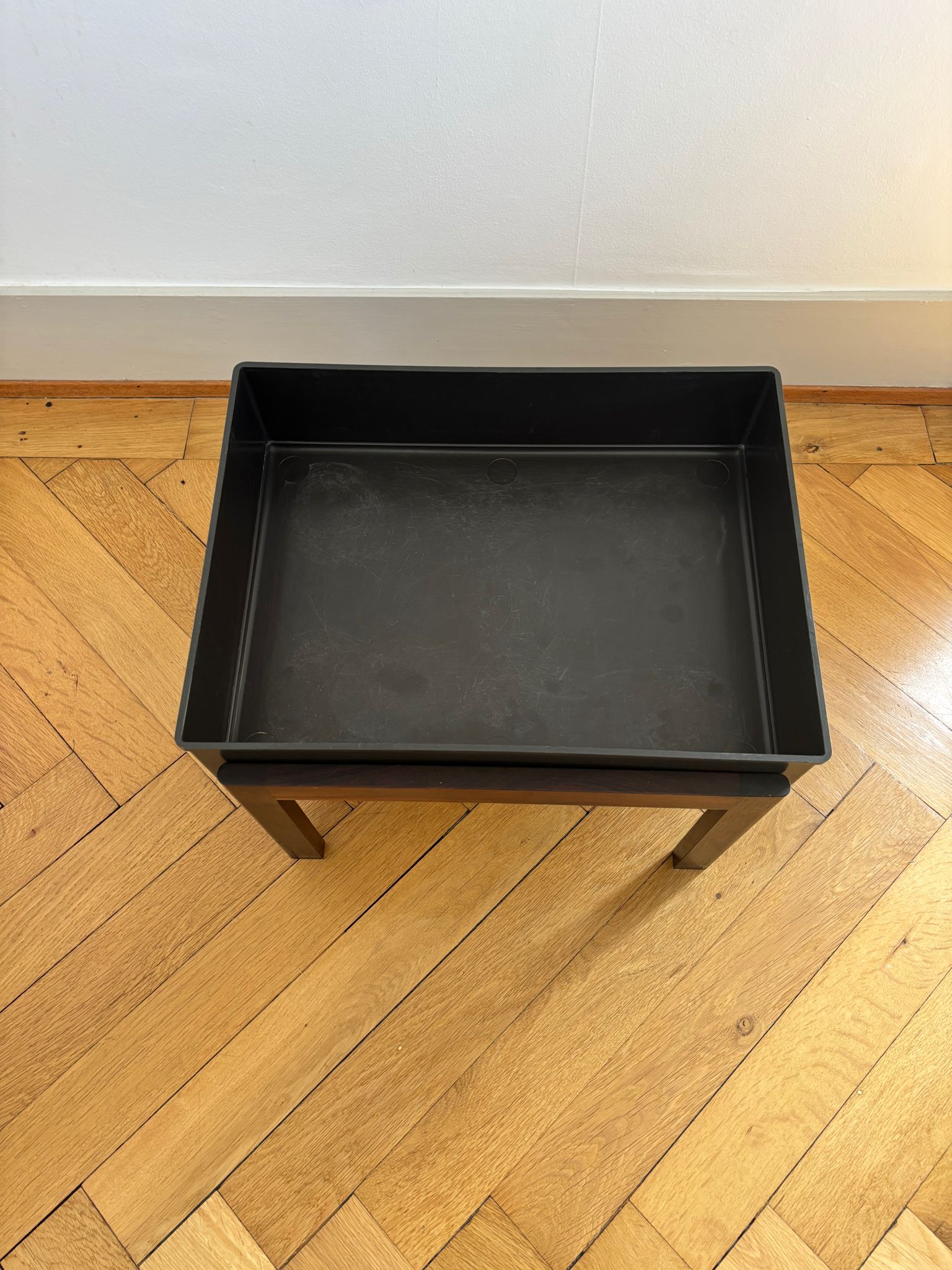 Le bac en plastique d’origine présente des traces d’usage, notamment des rayures au fond, mais reste parfaitement fonctionnel et étanche. Peut être utilisée comme table d’appoint.