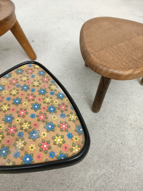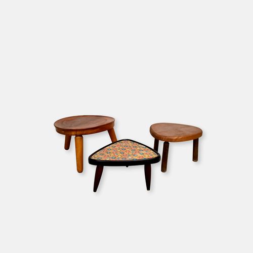 Produit venduLot de 3 porte-plantes tripodes vintage en bois de différentes tailles et formes.